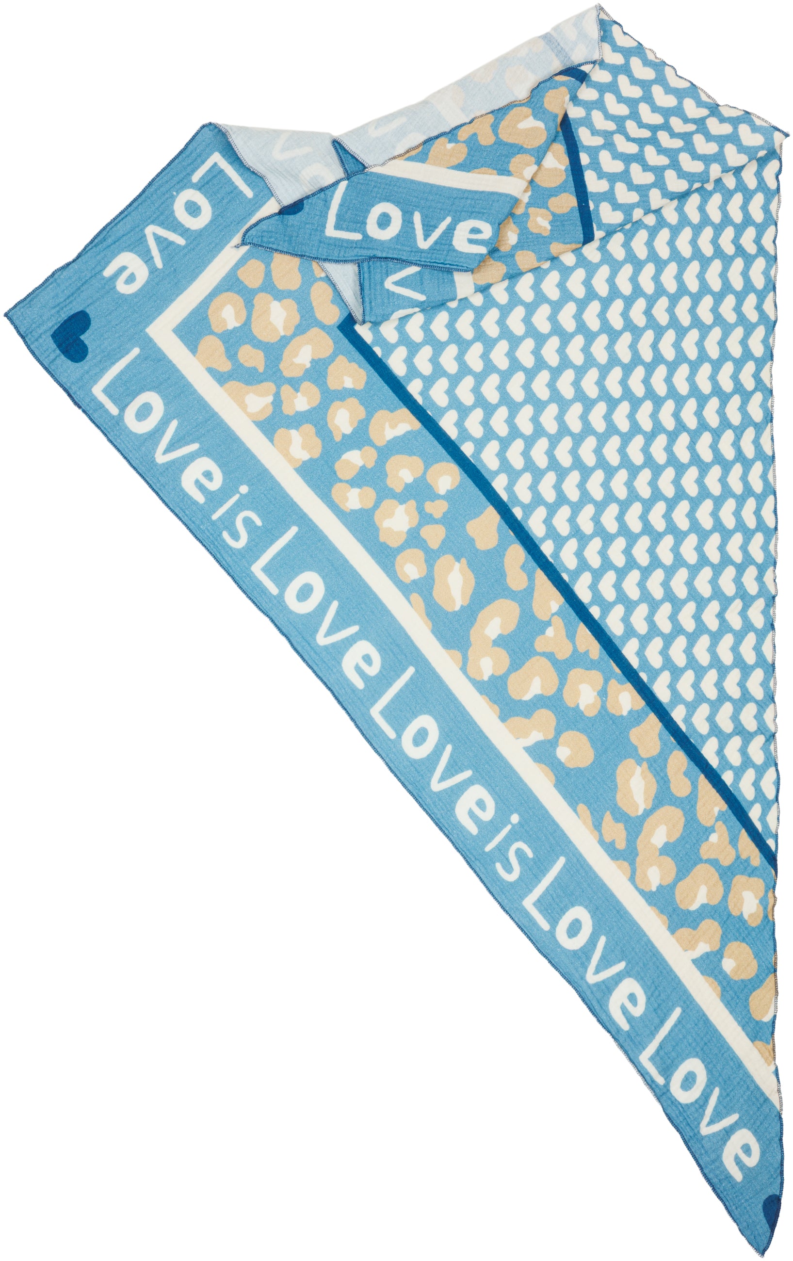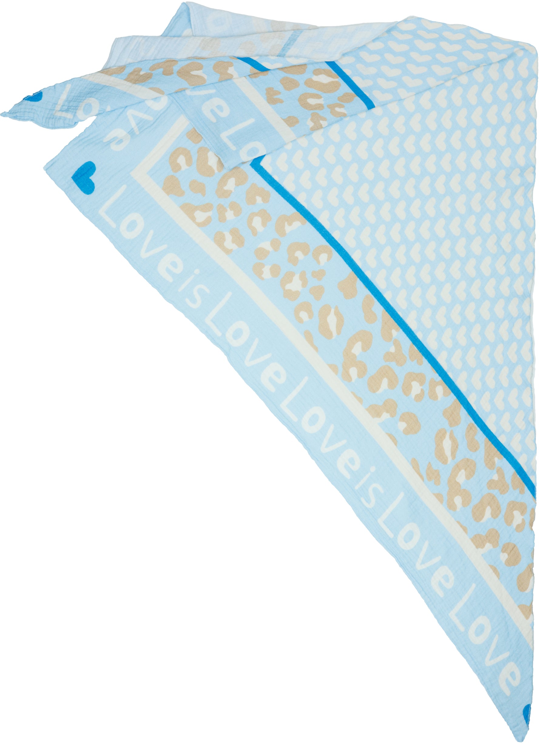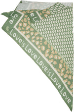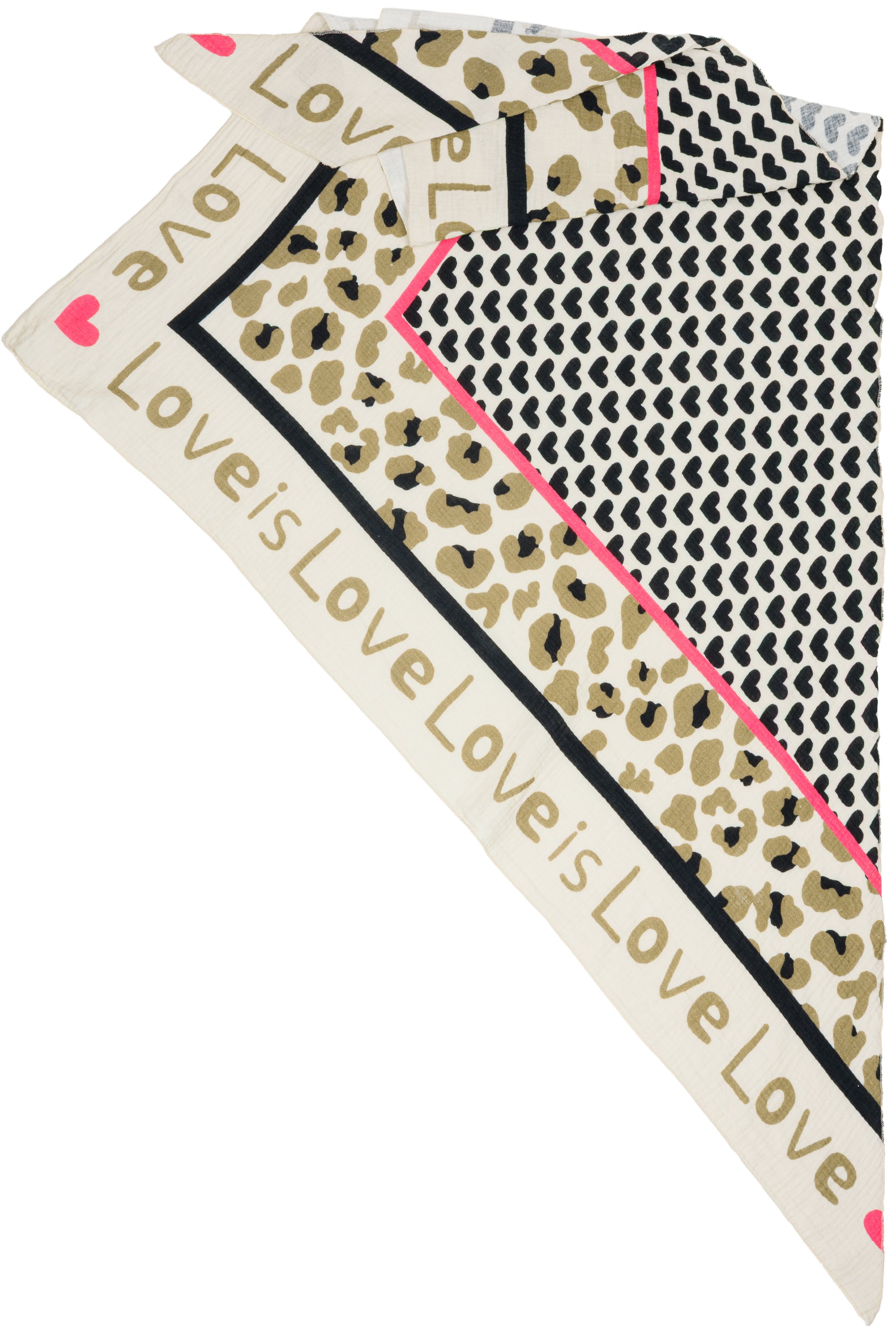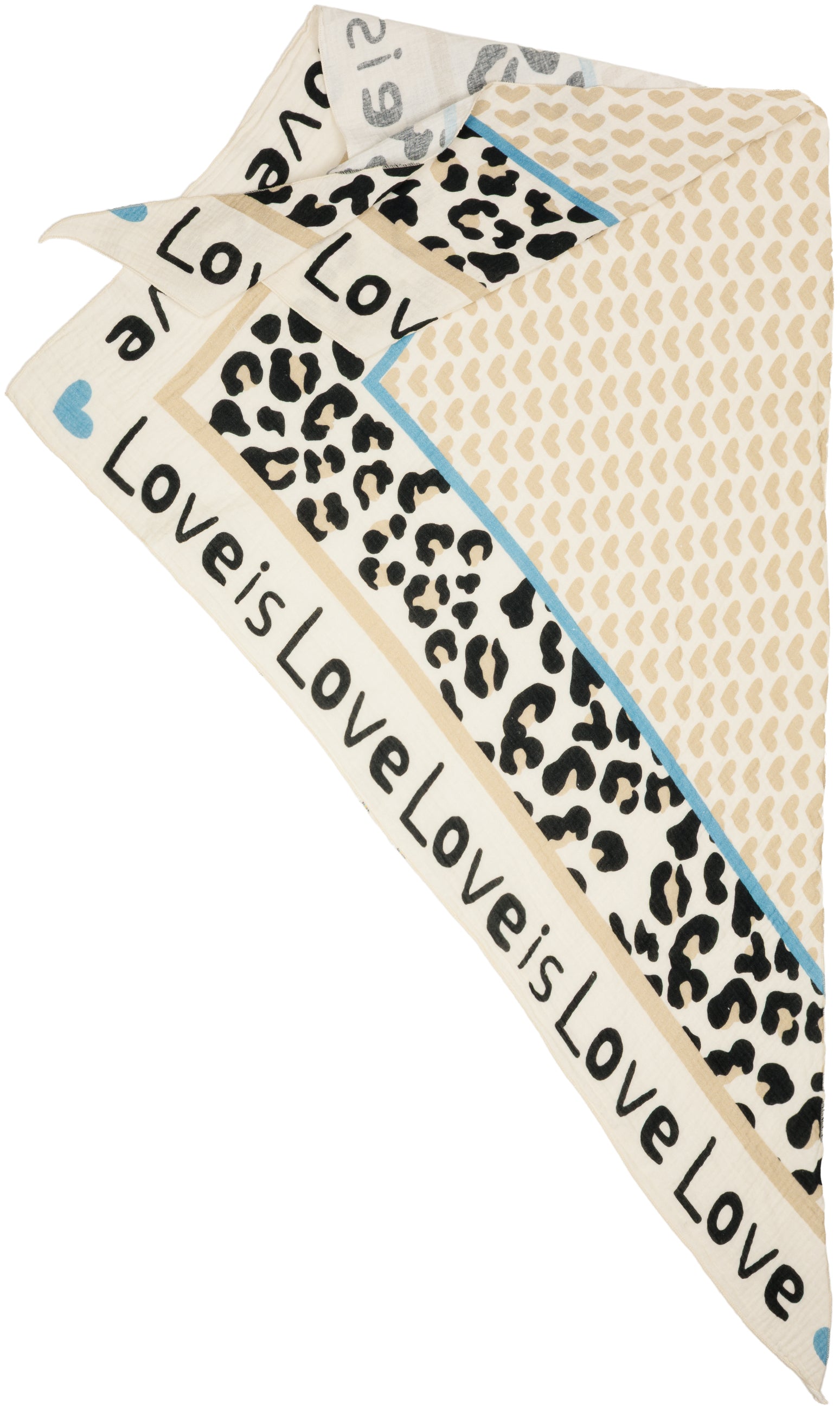 Unser Dreieckstuch aus 100% Baumwolle kombiniert weichen, etwas dickeren und angenehm wärmenden Musselin Stoff mit einem auffälligen Print Design. In hochwertiger Qualität hergestellt in Italien, fühlt sich das Material angenehm leicht an und liegt sanft auf der Haut. Mit einer Größe von ca. 195 x 90 cm bietet der Schal vielseitige Tragemöglichkeiten und eignet sich sowohl als Halstuch als auch als Schultertuch. Der Schal besitzt mittig ein Muster aus Herzen umrahmt von einem dezenten Leo Print und einem umlaufenden „Love is“-Schriftzug. Durch die atmungsaktive und weiche Qualität ist er ideal für die Übergangszeit im Frühling und Herbst.