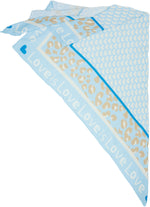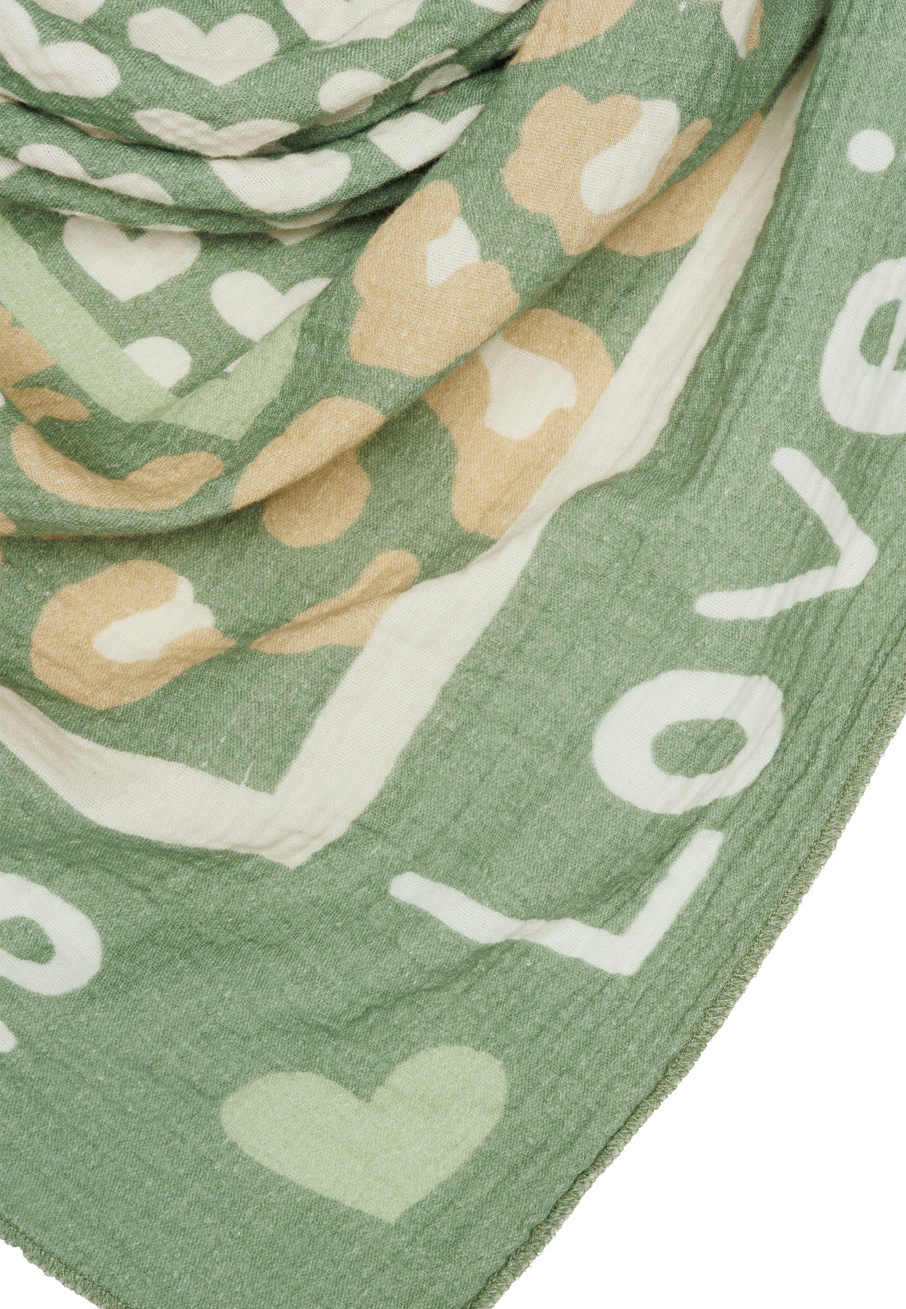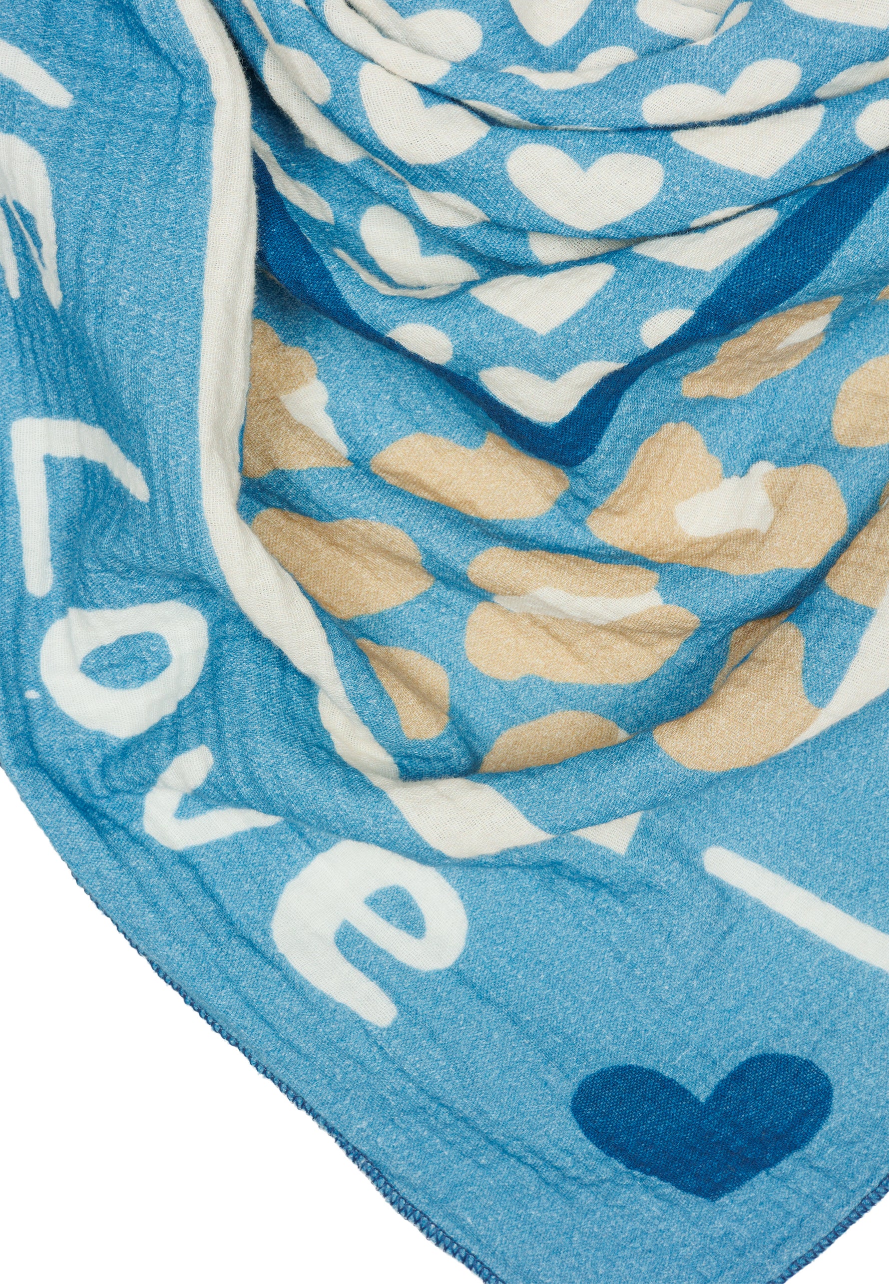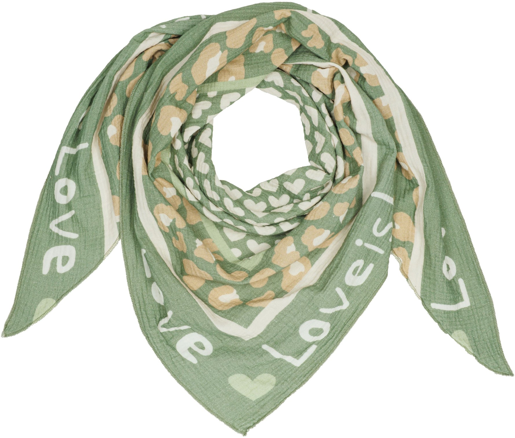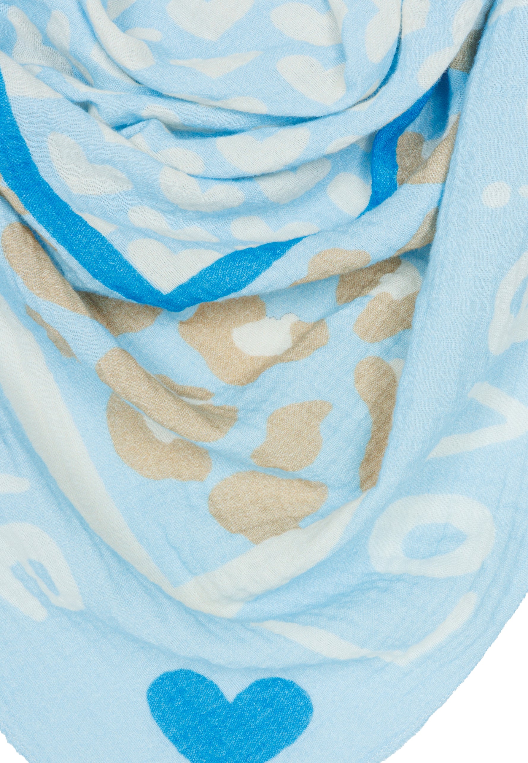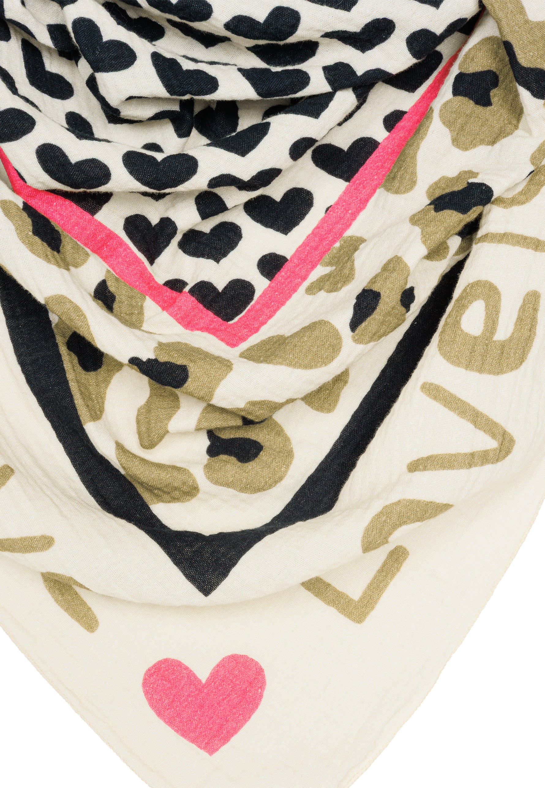 Unser Dreieckstuch aus 100% Baumwolle kombiniert weichen, etwas dickeren und angenehm wärmenden Musselin Stoff mit einem auffälligen Print Design. In hochwertiger Qualität hergestellt in Italien, fühlt sich das Material angenehm leicht an und liegt sanft auf der Haut. Mit einer Größe von ca. 195 x 90 cm bietet der Schal vielseitige Tragemöglichkeiten und eignet sich sowohl als Halstuch als auch als Schultertuch. Der Schal besitzt mittig ein Muster aus Herzen umrahmt von einem dezenten Leo Print und einem umlaufenden „Love is“-Schriftzug. Durch die atmungsaktive und weiche Qualität ist er ideal für die Übergangszeit im Frühling und Herbst.