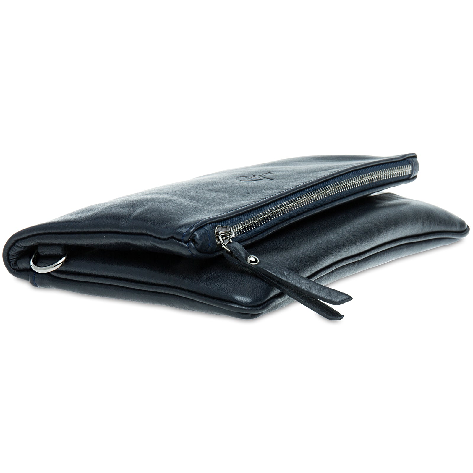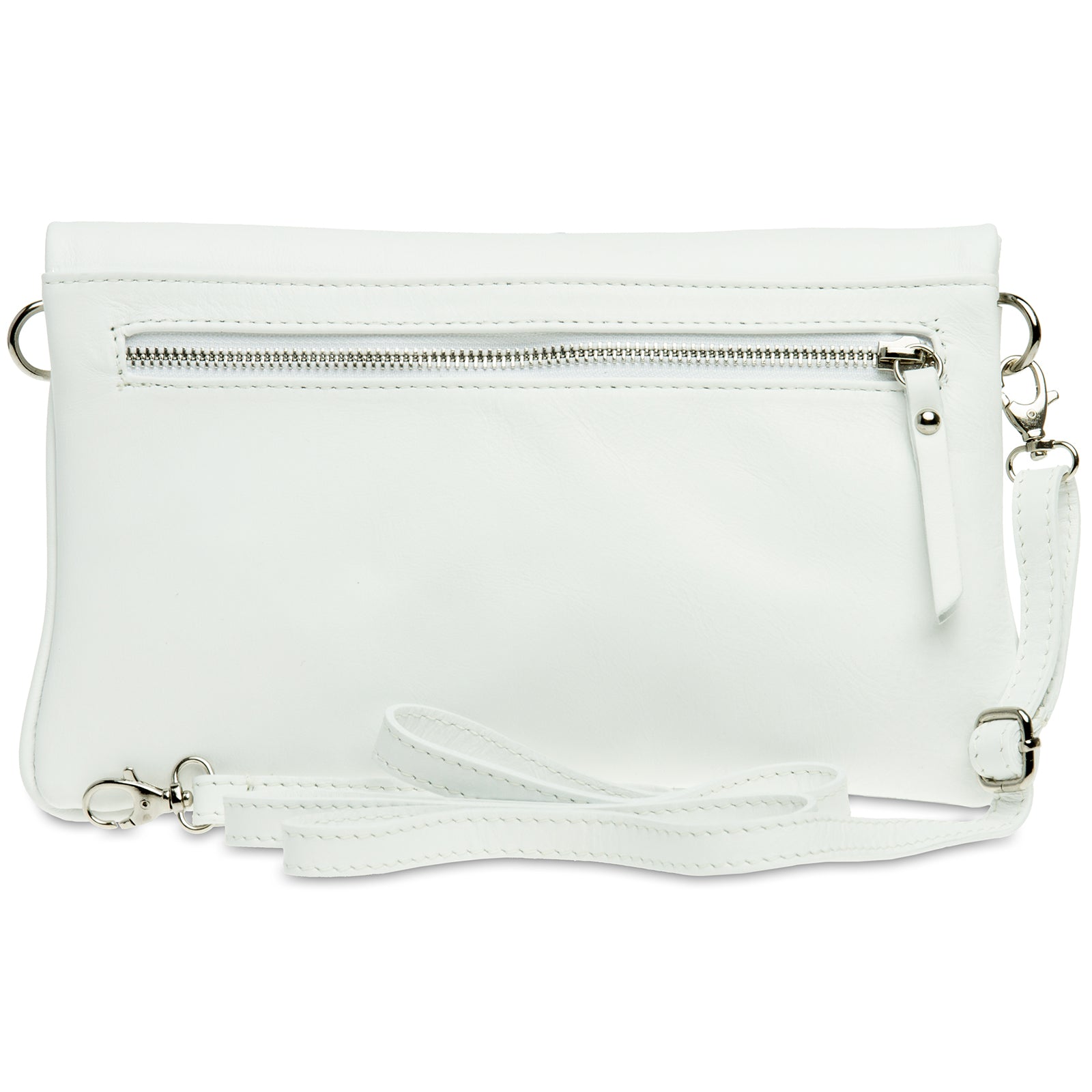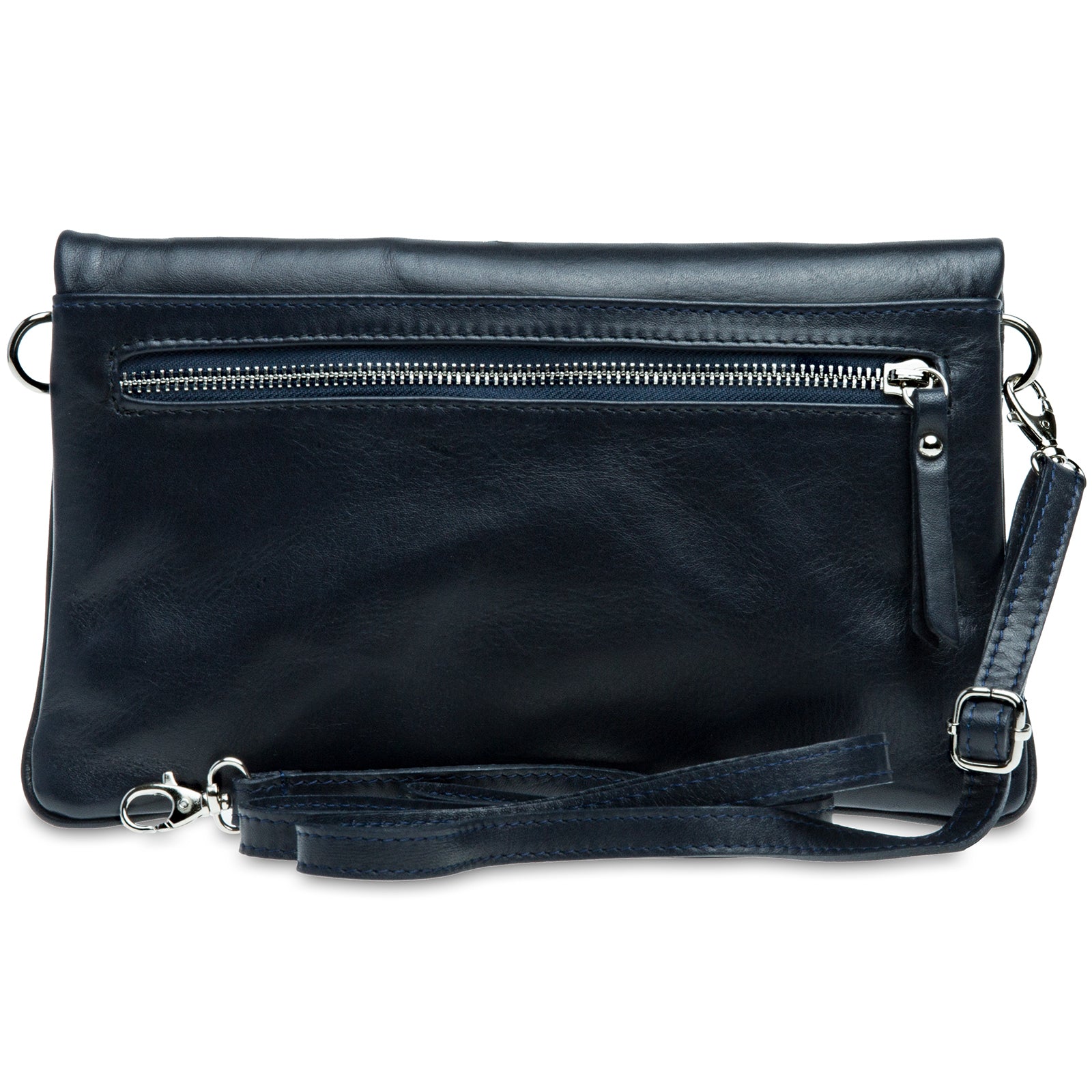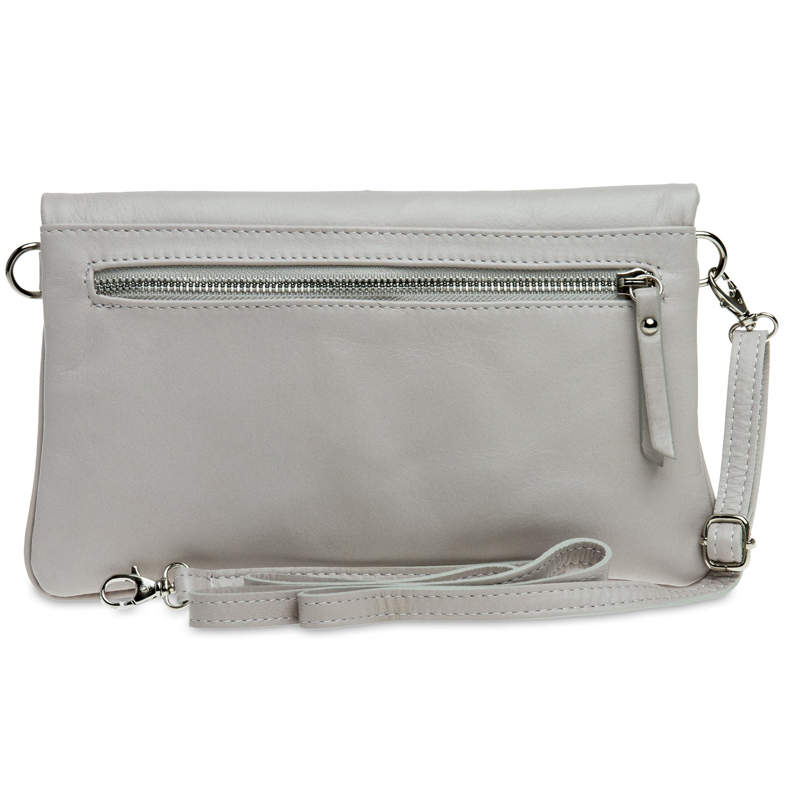 Superschöne elegante Damen Clutch aus feinem italienischem Nappaleder. Diese Abendtasche ist die pefekte Begleiterin für Ihren stilvollen Auftritt. Sie können die Tasche mit Hilfe des abnehmbaren Schultergurtes (Länge ca. 130cm) bequem über den Schulter oder ganz ohne Gurt als klassische Clutch unter dem Arm oder auch in der Hand tragen. Die Tasche hat perfekte Abmessungen, ist nicht zu groß und nicht zu klein. Handy, Lippenstift, Geldbörse, etc. passen problemlos hinein. Das Leder ist hochwertig, angenehm weich und trotzdem sehr robust. Das Design zurückhaltend und schlicht. Mit dieser Clutch beweisen Sie Stil und Klasse! Unter dem großen Überschlag sowie auf der Rückseite der Lederhandtasche befinden sich Außenfächer mit Metallreißverschluss. Im Innern befindet sich ein großes Hauptfach mit seitlichem verschließbarem Nebenfach. Geschlossen wird die Umhängetasche mit einem an der oberen Kante sitzenden silberfarbenen Reißverschluss. Maße (mit umgeschlagenem Oberteil) BxHxT ca. 26 x 15,5 x 4 cm.