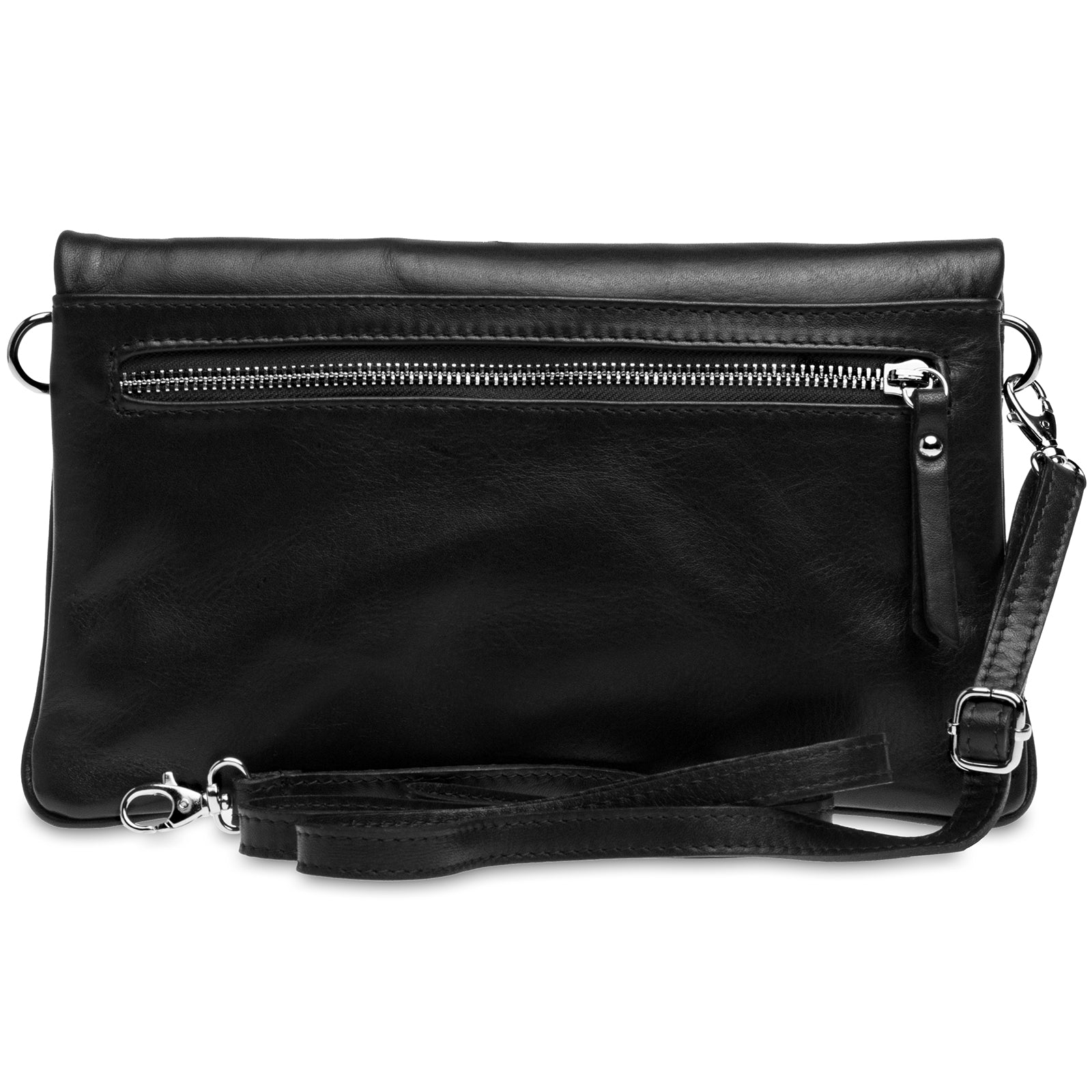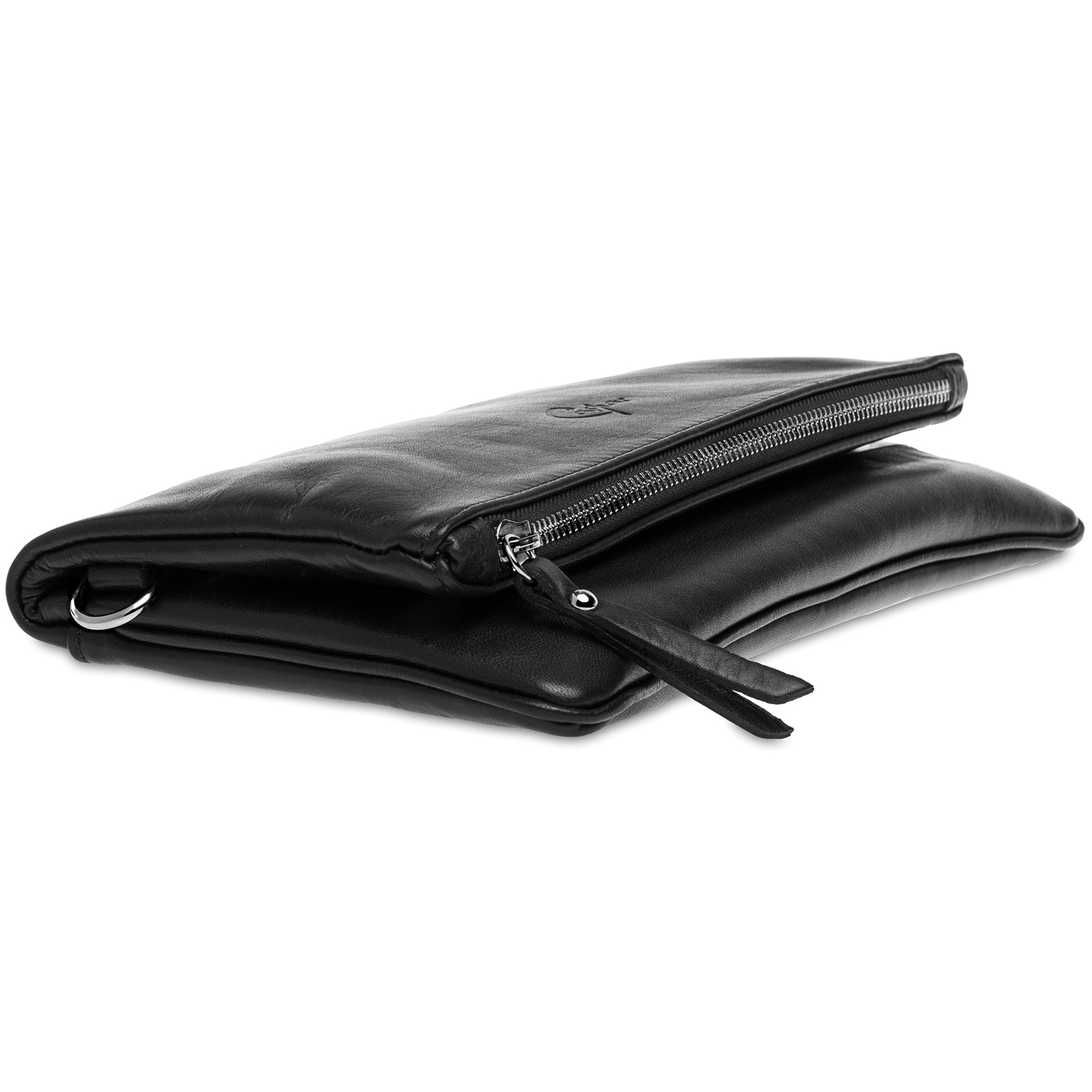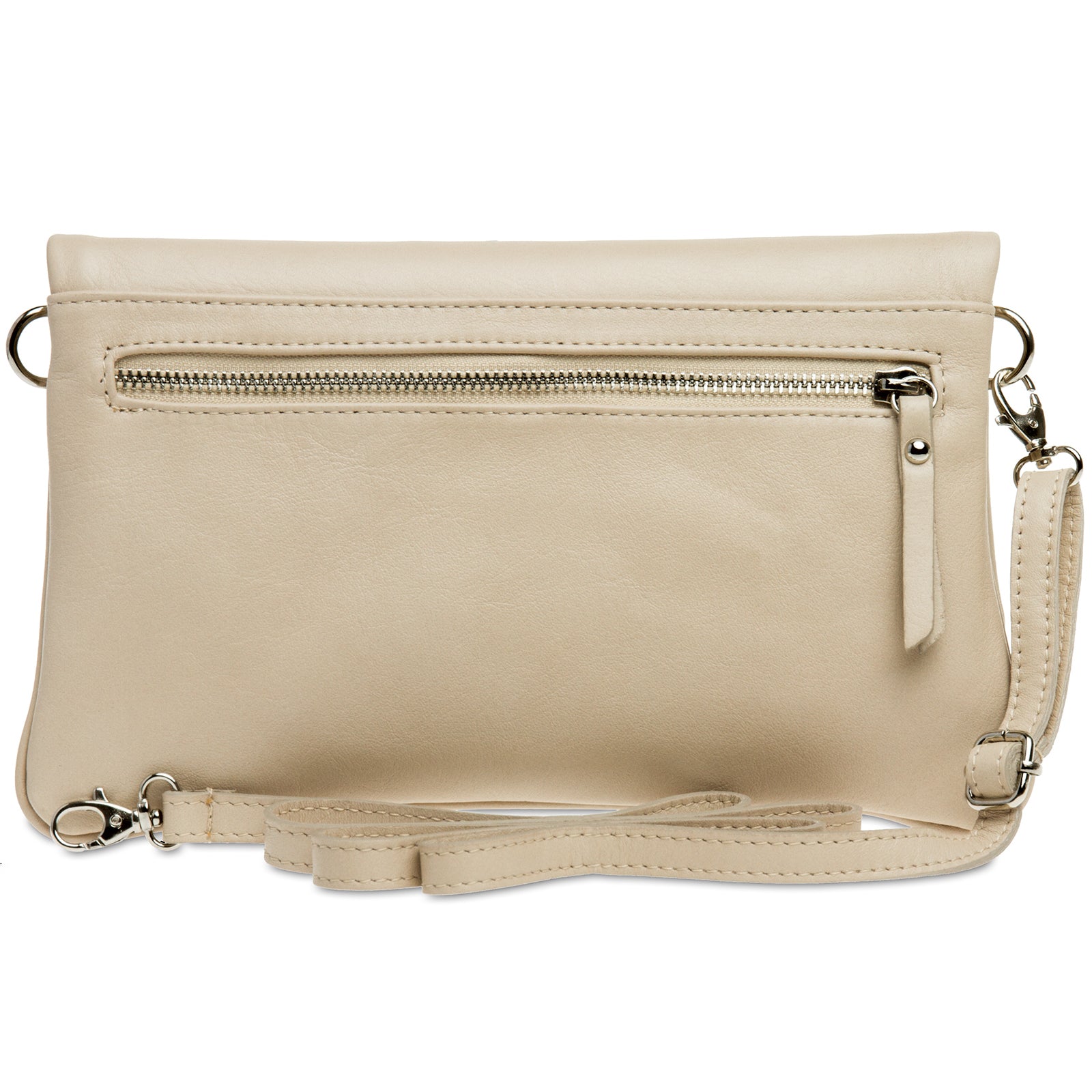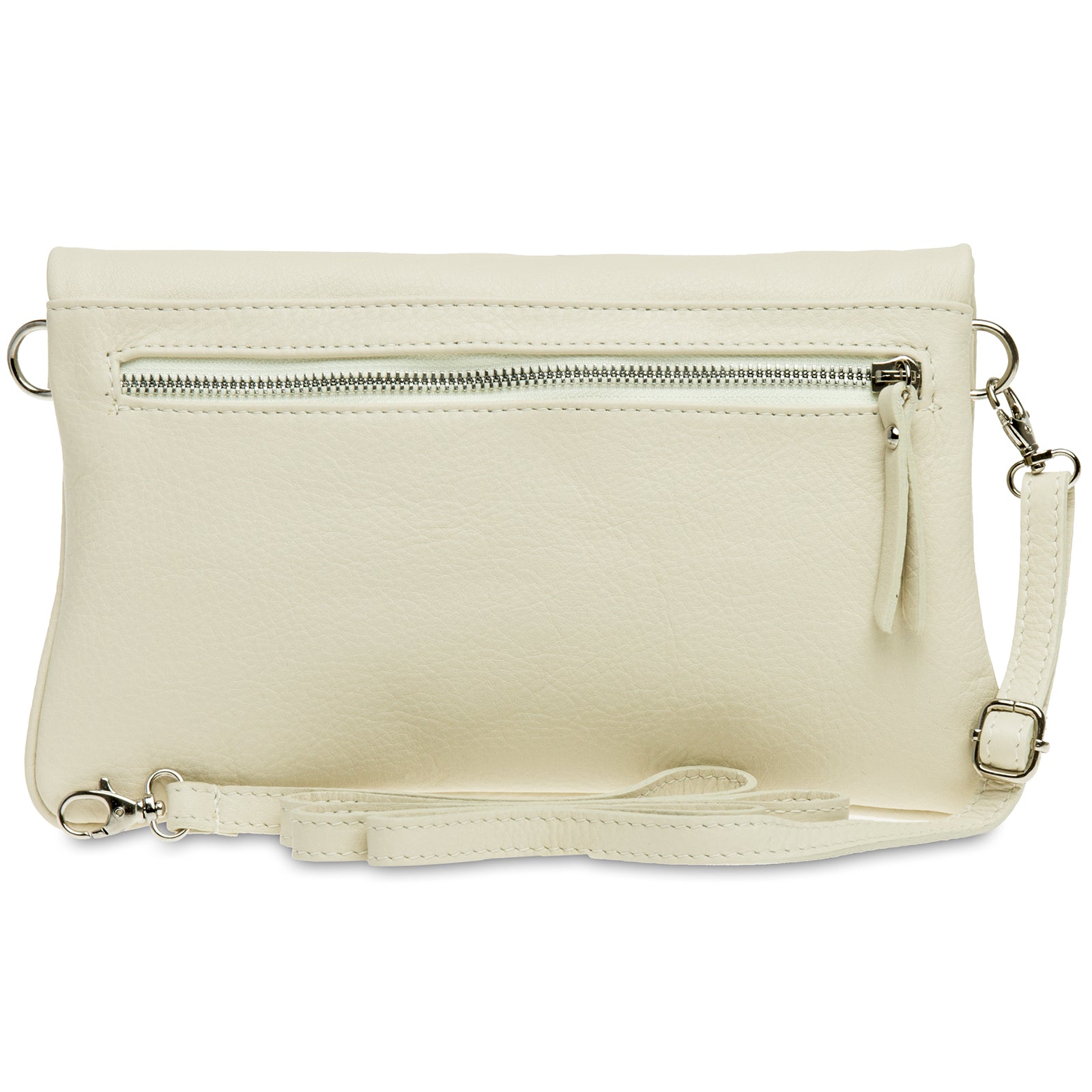 Superschöne elegante Damen Clutch aus feinem italienischem Nappaleder. Diese Abendtasche ist die pefekte Begleiterin für Ihren stilvollen Auftritt. Sie können die Tasche mit Hilfe des abnehmbaren Schultergurtes (Länge ca. 130cm) bequem über den Schulter oder ganz ohne Gurt als klassische Clutch unter dem Arm oder auch in der Hand tragen. Die Tasche hat perfekte Abmessungen, ist nicht zu groß und nicht zu klein. Handy, Lippenstift, Geldbörse, etc. passen problemlos hinein. Das Leder ist hochwertig, angenehm weich und trotzdem sehr robust. Das Design zurückhaltend und schlicht. Mit dieser Clutch beweisen Sie Stil und Klasse! Unter dem großen Überschlag sowie auf der Rückseite der Lederhandtasche befinden sich Außenfächer mit Metallreißverschluss. Im Innern befindet sich ein großes Hauptfach mit seitlichem verschließbarem Nebenfach. Geschlossen wird die Umhängetasche mit einem an der oberen Kante sitzenden silberfarbenen Reißverschluss. Maße (mit umgeschlagenem Oberteil) BxHxT ca. 26 x 15,5 x 4 cm.