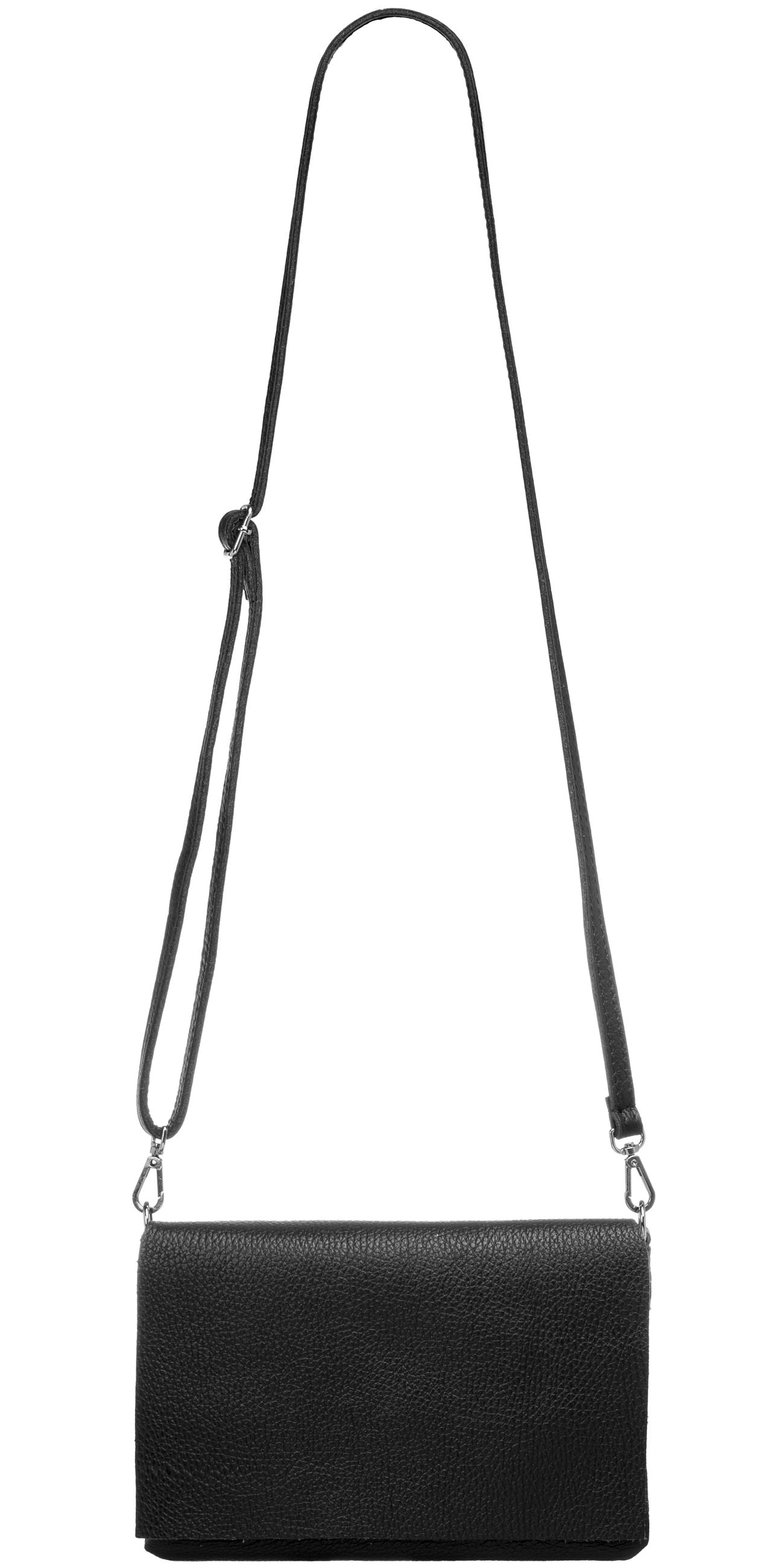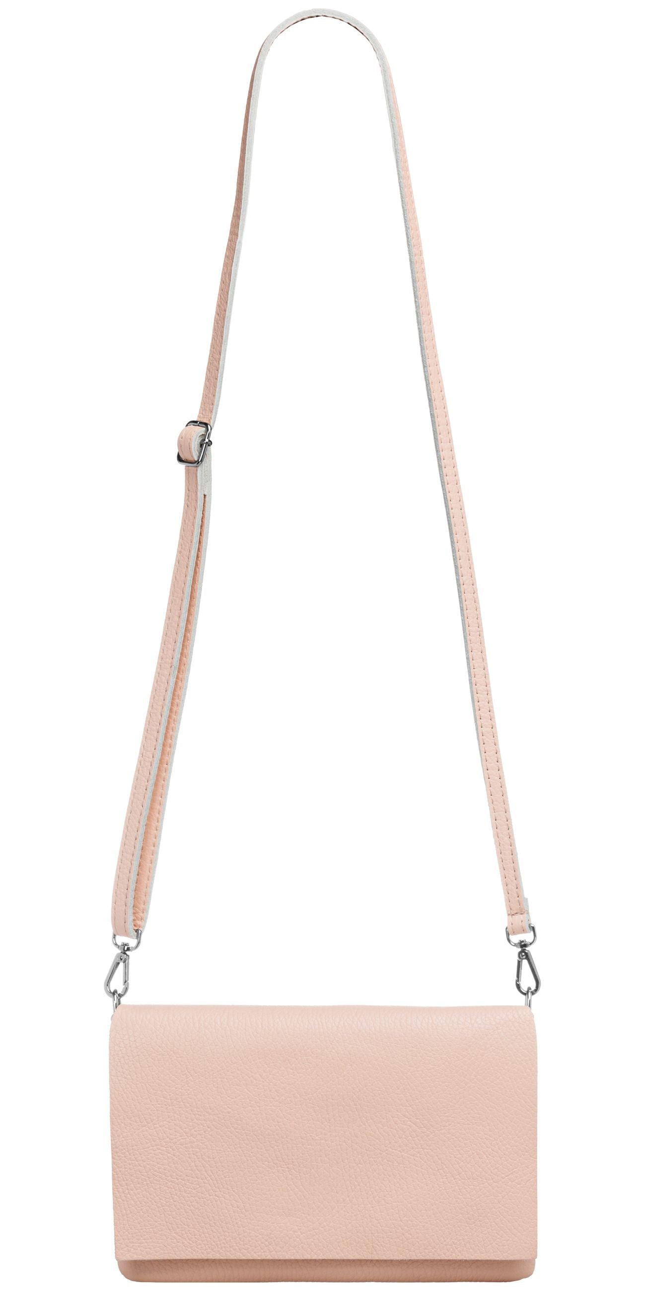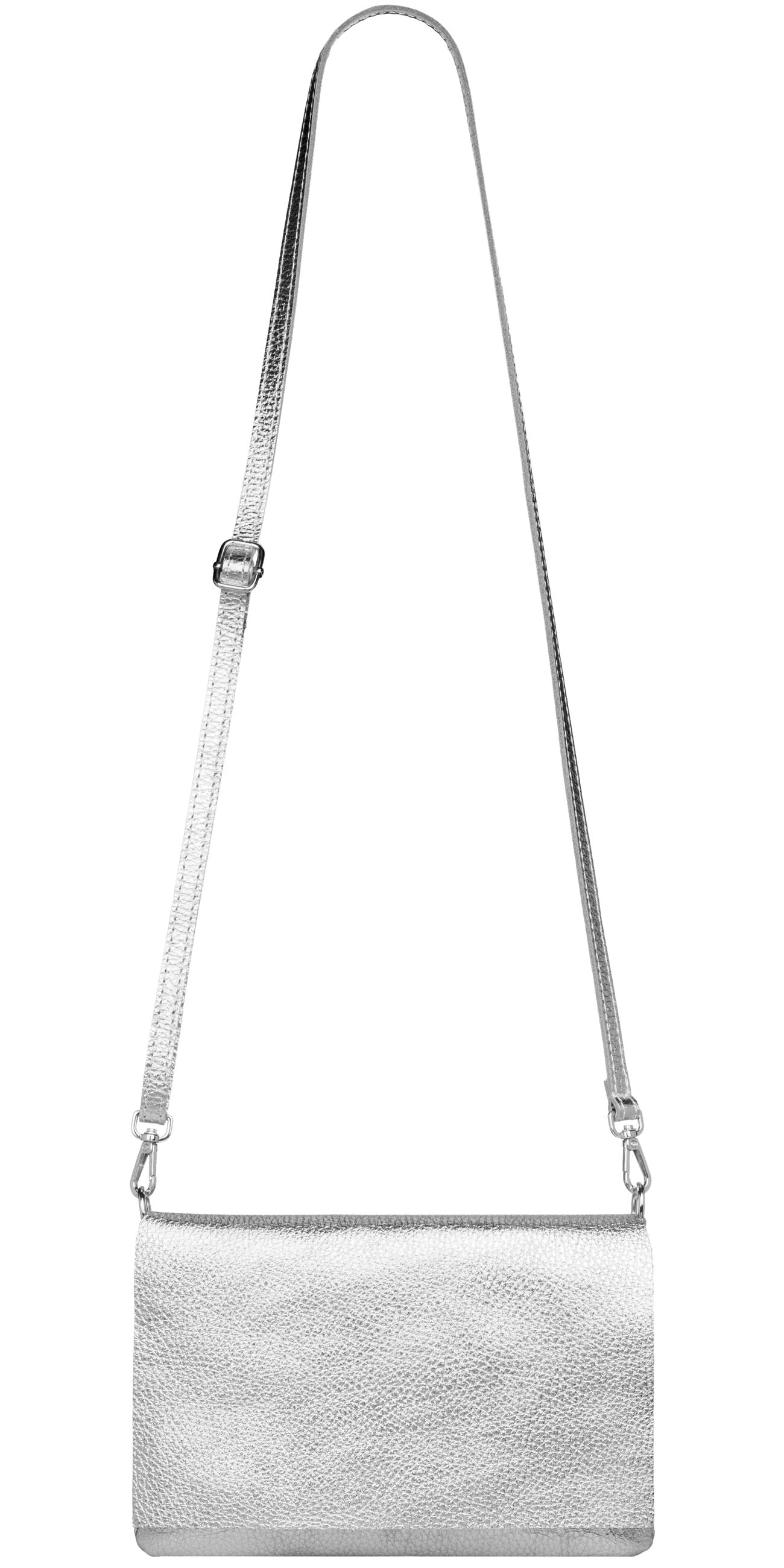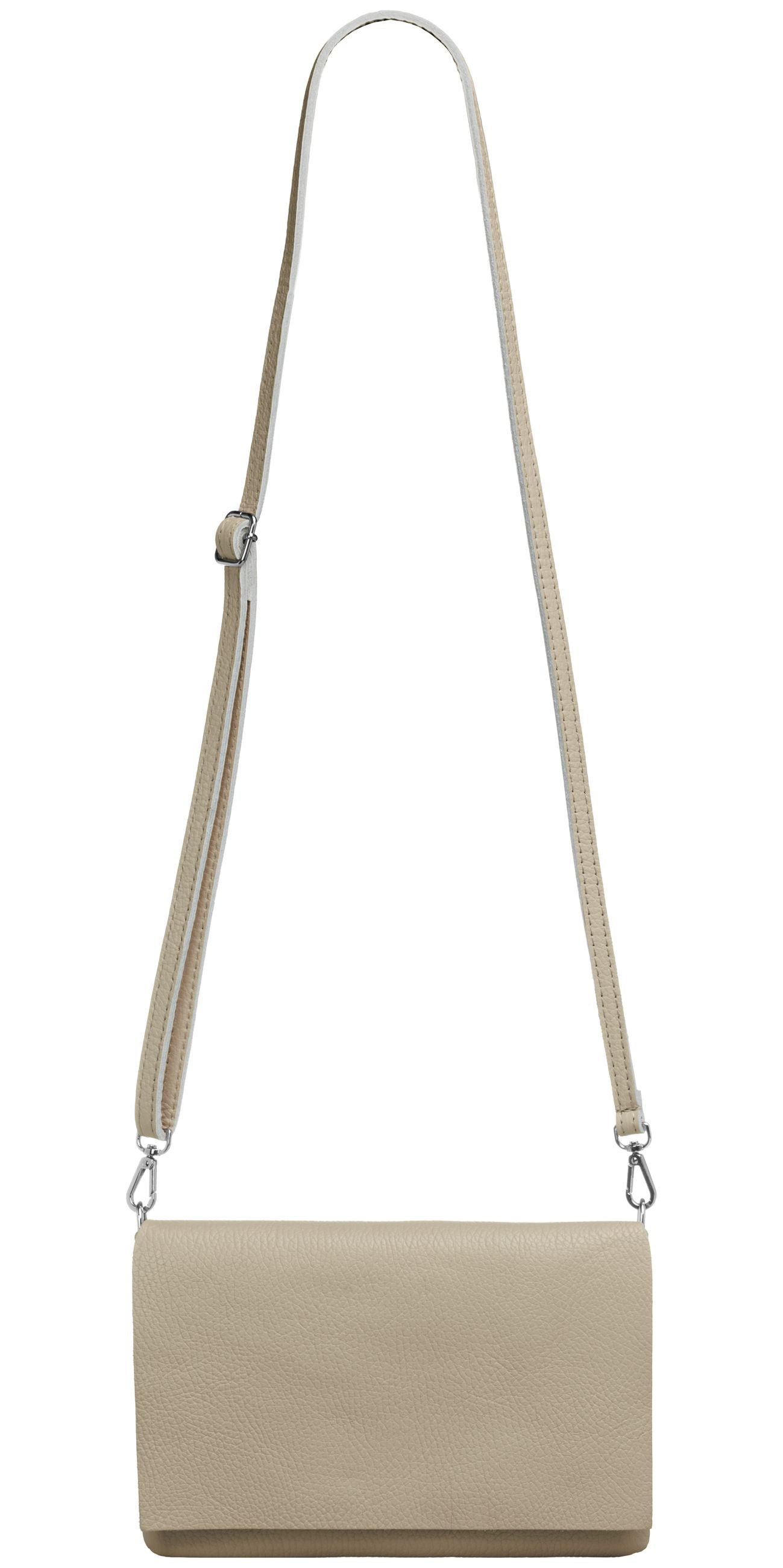 Unsere stilvolle Clutch aus hochwertigem, italienischem Dollaro-Leder vereint zeitlose Eleganz mit praktischer Funktionalität. Das fein genarbte Leder verleiht der Tasche eine natürliche Ausstrahlung und sorgt für einen angenehm weichen Griff. Ob als Clutch, Umhängetasche oder Abendtasche - sie ist ein vielseitiger Begleiter für Alltag und besondere Anlässe. Mit einer Größe von ca. 22,5 x 15,5 x 1,5 cm bietet die Tasche ausreichend Platz für deine Essentials wie Smartphone, Schlüssel, kleine Geldbörse oder Make-up. Der Innenraum ist mit einem edlen Stofffutter ausgekleidet und enthält ein praktisches Sicherheitsfach mit Reißverschluss, ideal für Karten oder andere wichtige Kleinigkeiten. Ein markanter Überschlag verleiht der Tasche nicht nur eine elegante Silhouette, sondern bietet durch den darunterliegenden Reißverschluss zusätzlichen Schutz für den Inhalt. Auf der Rückseite befindet sich ein weiteres, schnell zugängliches Reißverschlussfach – perfekt für Dinge, die man sofort griffbereit haben möchte. Der abnehmbare, längenverstellbare Schultergurt macht das Tragen flexibel - ob crossbody, über der Schulter oder als Clutch in der Hand. Mit einem Gewicht von ca. 235 Gramm bleibt sie dabei angenehm leicht und komfortabel.