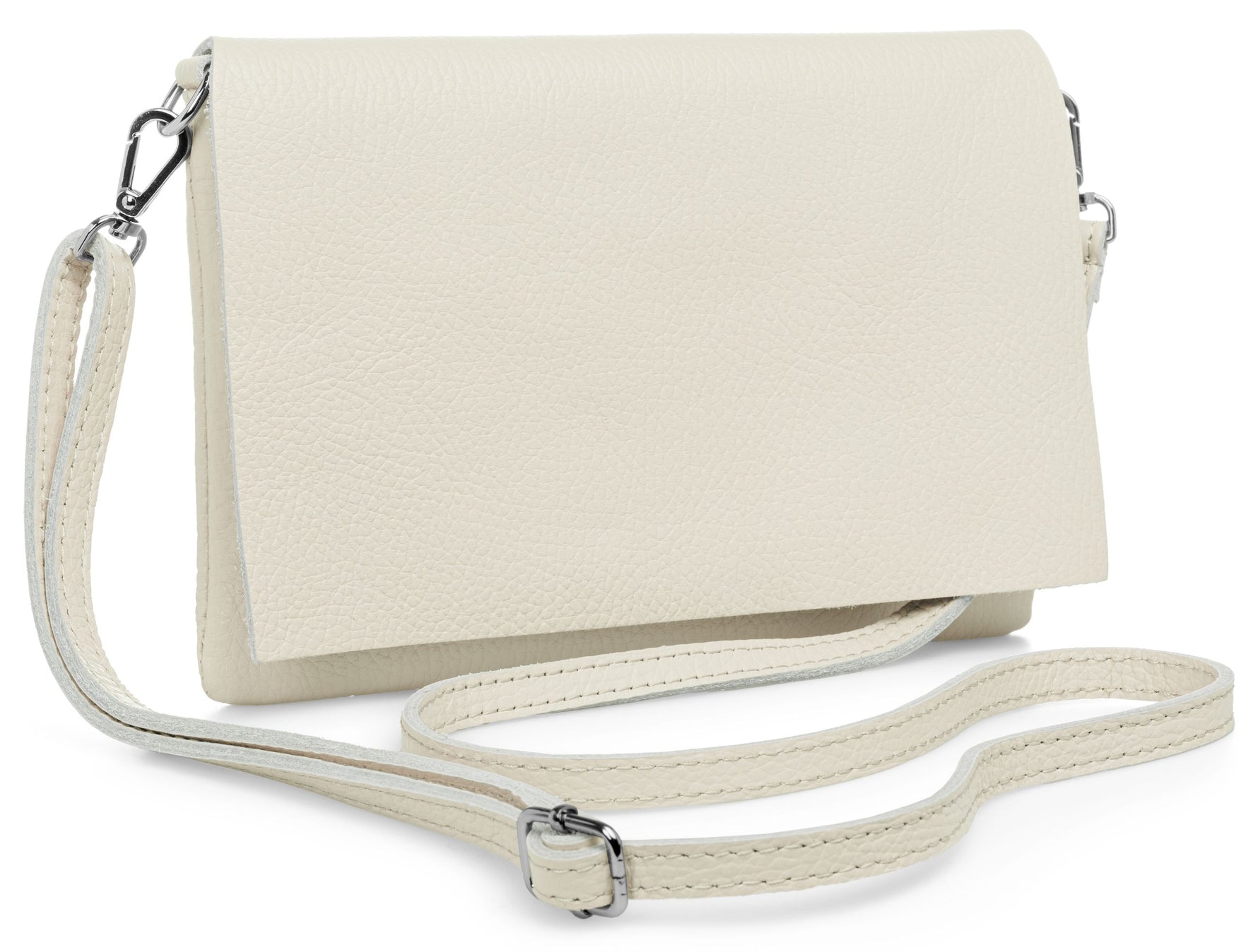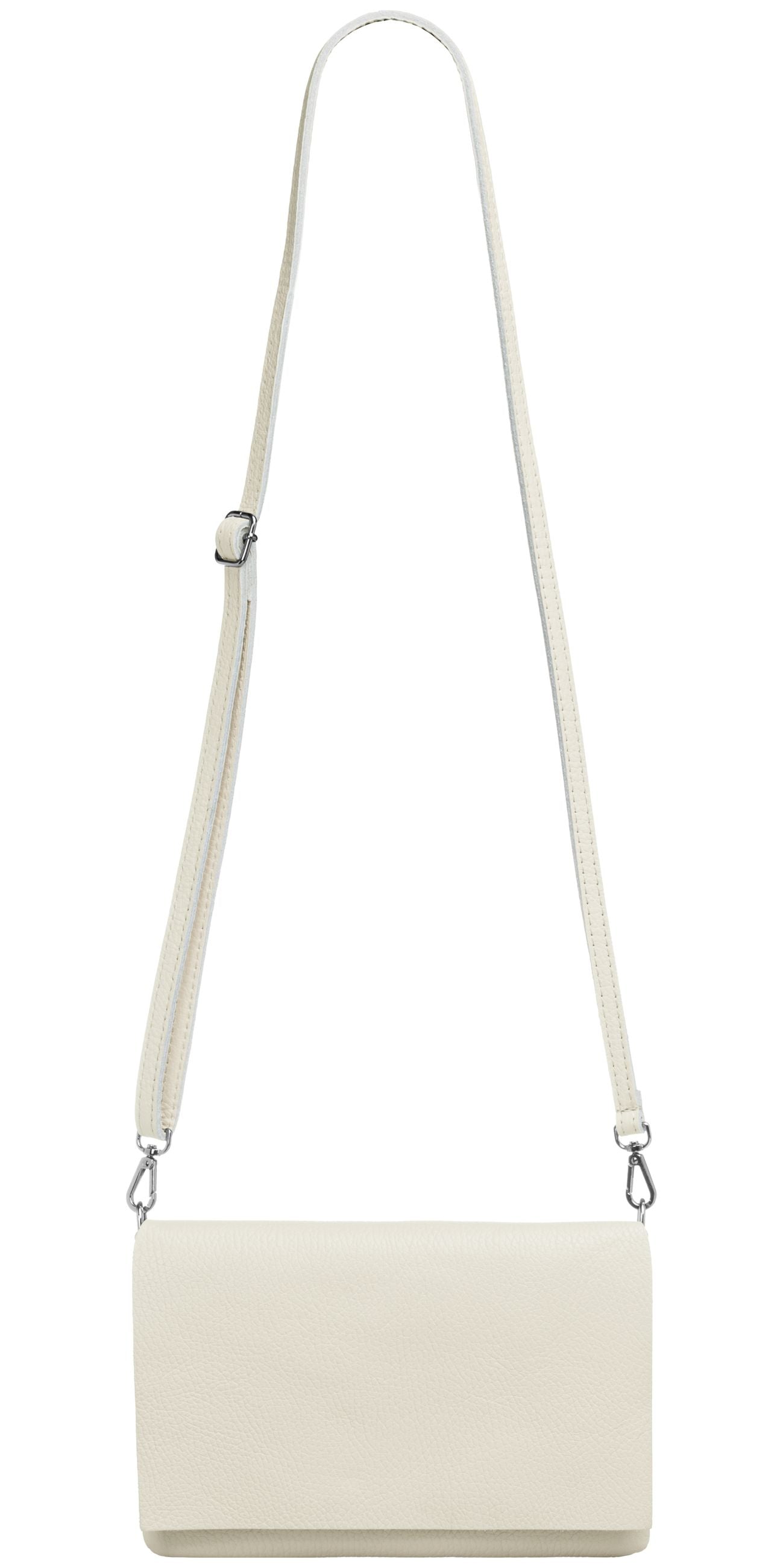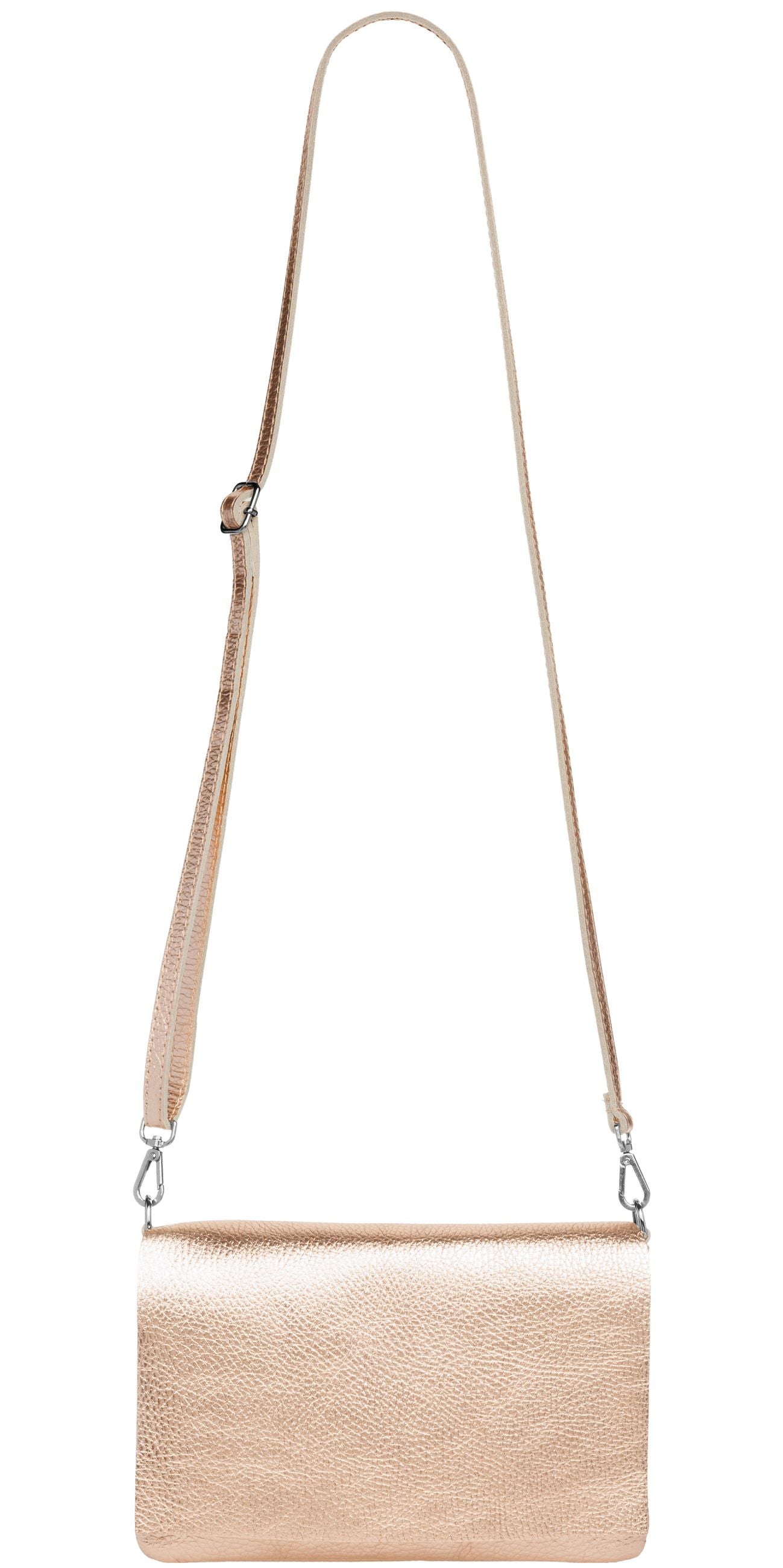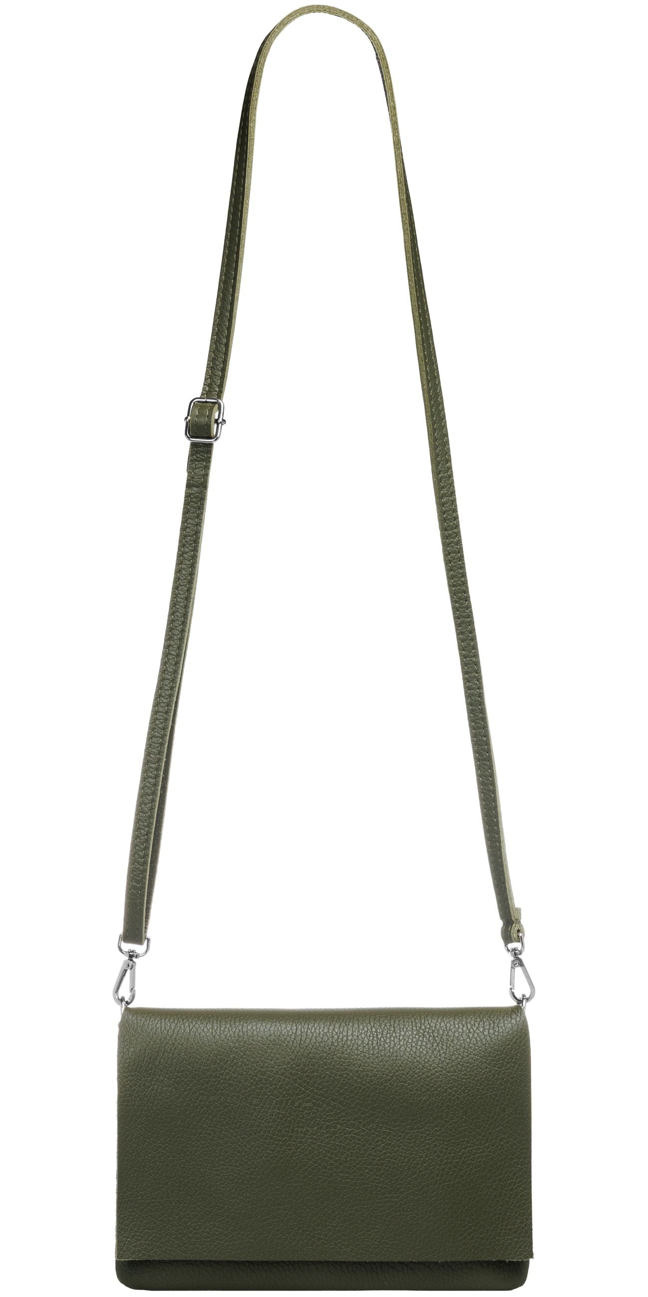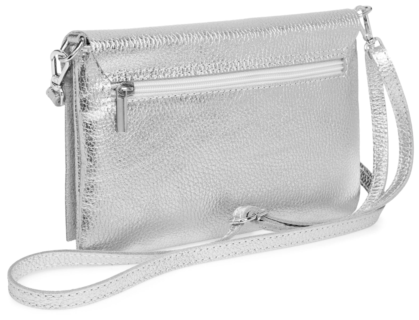 Unsere stilvolle Clutch aus hochwertigem, italienischem Dollaro-Leder vereint zeitlose Eleganz mit praktischer Funktionalität. Das fein genarbte Leder verleiht der Tasche eine natürliche Ausstrahlung und sorgt für einen angenehm weichen Griff. Ob als Clutch, Umhängetasche oder Abendtasche - sie ist ein vielseitiger Begleiter für Alltag und besondere Anlässe. Mit einer Größe von ca. 22,5 x 15,5 x 1,5 cm bietet die Tasche ausreichend Platz für deine Essentials wie Smartphone, Schlüssel, kleine Geldbörse oder Make-up. Der Innenraum ist mit einem edlen Stofffutter ausgekleidet und enthält ein praktisches Sicherheitsfach mit Reißverschluss, ideal für Karten oder andere wichtige Kleinigkeiten. Ein markanter Überschlag verleiht der Tasche nicht nur eine elegante Silhouette, sondern bietet durch den darunterliegenden Reißverschluss zusätzlichen Schutz für den Inhalt. Auf der Rückseite befindet sich ein weiteres, schnell zugängliches Reißverschlussfach – perfekt für Dinge, die man sofort griffbereit haben möchte. Der abnehmbare, längenverstellbare Schultergurt macht das Tragen flexibel - ob crossbody, über der Schulter oder als Clutch in der Hand. Mit einem Gewicht von ca. 235 Gramm bleibt sie dabei angenehm leicht und komfortabel.