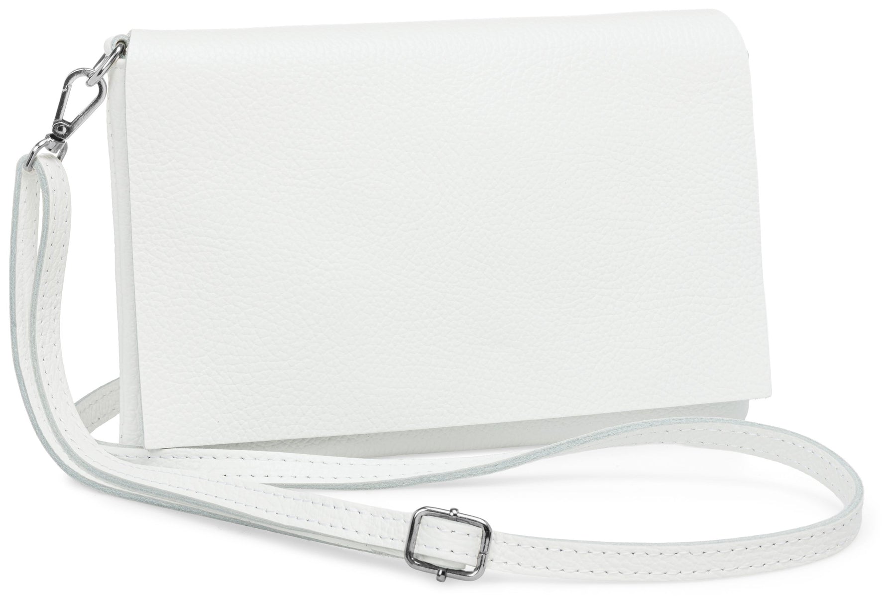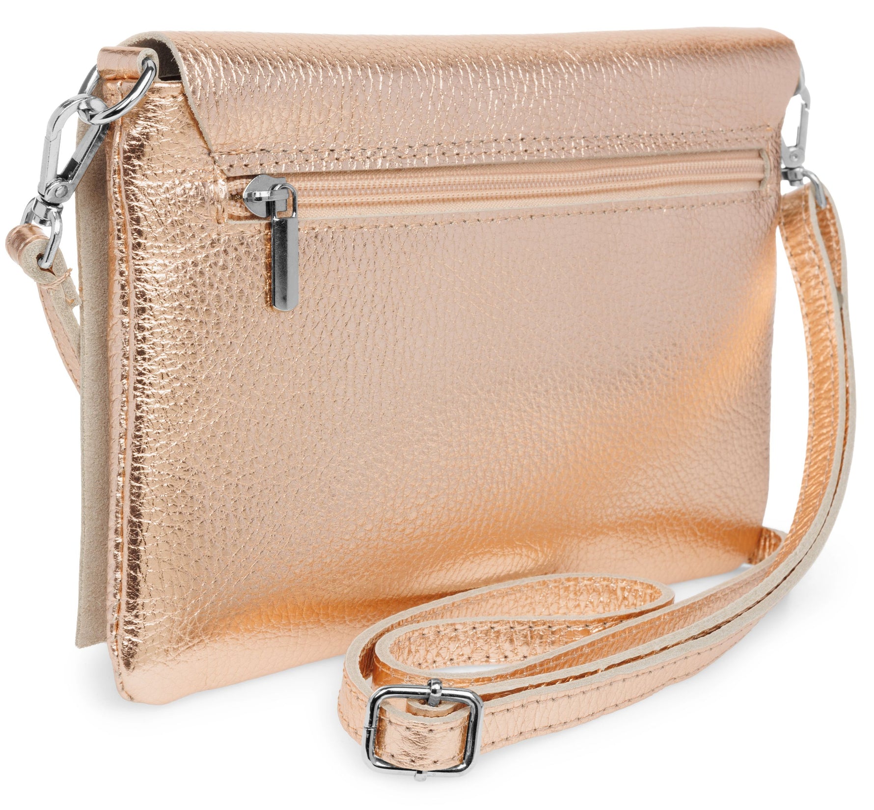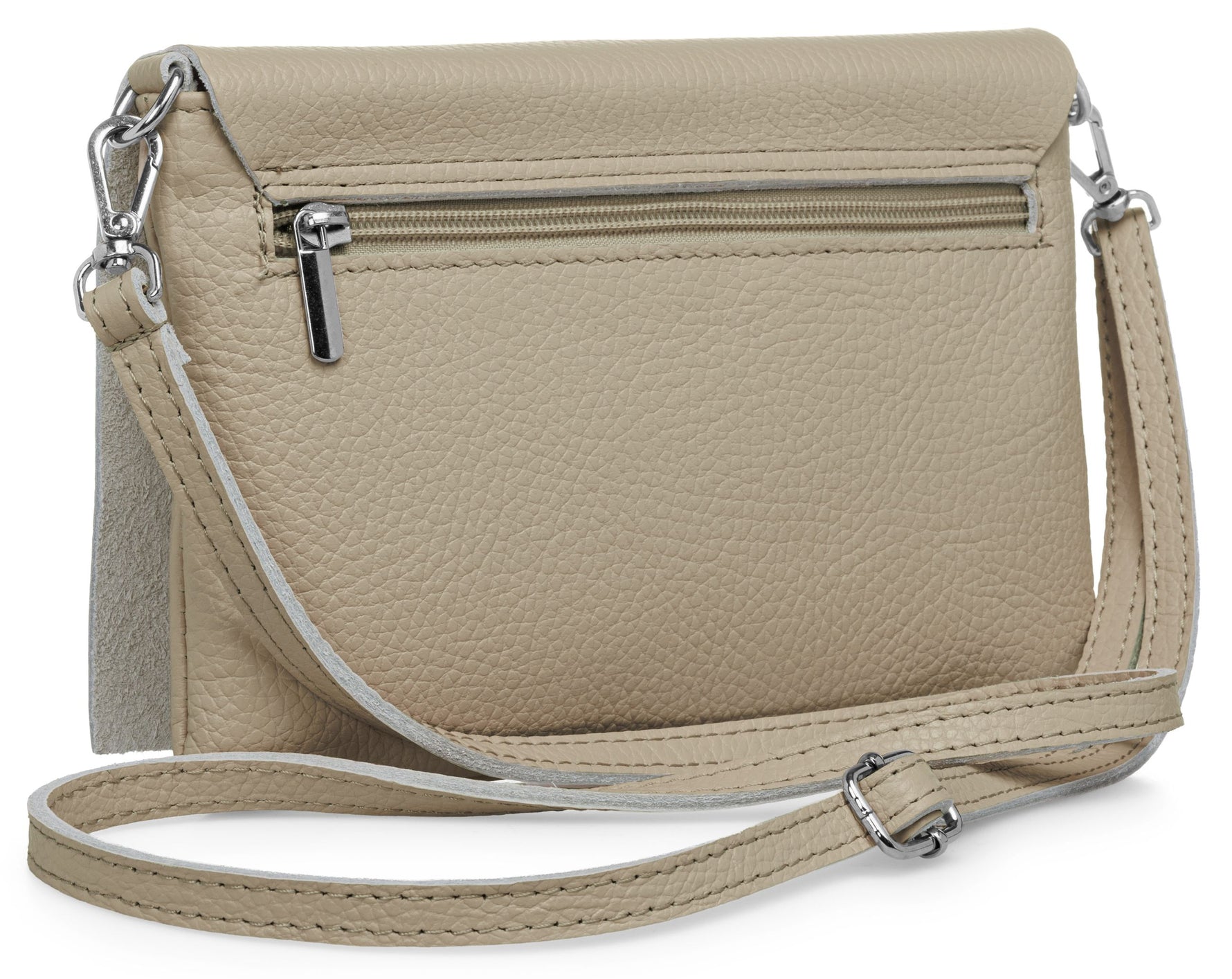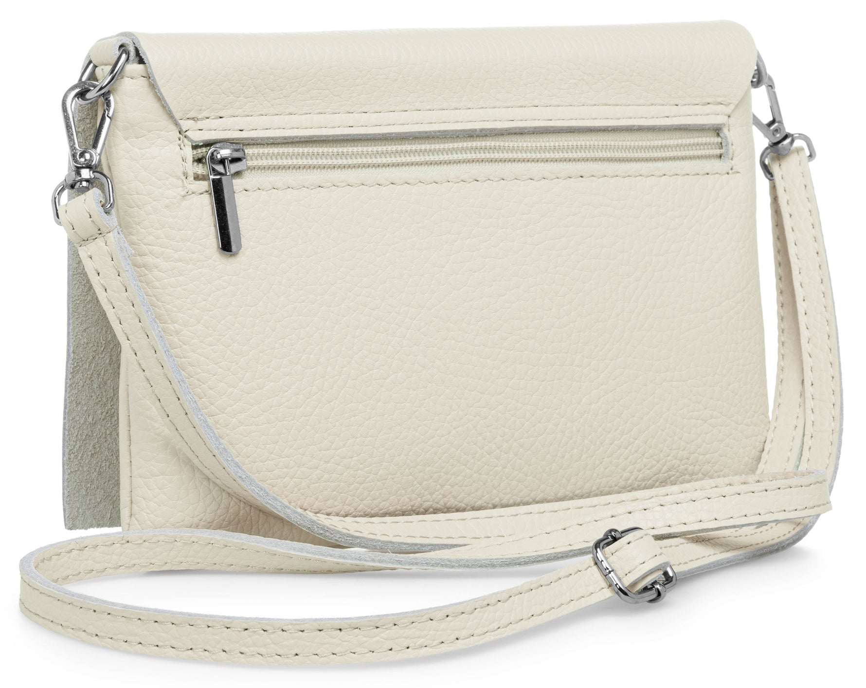 Unsere stilvolle Clutch aus hochwertigem, italienischem Dollaro-Leder vereint zeitlose Eleganz mit praktischer Funktionalität. Das fein genarbte Leder verleiht der Tasche eine natürliche Ausstrahlung und sorgt für einen angenehm weichen Griff. Ob als Clutch, Umhängetasche oder Abendtasche - sie ist ein vielseitiger Begleiter für Alltag und besondere Anlässe. Mit einer Größe von ca. 22,5 x 15,5 x 1,5 cm bietet die Tasche ausreichend Platz für deine Essentials wie Smartphone, Schlüssel, kleine Geldbörse oder Make-up. Der Innenraum ist mit einem edlen Stofffutter ausgekleidet und enthält ein praktisches Sicherheitsfach mit Reißverschluss, ideal für Karten oder andere wichtige Kleinigkeiten. Ein markanter Überschlag verleiht der Tasche nicht nur eine elegante Silhouette, sondern bietet durch den darunterliegenden Reißverschluss zusätzlichen Schutz für den Inhalt. Auf der Rückseite befindet sich ein weiteres, schnell zugängliches Reißverschlussfach – perfekt für Dinge, die man sofort griffbereit haben möchte. Der abnehmbare, längenverstellbare Schultergurt macht das Tragen flexibel - ob crossbody, über der Schulter oder als Clutch in der Hand. Mit einem Gewicht von ca. 235 Gramm bleibt sie dabei angenehm leicht und komfortabel.