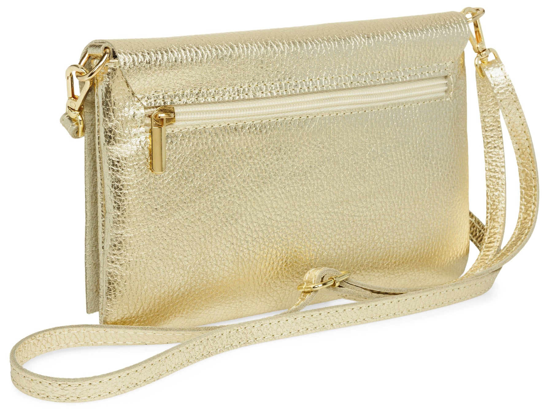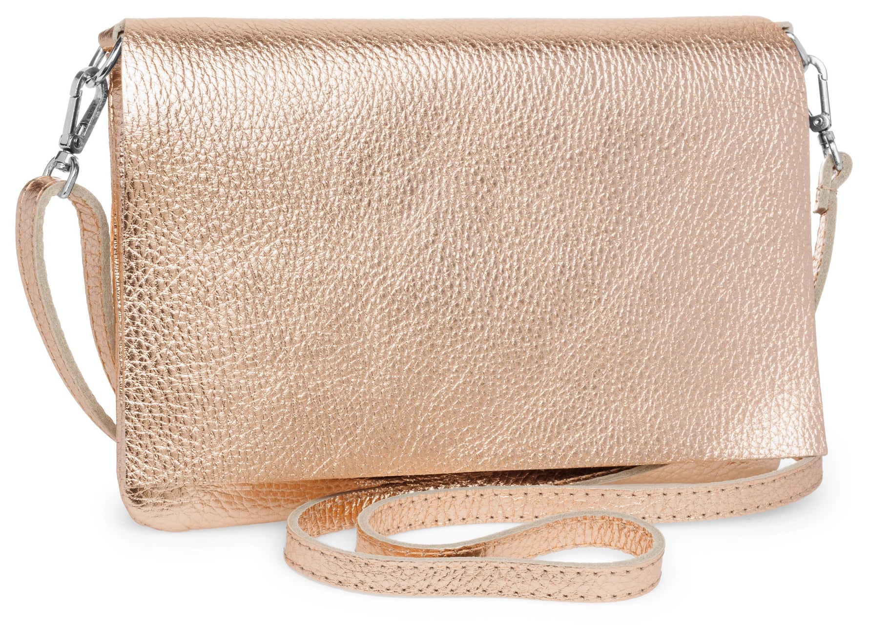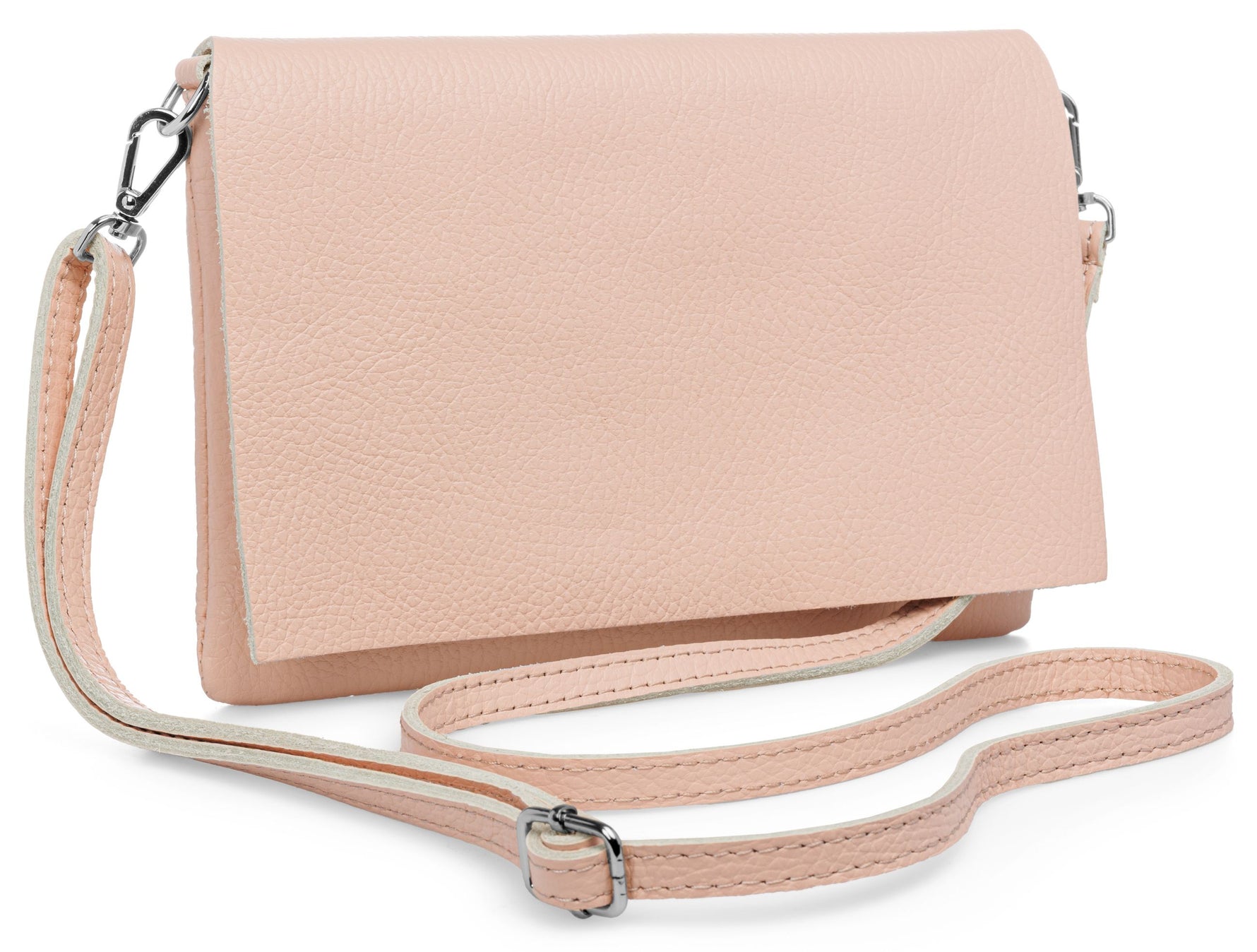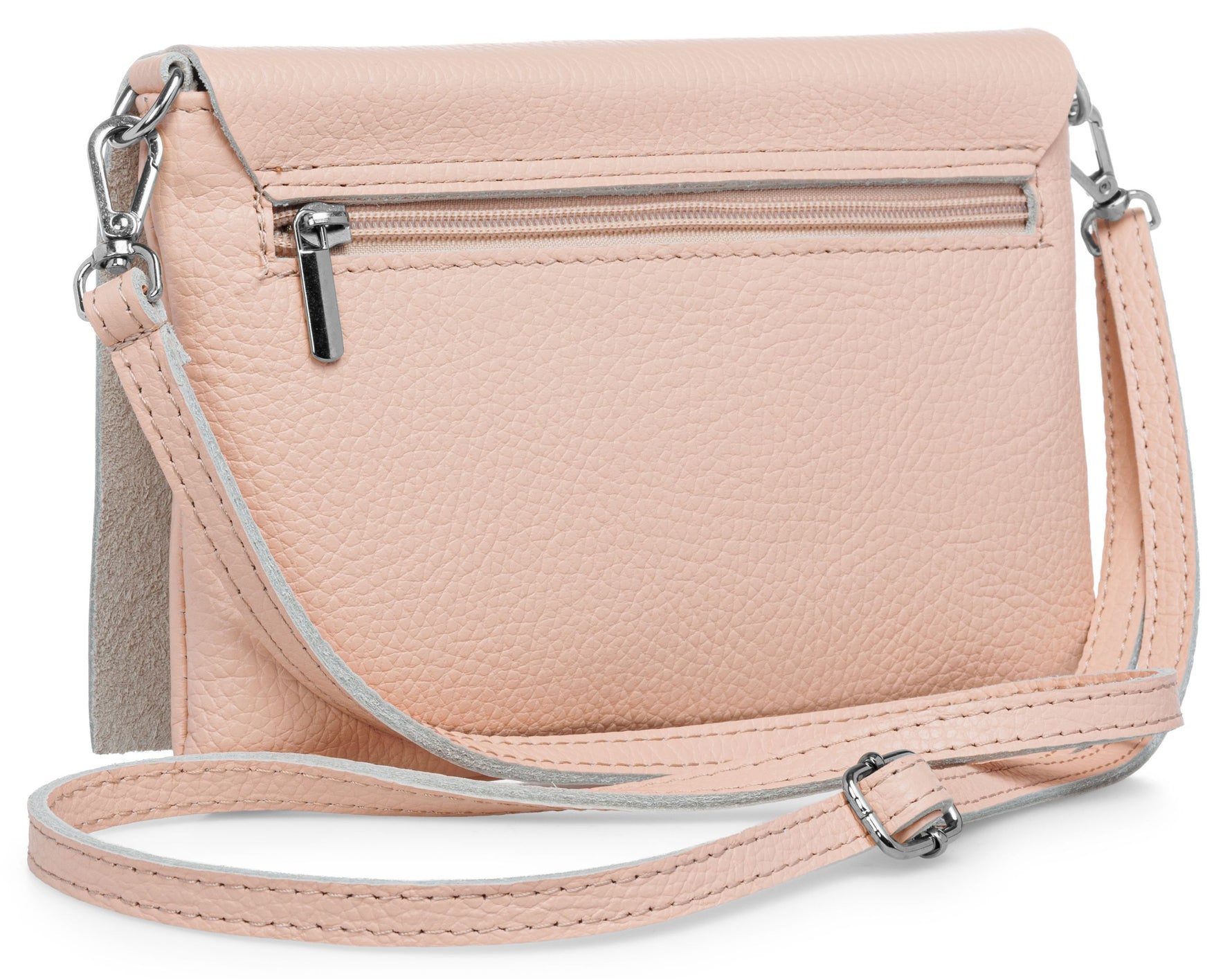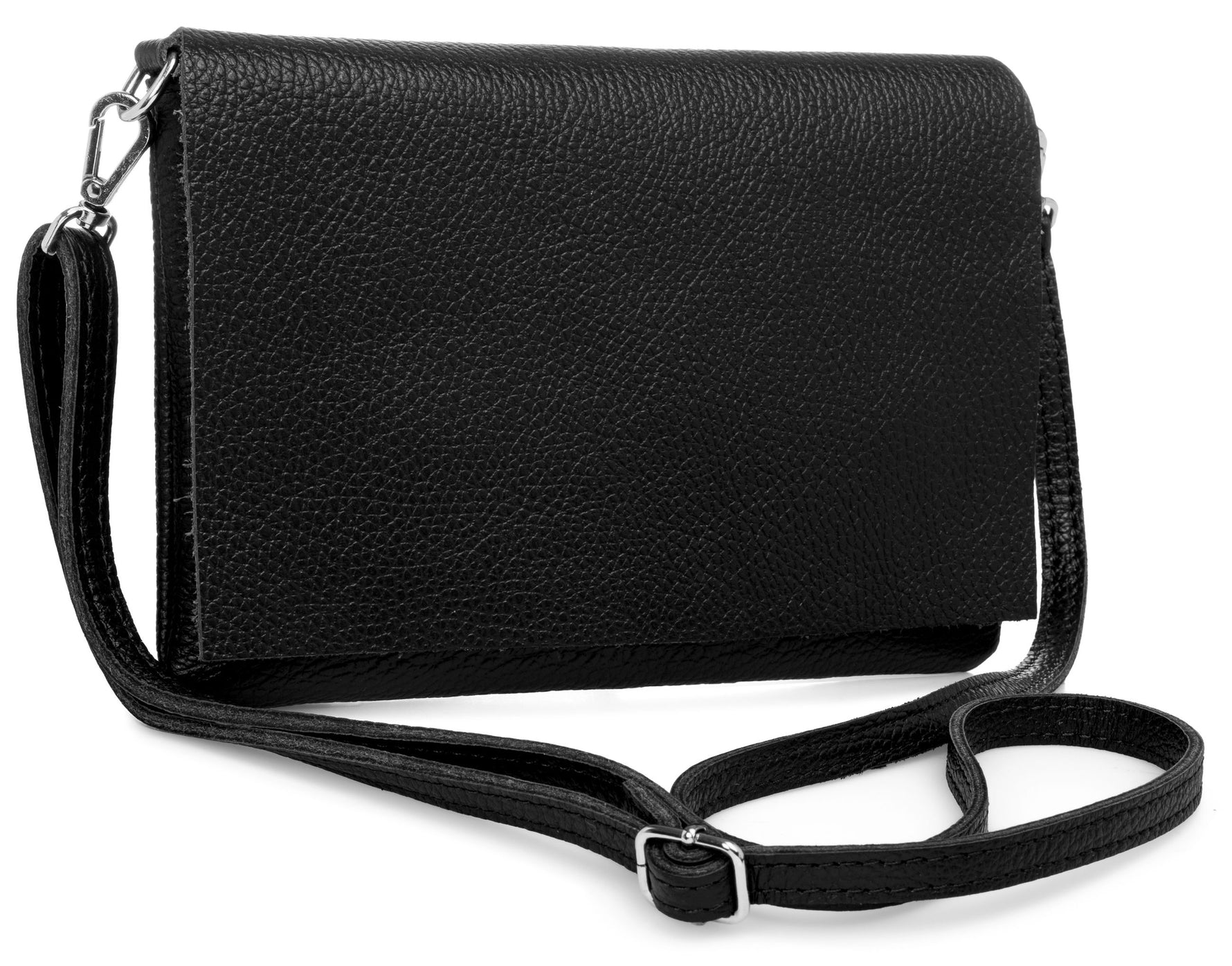 Unsere stilvolle Clutch aus hochwertigem, italienischem Dollaro-Leder vereint zeitlose Eleganz mit praktischer Funktionalität. Das fein genarbte Leder verleiht der Tasche eine natürliche Ausstrahlung und sorgt für einen angenehm weichen Griff. Ob als Clutch, Umhängetasche oder Abendtasche - sie ist ein vielseitiger Begleiter für Alltag und besondere Anlässe. Mit einer Größe von ca. 22,5 x 15,5 x 1,5 cm bietet die Tasche ausreichend Platz für deine Essentials wie Smartphone, Schlüssel, kleine Geldbörse oder Make-up. Der Innenraum ist mit einem edlen Stofffutter ausgekleidet und enthält ein praktisches Sicherheitsfach mit Reißverschluss, ideal für Karten oder andere wichtige Kleinigkeiten. Ein markanter Überschlag verleiht der Tasche nicht nur eine elegante Silhouette, sondern bietet durch den darunterliegenden Reißverschluss zusätzlichen Schutz für den Inhalt. Auf der Rückseite befindet sich ein weiteres, schnell zugängliches Reißverschlussfach – perfekt für Dinge, die man sofort griffbereit haben möchte. Der abnehmbare, längenverstellbare Schultergurt macht das Tragen flexibel - ob crossbody, über der Schulter oder als Clutch in der Hand. Mit einem Gewicht von ca. 235 Gramm bleibt sie dabei angenehm leicht und komfortabel.