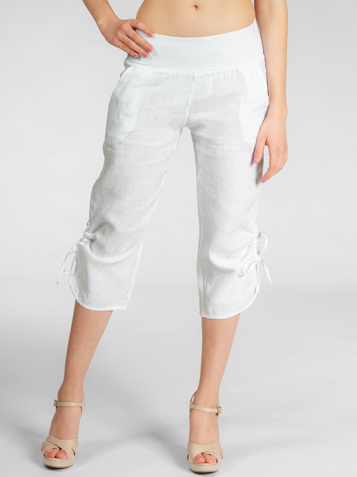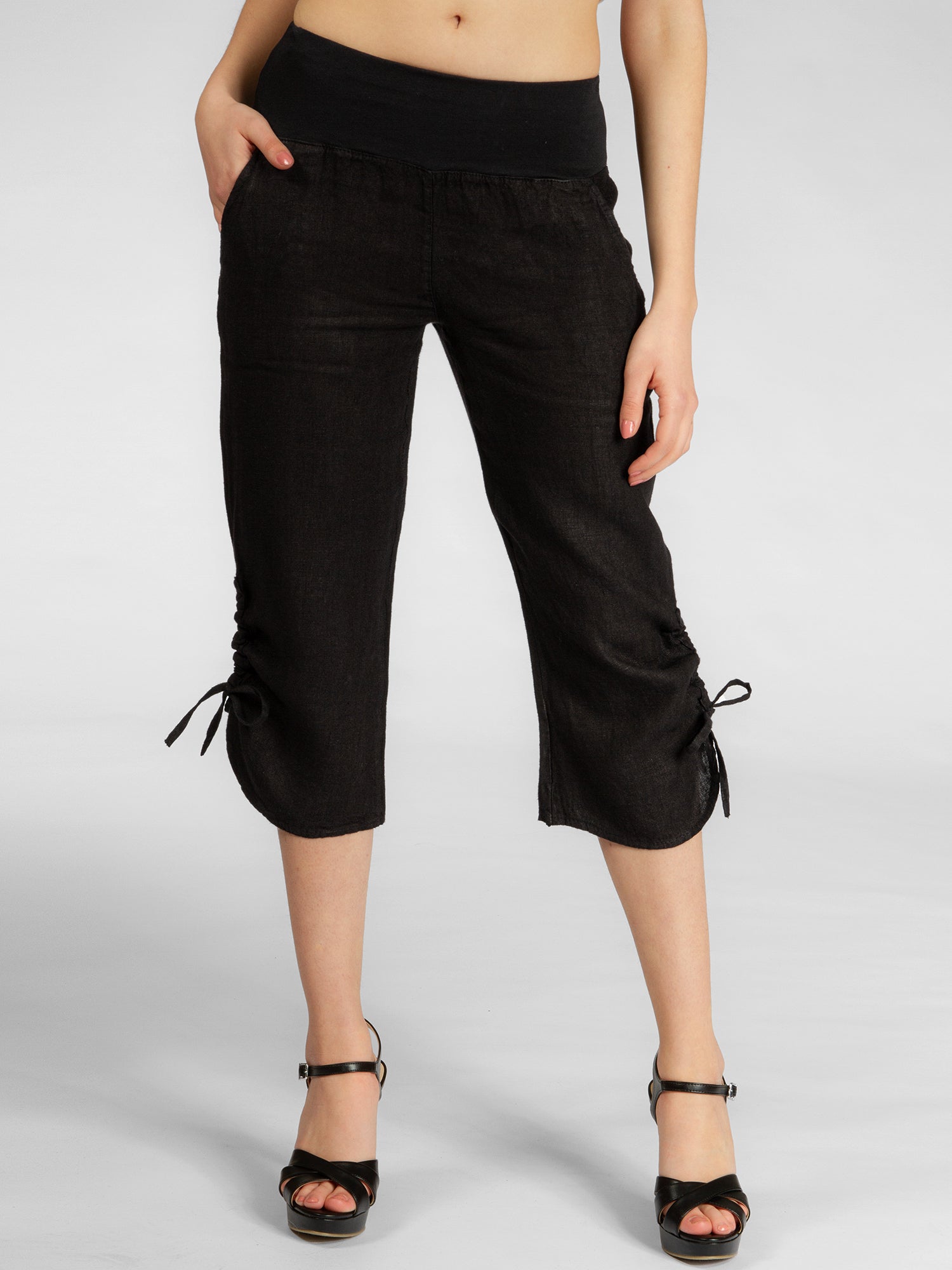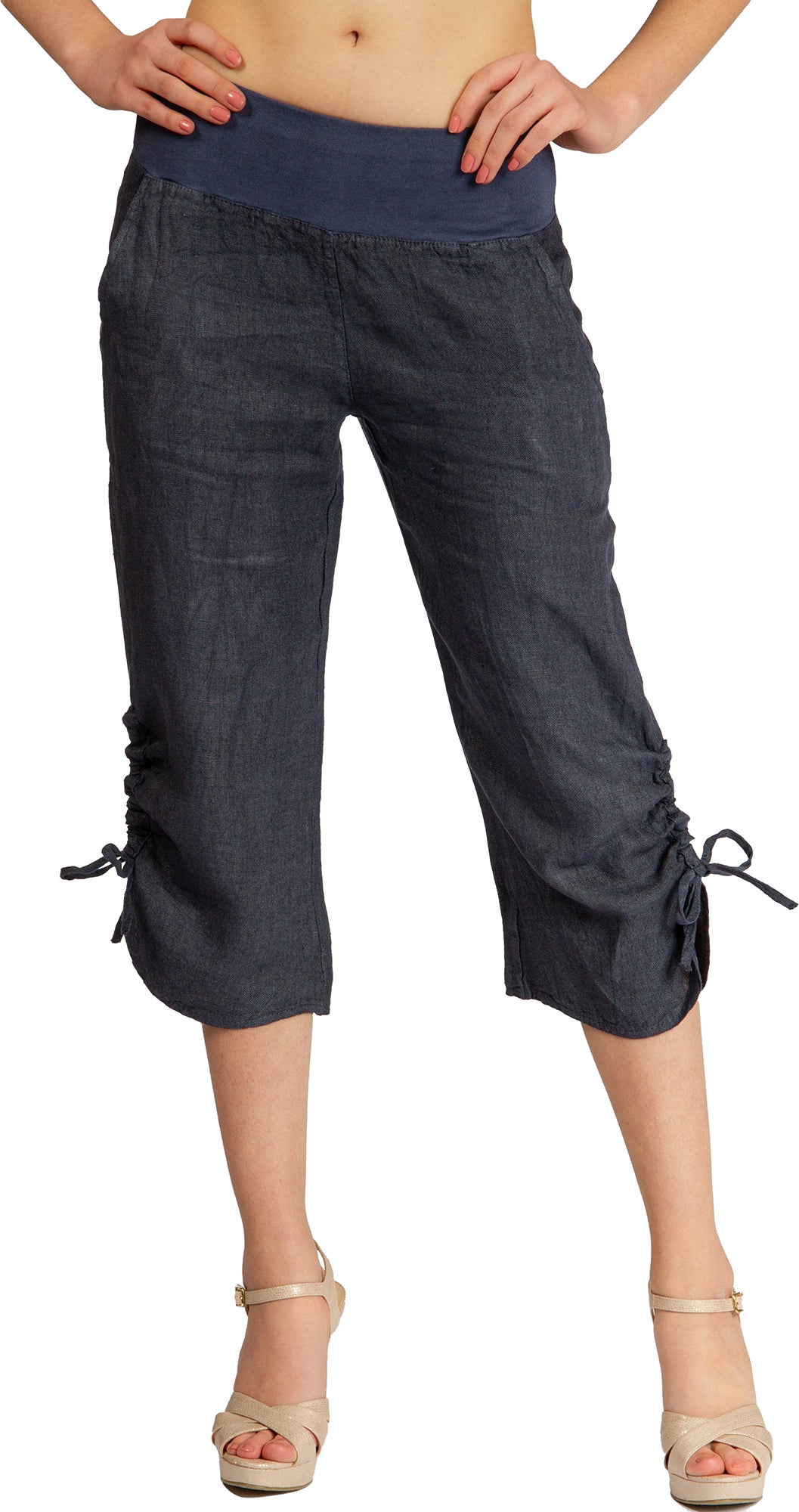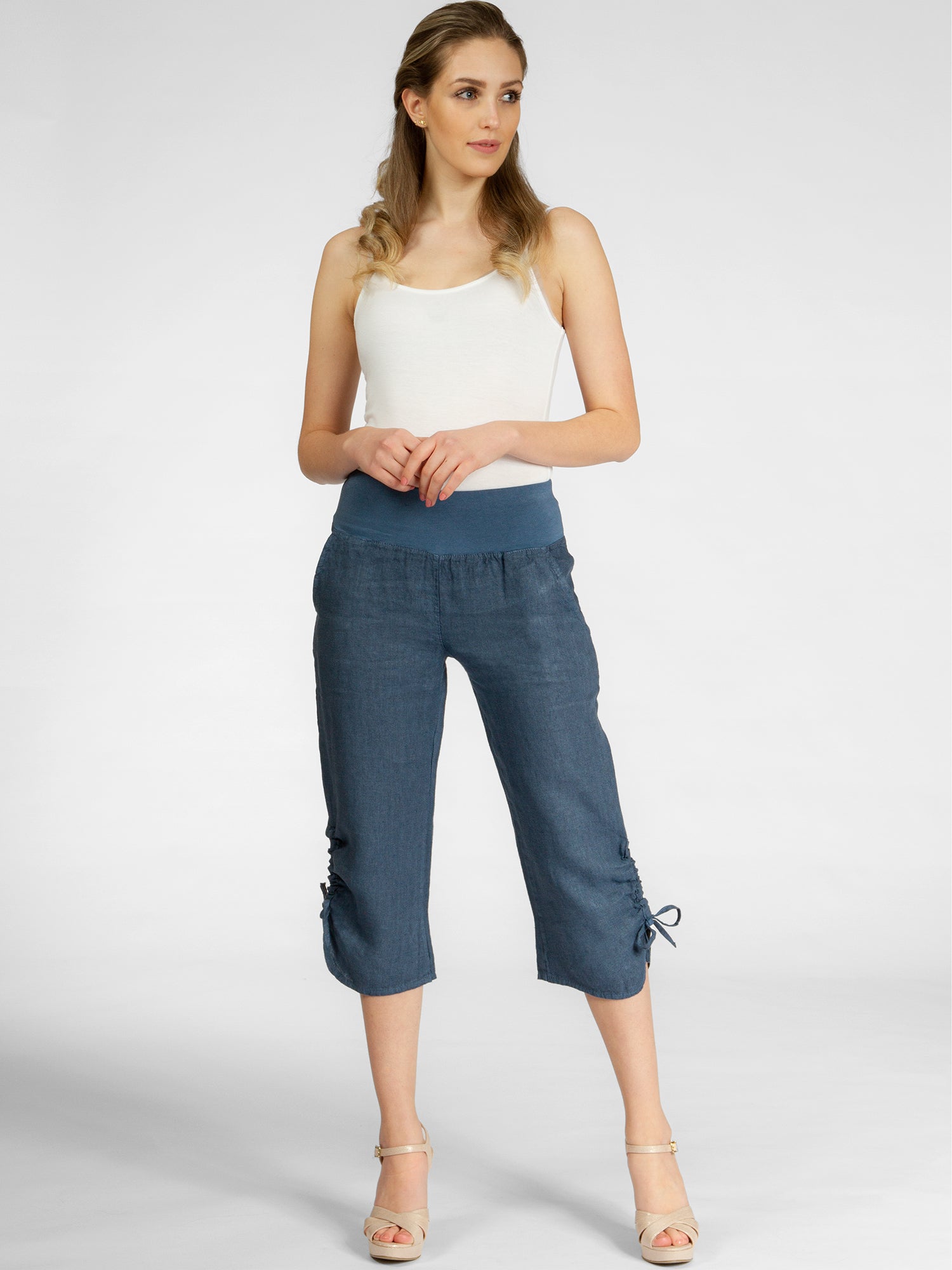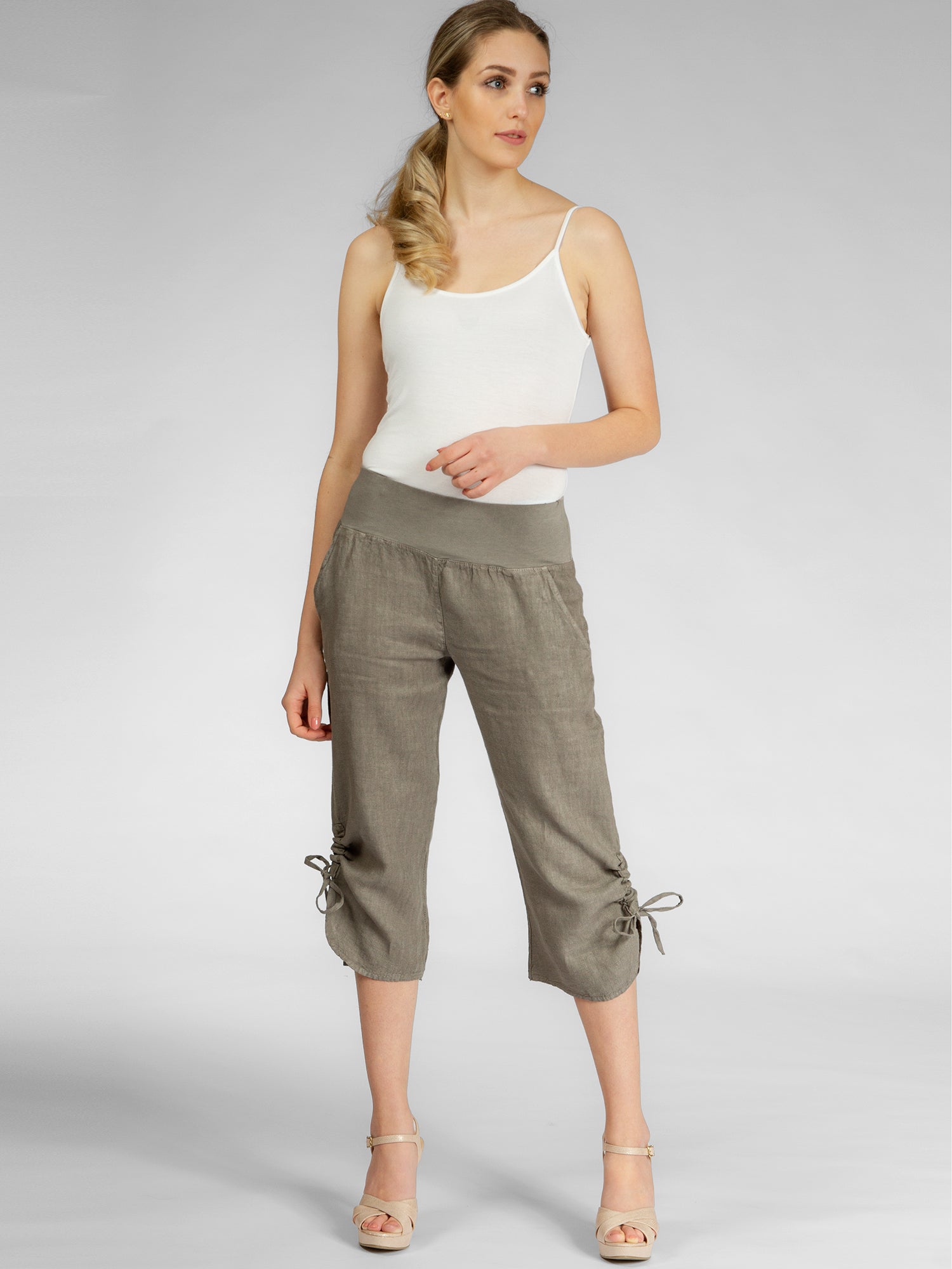 Sportlich elegante Casual 3/4 Sommerhose mit seitlicher Raffung aus besonders angenehmen Leinenstoff! Mit dieser stylischen Boyfriend Caprihose besitzt man einen individuellen Style und setzt klare Akzente denn man ist dank dieser komfortablen kurzen Sommerhose immer top aktuell und modisch gekleidet. Egal ob mit klassischen Pumps und Bluse ins Büro oder mit lässigem Shirt und Sneaker am Wochenende! Zu dieser Hose passt einfach alles. Viel Platz hast du in den Seitentaschen. Das Material besteht zu 100 % aus Leinen und sorgt für ein super angenehmes, leichtes Tragegefühl. Material: 100% Leinen. Problemlos waschbar bei 30°C. Caspar Fashion - Made in Italy.