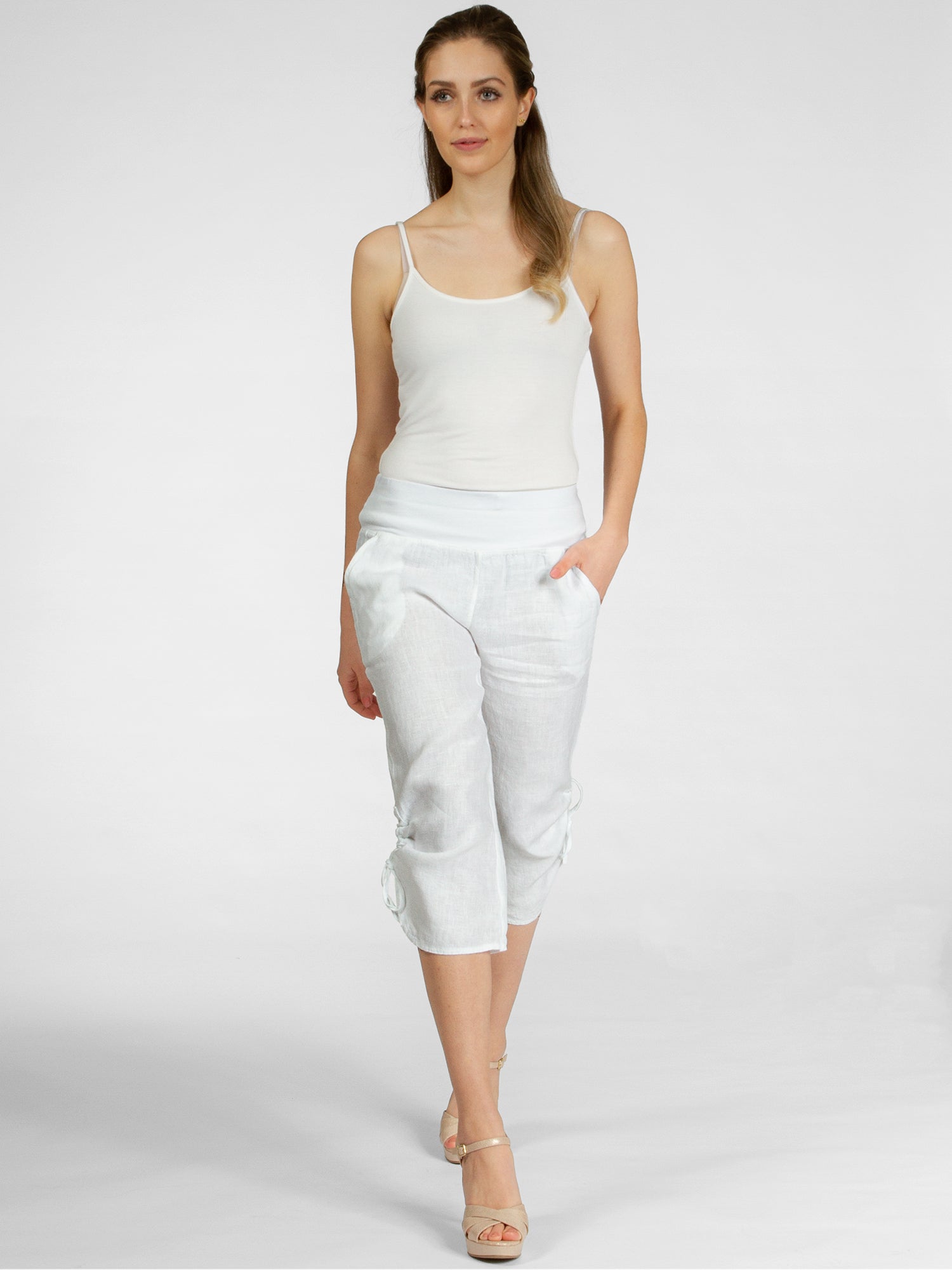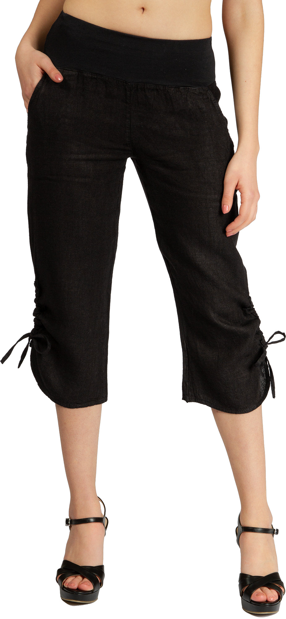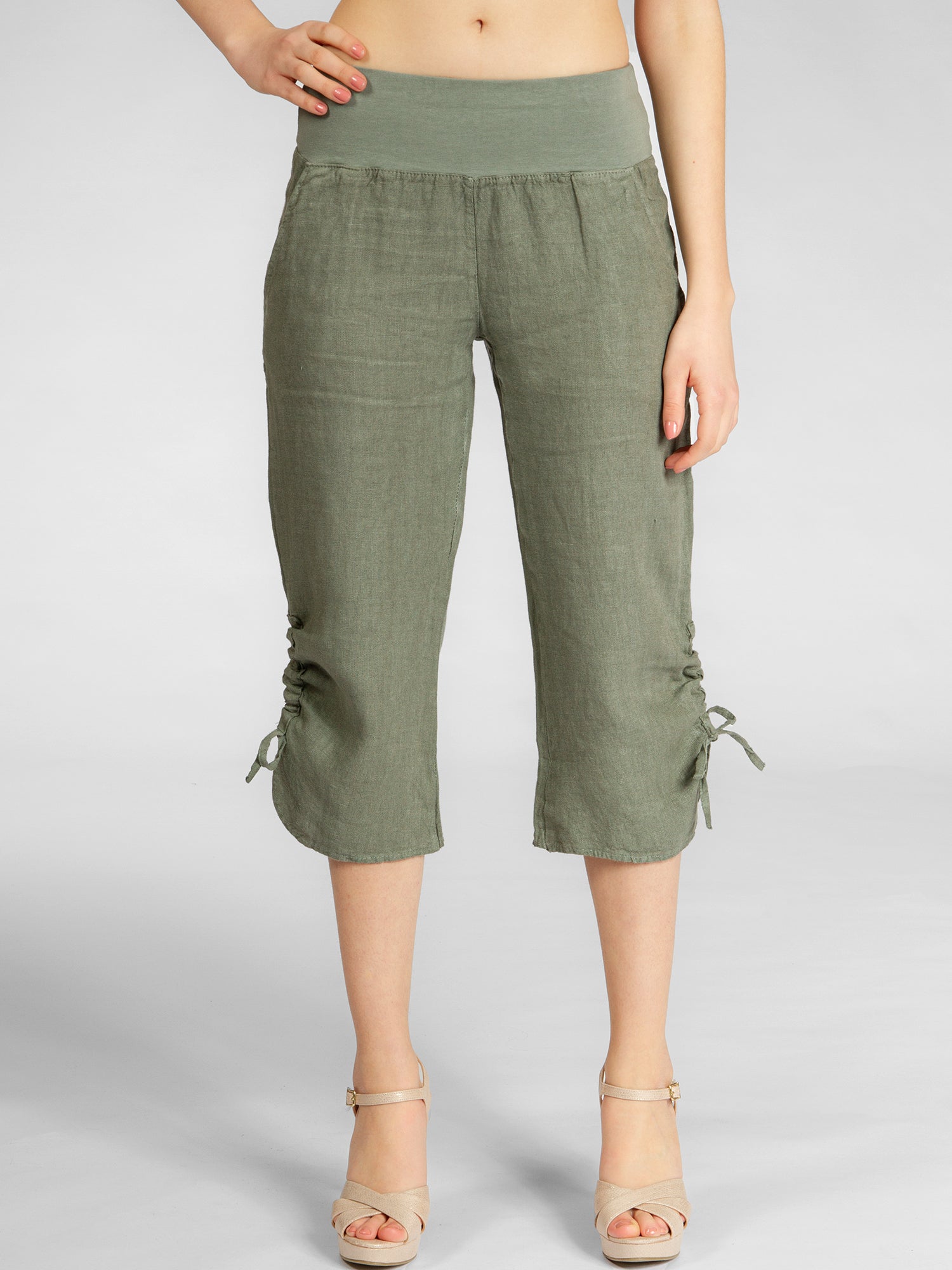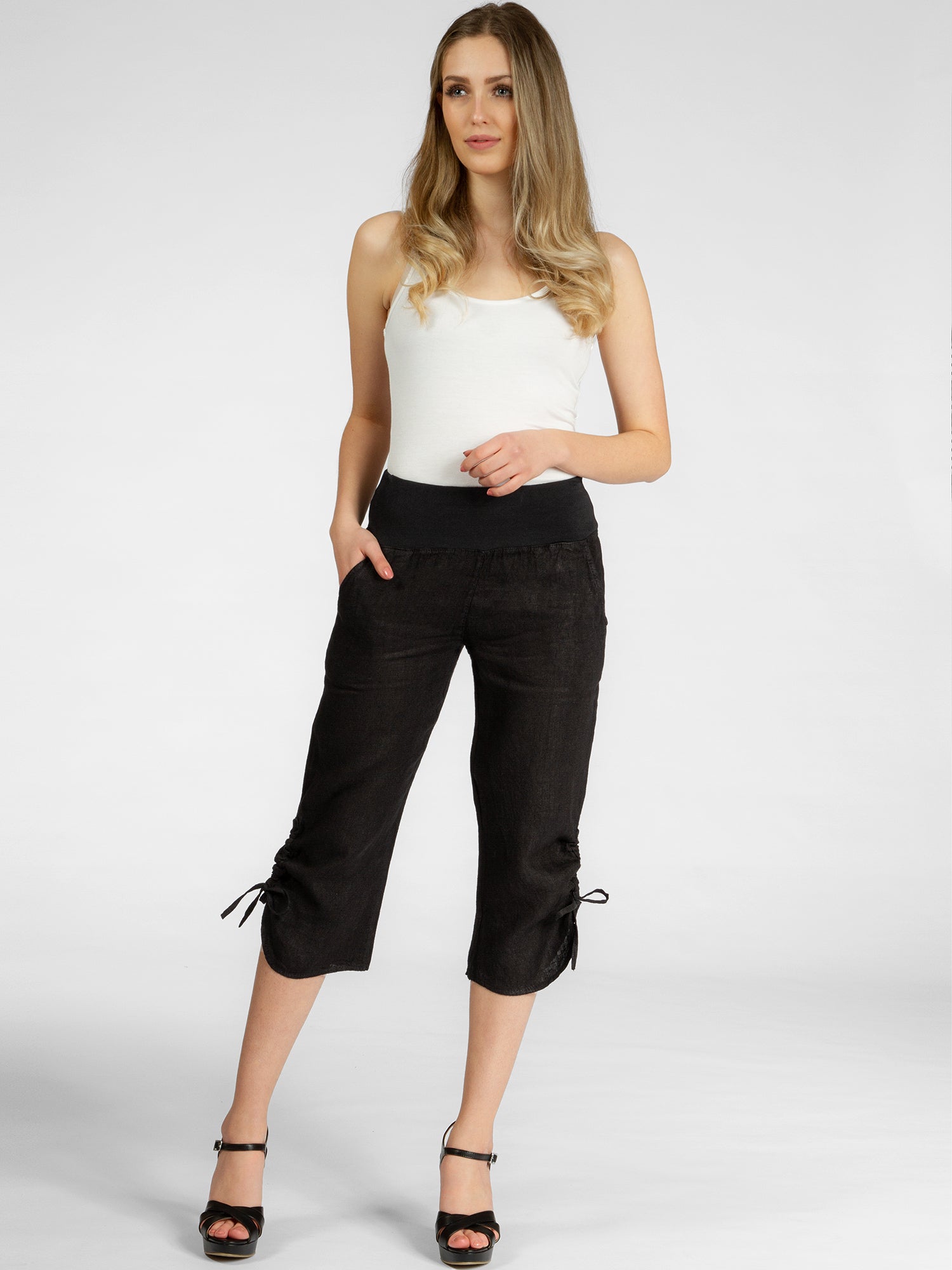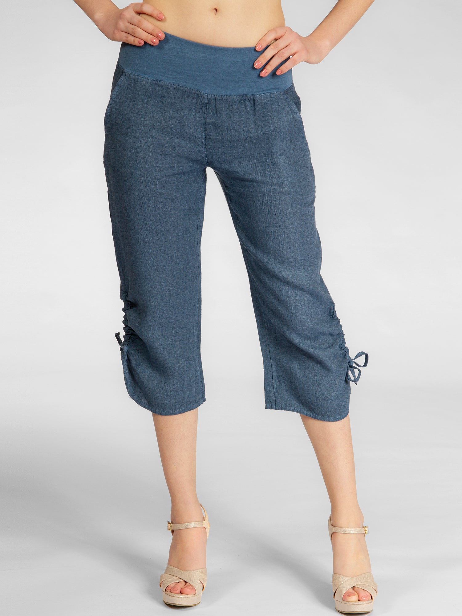 Sportlich elegante Casual 3/4 Sommerhose mit seitlicher Raffung aus besonders angenehmen Leinenstoff! Mit dieser stylischen Boyfriend Caprihose besitzt man einen individuellen Style und setzt klare Akzente denn man ist dank dieser komfortablen kurzen Sommerhose immer top aktuell und modisch gekleidet. Egal ob mit klassischen Pumps und Bluse ins Büro oder mit lässigem Shirt und Sneaker am Wochenende! Zu dieser Hose passt einfach alles. Viel Platz hast du in den Seitentaschen. Das Material besteht zu 100 % aus Leinen und sorgt für ein super angenehmes, leichtes Tragegefühl. Material: 100% Leinen. Problemlos waschbar bei 30°C. Caspar Fashion - Made in Italy.