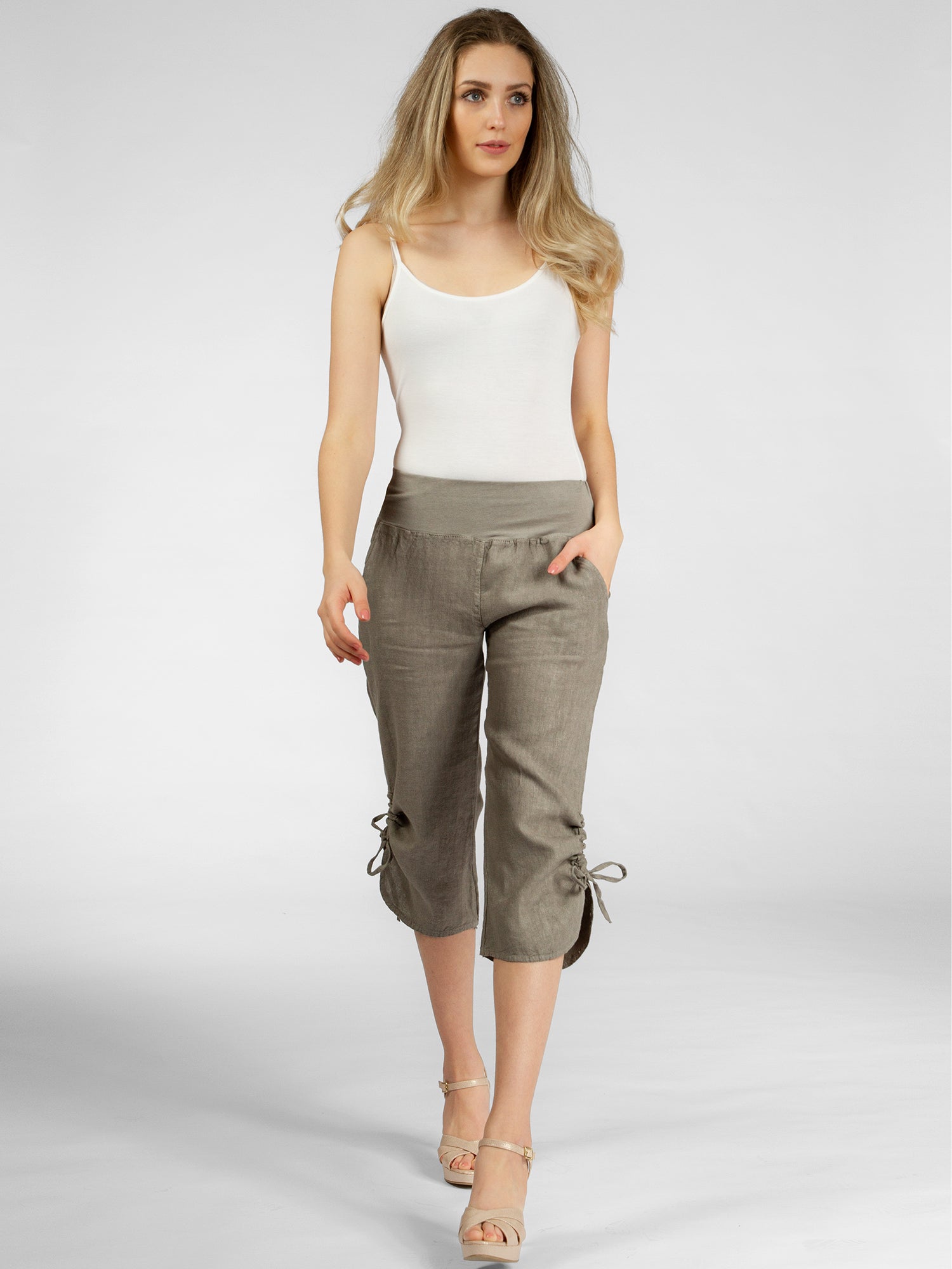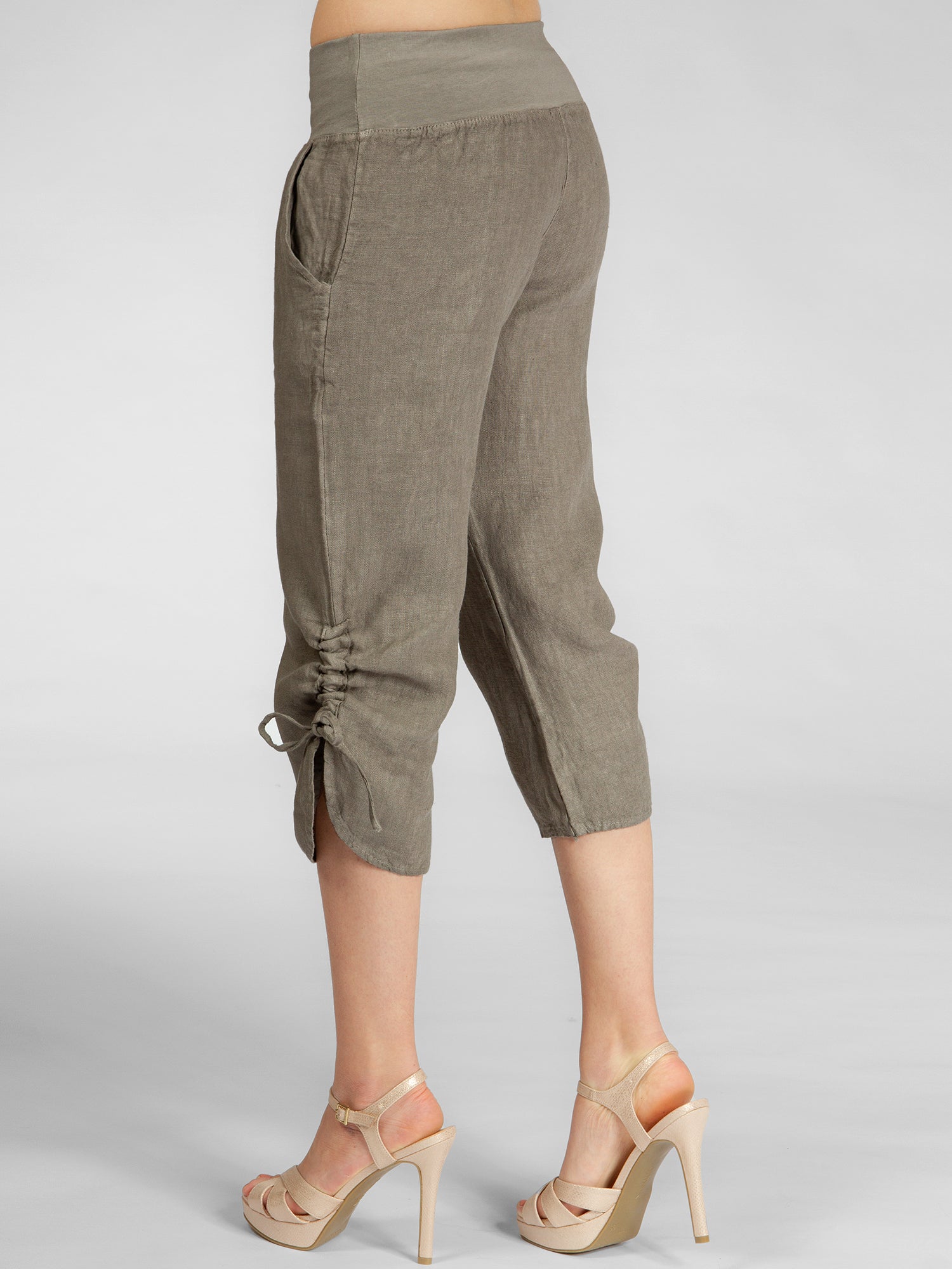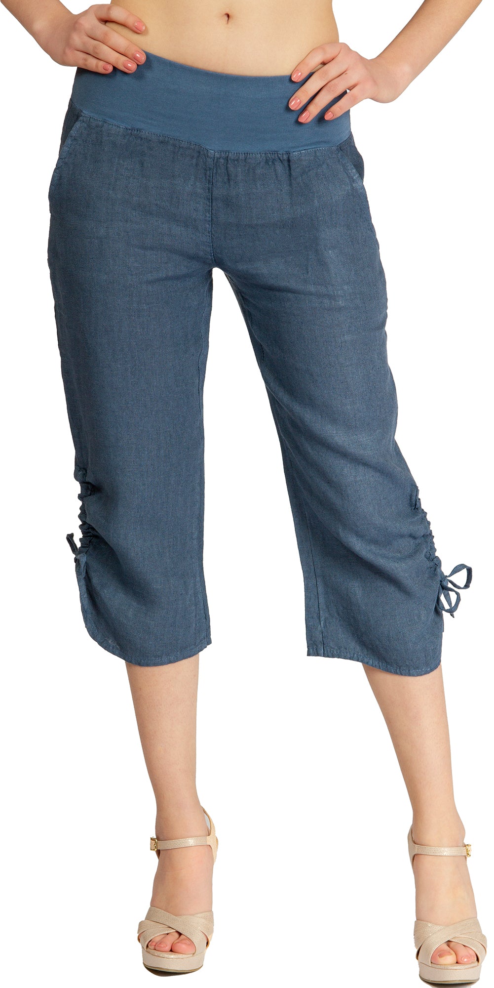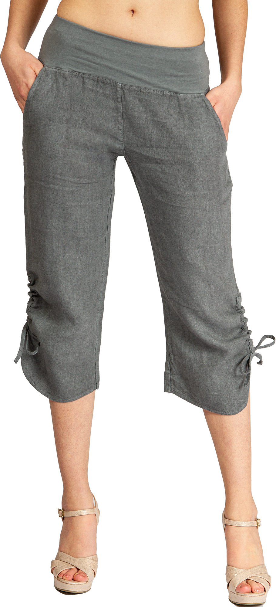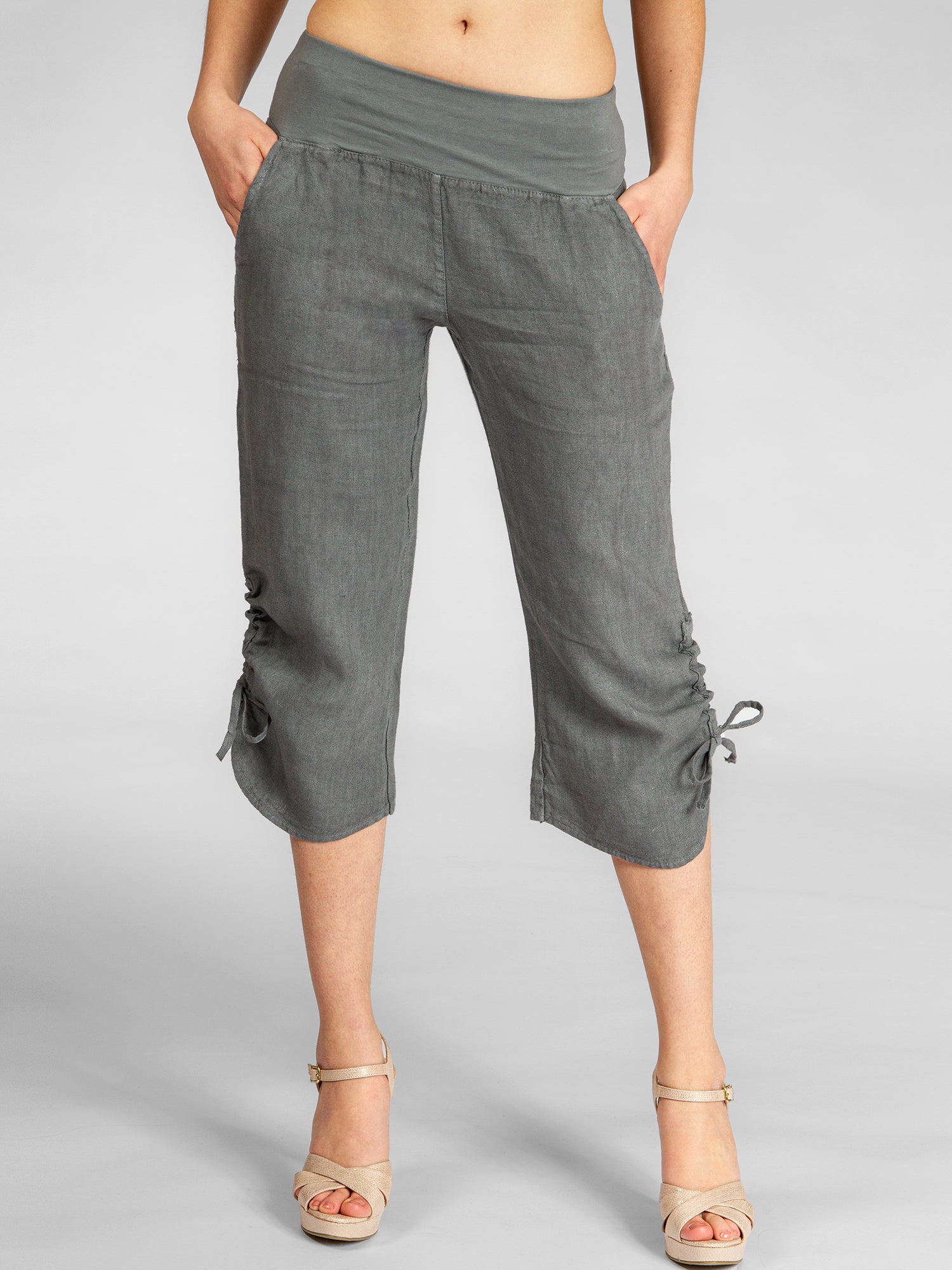 Sportlich elegante Casual 3/4 Sommerhose mit seitlicher Raffung aus besonders angenehmen Leinenstoff! Mit dieser stylischen Boyfriend Caprihose besitzt man einen individuellen Style und setzt klare Akzente denn man ist dank dieser komfortablen kurzen Sommerhose immer top aktuell und modisch gekleidet. Egal ob mit klassischen Pumps und Bluse ins Büro oder mit lässigem Shirt und Sneaker am Wochenende! Zu dieser Hose passt einfach alles. Viel Platz hast du in den Seitentaschen. Das Material besteht zu 100 % aus Leinen und sorgt für ein super angenehmes, leichtes Tragegefühl. Material: 100% Leinen. Problemlos waschbar bei 30°C. Caspar Fashion - Made in Italy.