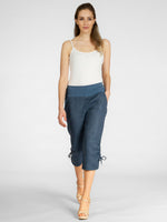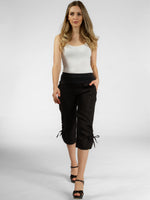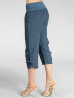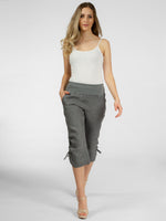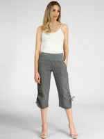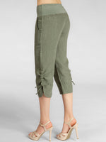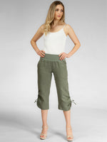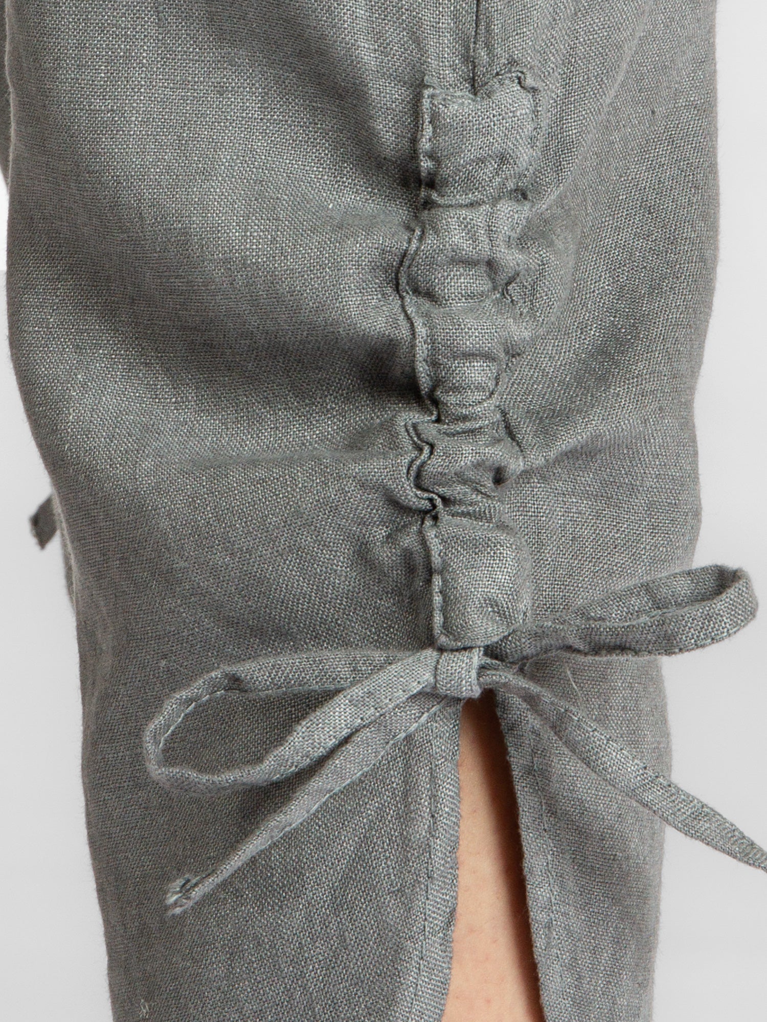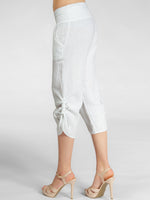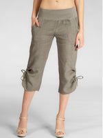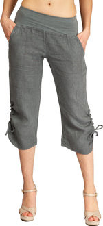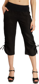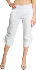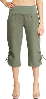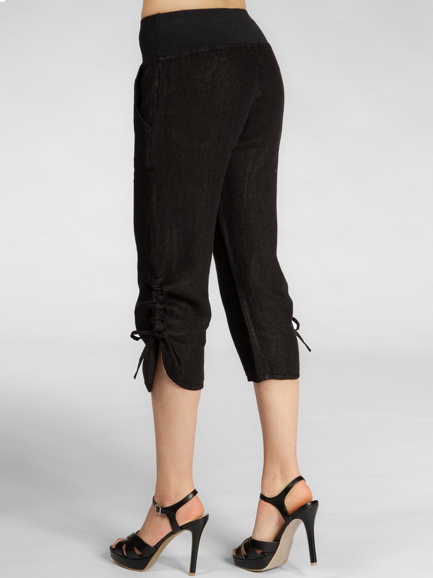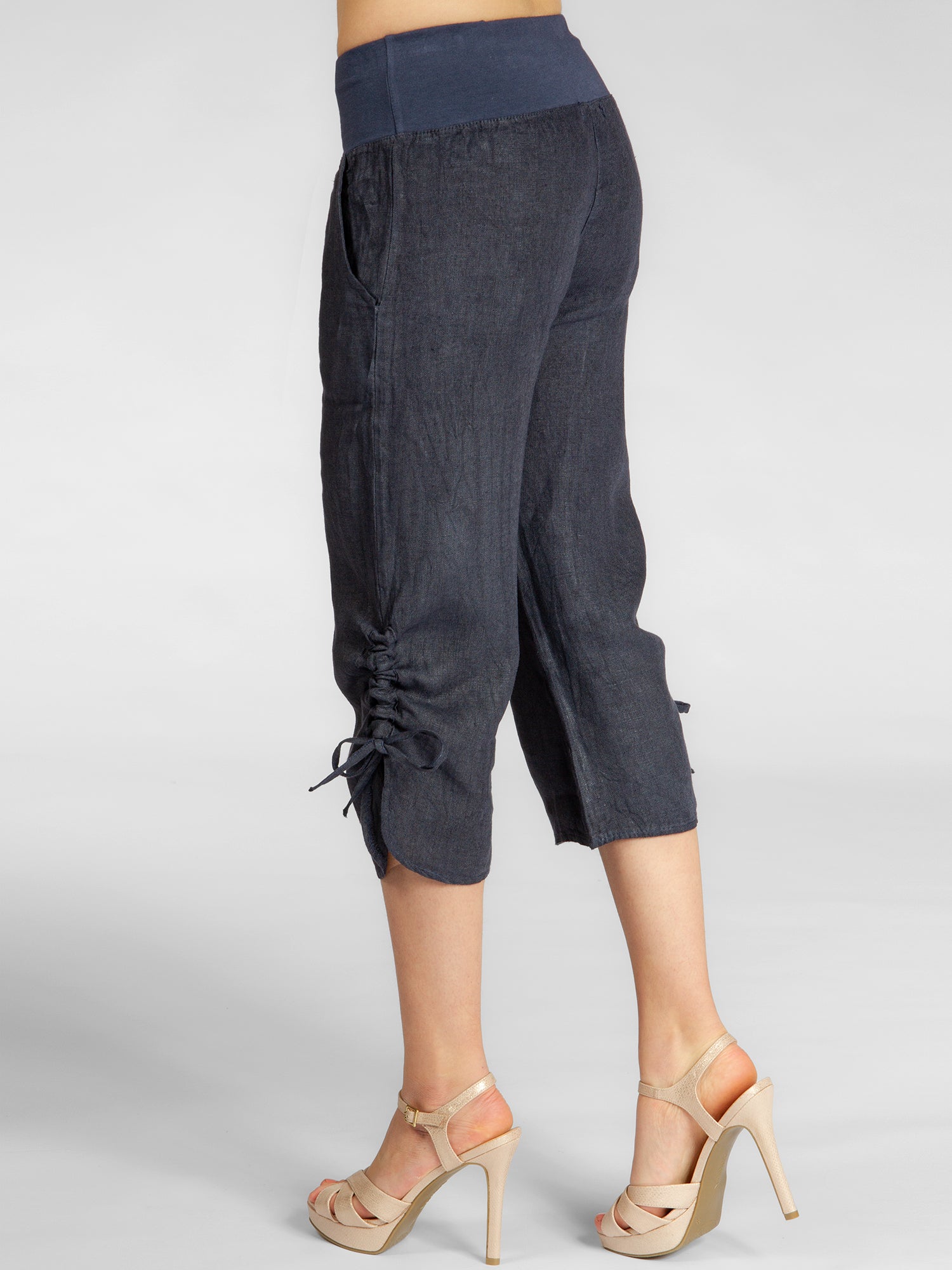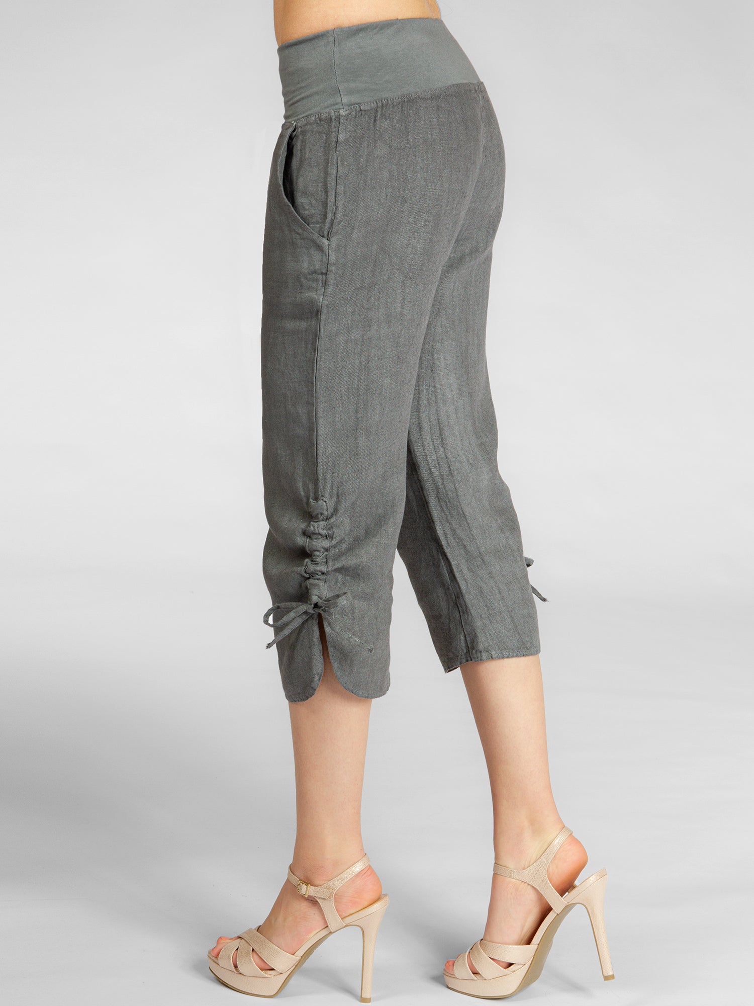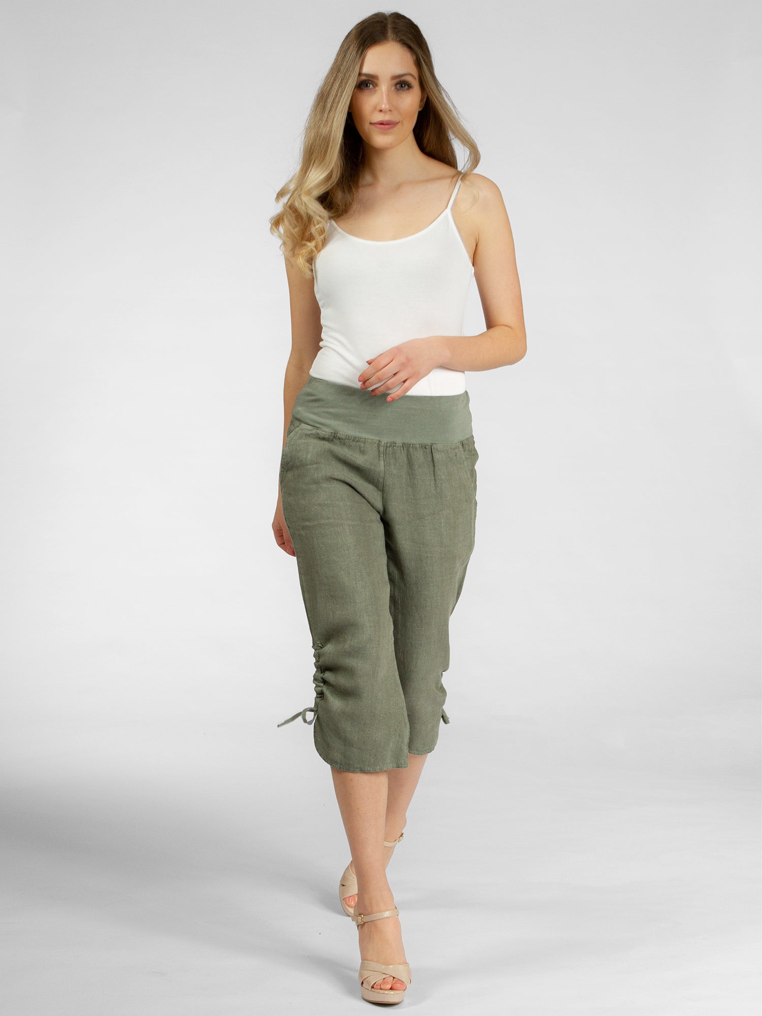 Sportlich elegante Casual 3/4 Sommerhose mit seitlicher Raffung aus besonders angenehmen Leinenstoff! Mit dieser stylischen Boyfriend Caprihose besitzt man einen individuellen Style und setzt klare Akzente denn man ist dank dieser komfortablen kurzen Sommerhose immer top aktuell und modisch gekleidet. Egal ob mit klassischen Pumps und Bluse ins Büro oder mit lässigem Shirt und Sneaker am Wochenende! Zu dieser Hose passt einfach alles. Viel Platz hast du in den Seitentaschen. Das Material besteht zu 100 % aus Leinen und sorgt für ein super angenehmes, leichtes Tragegefühl. Material: 100% Leinen. Problemlos waschbar bei 30°C. Caspar Fashion - Made in Italy.
