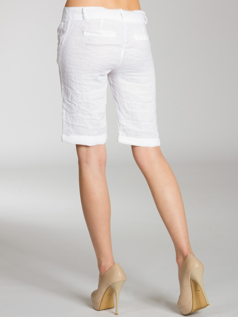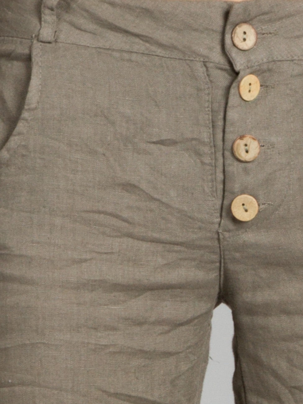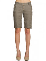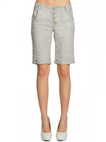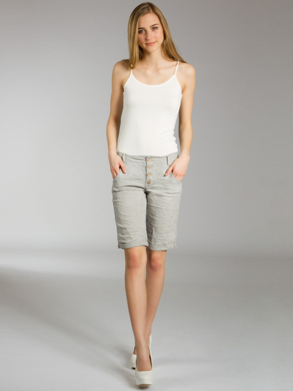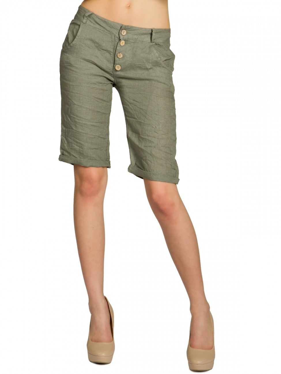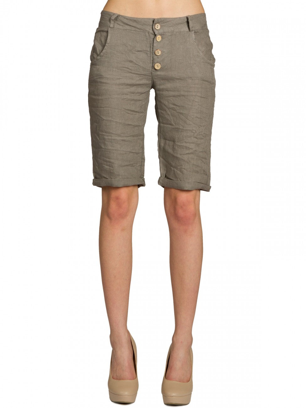 Sportlich elegante Casual Shorts aus besonders leichtem Leinenstoff ! Die Hose ist dank ihrem klassisch eleganten Schnitt vielseitig kombinierbar. Egal ob mit Pumps und Bluse oder mit buntem Shirt und Ballerinas die Hose passt sich ihrem Stil an. Sie besitzt eine Knopfleiste mit vier naturfarbenen Kokosknöpfen. Der lässige 4 Pocket Style der Hose sorgt für die sportliche Note wobei die hinteren Taschen nur angedeutet sind. Das Material trägt nicht auf und bietet ein sehr angenehmes, leichtes Tragegefühl. HINWEIS: Im Lieferzustand sind die Beine nicht umgekrempelt können aber leicht selbst zweifach umgekrempelt und umgebügelt werden. Material: 100% Leinen. Problemlos waschbar bei 30°C. CASPAR Fashion Collection - Made in Italy.