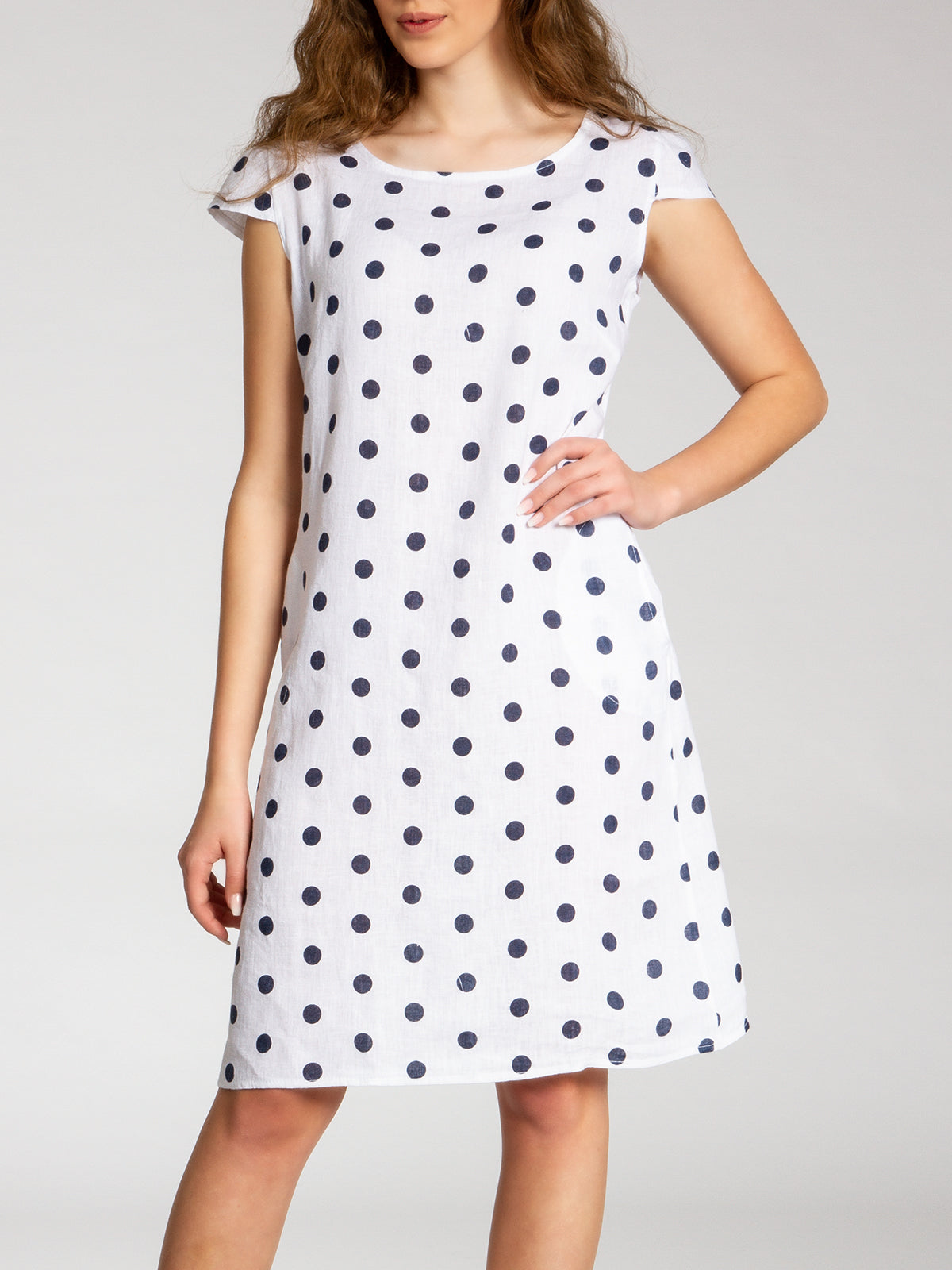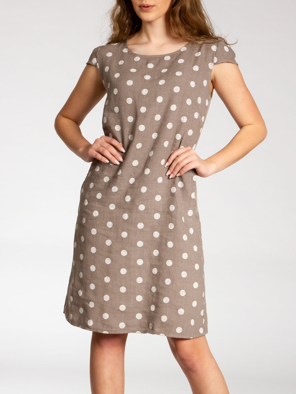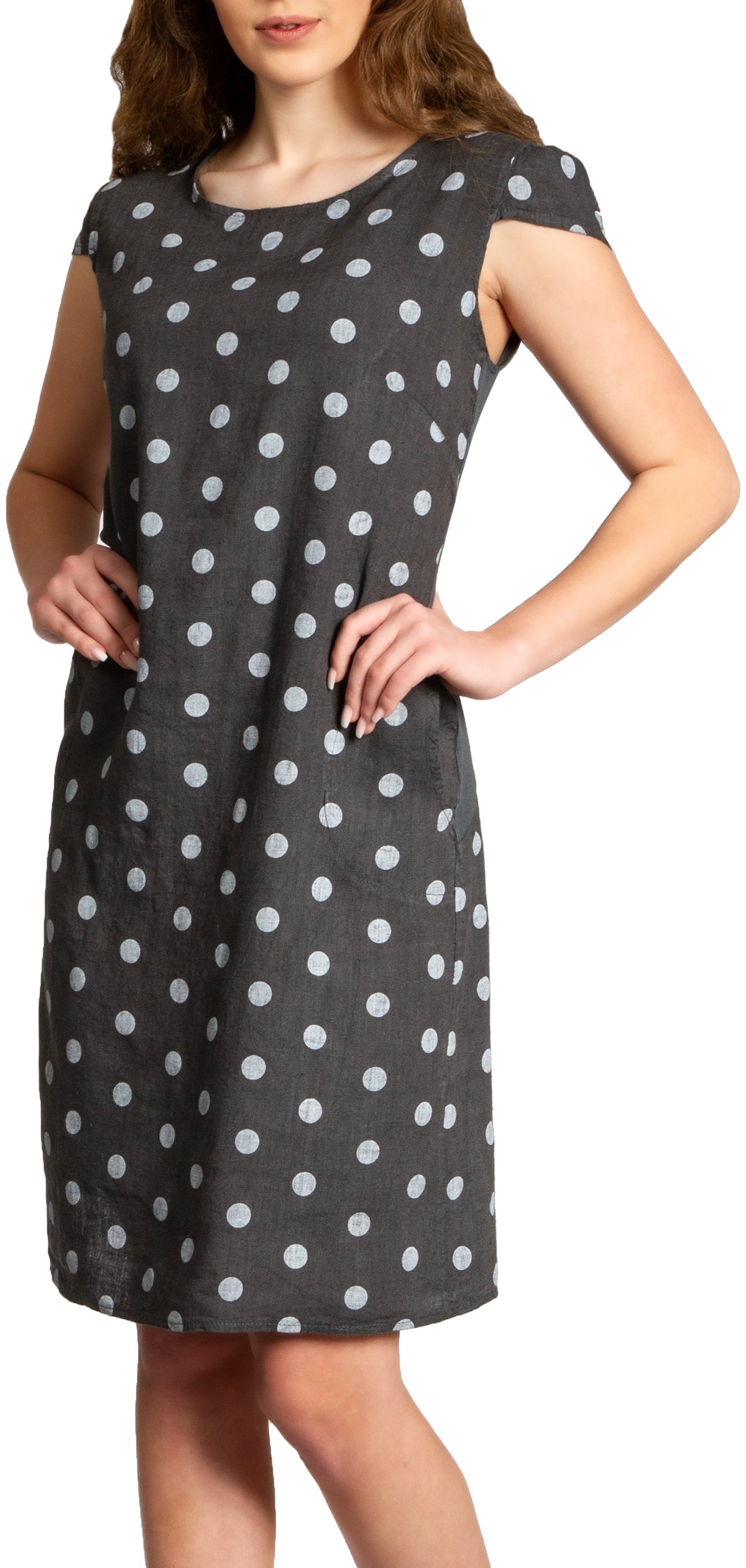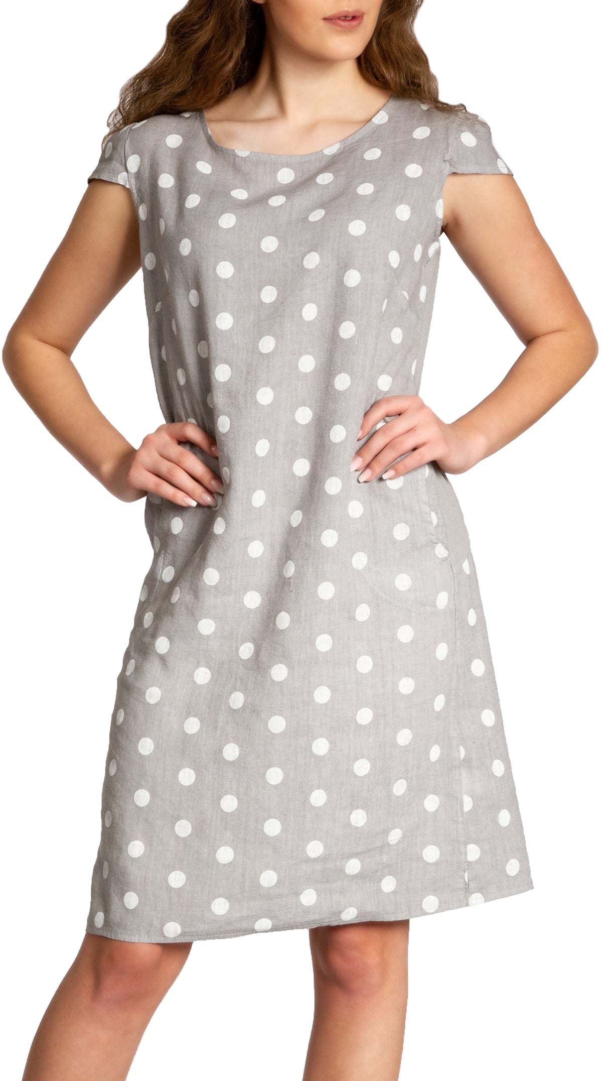 Lässiges, bequemes Damen Sommerkleid aus 100% Leinen. Dieses knielange Kleid ist besonders an heißen Tagen super angenehm zu Tragen. Der bequeme, nur leicht taillierte Schnitt kaschiert geschickt kleine Problemzonen und das luftig leichte, natürliche Material bietet einen ausgesprochen hohen Tragekomfort. Seitlich hinten vom Ärmel bis zur Hüfte verläuft zusätzlich ein schmaler leicht dehnbarer Ripp-Einsatz. Das Kleid ist mit einem eleganten 60er Retro Punkte Muster bedruckt. Auf der Vorderseite befinden sich in Taillenhöhe 2 seitliche Eingrifftaschen. Beweisen Sie Stil und Klasse mit diesem schlichten, hochwertigen Design dieses wundervollen Sommerkleides. Material: 100% Leinen. Pflegehinweis: Maschinenwäsche bei 30 Grad. Caspar Fashion GmbH - Made in Italy.