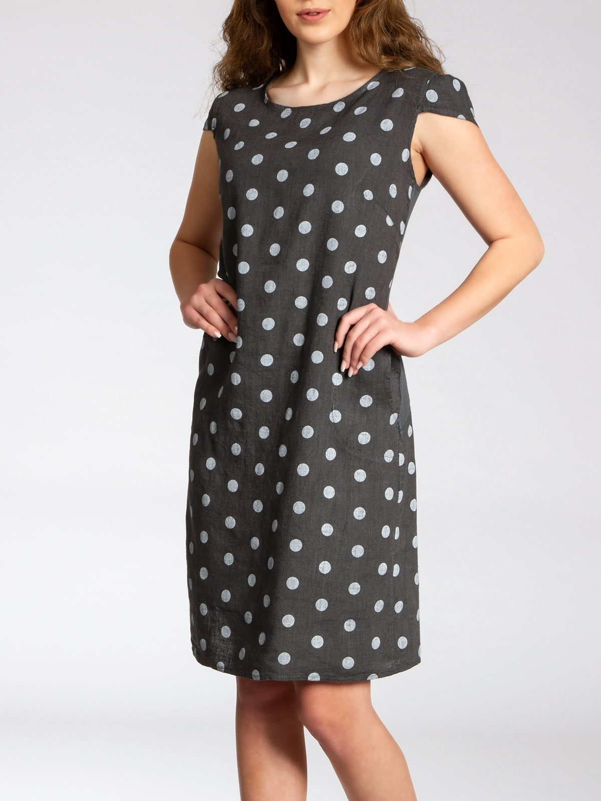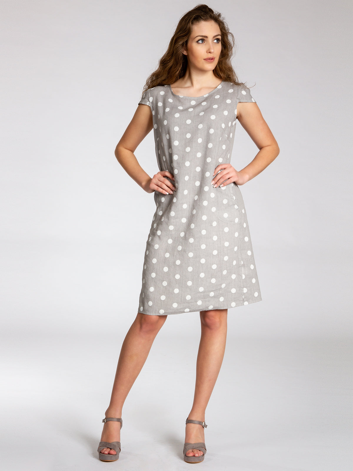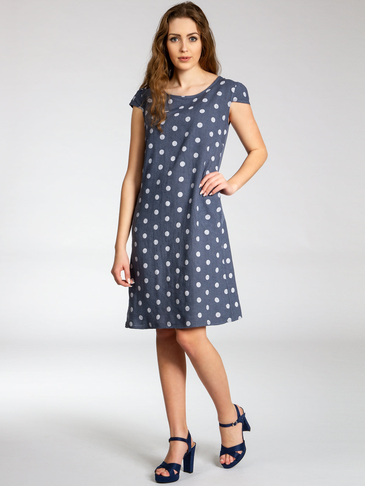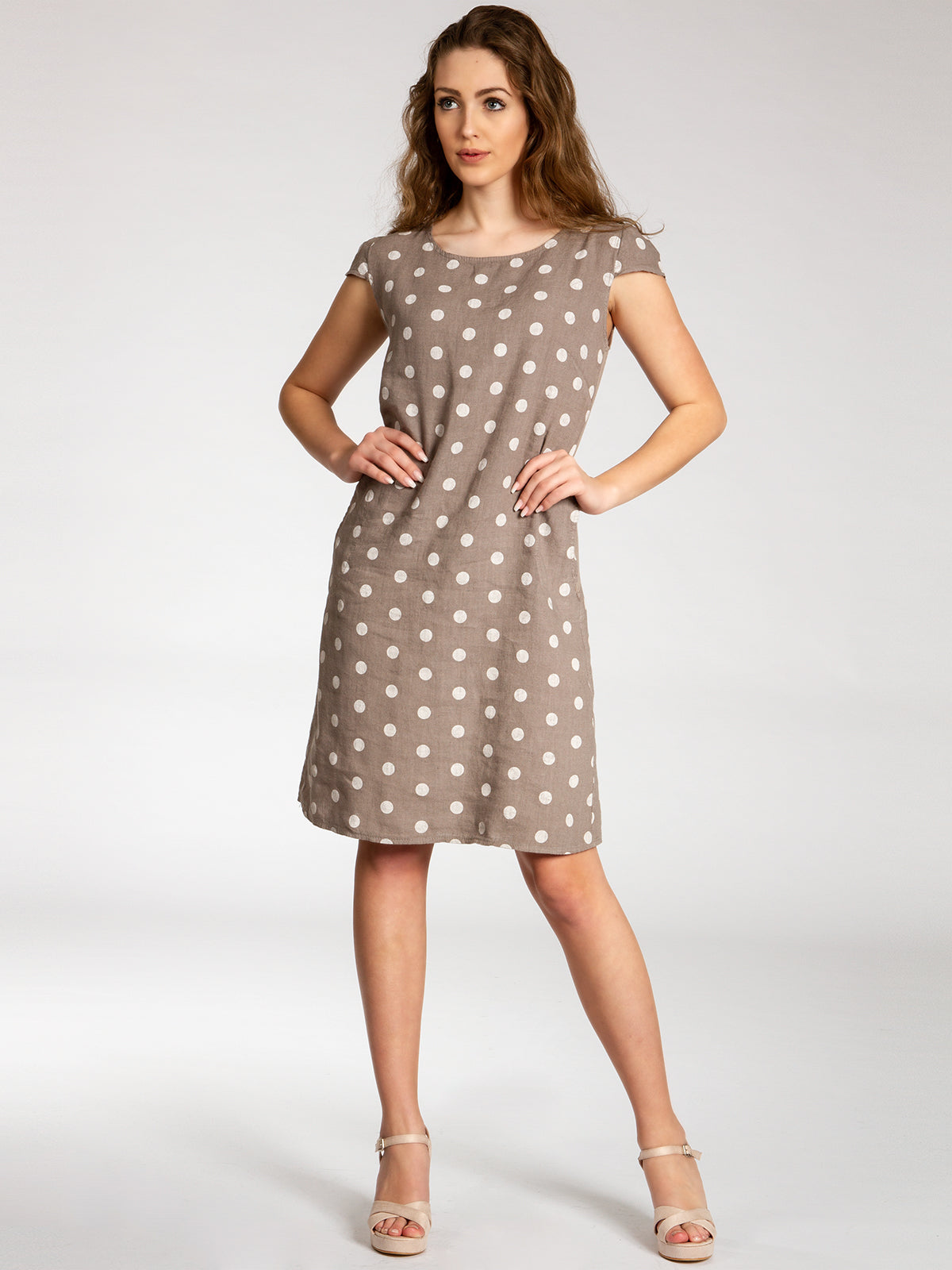 Lässiges, bequemes Damen Sommerkleid aus 100% Leinen. Dieses knielange Kleid ist besonders an heißen Tagen super angenehm zu Tragen. Der bequeme, nur leicht taillierte Schnitt kaschiert geschickt kleine Problemzonen und das luftig leichte, natürliche Material bietet einen ausgesprochen hohen Tragekomfort. Seitlich hinten vom Ärmel bis zur Hüfte verläuft zusätzlich ein schmaler leicht dehnbarer Ripp-Einsatz. Das Kleid ist mit einem eleganten 60er Retro Punkte Muster bedruckt. Auf der Vorderseite befinden sich in Taillenhöhe 2 seitliche Eingrifftaschen. Beweisen Sie Stil und Klasse mit diesem schlichten, hochwertigen Design dieses wundervollen Sommerkleides. Material: 100% Leinen. Pflegehinweis: Maschinenwäsche bei 30 Grad. Caspar Fashion GmbH - Made in Italy.