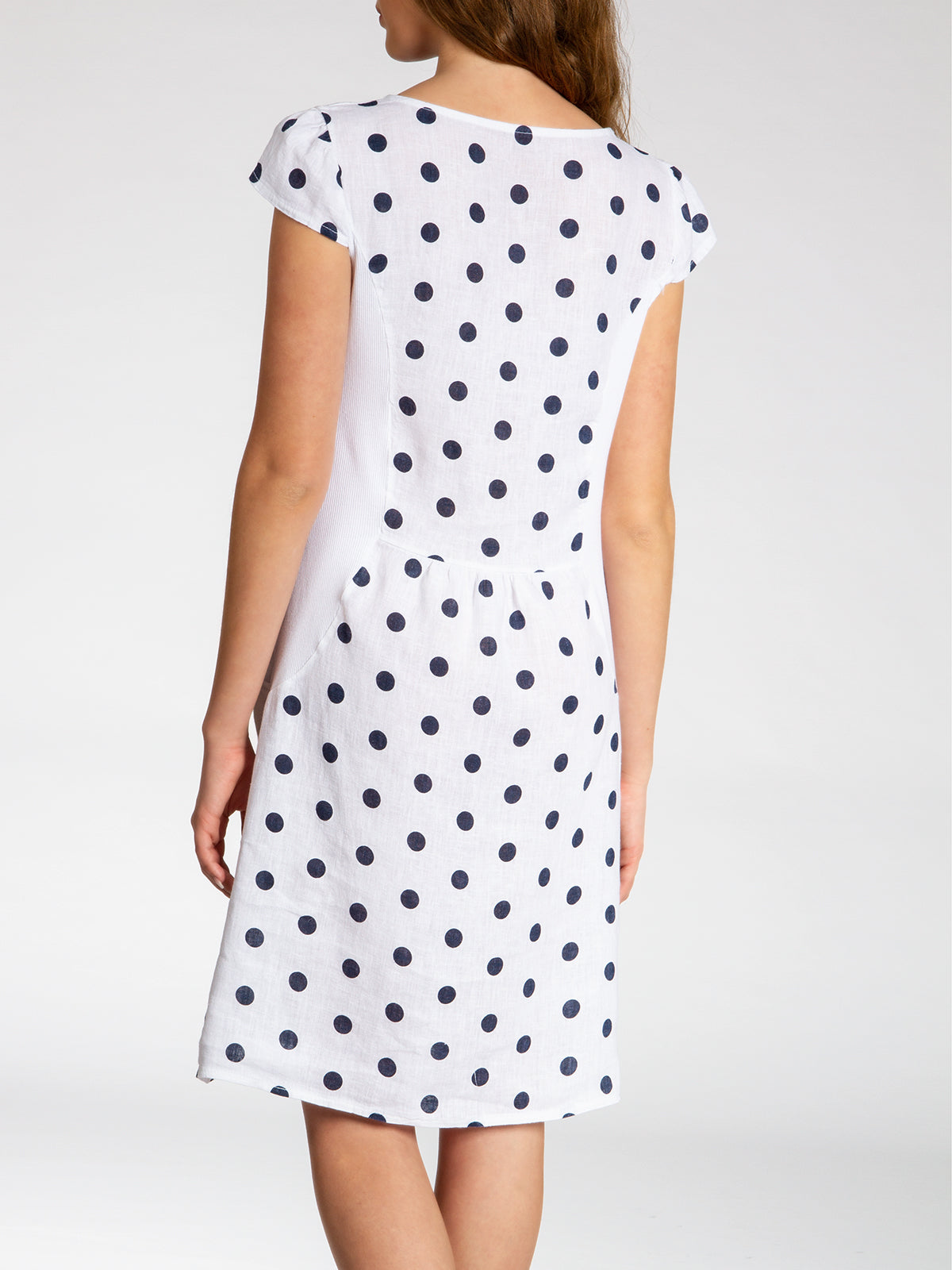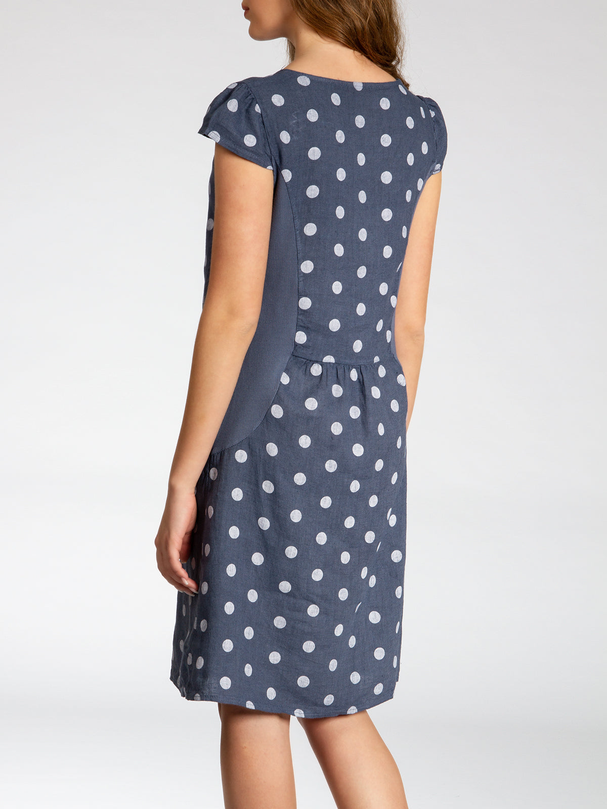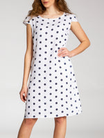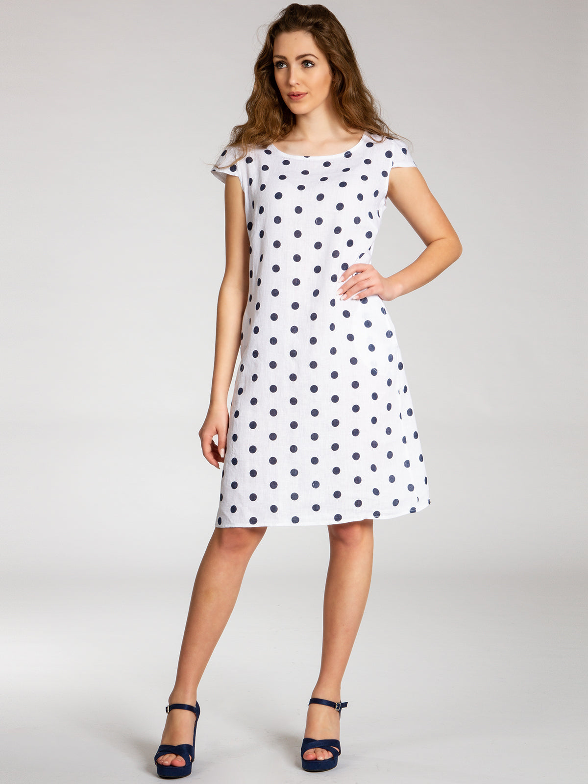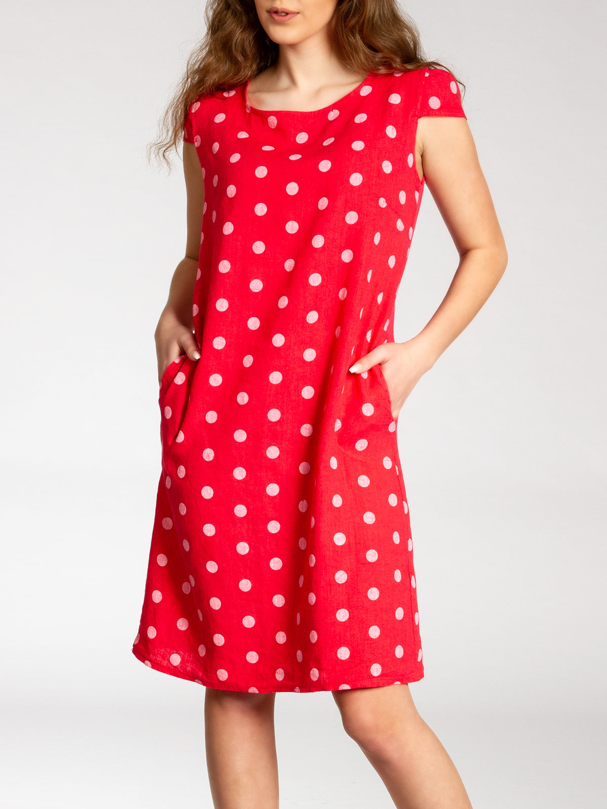 Lässiges, bequemes Damen Sommerkleid aus 100% Leinen. Dieses knielange Kleid ist besonders an heißen Tagen super angenehm zu Tragen. Der bequeme, nur leicht taillierte Schnitt kaschiert geschickt kleine Problemzonen und das luftig leichte, natürliche Material bietet einen ausgesprochen hohen Tragekomfort. Seitlich hinten vom Ärmel bis zur Hüfte verläuft zusätzlich ein schmaler leicht dehnbarer Ripp-Einsatz. Das Kleid ist mit einem eleganten 60er Retro Punkte Muster bedruckt. Auf der Vorderseite befinden sich in Taillenhöhe 2 seitliche Eingrifftaschen. Beweisen Sie Stil und Klasse mit diesem schlichten, hochwertigen Design dieses wundervollen Sommerkleides. Material: 100% Leinen. Pflegehinweis: Maschinenwäsche bei 30 Grad. Caspar Fashion GmbH - Made in Italy.