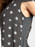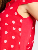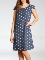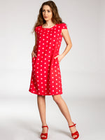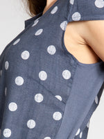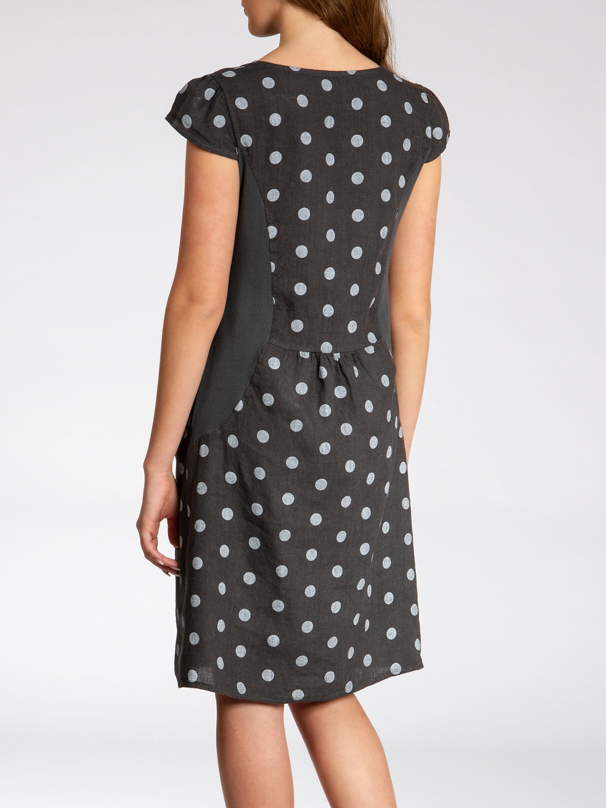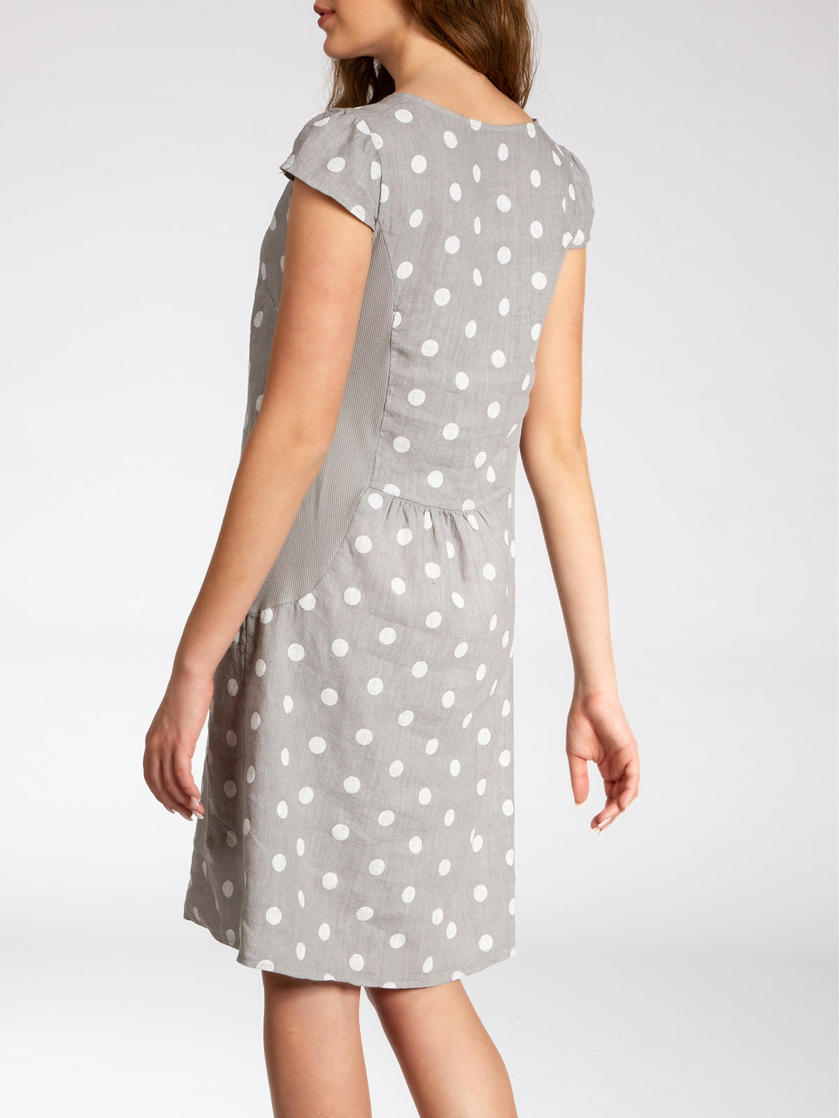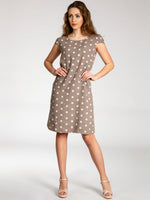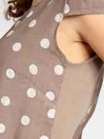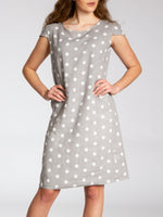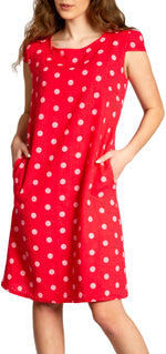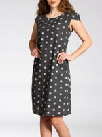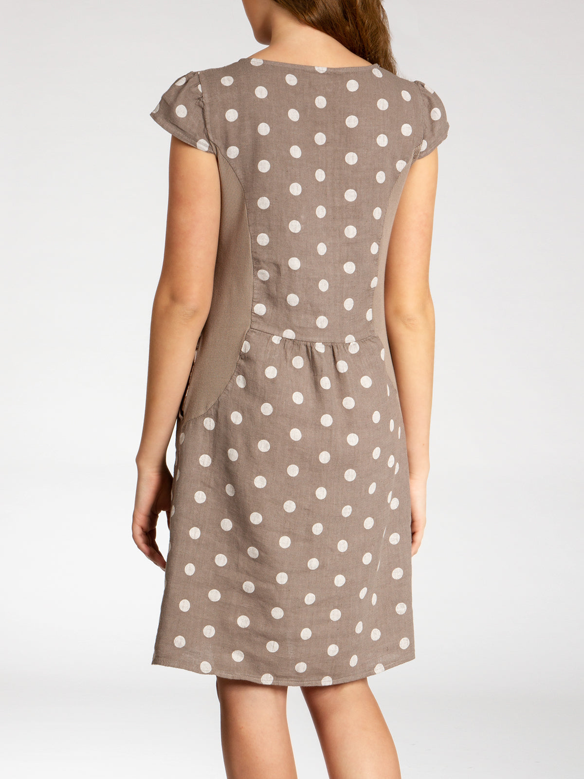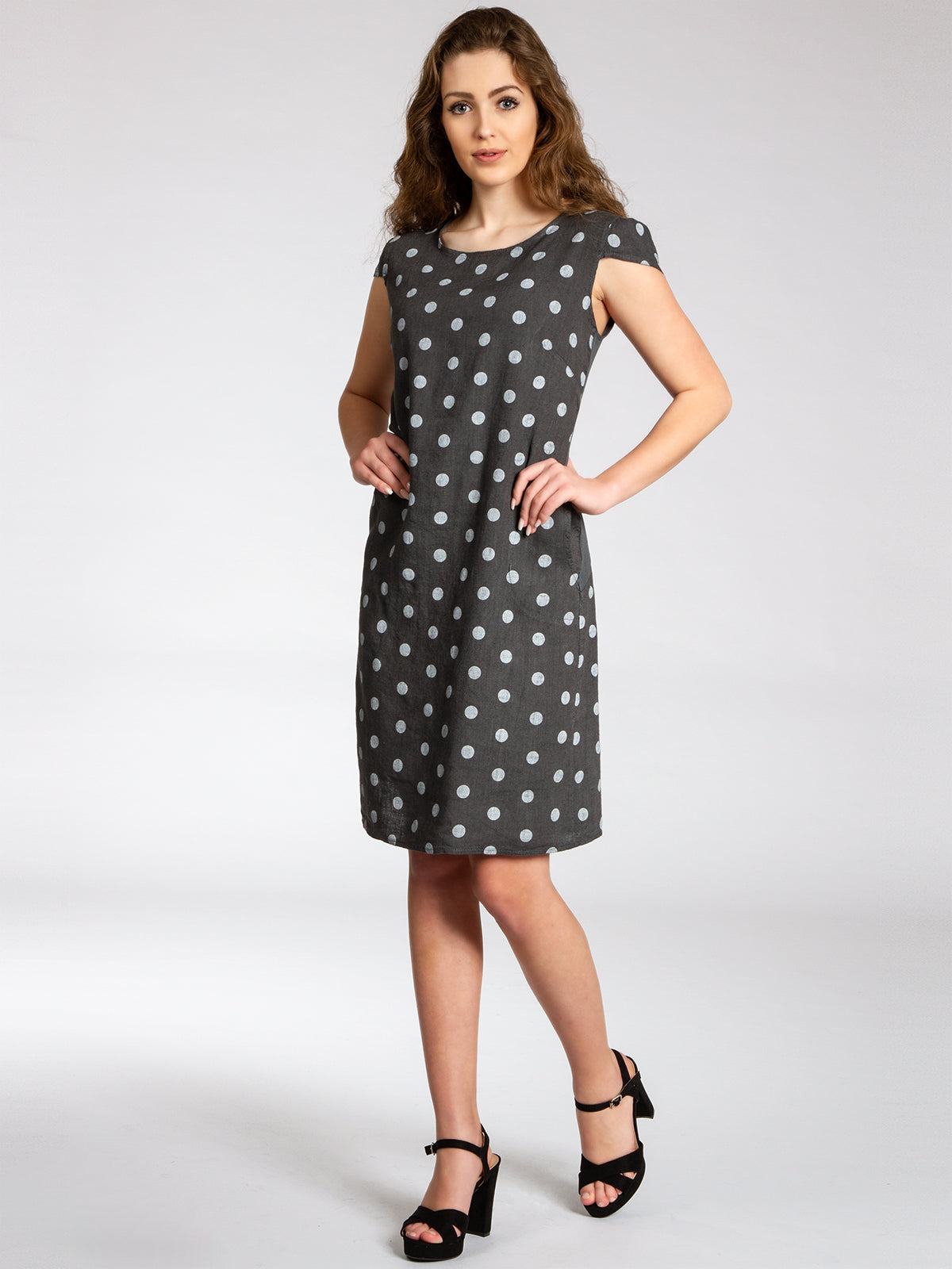 Lässiges, bequemes Damen Sommerkleid aus 100% Leinen. Dieses knielange Kleid ist besonders an heißen Tagen super angenehm zu Tragen. Der bequeme, nur leicht taillierte Schnitt kaschiert geschickt kleine Problemzonen und das luftig leichte, natürliche Material bietet einen ausgesprochen hohen Tragekomfort. Seitlich hinten vom Ärmel bis zur Hüfte verläuft zusätzlich ein schmaler leicht dehnbarer Ripp-Einsatz. Das Kleid ist mit einem eleganten 60er Retro Punkte Muster bedruckt. Auf der Vorderseite befinden sich in Taillenhöhe 2 seitliche Eingrifftaschen. Beweisen Sie Stil und Klasse mit diesem schlichten, hochwertigen Design dieses wundervollen Sommerkleides. Material: 100% Leinen. Pflegehinweis: Maschinenwäsche bei 30 Grad. Caspar Fashion GmbH - Made in Italy.