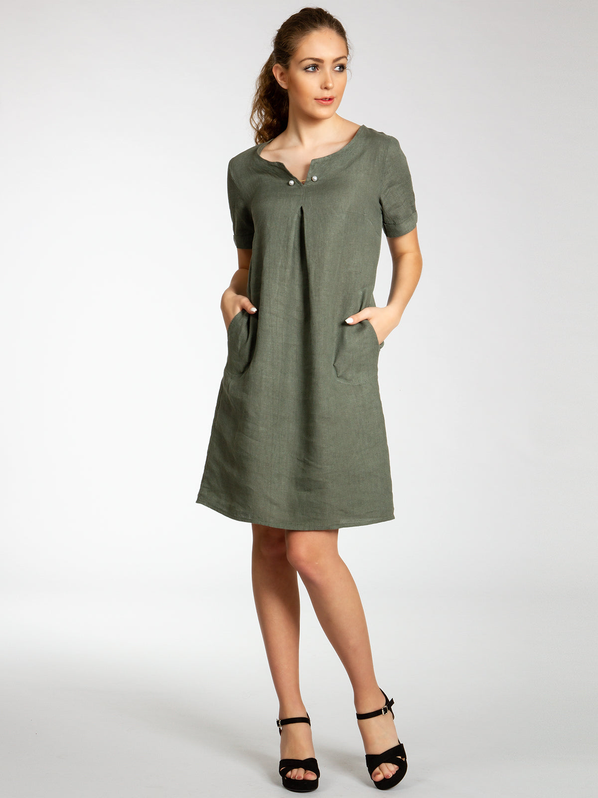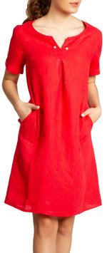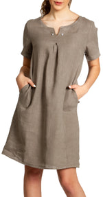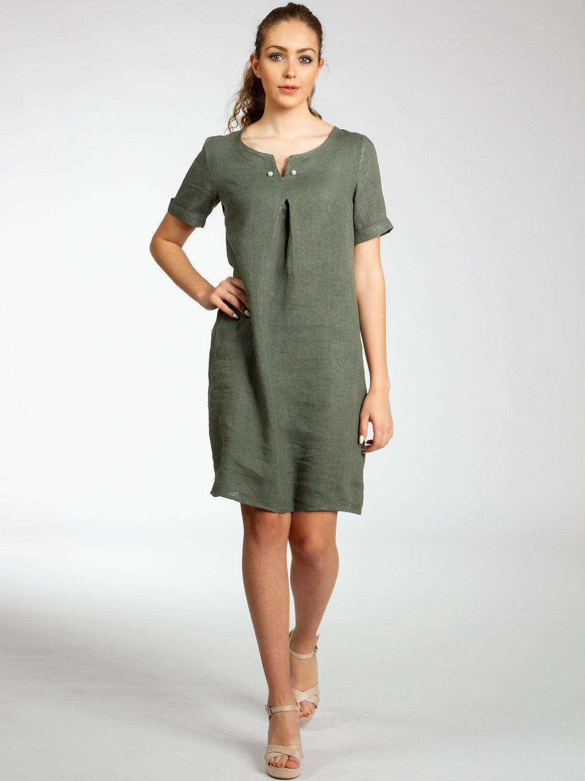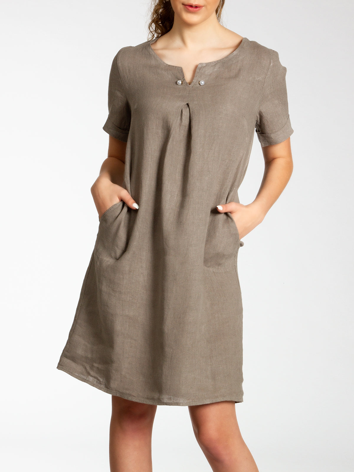 Lässig elegantes, bequemes Damen Sommerkleid aus 100% Leinen mit kurzen Ärmeln. Dieses knielange Kleid ist besonders an heißen Tagen super angenehm zu Tragen. Der bequeme, nur leicht taillierte Schnitt kaschiert geschickt kleine Problemzonen und das luftig leichte, natürliche Material bietet einen ausgesprochen hohen Tragekomfort. Seitlich hinten vom Ärmel bis zur Hüfte verläuft zusätzlich ein schmaler leicht dehnbarer Ripp-Einsatz. Der Halsausschnitt am Dekoltée ist mit einer dezenten Nadel mit Perlendekor (Kunstperlen) versehen. Auf der Vorderseite befinden sich in Hüfthöhe 2 kleine Eingrifftaschen. Beweisen Sie Klasse mit dem schlichten, hochwertige Style dieses wundervoll eleganten Sommerkleides. Material: 100% Leinen. Pflegehinweis: Maschinenwäsche bei 30 Grad. Größenhinweis: Das Kleid ist leicht tailliert geschnitten. Wir empfehlen es daher im Zweifel eine Nummer größer zu bestellen, insbesondere wenn man eine eher lockere Tragweise bevorzugt. Caspar - Made in Italy.