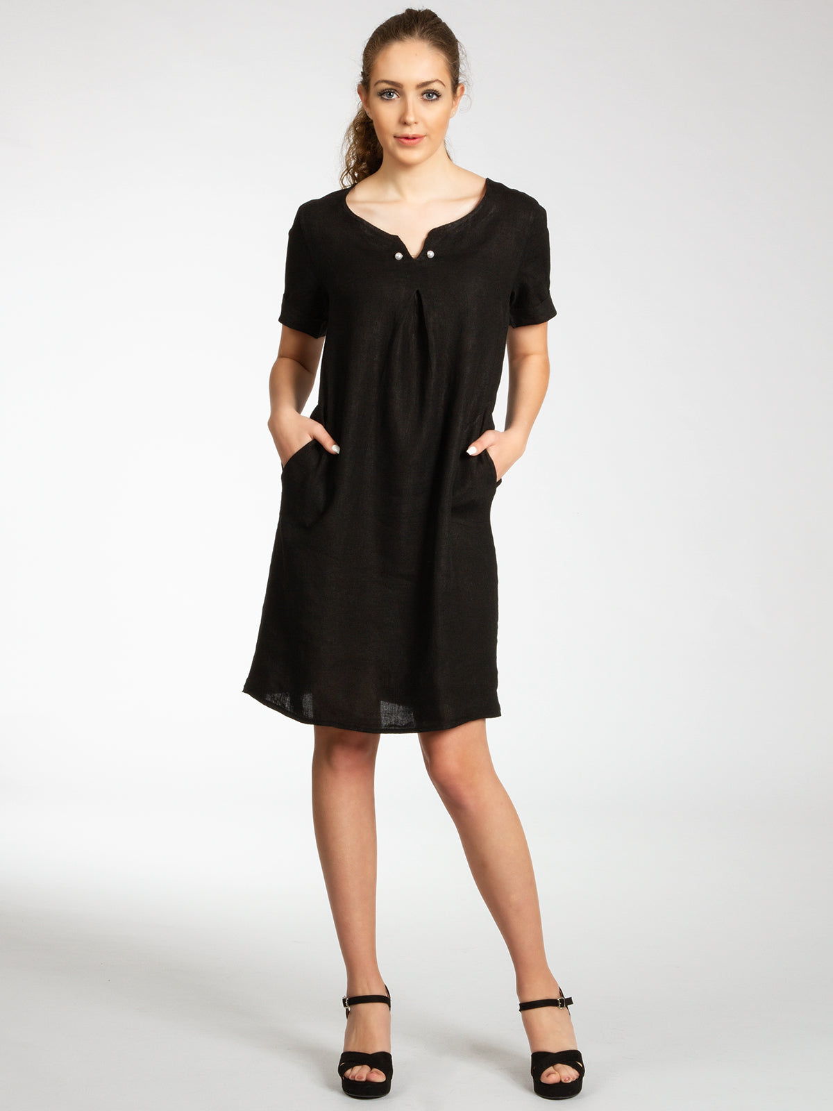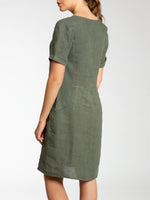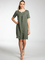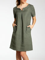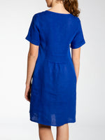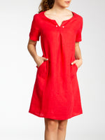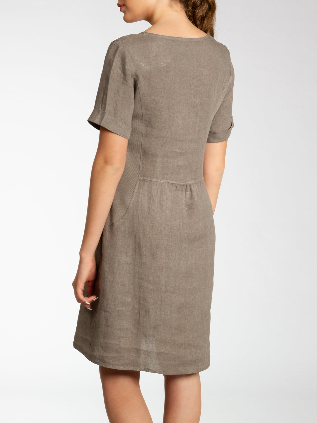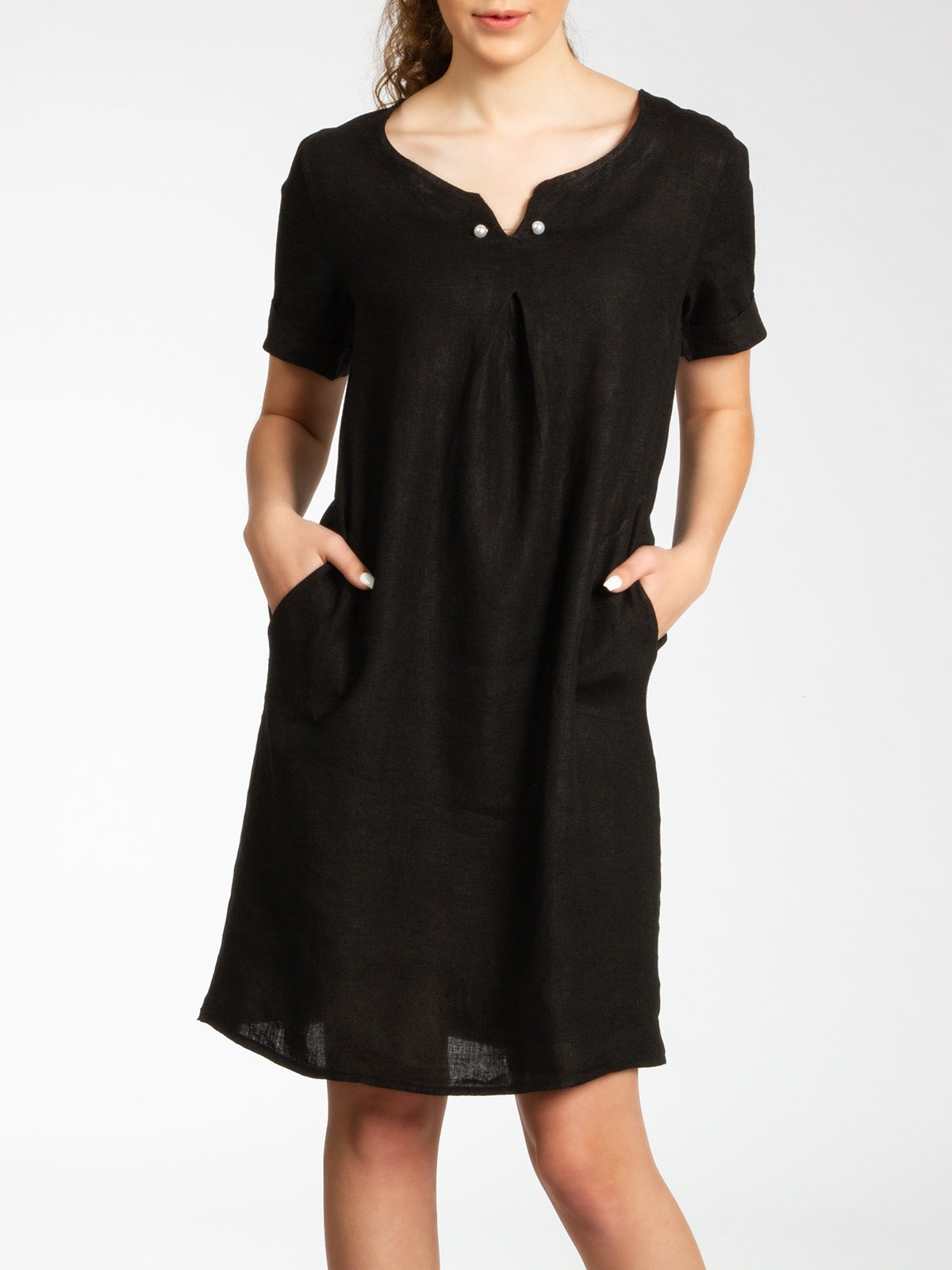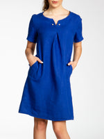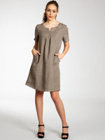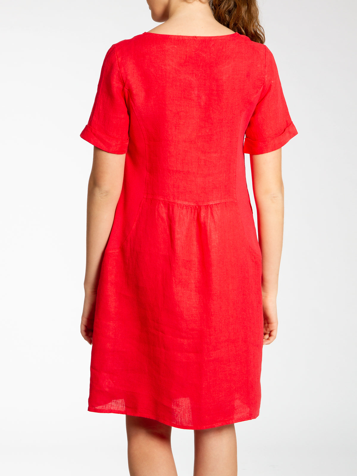 Lässig elegantes, bequemes Damen Sommerkleid aus 100% Leinen mit kurzen Ärmeln. Dieses knielange Kleid ist besonders an heißen Tagen super angenehm zu Tragen. Der bequeme, nur leicht taillierte Schnitt kaschiert geschickt kleine Problemzonen und das luftig leichte, natürliche Material bietet einen ausgesprochen hohen Tragekomfort. Seitlich hinten vom Ärmel bis zur Hüfte verläuft zusätzlich ein schmaler leicht dehnbarer Ripp-Einsatz. Der Halsausschnitt am Dekoltée ist mit einer dezenten Nadel mit Perlendekor (Kunstperlen) versehen. Auf der Vorderseite befinden sich in Hüfthöhe 2 kleine Eingrifftaschen. Beweisen Sie Klasse mit dem schlichten, hochwertige Style dieses wundervoll eleganten Sommerkleides. Material: 100% Leinen. Pflegehinweis: Maschinenwäsche bei 30 Grad. Größenhinweis: Das Kleid ist leicht tailliert geschnitten. Wir empfehlen es daher im Zweifel eine Nummer größer zu bestellen, insbesondere wenn man eine eher lockere Tragweise bevorzugt. Caspar - Made in Italy.