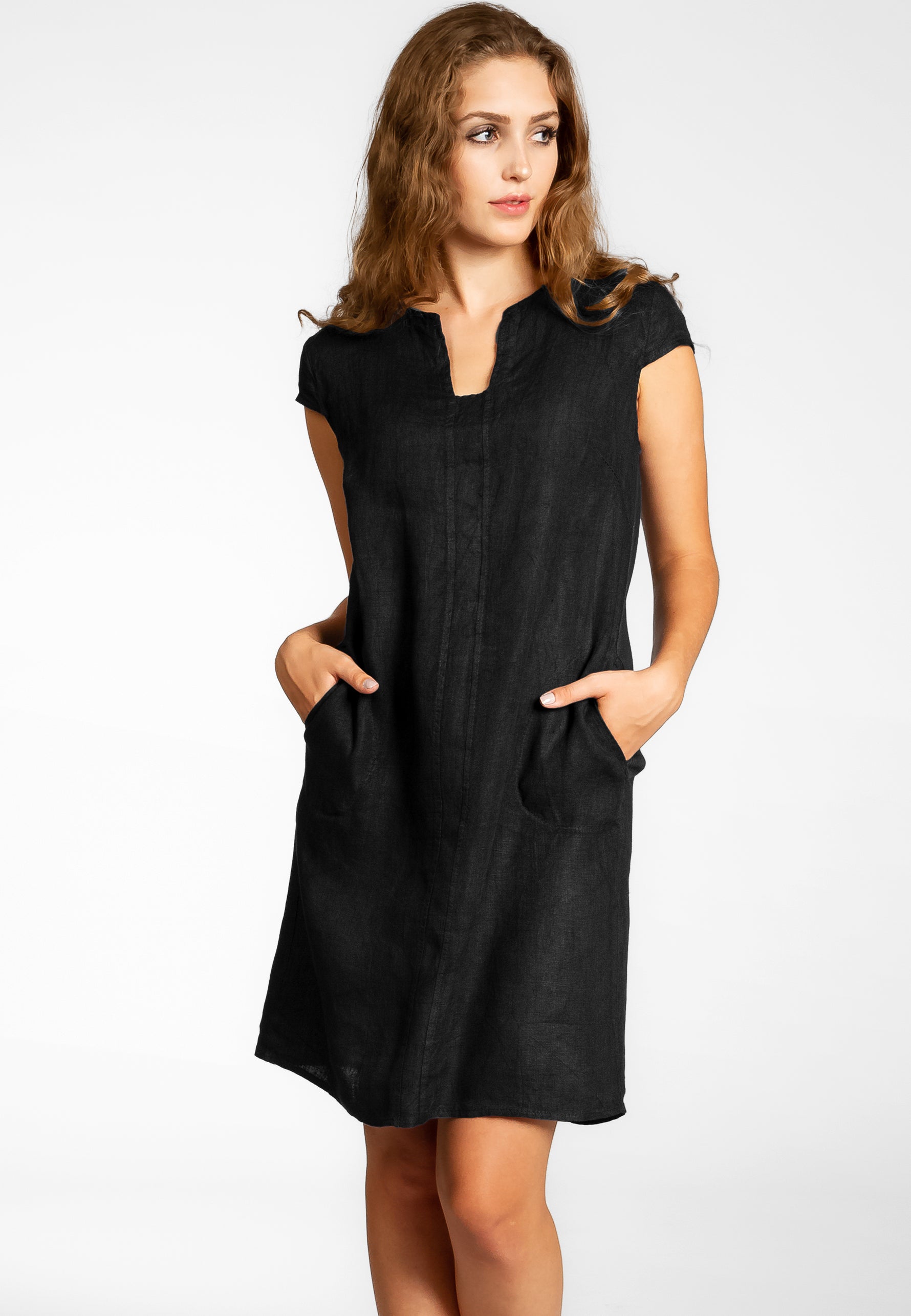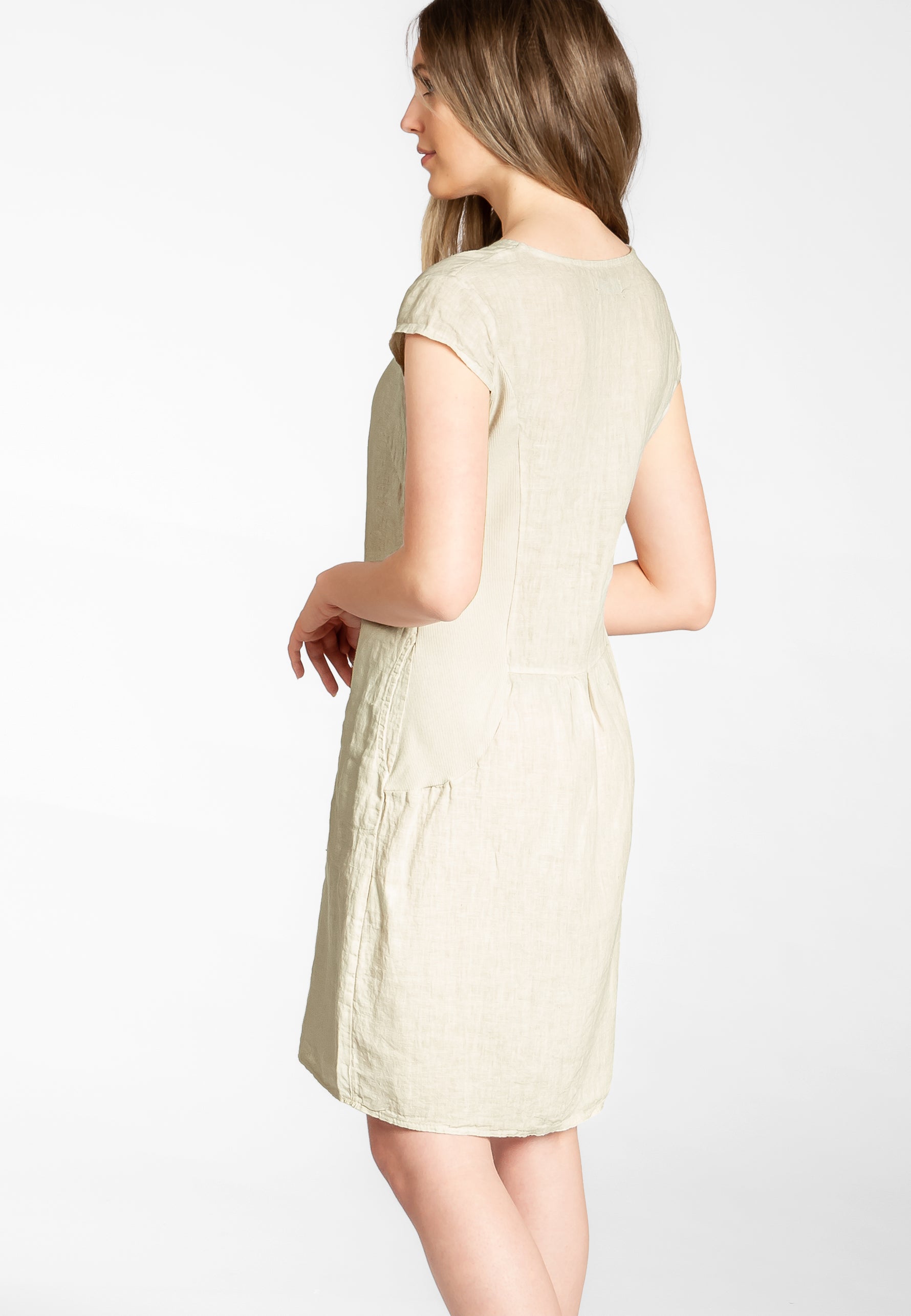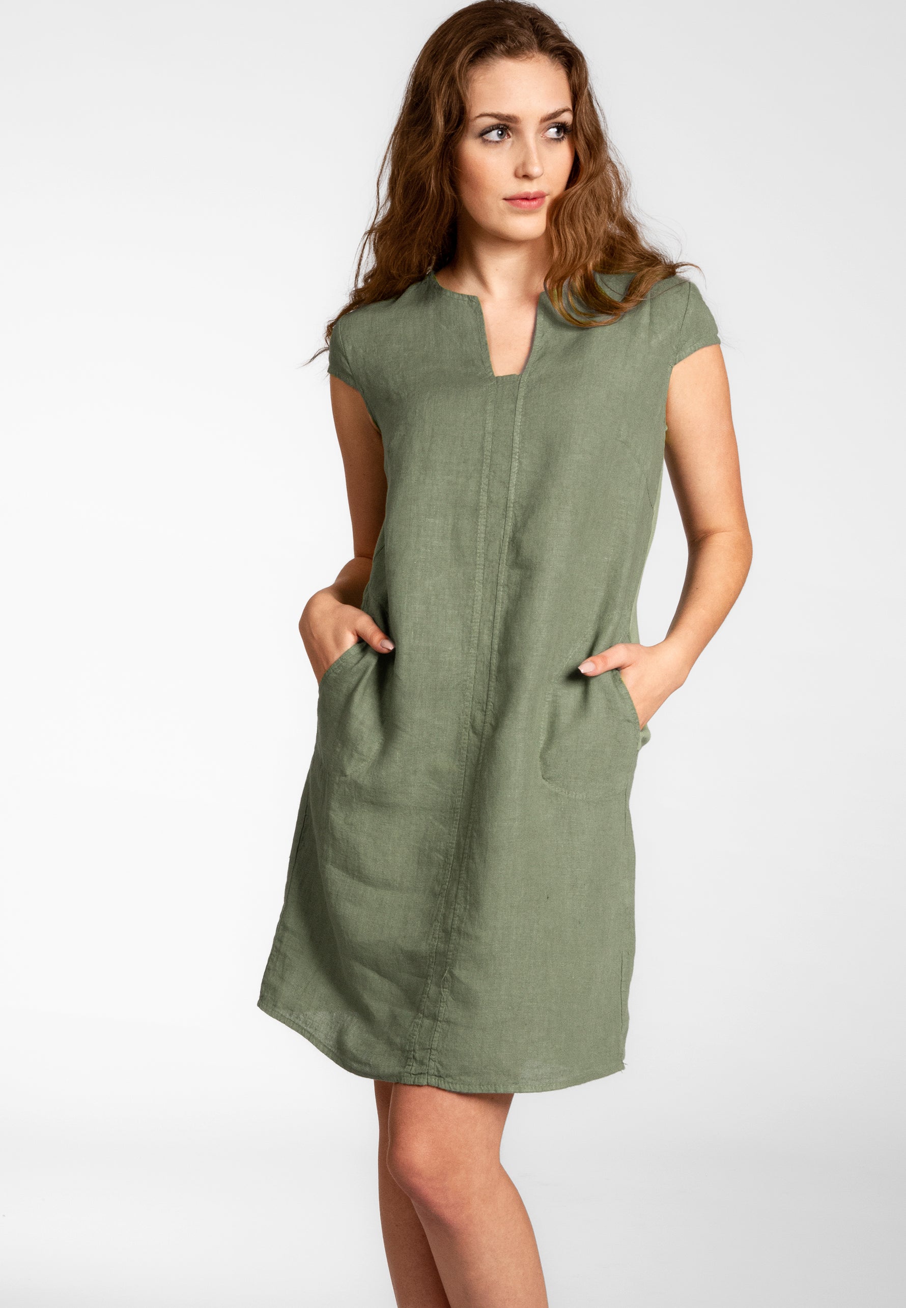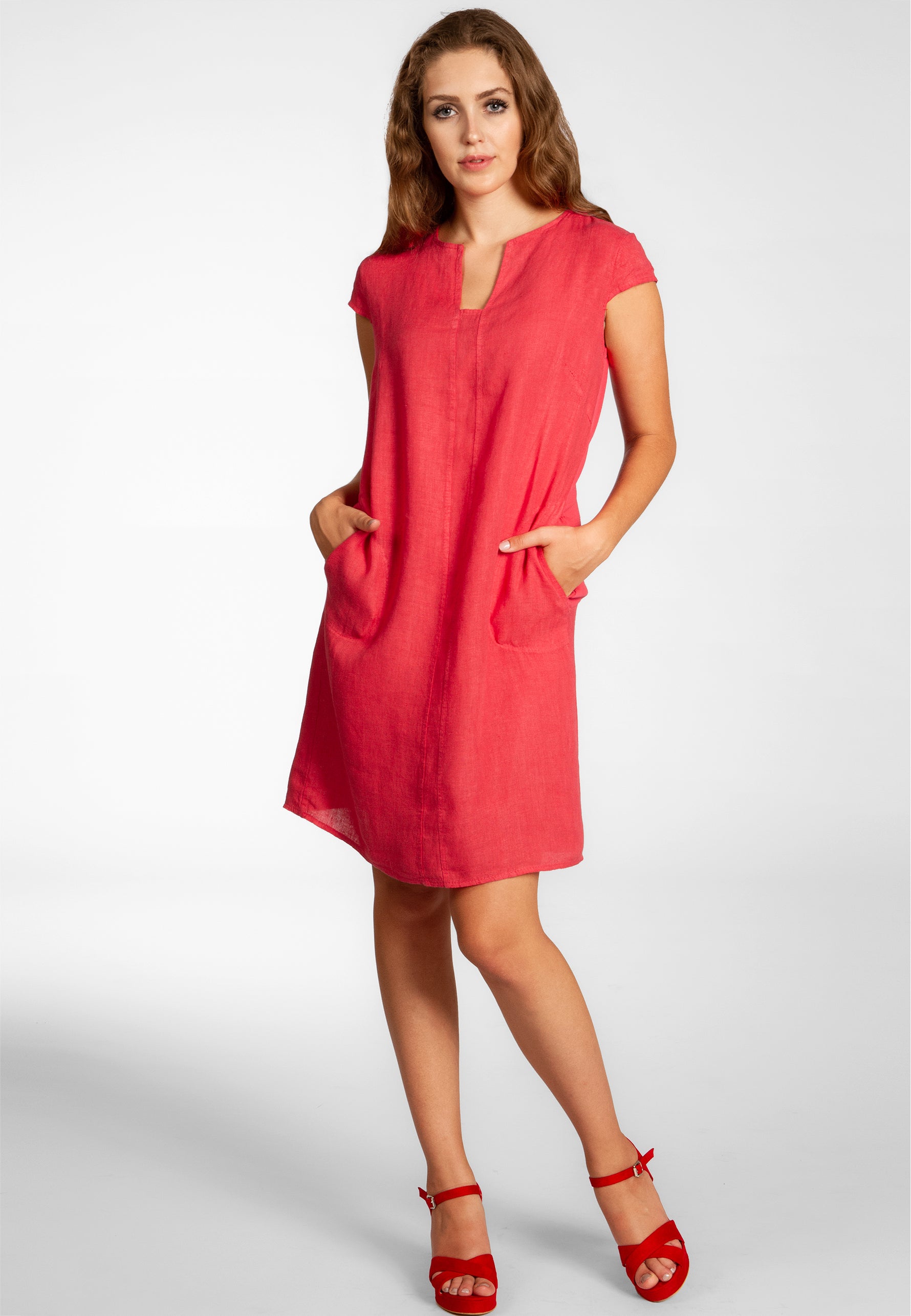 Lässig elegantes, bequemes Damen Sommerkleid aus 100% Leinen mit kurzen Ärmeln. Dieses knielange Kleid ist besonders an heißen Tagen super angenehm zu Tragen. Der bequeme, nur leicht taillierte Schnitt kaschiert geschickt kleine Problemzonen und das luftig leichte, natürliche Material bietet einen ausgesprochen hohen Tragekomfort. Seitlich hinten vom Ärmel bis zur Hüfte verläuft zusätzlich ein schmaler leicht dehnbarer Ripp-Einsatz. Der Halsausschnitt am Dekoltée ist mit einem ausgefallenen, grafischen Schnitt versehen, welcher in Form von 2 vertikalen Ziernähten bis an den unteren Saum des Kleides verläuft. Auf der Vorderseite befinden sich in Hüfthöhe 2 aufgesetzte kleine Eingrifftaschen. Beweisen Sie Stil und Klasse mit dem schlichten, hochwertige Style dieses wundervoll eleganten Sommerkleides. Material: 100% Leinen. Pflegehinweis: Maschinenwäsche bei 30 Grad. CASPAR Fashion GmbH - Made in Italy.