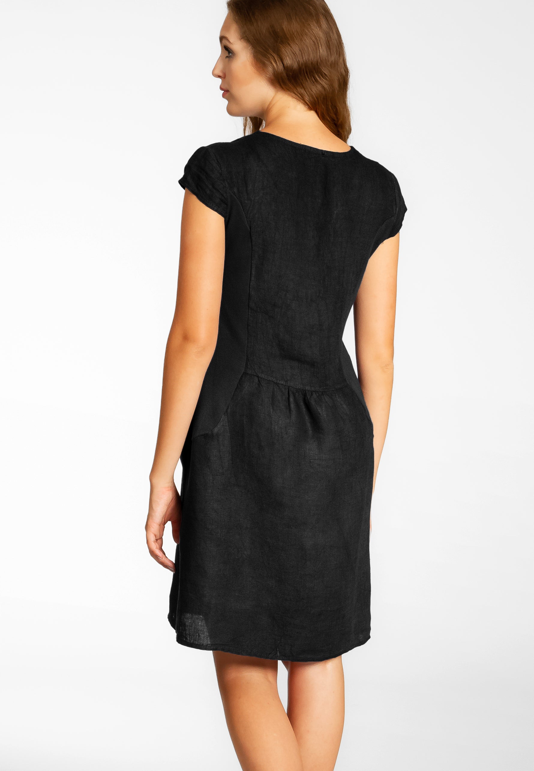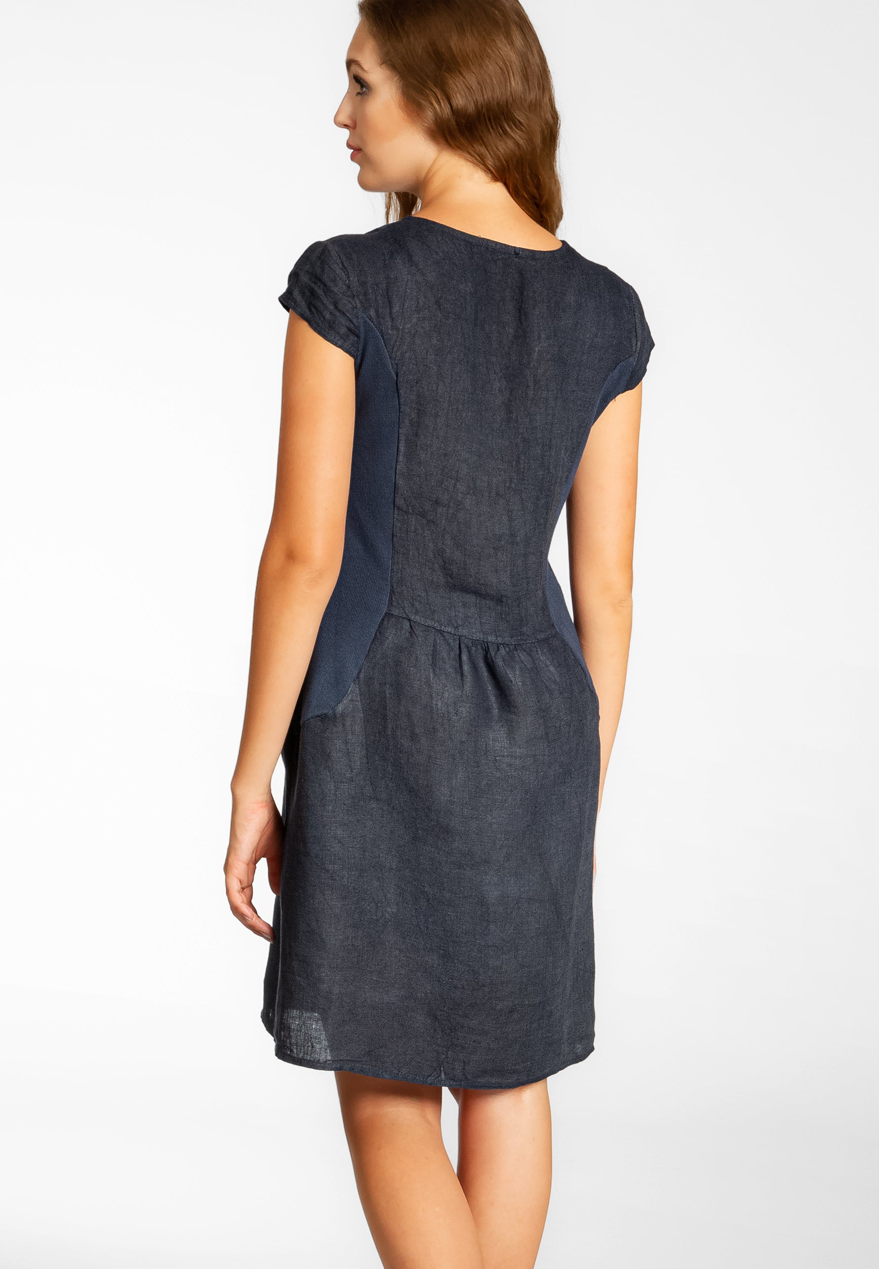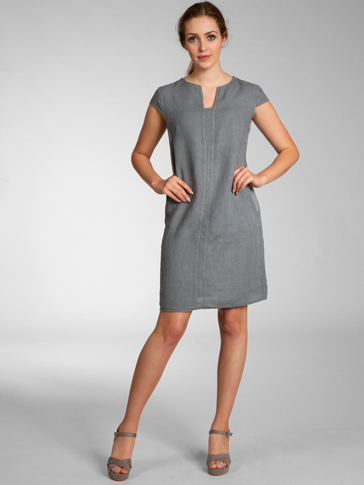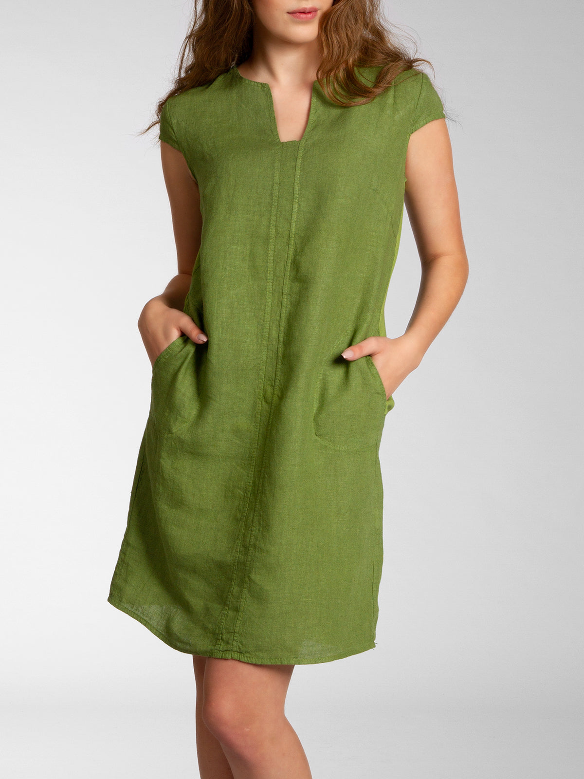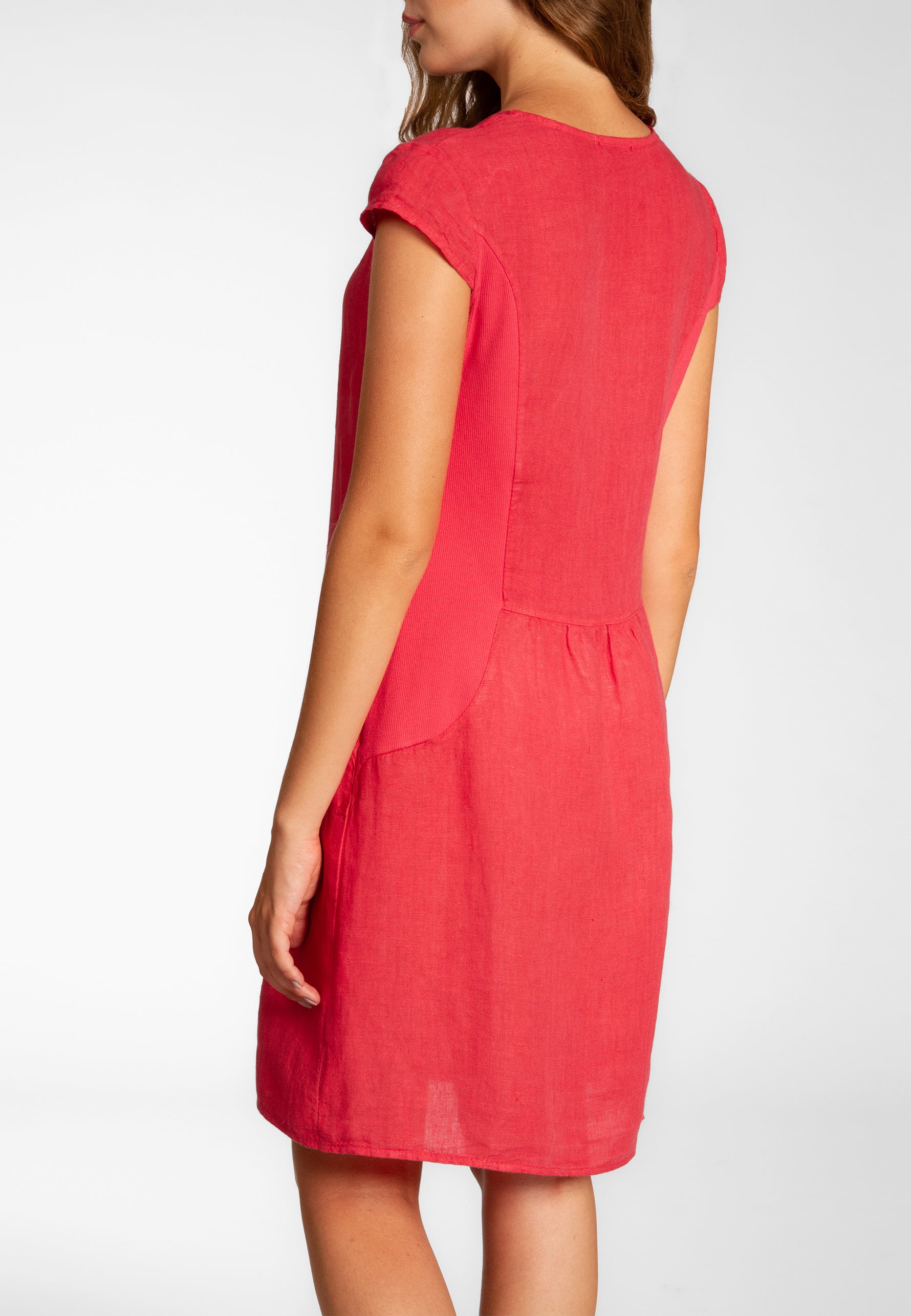 Lässig elegantes, bequemes Damen Sommerkleid aus 100% Leinen mit kurzen Ärmeln. Dieses knielange Kleid ist besonders an heißen Tagen super angenehm zu Tragen. Der bequeme, nur leicht taillierte Schnitt kaschiert geschickt kleine Problemzonen und das luftig leichte, natürliche Material bietet einen ausgesprochen hohen Tragekomfort. Seitlich hinten vom Ärmel bis zur Hüfte verläuft zusätzlich ein schmaler leicht dehnbarer Ripp-Einsatz. Der Halsausschnitt am Dekoltée ist mit einem ausgefallenen, grafischen Schnitt versehen, welcher in Form von 2 vertikalen Ziernähten bis an den unteren Saum des Kleides verläuft. Auf der Vorderseite befinden sich in Hüfthöhe 2 aufgesetzte kleine Eingrifftaschen. Beweisen Sie Stil und Klasse mit dem schlichten, hochwertige Style dieses wundervoll eleganten Sommerkleides. Material: 100% Leinen. Pflegehinweis: Maschinenwäsche bei 30 Grad. CASPAR Fashion GmbH - Made in Italy.