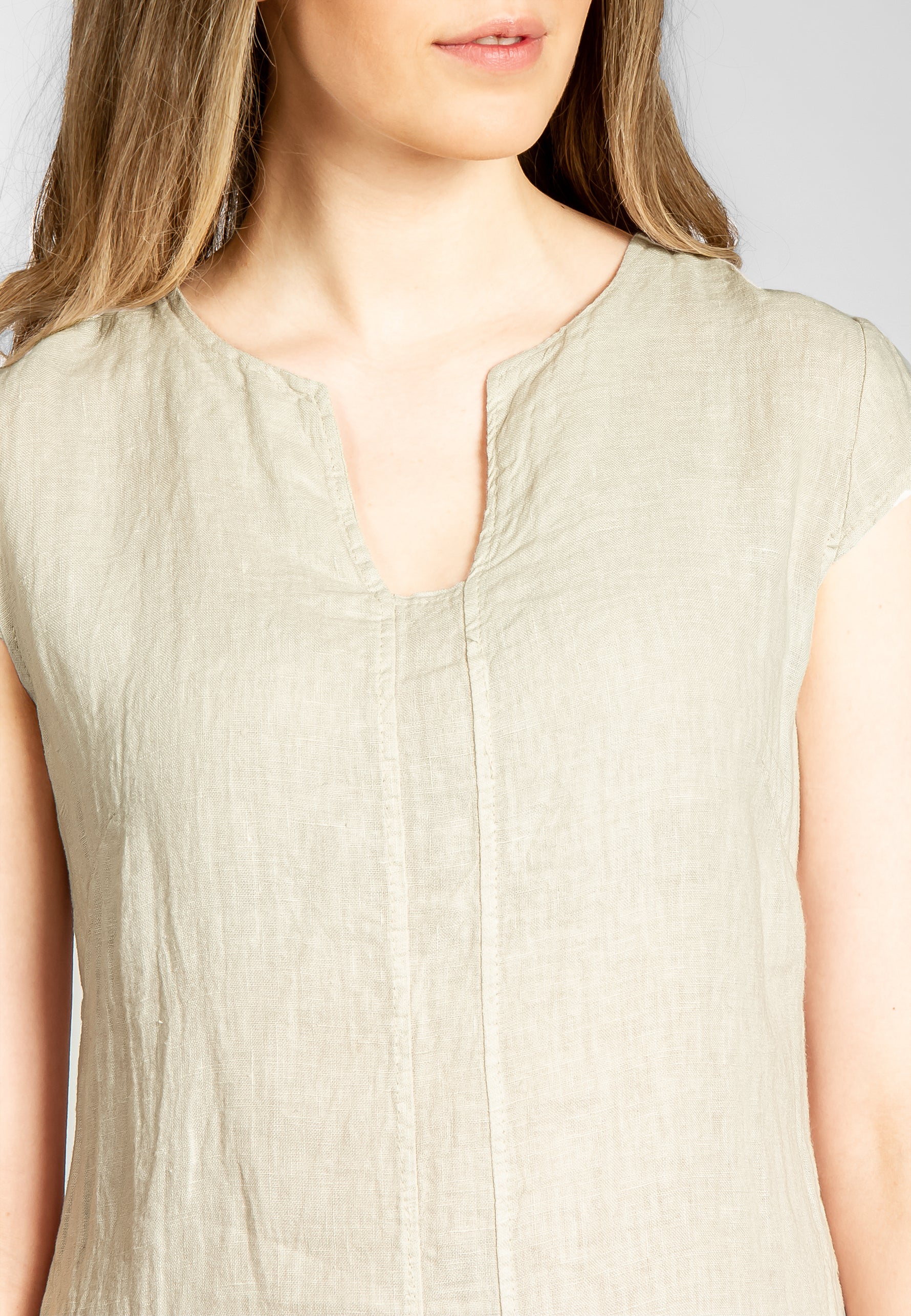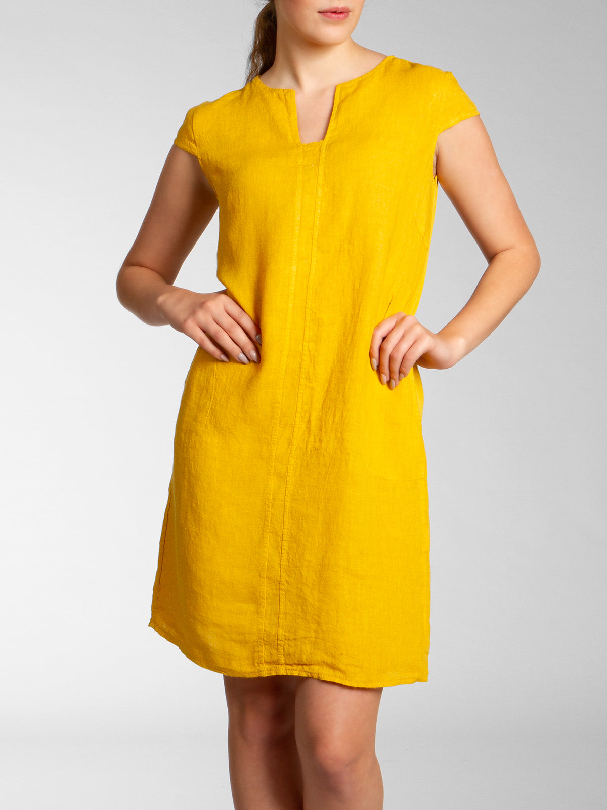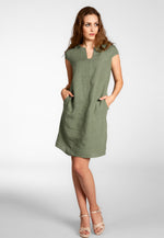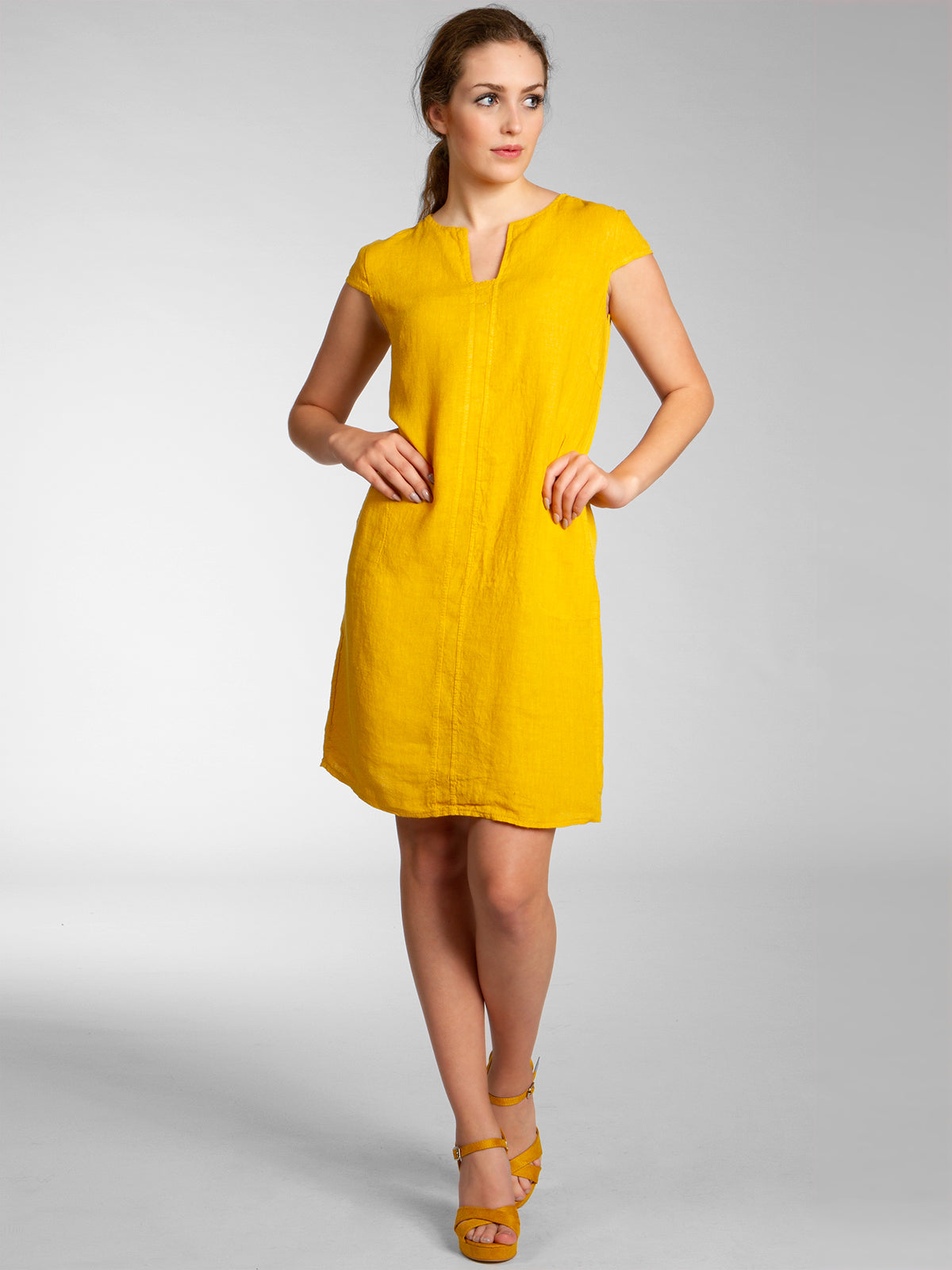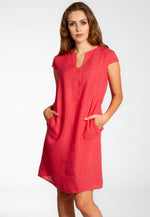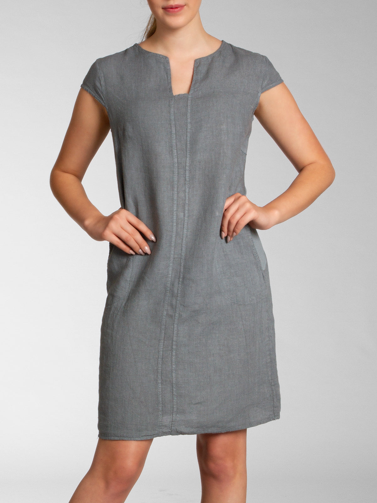 Lässig elegantes, bequemes Damen Sommerkleid aus 100% Leinen mit kurzen Ärmeln. Dieses knielange Kleid ist besonders an heißen Tagen super angenehm zu Tragen. Der bequeme, nur leicht taillierte Schnitt kaschiert geschickt kleine Problemzonen und das luftig leichte, natürliche Material bietet einen ausgesprochen hohen Tragekomfort. Seitlich hinten vom Ärmel bis zur Hüfte verläuft zusätzlich ein schmaler leicht dehnbarer Ripp-Einsatz. Der Halsausschnitt am Dekoltée ist mit einem ausgefallenen, grafischen Schnitt versehen, welcher in Form von 2 vertikalen Ziernähten bis an den unteren Saum des Kleides verläuft. Auf der Vorderseite befinden sich in Hüfthöhe 2 aufgesetzte kleine Eingrifftaschen. Beweisen Sie Stil und Klasse mit dem schlichten, hochwertige Style dieses wundervoll eleganten Sommerkleides. Material: 100% Leinen. Pflegehinweis: Maschinenwäsche bei 30 Grad. CASPAR Fashion GmbH - Made in Italy.