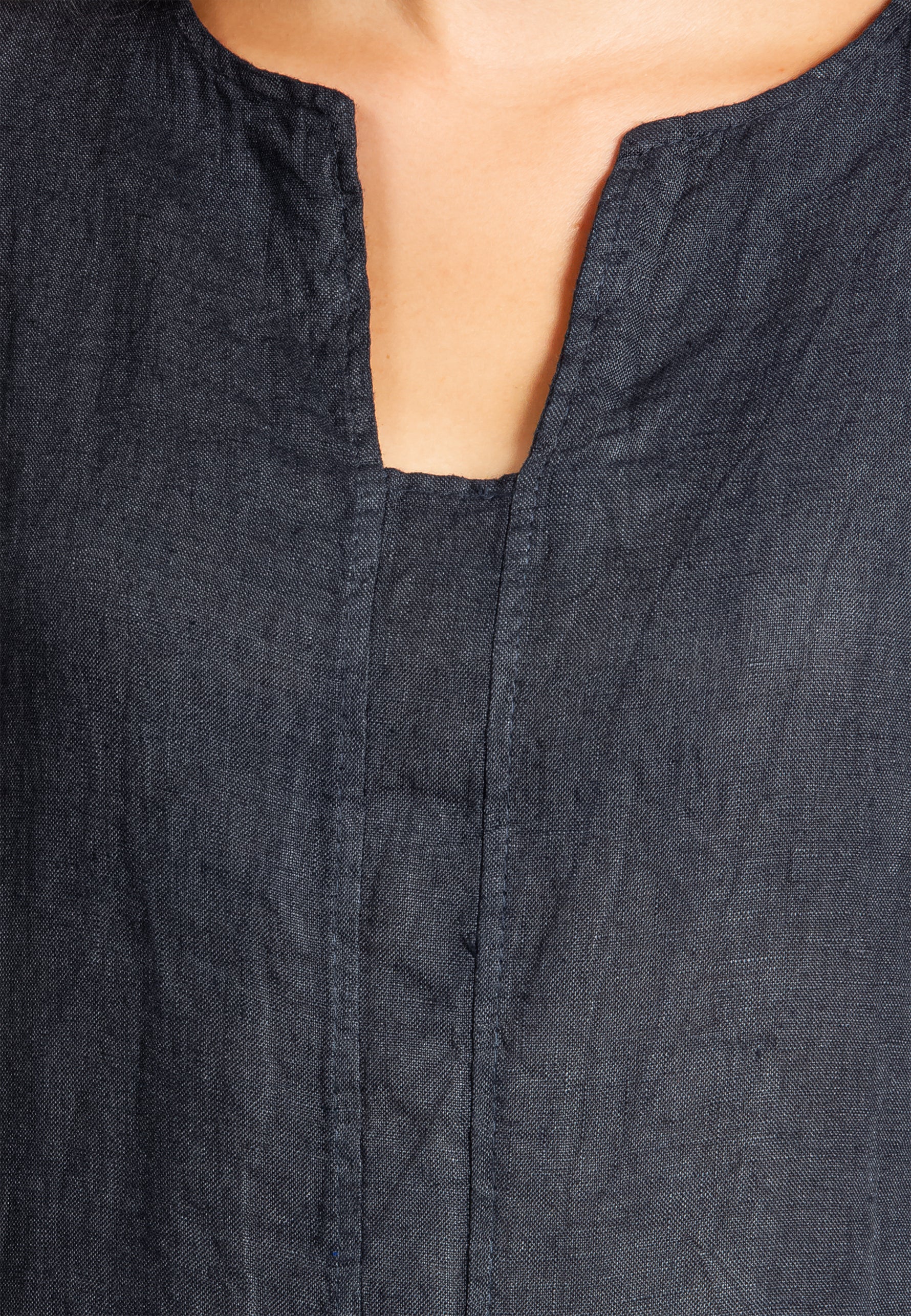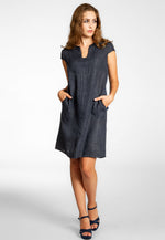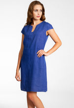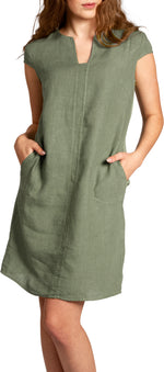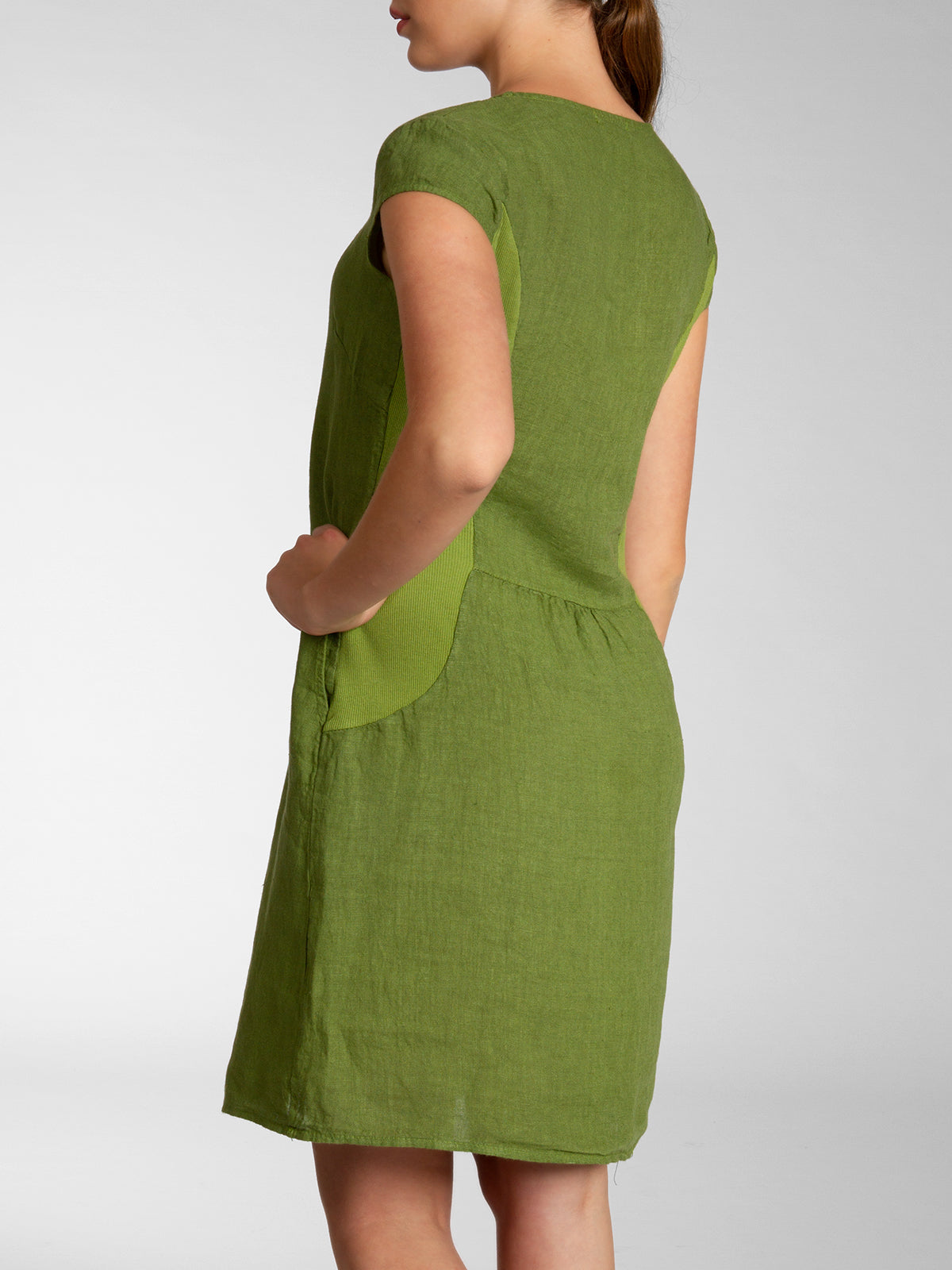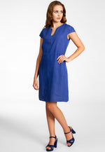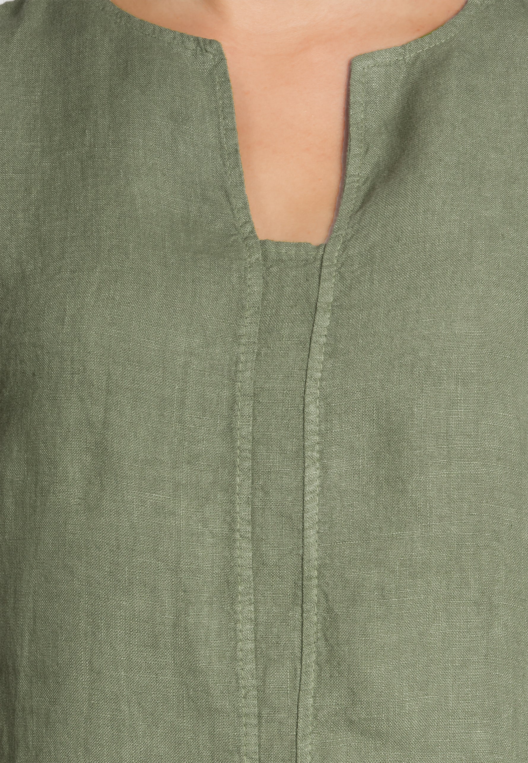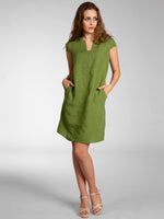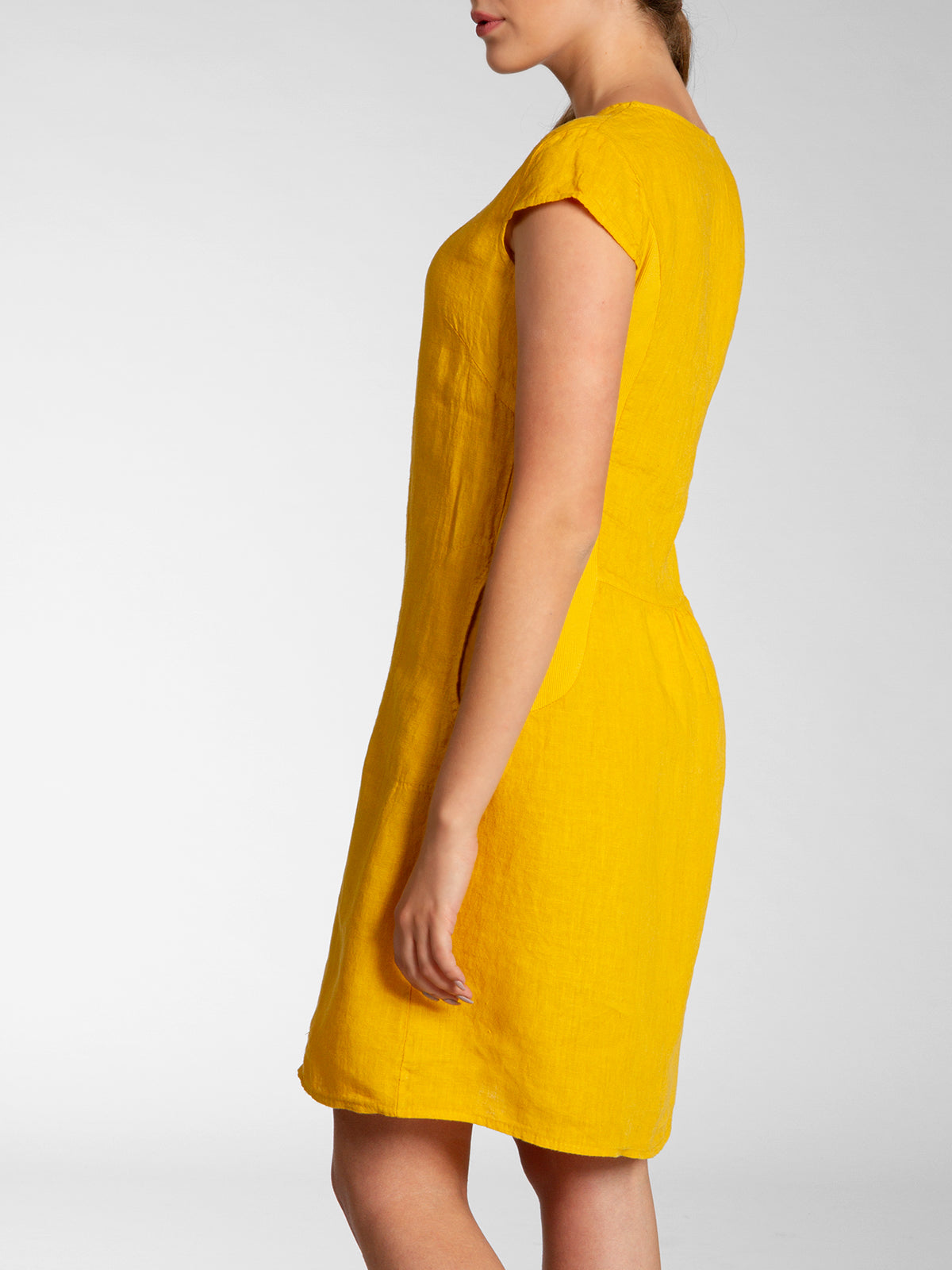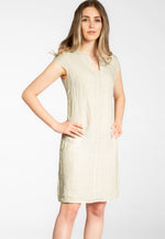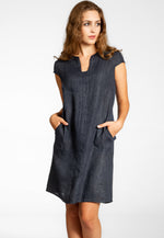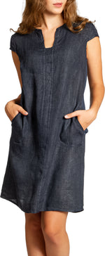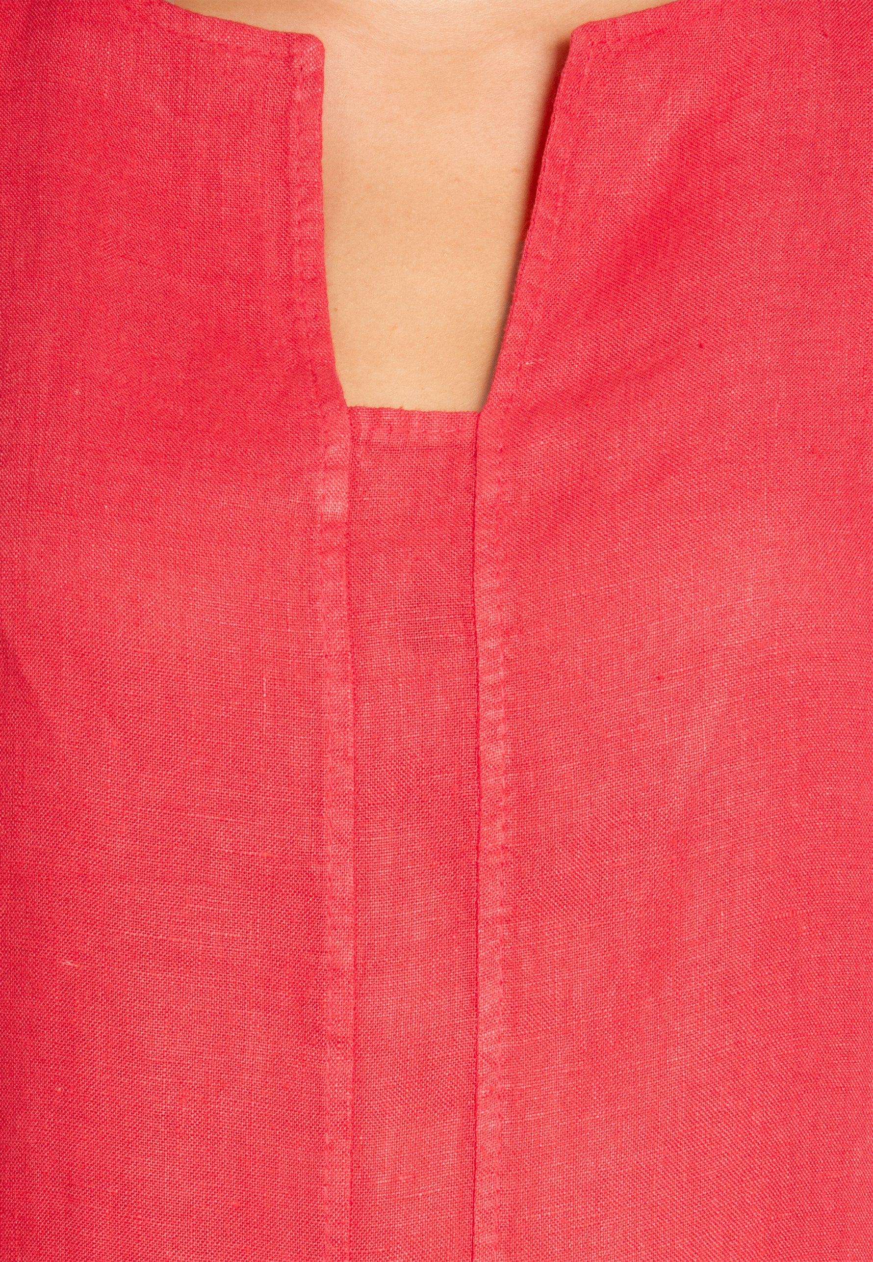 Lässig elegantes, bequemes Damen Sommerkleid aus 100% Leinen mit kurzen Ärmeln. Dieses knielange Kleid ist besonders an heißen Tagen super angenehm zu Tragen. Der bequeme, nur leicht taillierte Schnitt kaschiert geschickt kleine Problemzonen und das luftig leichte, natürliche Material bietet einen ausgesprochen hohen Tragekomfort. Seitlich hinten vom Ärmel bis zur Hüfte verläuft zusätzlich ein schmaler leicht dehnbarer Ripp-Einsatz. Der Halsausschnitt am Dekoltée ist mit einem ausgefallenen, grafischen Schnitt versehen, welcher in Form von 2 vertikalen Ziernähten bis an den unteren Saum des Kleides verläuft. Auf der Vorderseite befinden sich in Hüfthöhe 2 aufgesetzte kleine Eingrifftaschen. Beweisen Sie Stil und Klasse mit dem schlichten, hochwertige Style dieses wundervoll eleganten Sommerkleides. Material: 100% Leinen. Pflegehinweis: Maschinenwäsche bei 30 Grad. CASPAR Fashion GmbH - Made in Italy.