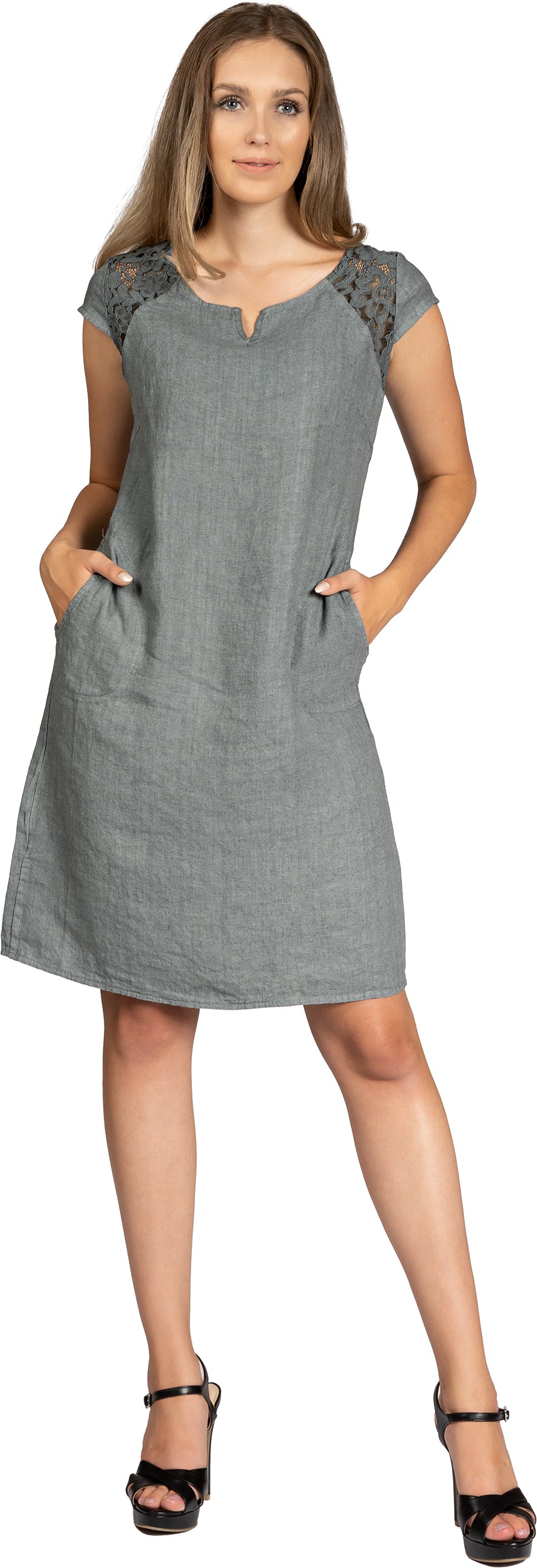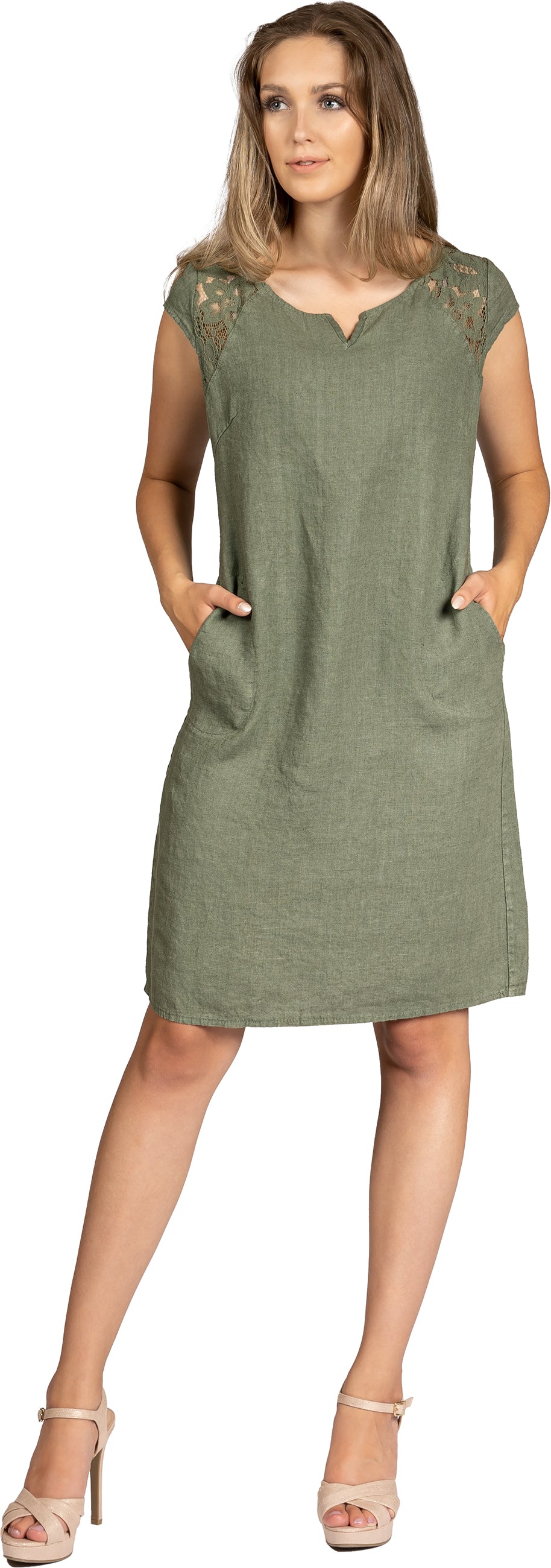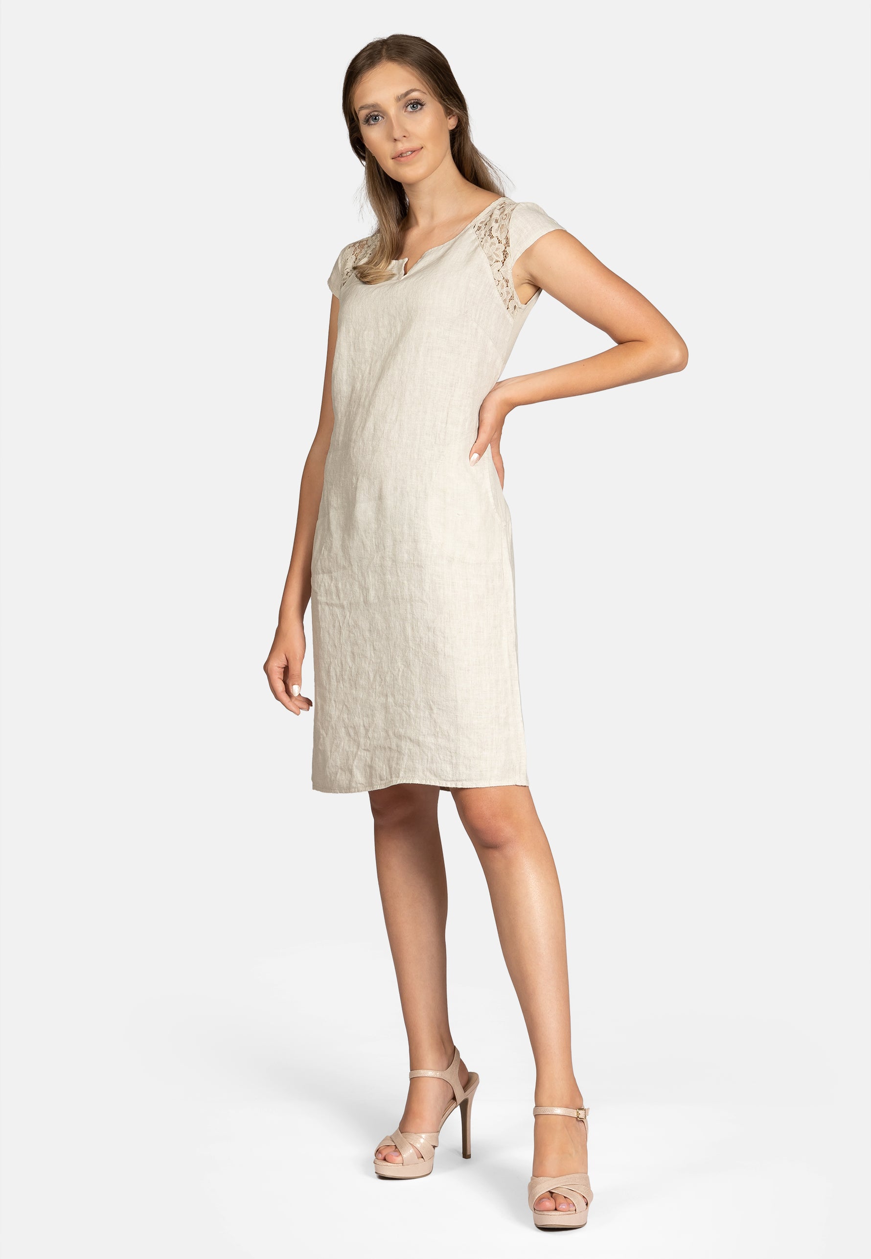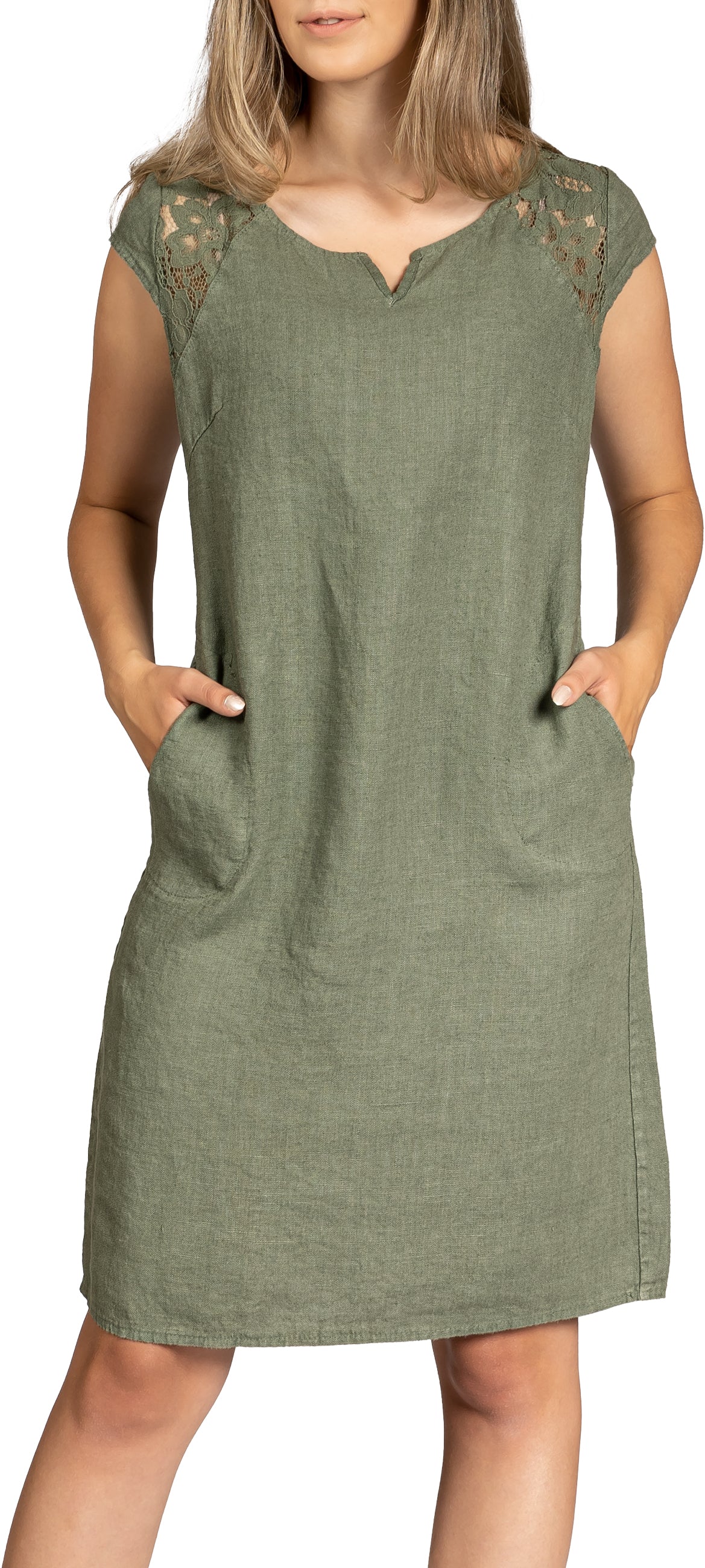 Lässig elegantes, bequemes Damen Sommerkleid aus 100% Leinen mit Spitzeneinsatz an den Ärmeln. Dieses knielange Kleid ist besonders an heißen Tagen super angenehm zu Tragen. Der bequeme, nur leicht taillierte Schnitt kaschiert geschickt kleine Problemzonen und das luftig leichte, natürliche Material bietet einen ausgesprochen hohen Tragekomfort. Seitlich hinten vom Ärmel bis zur Hüfte verläuft zusätzlich ein schmaler leicht dehnbarer Ripp-Einsatz. Der Halsausschnitt am Dekoltée ist mit einem dezenten, V-förmigen, grafischen Schnitt versehen. Auf der Vorderseite befinden sich in Hüfthöhe 2 aufgesetzte kleine Eingrifftaschen. Beweisen Sie Stil und Klasse mit dem schlichten, hochwertige Style dieses wundervoll eleganten Sommerkleides. Material: 100% Leinen. Pflegehinweis: Maschinenwäsche bei 30 Grad. Caspar - Made in Italy.