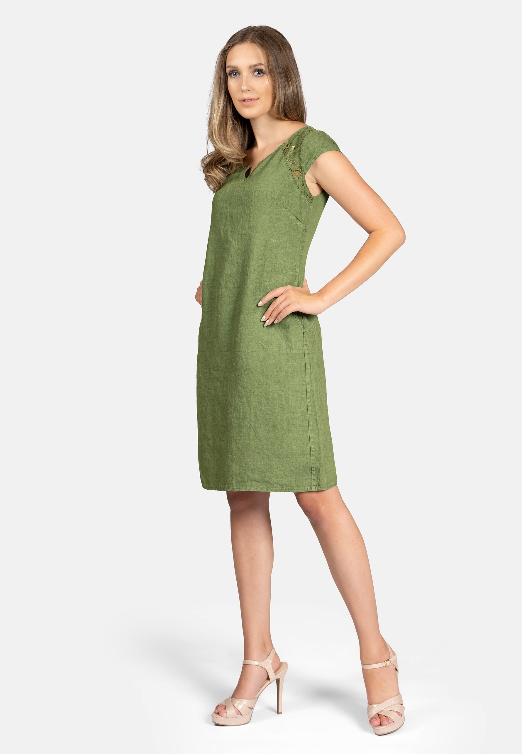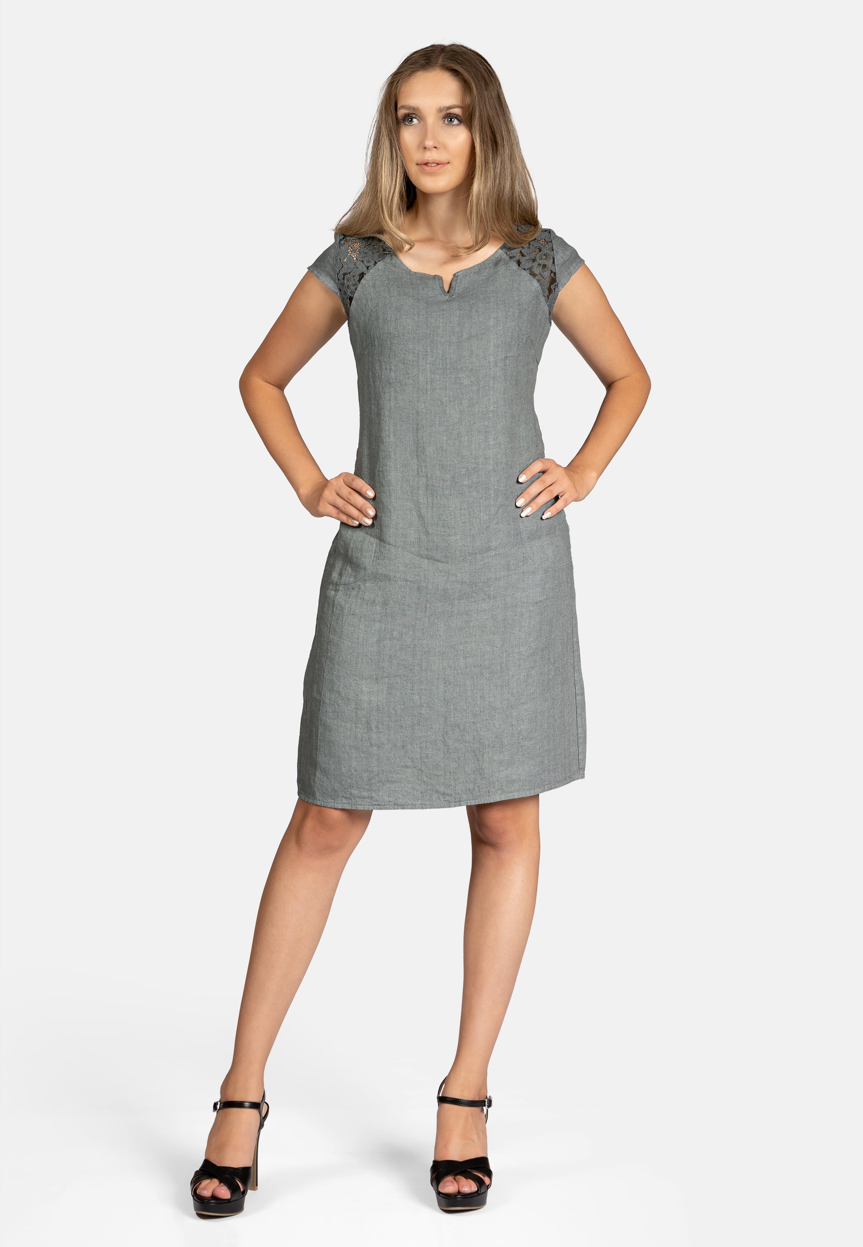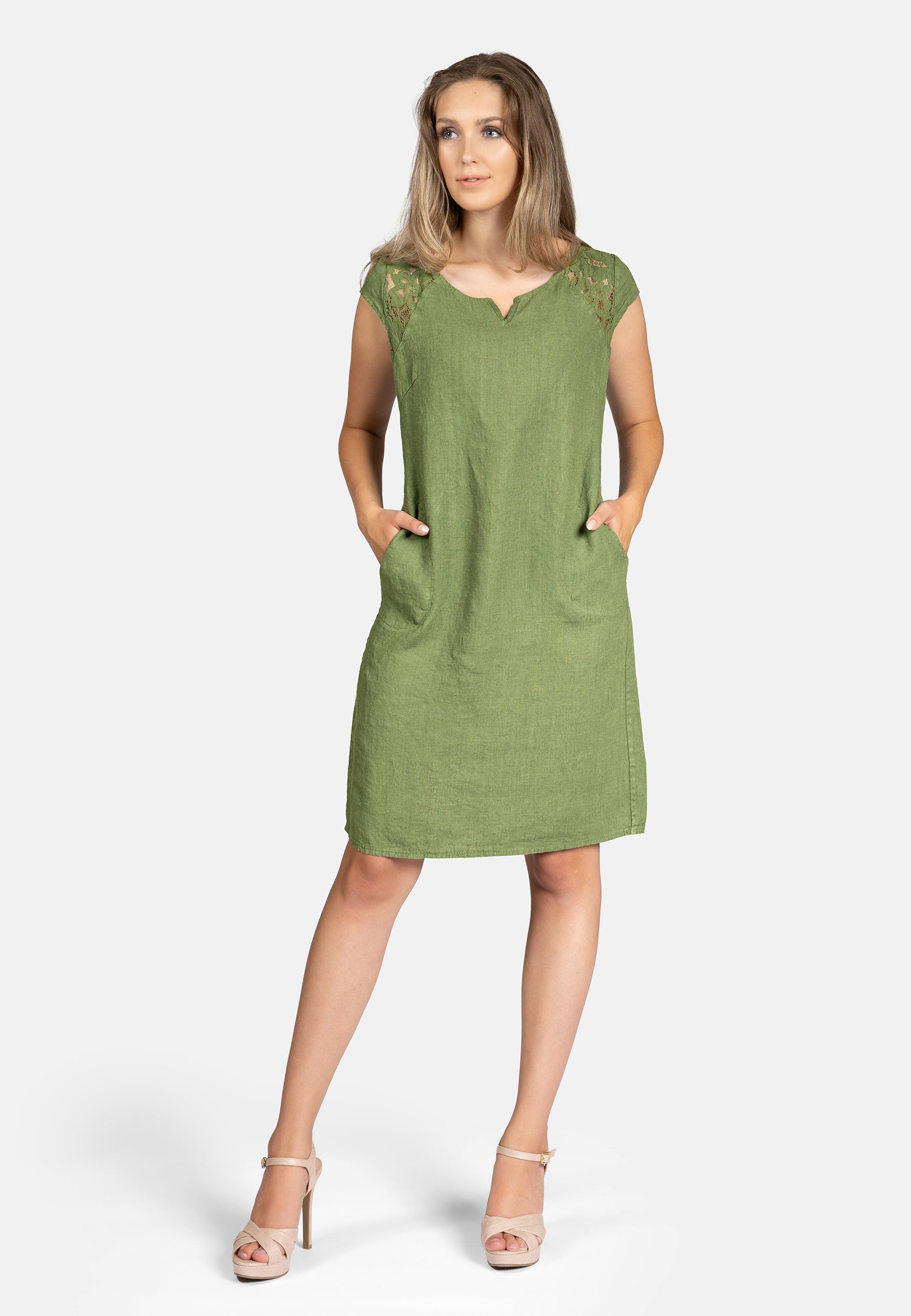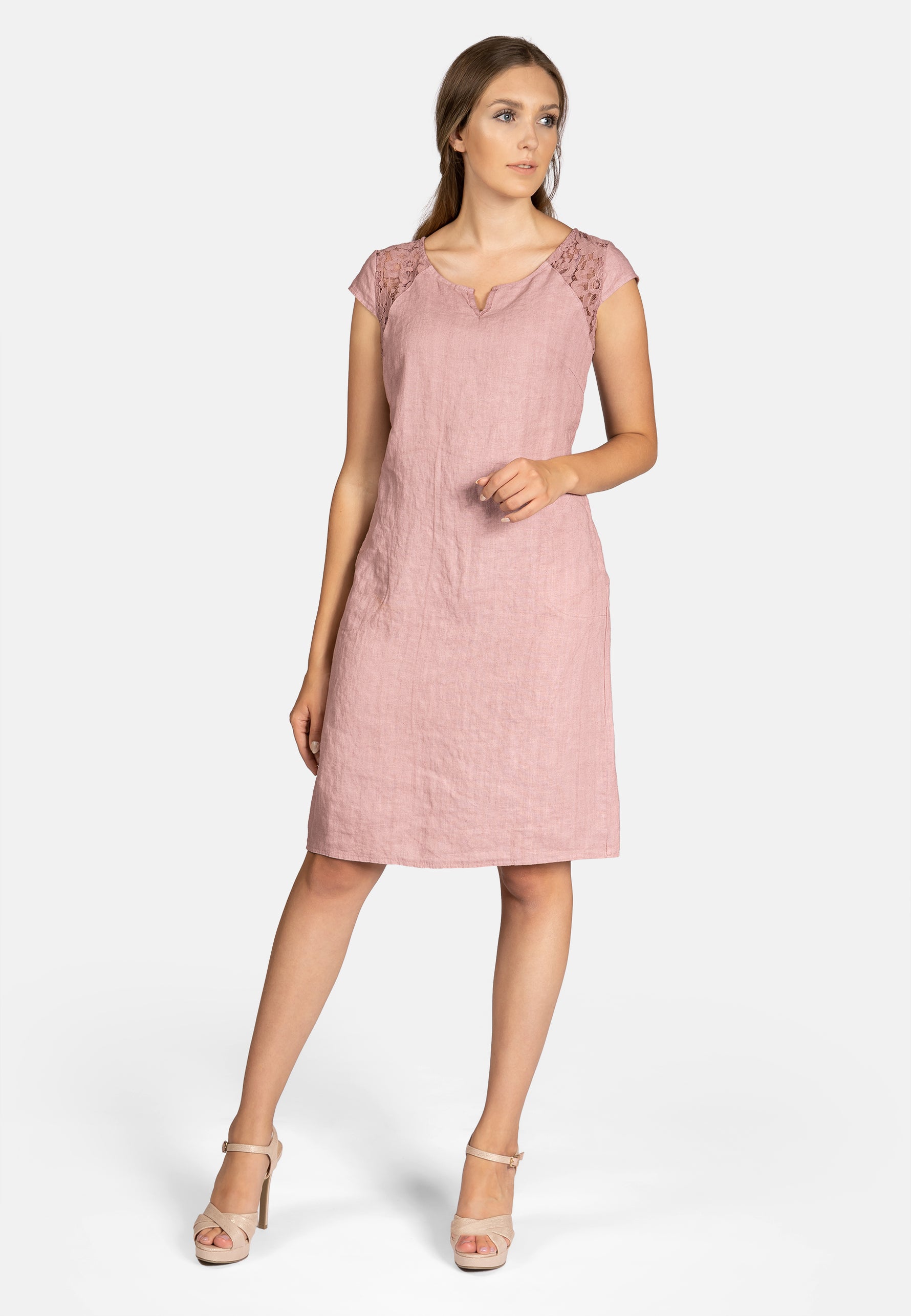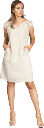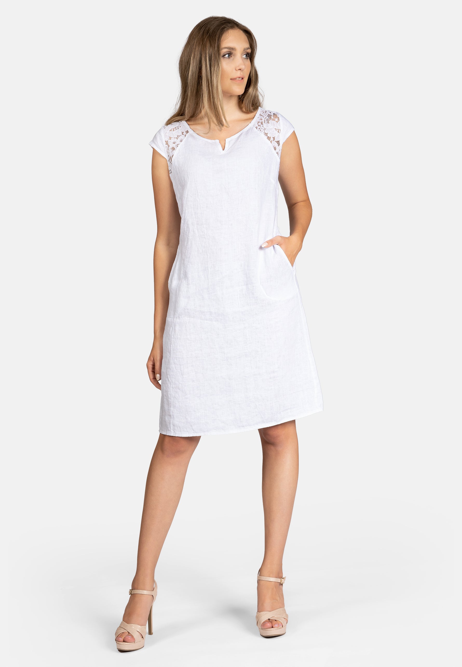 Lässig elegantes, bequemes Damen Sommerkleid aus 100% Leinen mit Spitzeneinsatz an den Ärmeln. Dieses knielange Kleid ist besonders an heißen Tagen super angenehm zu Tragen. Der bequeme, nur leicht taillierte Schnitt kaschiert geschickt kleine Problemzonen und das luftig leichte, natürliche Material bietet einen ausgesprochen hohen Tragekomfort. Seitlich hinten vom Ärmel bis zur Hüfte verläuft zusätzlich ein schmaler leicht dehnbarer Ripp-Einsatz. Der Halsausschnitt am Dekoltée ist mit einem dezenten, V-förmigen, grafischen Schnitt versehen. Auf der Vorderseite befinden sich in Hüfthöhe 2 aufgesetzte kleine Eingrifftaschen. Beweisen Sie Stil und Klasse mit dem schlichten, hochwertige Style dieses wundervoll eleganten Sommerkleides. Material: 100% Leinen. Pflegehinweis: Maschinenwäsche bei 30 Grad. Caspar - Made in Italy.