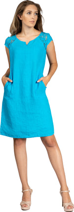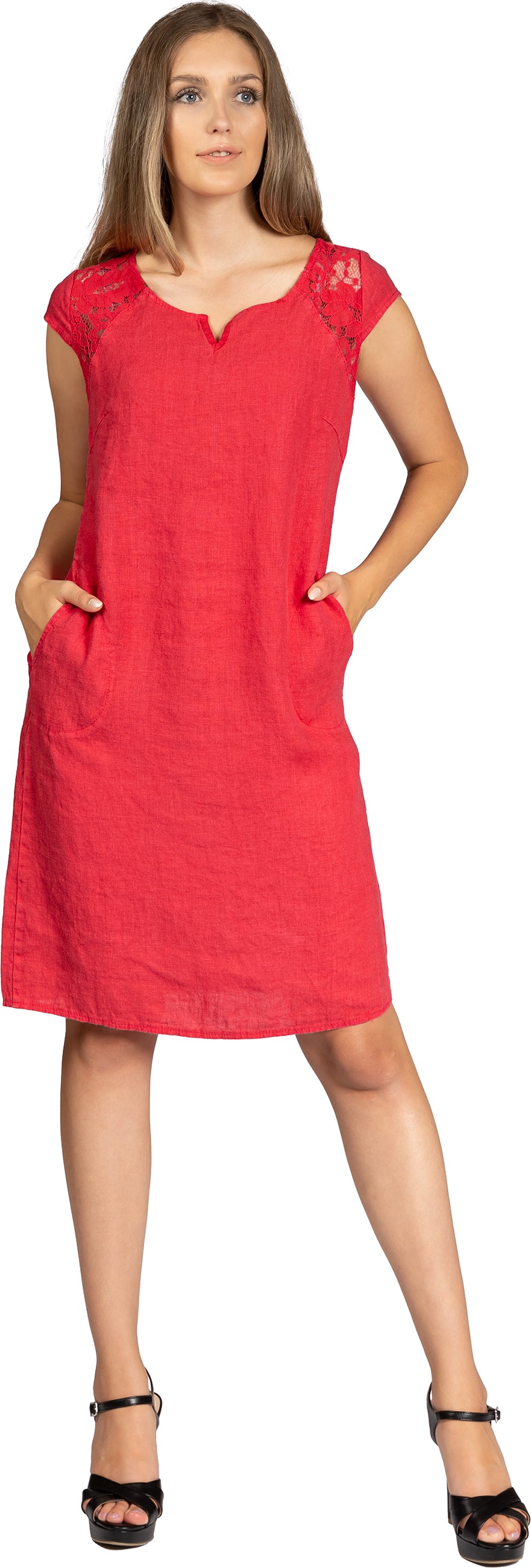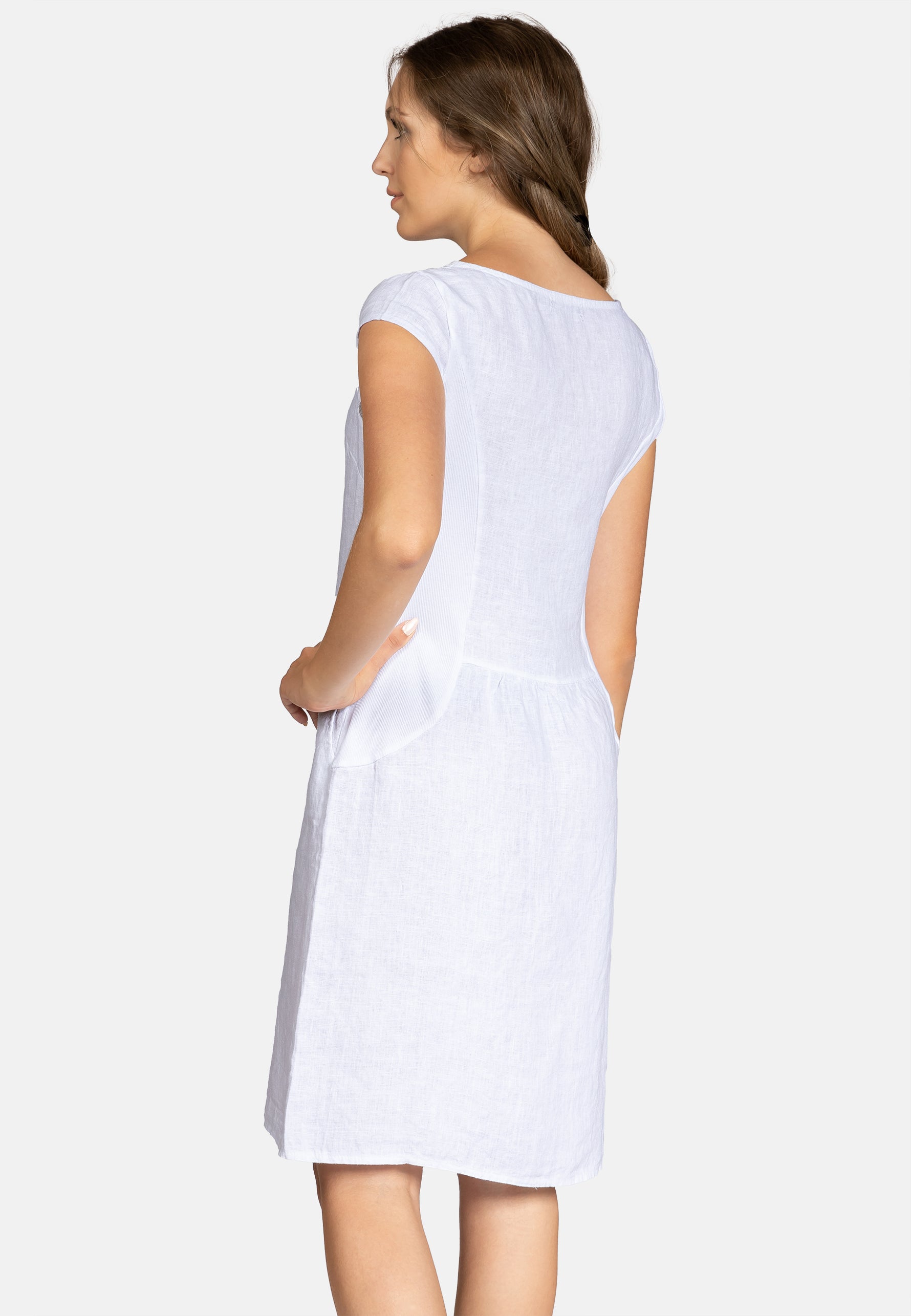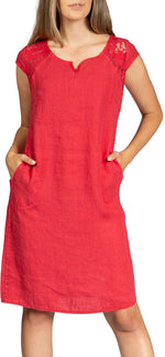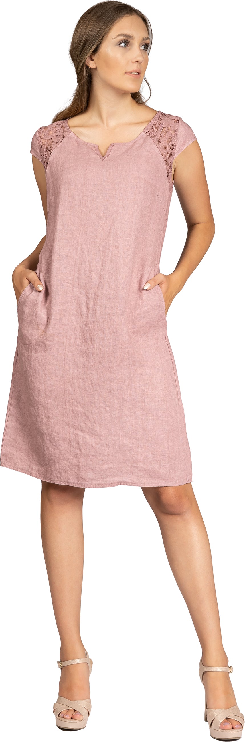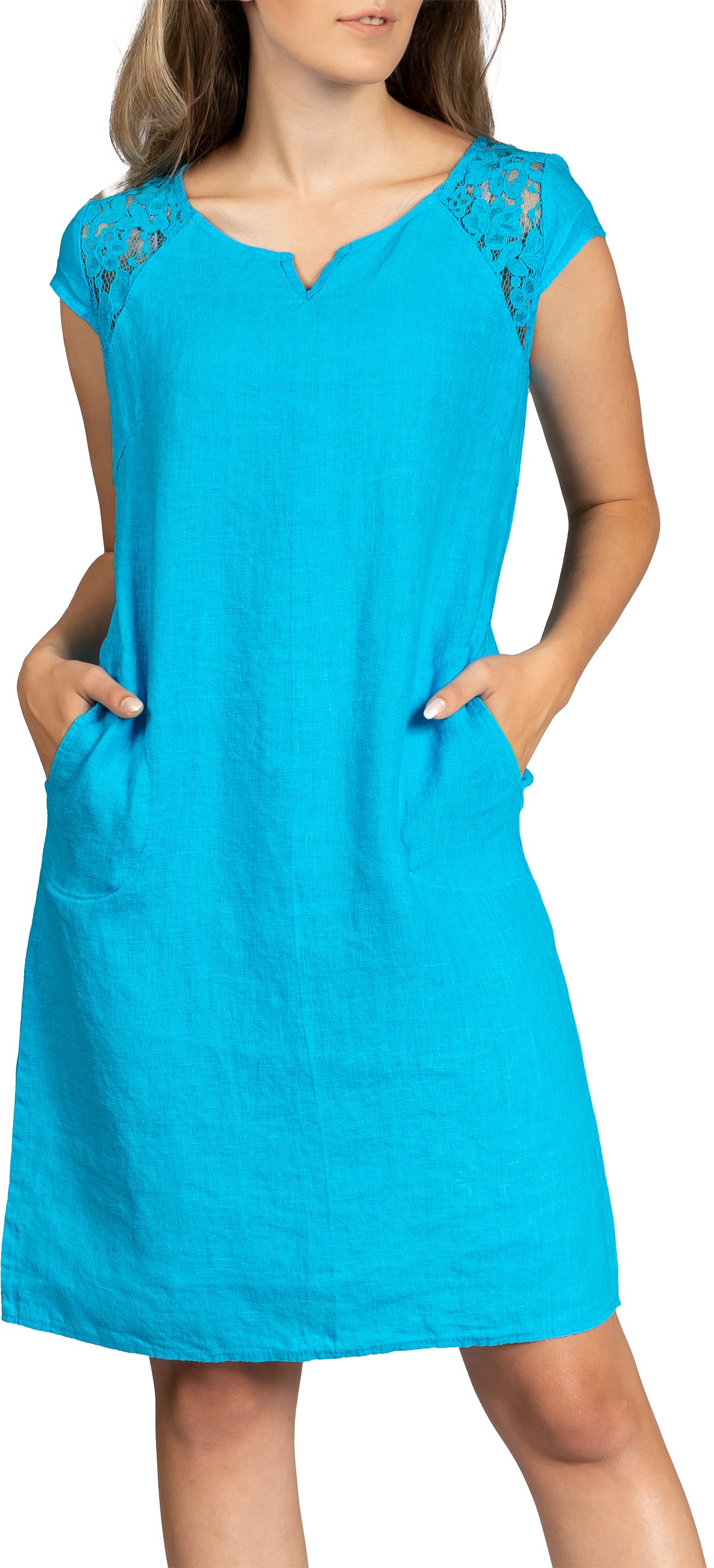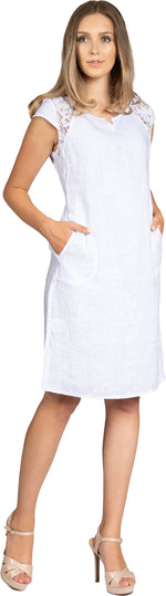 Lässig elegantes, bequemes Damen Sommerkleid aus 100% Leinen mit Spitzeneinsatz an den Ärmeln. Dieses knielange Kleid ist besonders an heißen Tagen super angenehm zu Tragen. Der bequeme, nur leicht taillierte Schnitt kaschiert geschickt kleine Problemzonen und das luftig leichte, natürliche Material bietet einen ausgesprochen hohen Tragekomfort. Seitlich hinten vom Ärmel bis zur Hüfte verläuft zusätzlich ein schmaler leicht dehnbarer Ripp-Einsatz. Der Halsausschnitt am Dekoltée ist mit einem dezenten, V-förmigen, grafischen Schnitt versehen. Auf der Vorderseite befinden sich in Hüfthöhe 2 aufgesetzte kleine Eingrifftaschen. Beweisen Sie Stil und Klasse mit dem schlichten, hochwertige Style dieses wundervoll eleganten Sommerkleides. Material: 100% Leinen. Pflegehinweis: Maschinenwäsche bei 30 Grad. Caspar - Made in Italy.