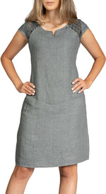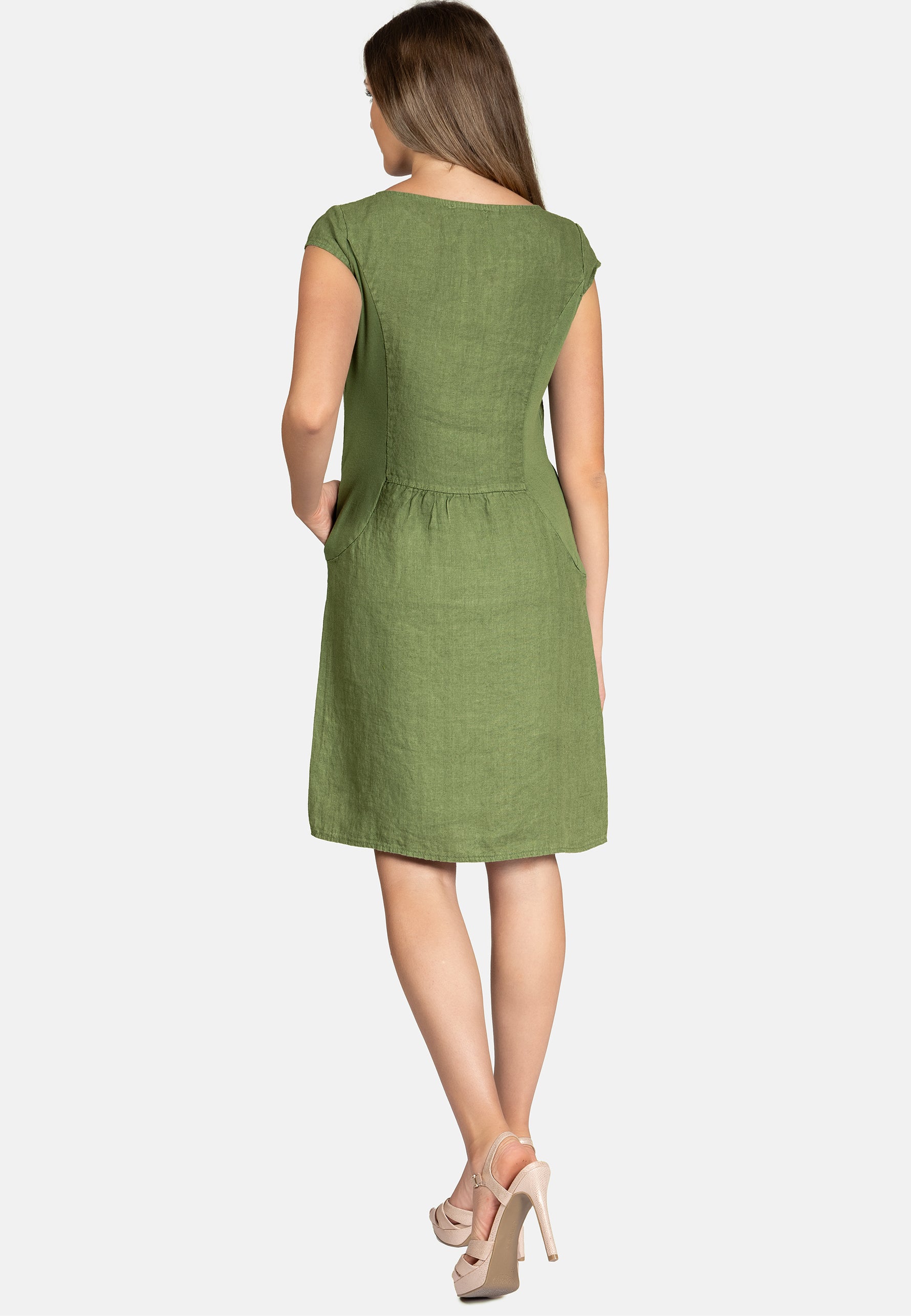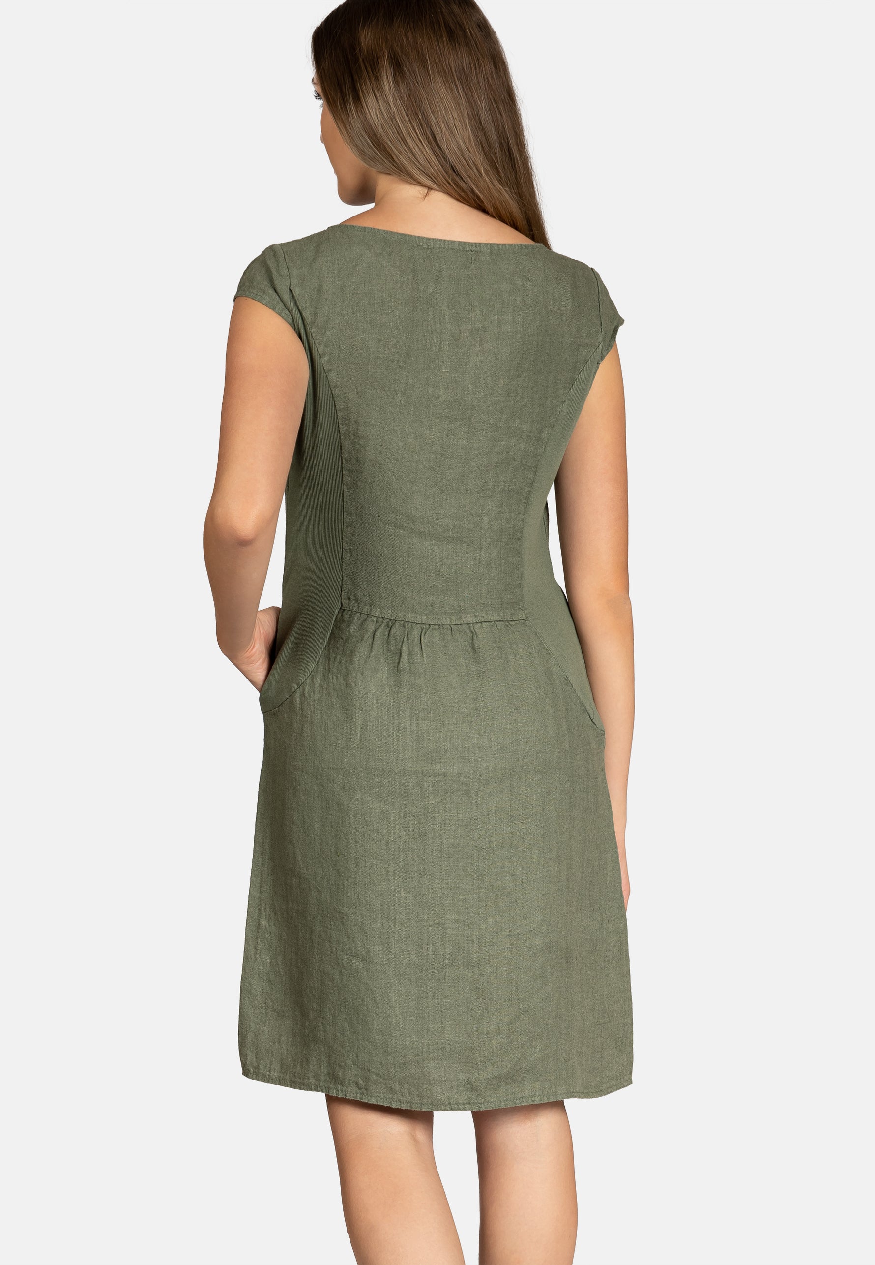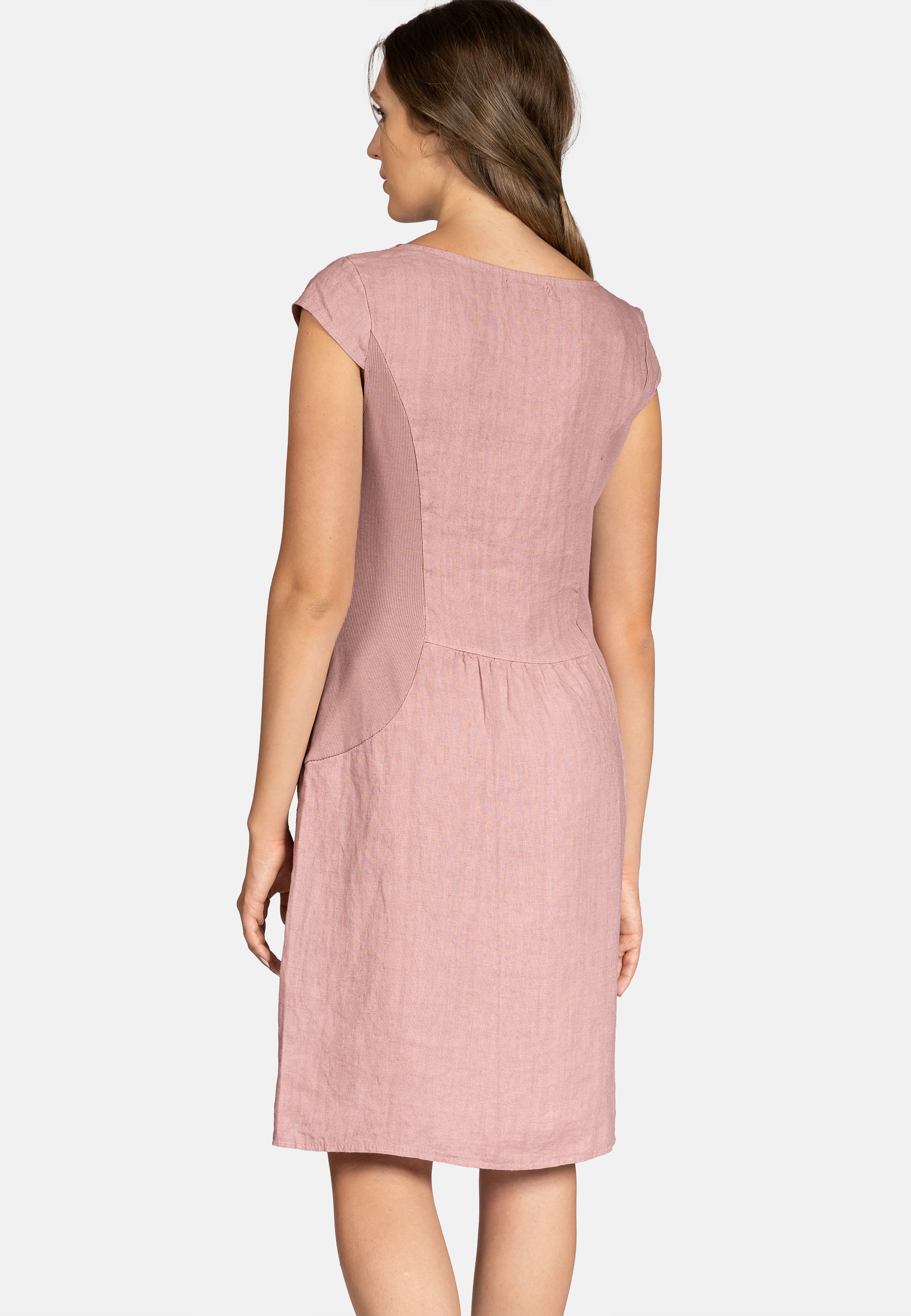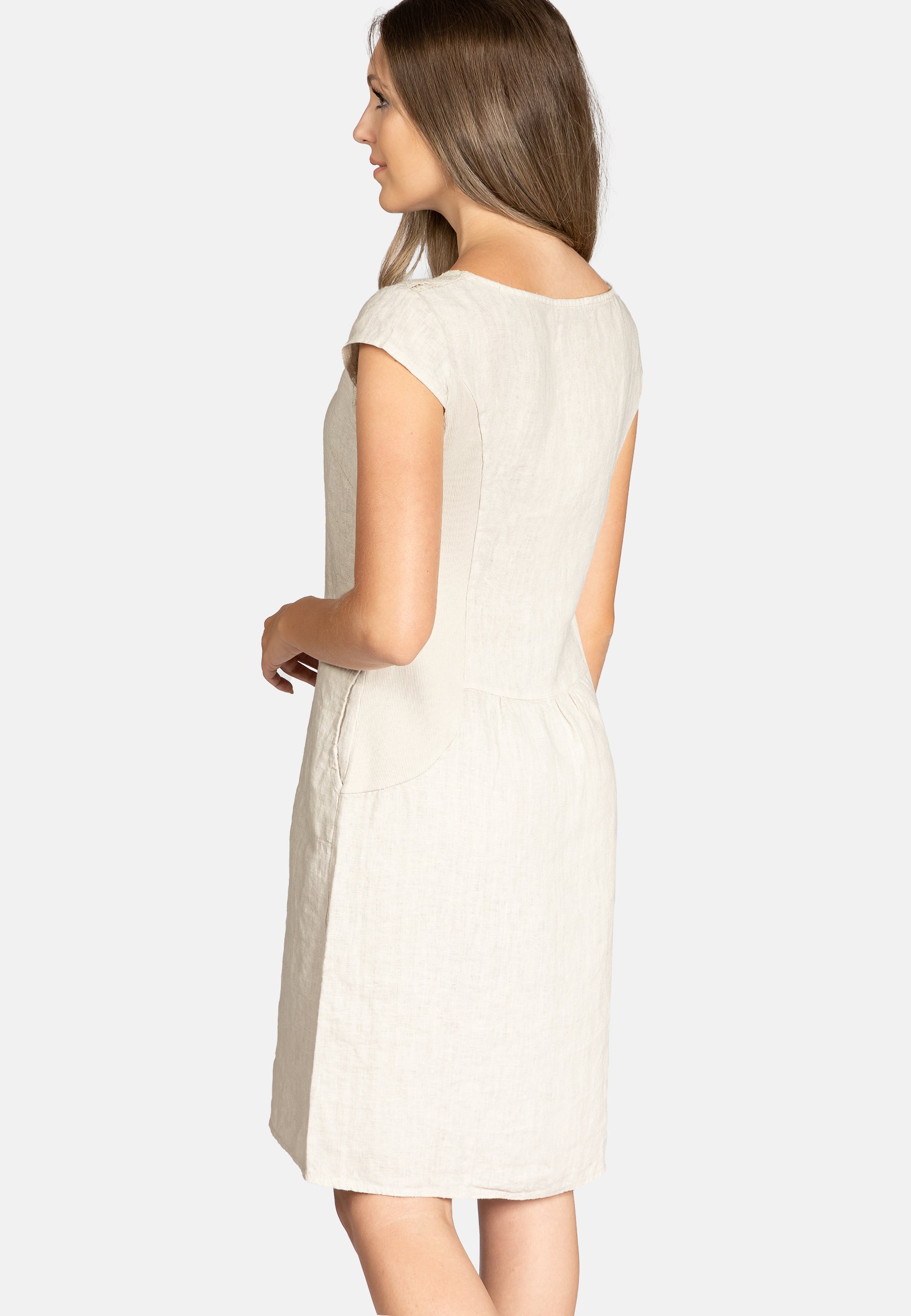 Lässig elegantes, bequemes Damen Sommerkleid aus 100% Leinen mit Spitzeneinsatz an den Ärmeln. Dieses knielange Kleid ist besonders an heißen Tagen super angenehm zu Tragen. Der bequeme, nur leicht taillierte Schnitt kaschiert geschickt kleine Problemzonen und das luftig leichte, natürliche Material bietet einen ausgesprochen hohen Tragekomfort. Seitlich hinten vom Ärmel bis zur Hüfte verläuft zusätzlich ein schmaler leicht dehnbarer Ripp-Einsatz. Der Halsausschnitt am Dekoltée ist mit einem dezenten, V-förmigen, grafischen Schnitt versehen. Auf der Vorderseite befinden sich in Hüfthöhe 2 aufgesetzte kleine Eingrifftaschen. Beweisen Sie Stil und Klasse mit dem schlichten, hochwertige Style dieses wundervoll eleganten Sommerkleides. Material: 100% Leinen. Pflegehinweis: Maschinenwäsche bei 30 Grad. Caspar - Made in Italy.