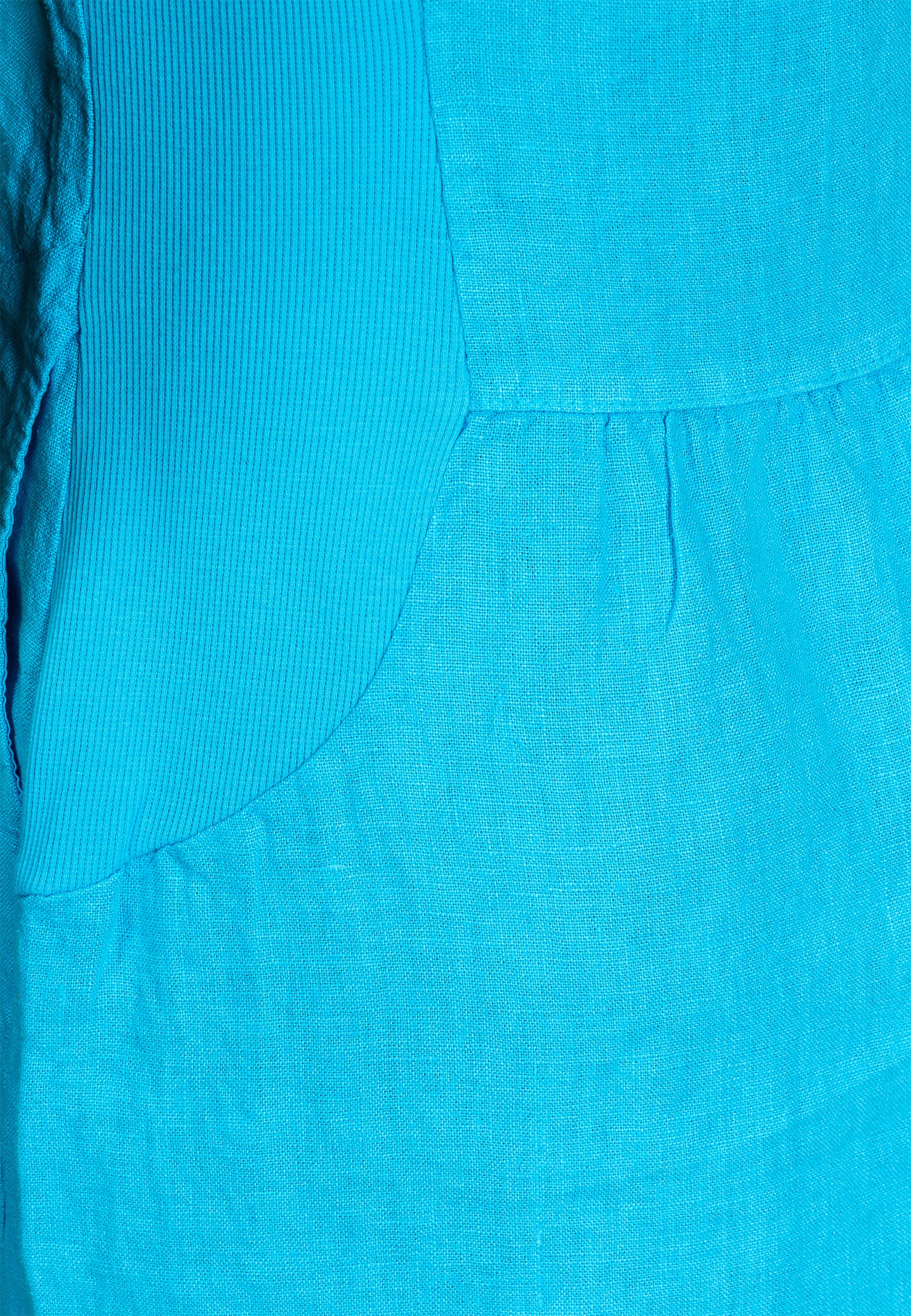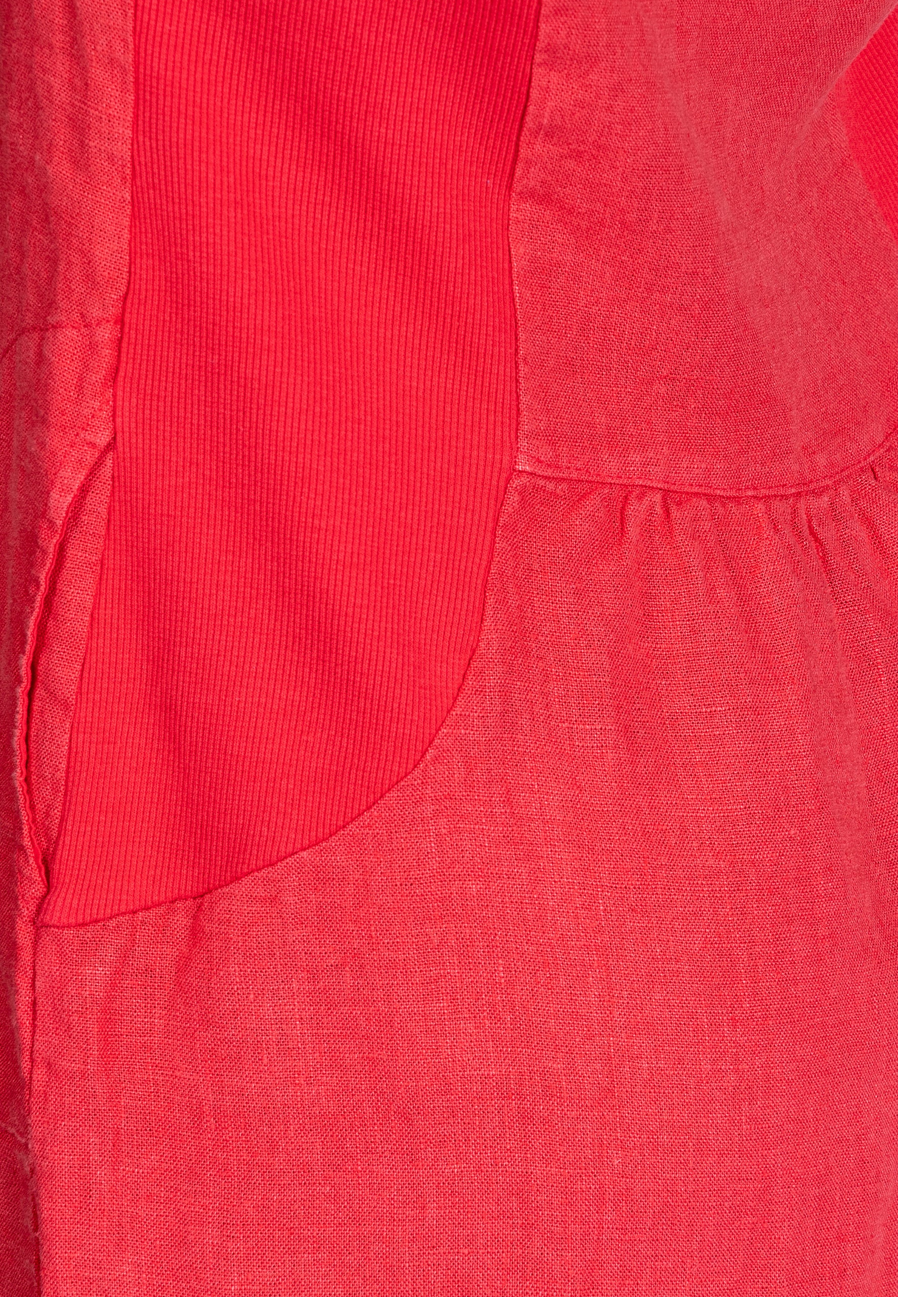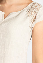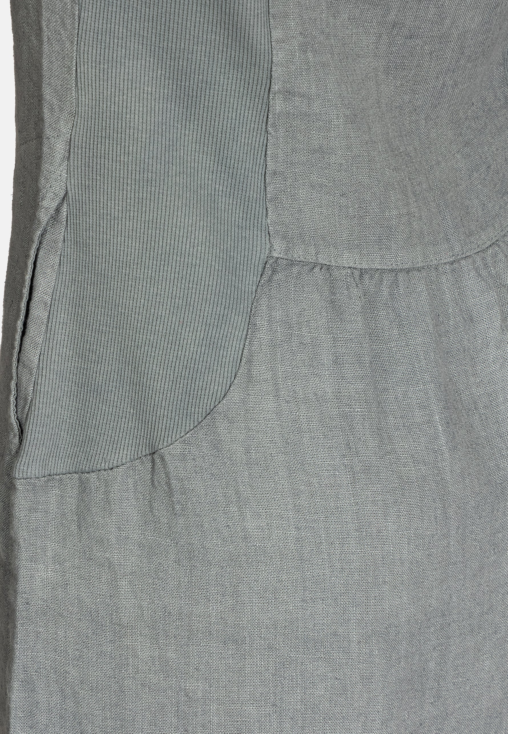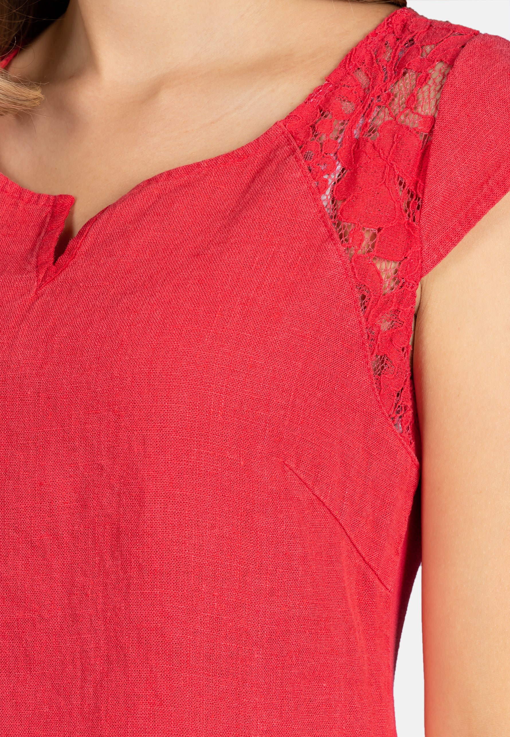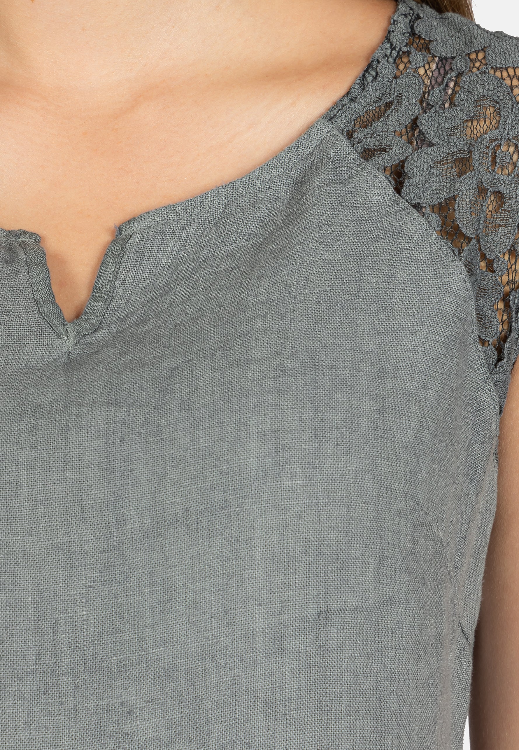 Lässig elegantes, bequemes Damen Sommerkleid aus 100% Leinen mit Spitzeneinsatz an den Ärmeln. Dieses knielange Kleid ist besonders an heißen Tagen super angenehm zu Tragen. Der bequeme, nur leicht taillierte Schnitt kaschiert geschickt kleine Problemzonen und das luftig leichte, natürliche Material bietet einen ausgesprochen hohen Tragekomfort. Seitlich hinten vom Ärmel bis zur Hüfte verläuft zusätzlich ein schmaler leicht dehnbarer Ripp-Einsatz. Der Halsausschnitt am Dekoltée ist mit einem dezenten, V-förmigen, grafischen Schnitt versehen. Auf der Vorderseite befinden sich in Hüfthöhe 2 aufgesetzte kleine Eingrifftaschen. Beweisen Sie Stil und Klasse mit dem schlichten, hochwertige Style dieses wundervoll eleganten Sommerkleides. Material: 100% Leinen. Pflegehinweis: Maschinenwäsche bei 30 Grad. Caspar - Made in Italy.