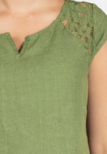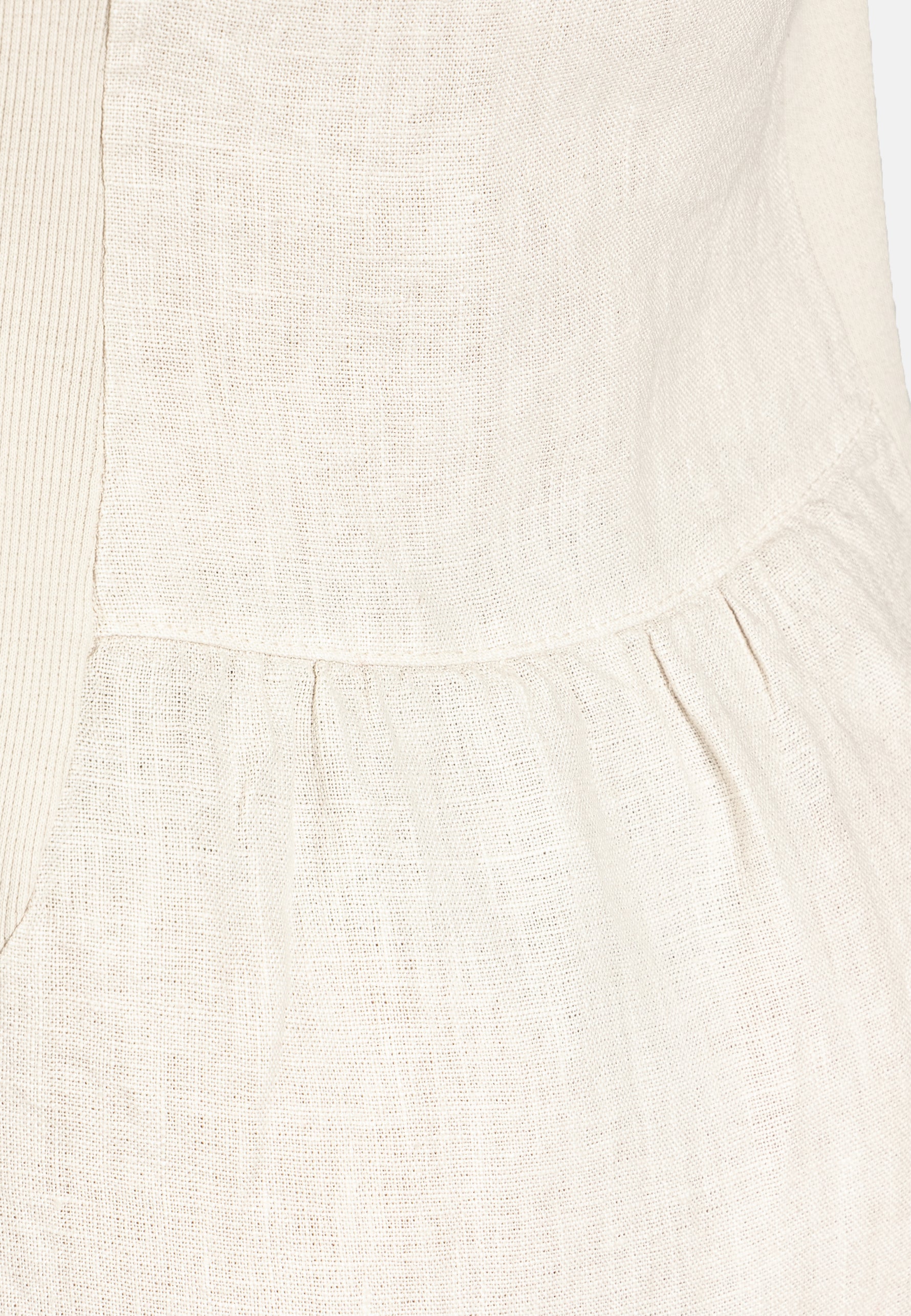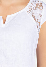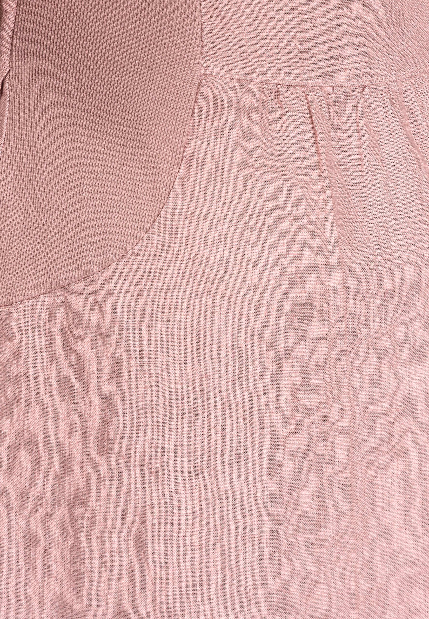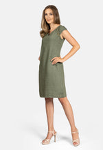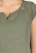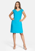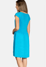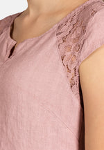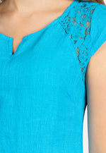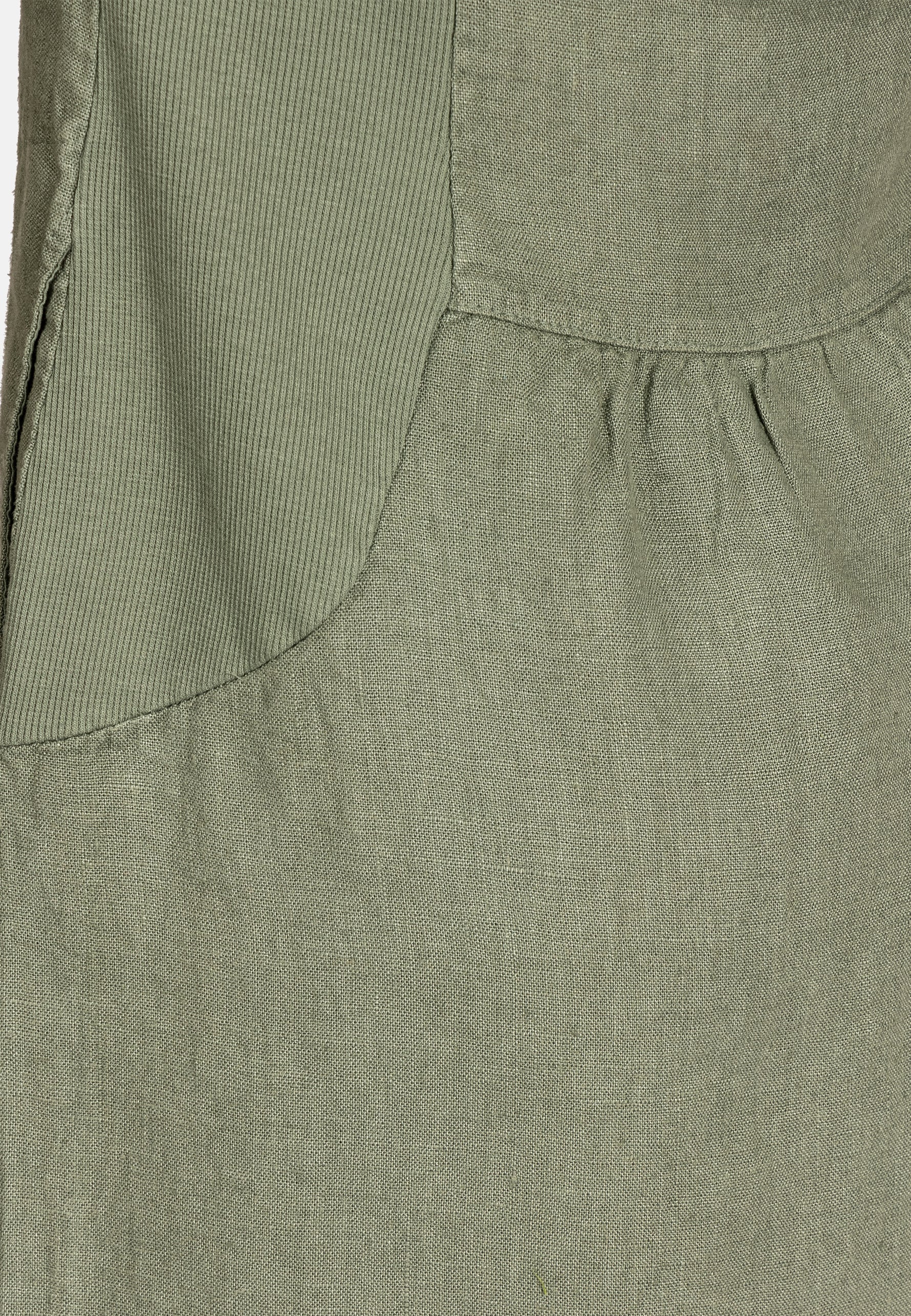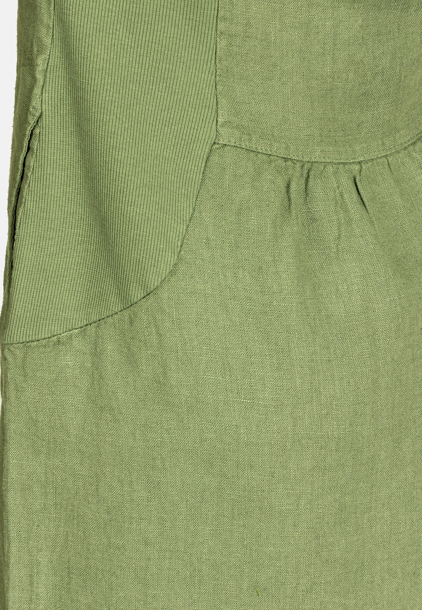 Lässig elegantes, bequemes Damen Sommerkleid aus 100% Leinen mit Spitzeneinsatz an den Ärmeln. Dieses knielange Kleid ist besonders an heißen Tagen super angenehm zu Tragen. Der bequeme, nur leicht taillierte Schnitt kaschiert geschickt kleine Problemzonen und das luftig leichte, natürliche Material bietet einen ausgesprochen hohen Tragekomfort. Seitlich hinten vom Ärmel bis zur Hüfte verläuft zusätzlich ein schmaler leicht dehnbarer Ripp-Einsatz. Der Halsausschnitt am Dekoltée ist mit einem dezenten, V-förmigen, grafischen Schnitt versehen. Auf der Vorderseite befinden sich in Hüfthöhe 2 aufgesetzte kleine Eingrifftaschen. Beweisen Sie Stil und Klasse mit dem schlichten, hochwertige Style dieses wundervoll eleganten Sommerkleides. Material: 100% Leinen. Pflegehinweis: Maschinenwäsche bei 30 Grad. Caspar - Made in Italy.
