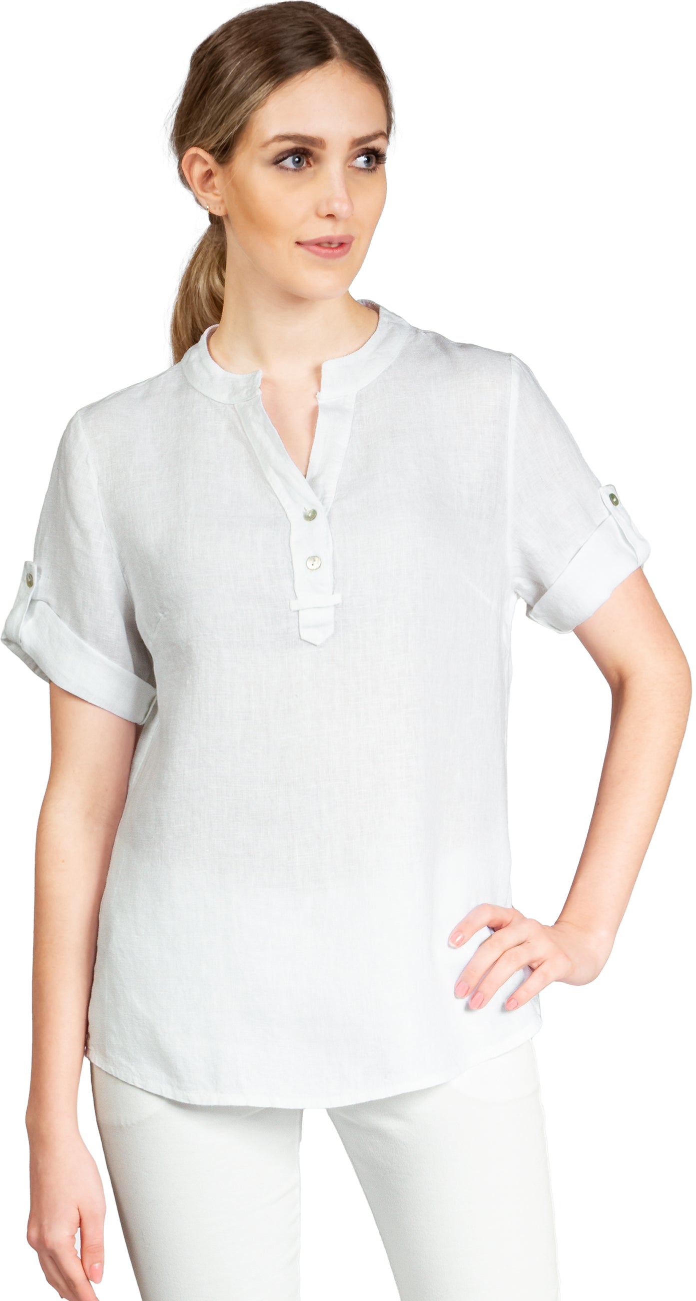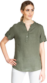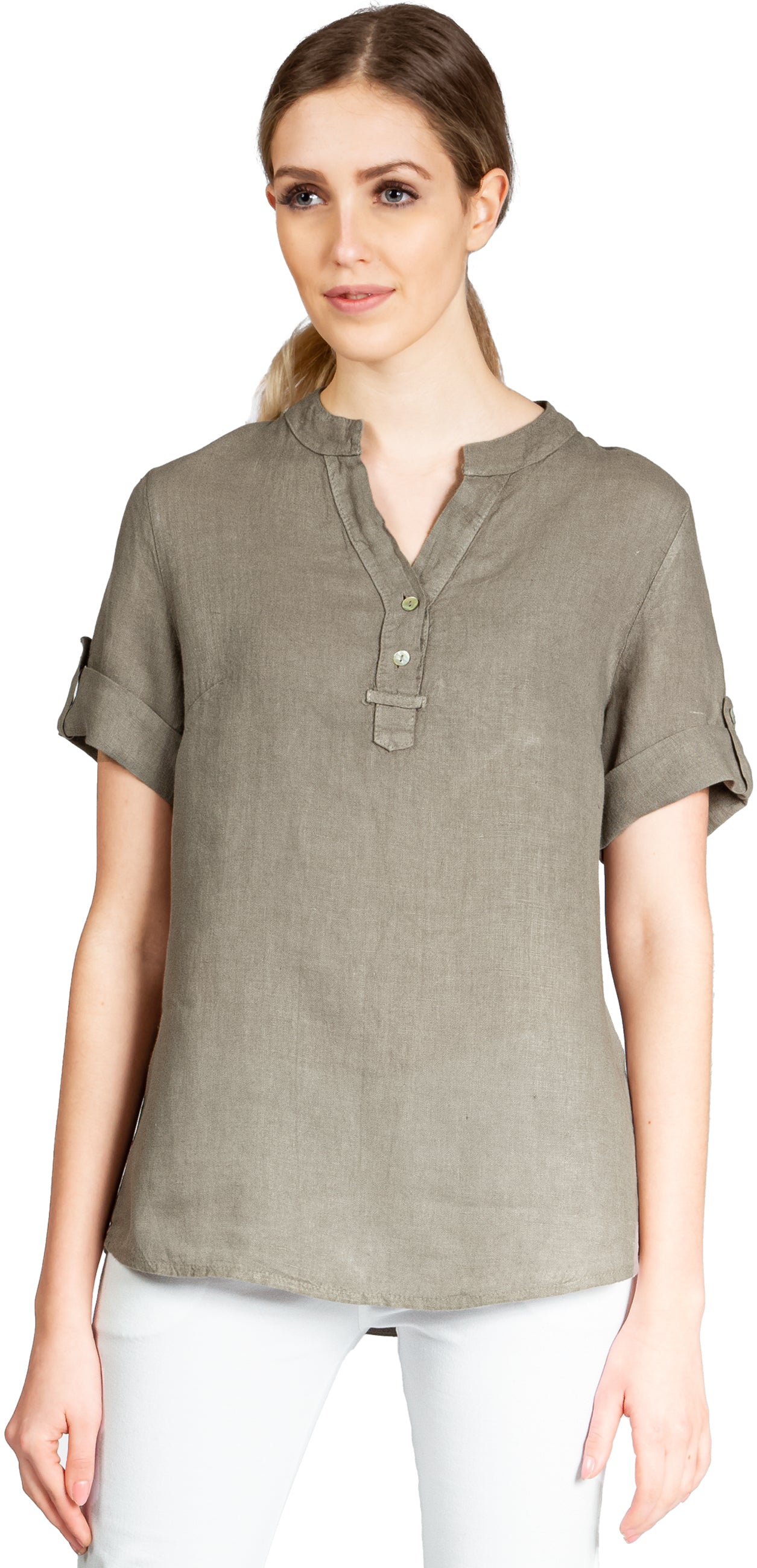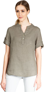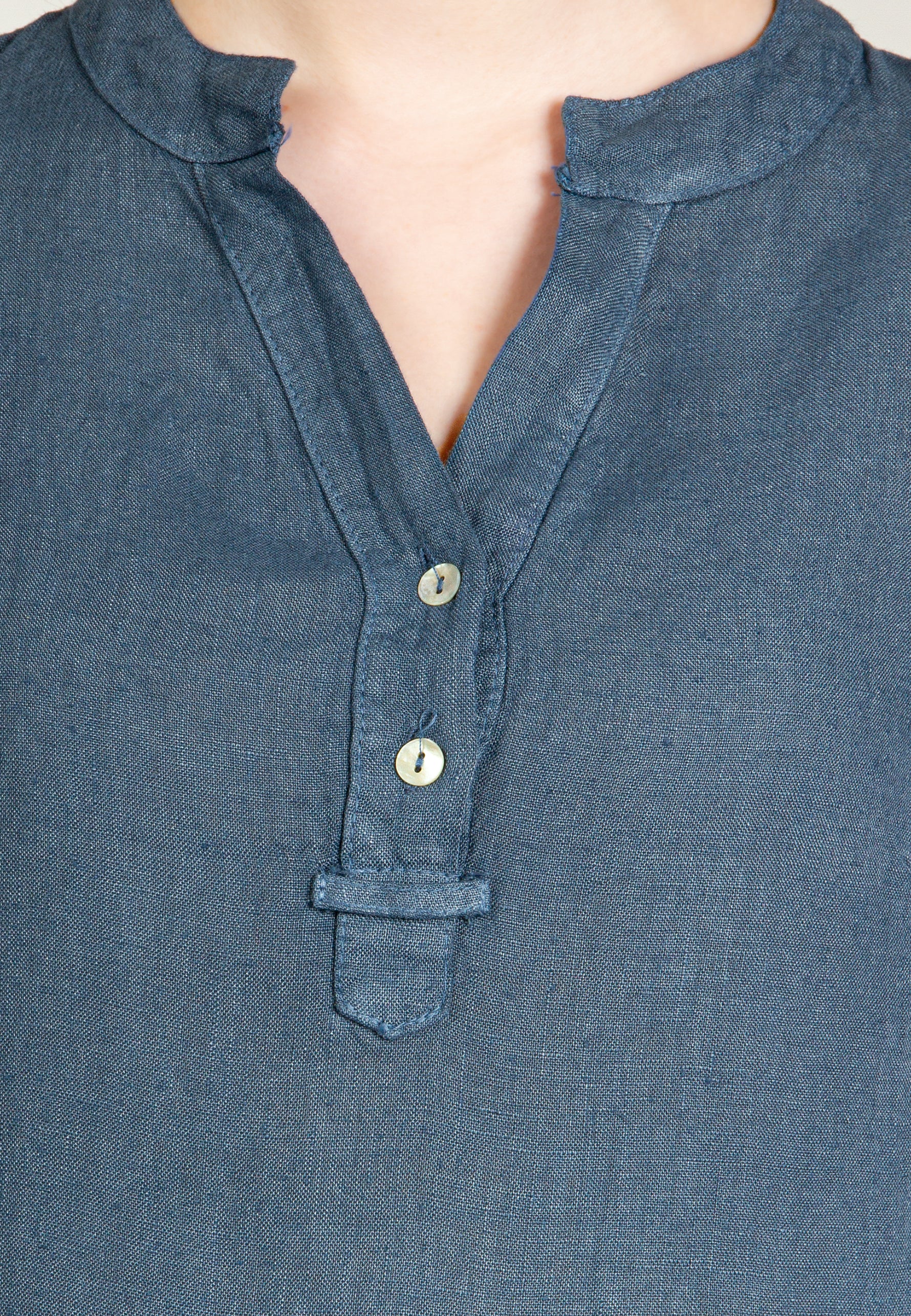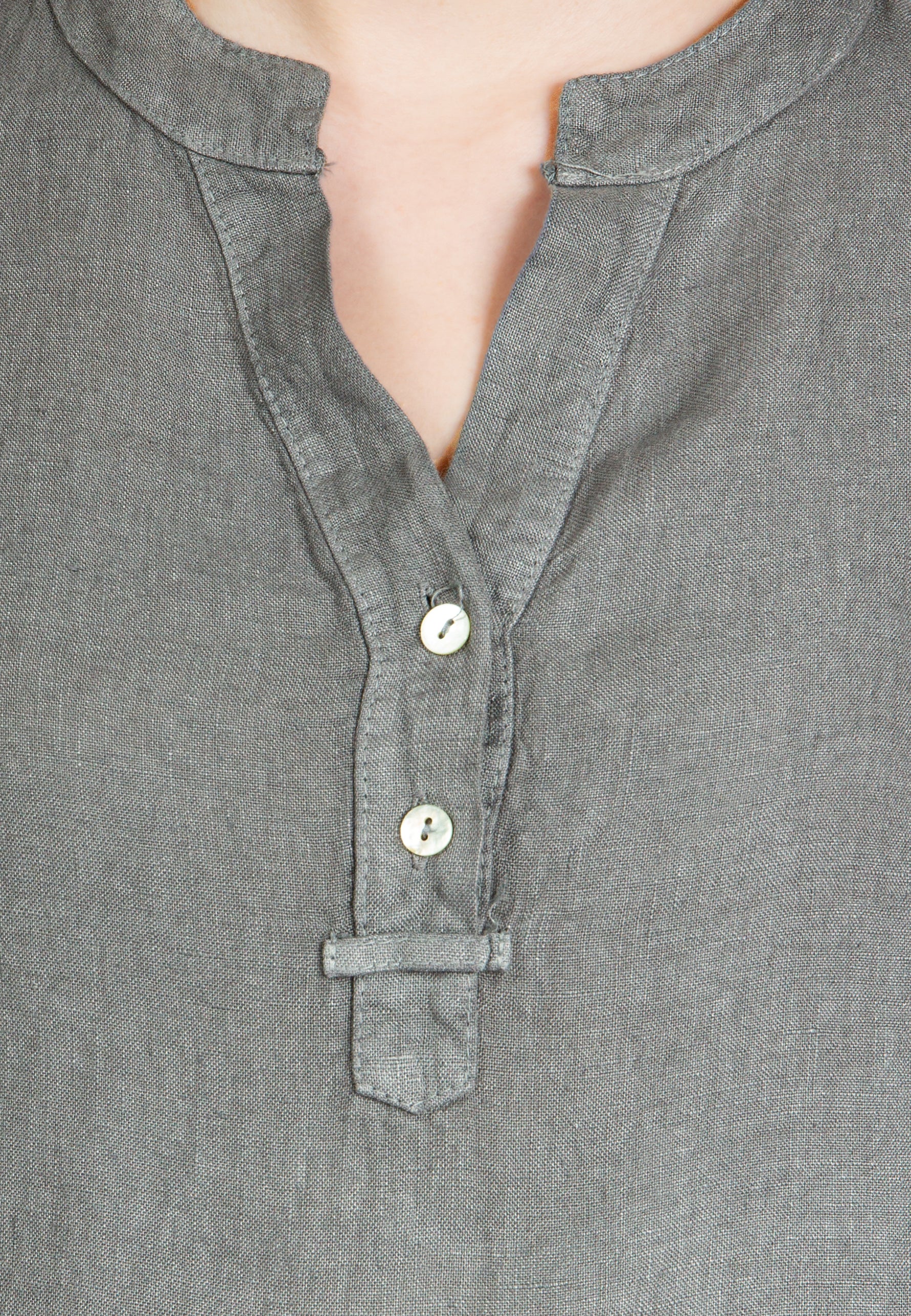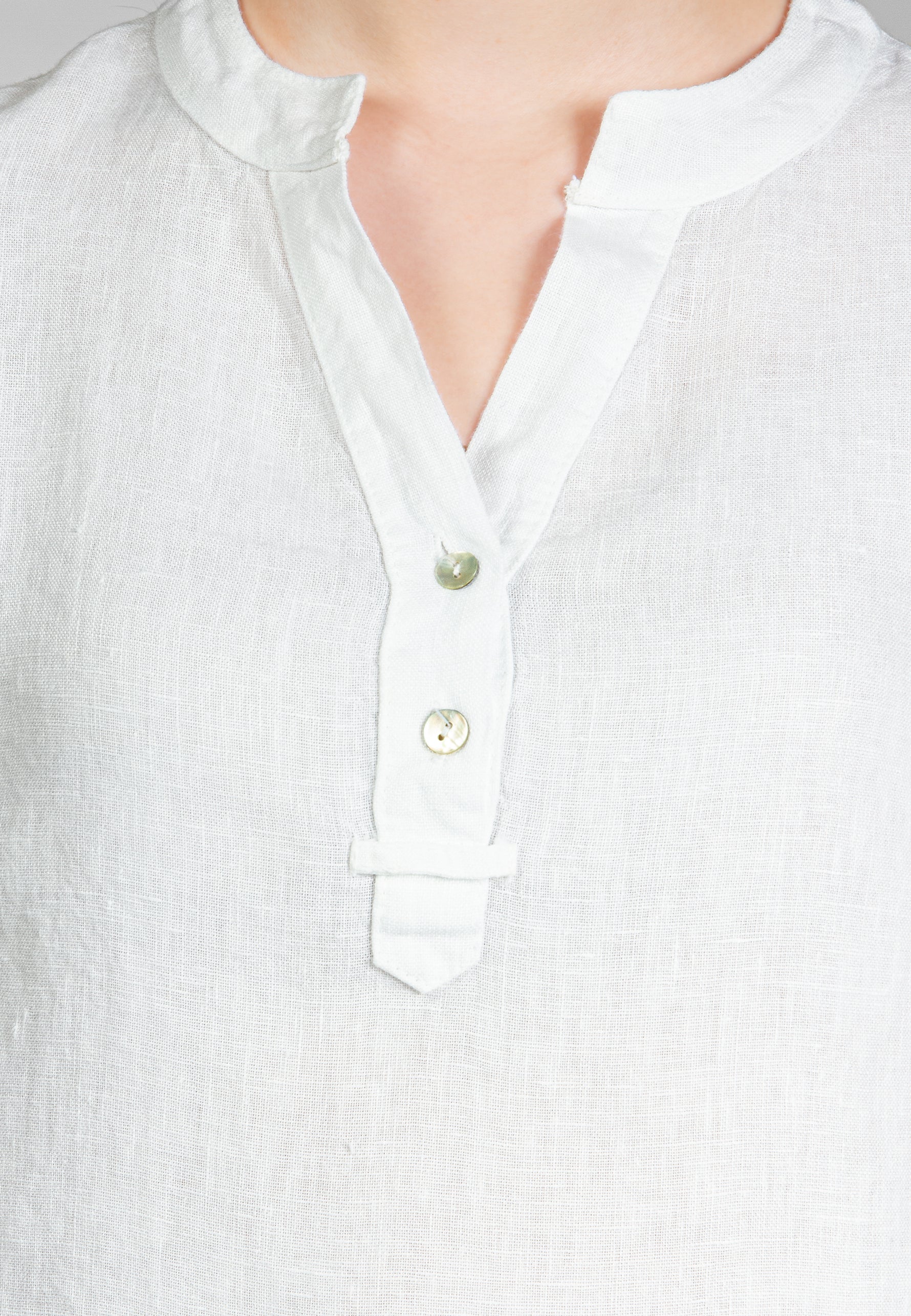 Super angenehm zu tragende, sportlich elegante Shirtbluse mit stylischem V-Ausschnitt und Perlmutt Knopfleiste. Der gerade Schnitt dieses Leinenshirts ist schlicht und dennoch hochwertig elegant und lässig. Das besondere Etwas bekommt das Teil durch den lässigen V-Ausschnitt und die nach oben gebundenen Ärmel. Sie werden dieses neue Teil lieben... Material: 100% Leinen. Pflegehinweis: Maschinenwäsche bei 30°C. Caspar Fashion - Made in Italy.