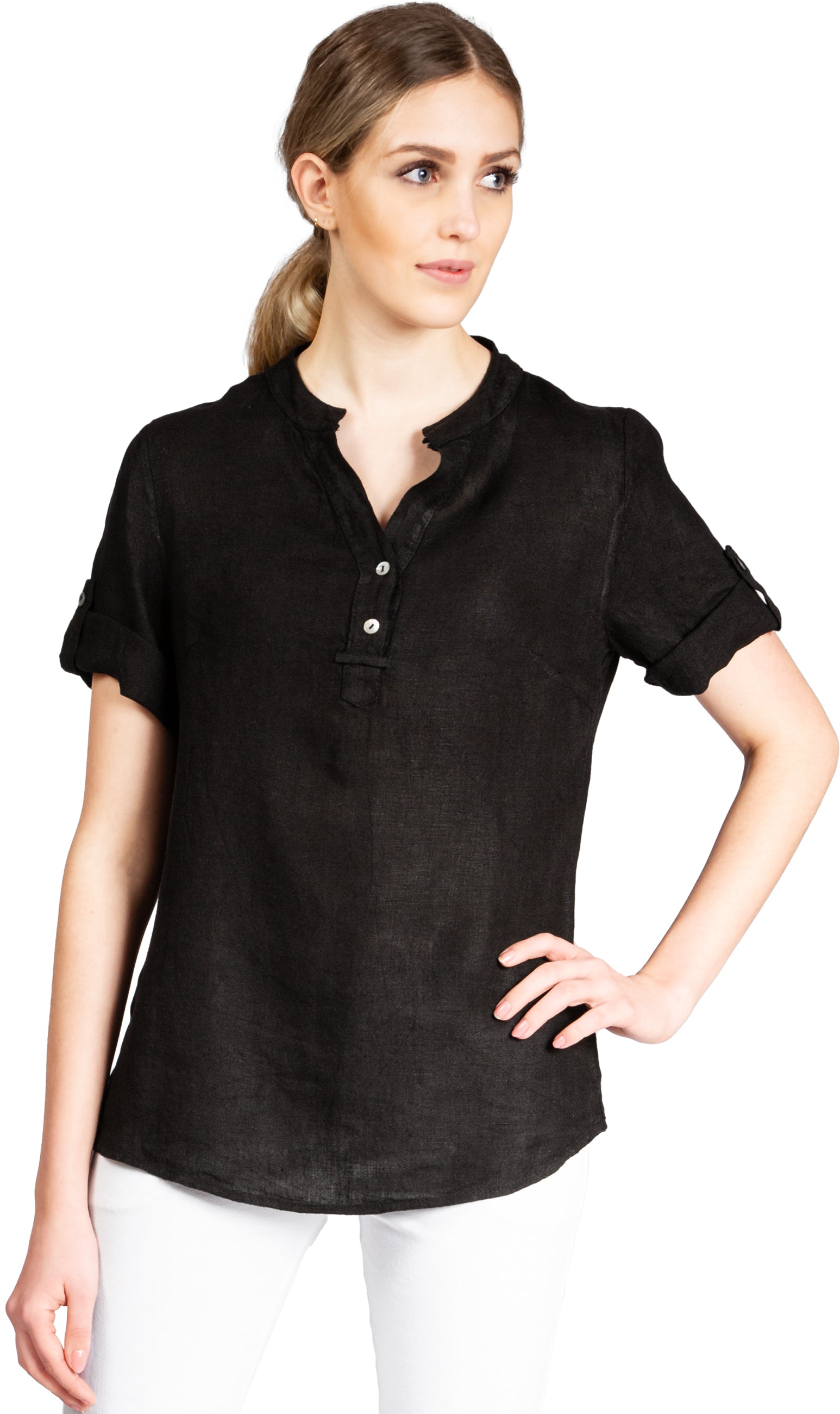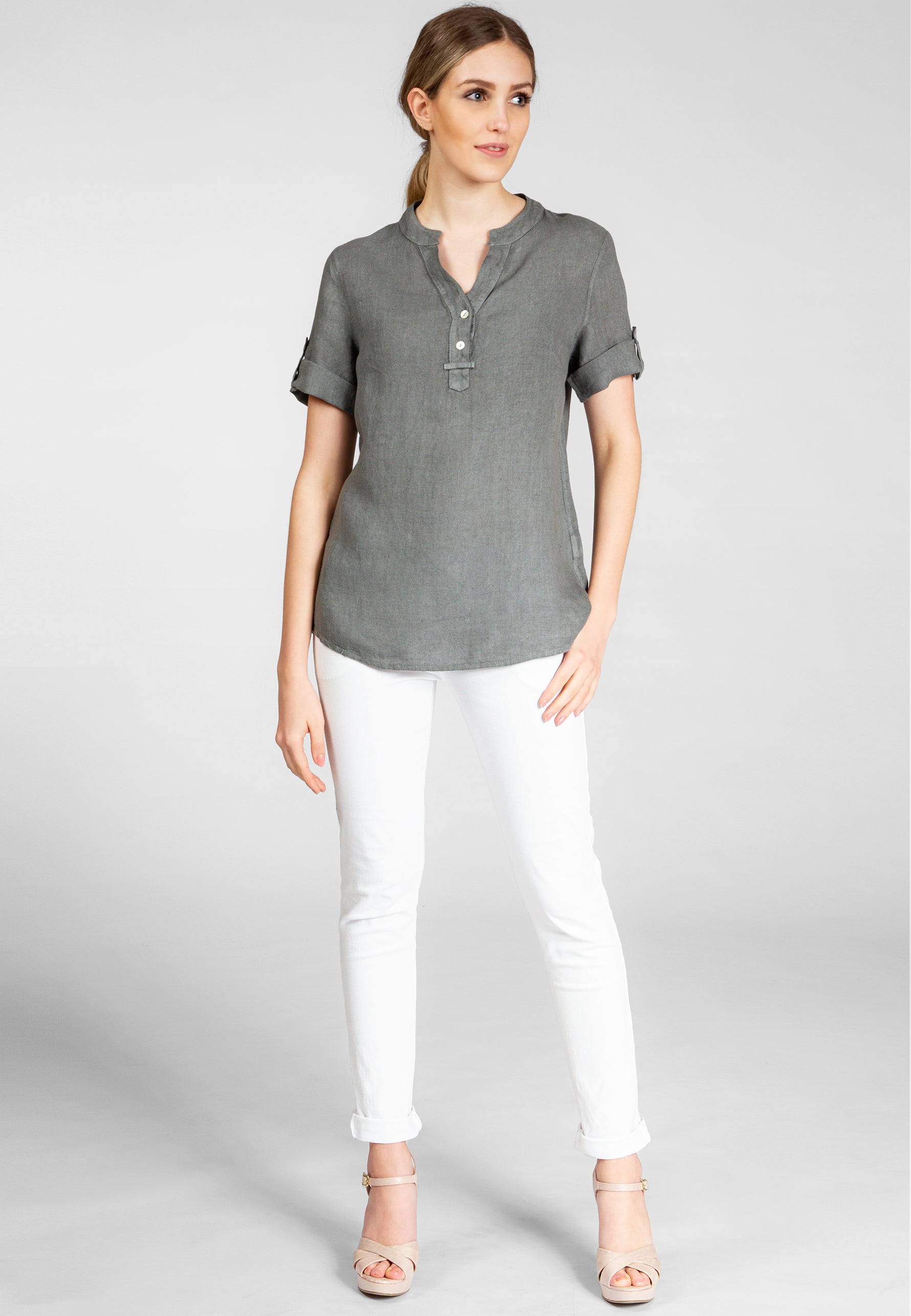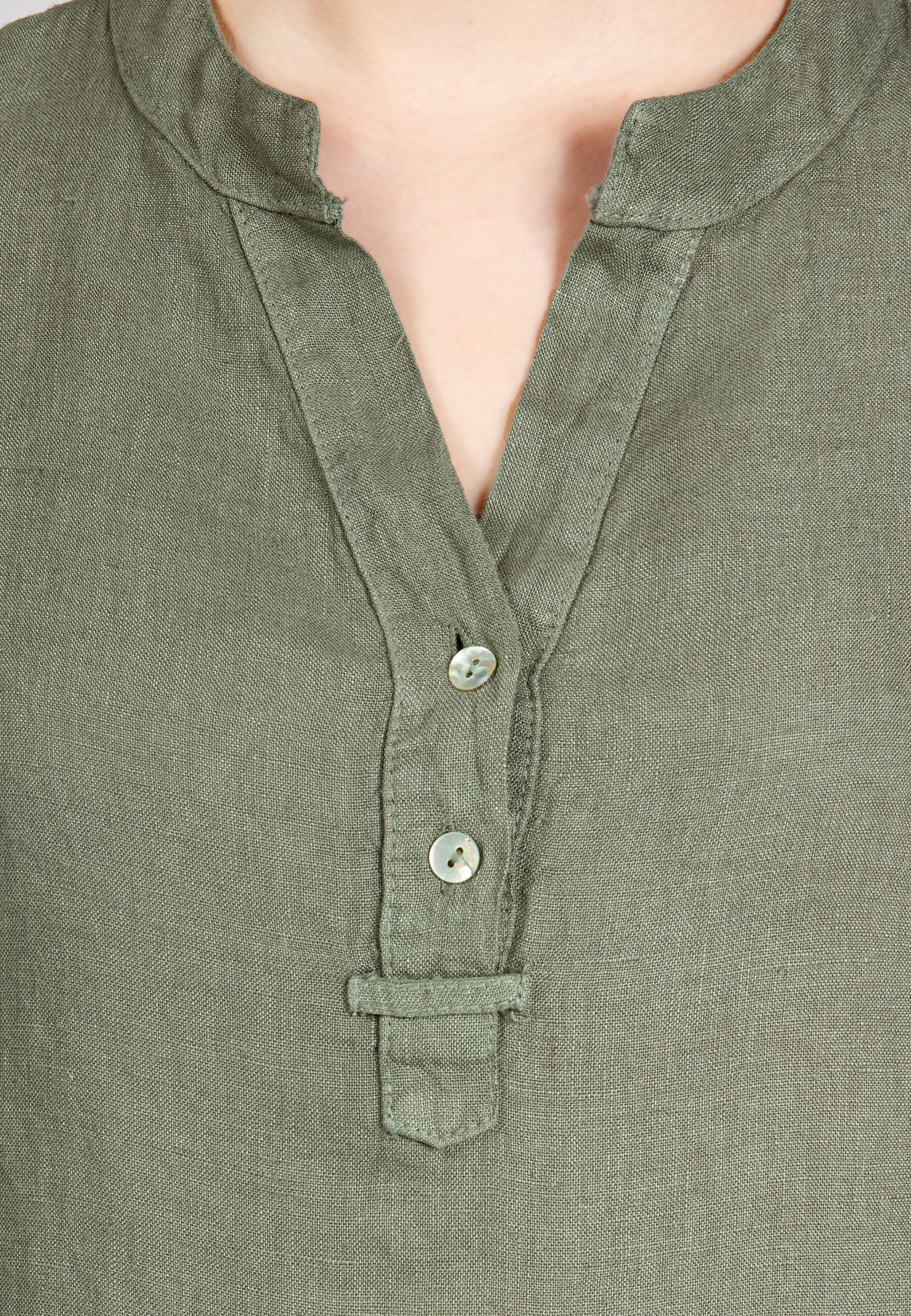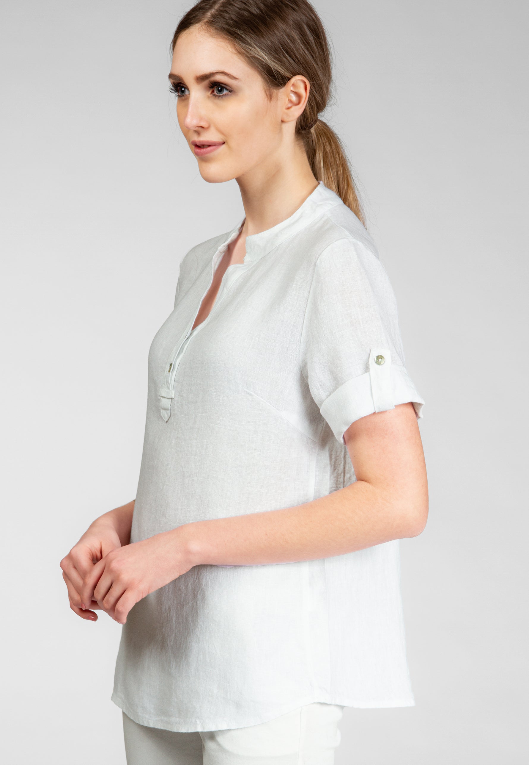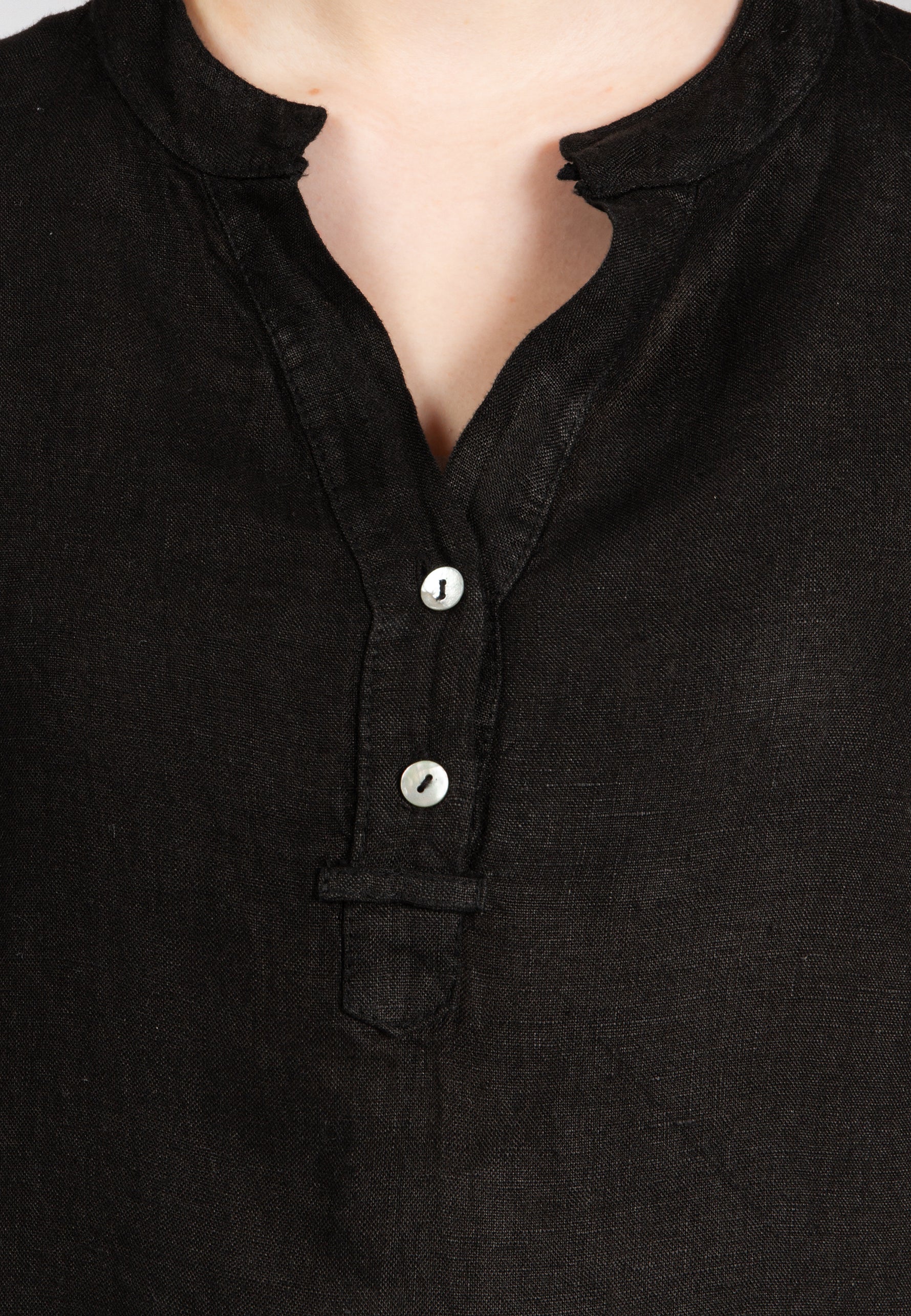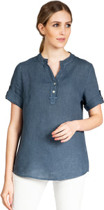 Super angenehm zu tragende, sportlich elegante Shirtbluse mit stylischem V-Ausschnitt und Perlmutt Knopfleiste. Der gerade Schnitt dieses Leinenshirts ist schlicht und dennoch hochwertig elegant und lässig. Das besondere Etwas bekommt das Teil durch den lässigen V-Ausschnitt und die nach oben gebundenen Ärmel. Sie werden dieses neue Teil lieben... Material: 100% Leinen. Pflegehinweis: Maschinenwäsche bei 30°C. Caspar Fashion - Made in Italy.