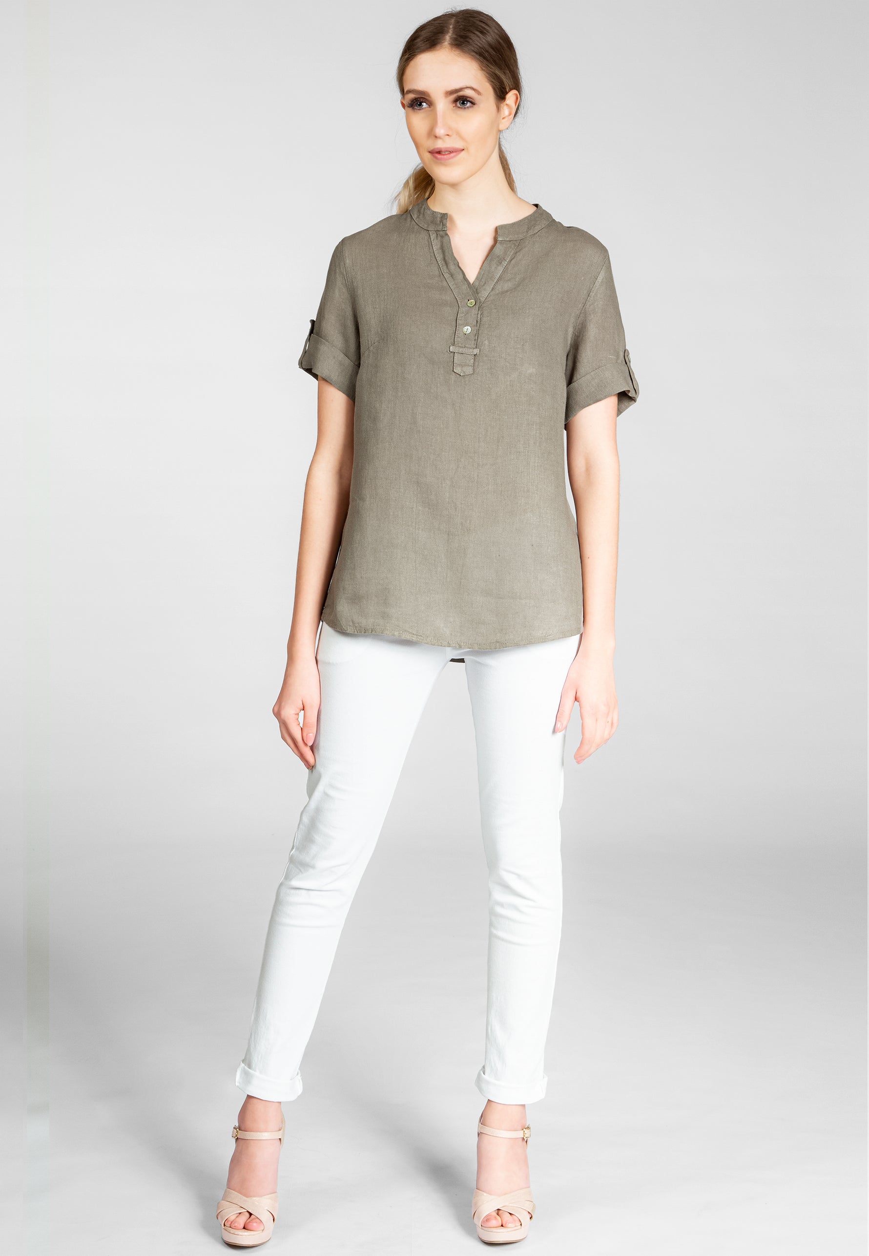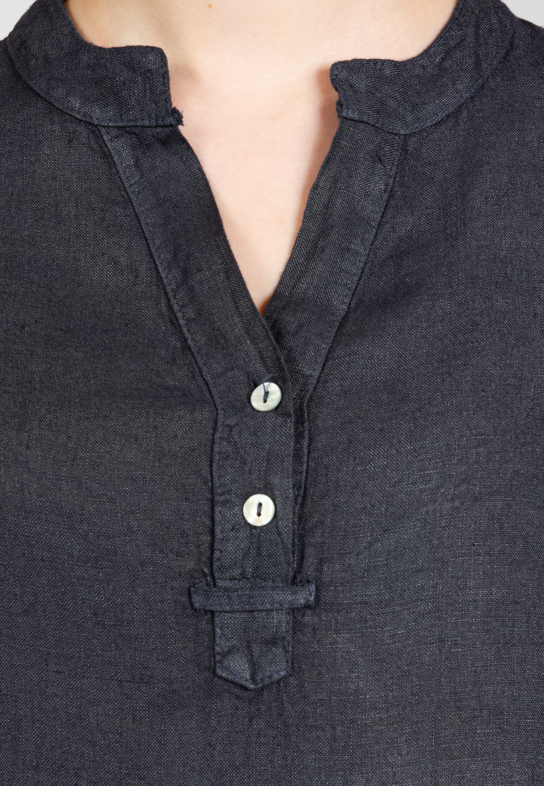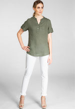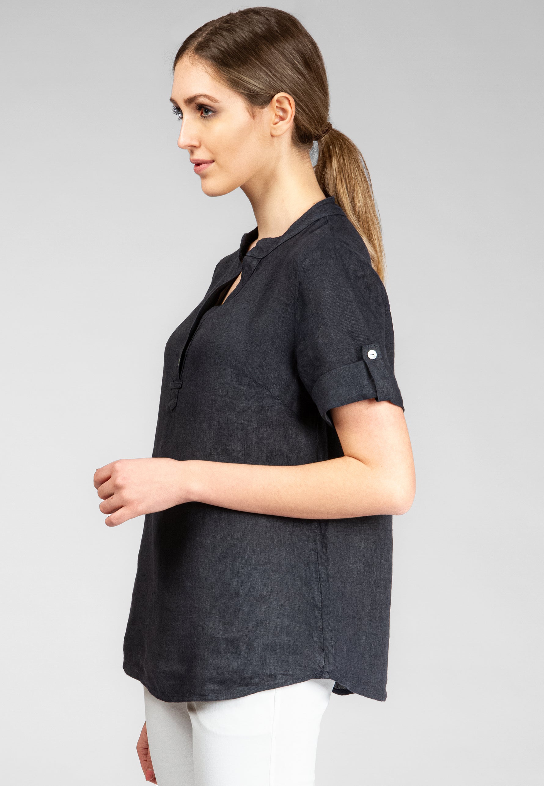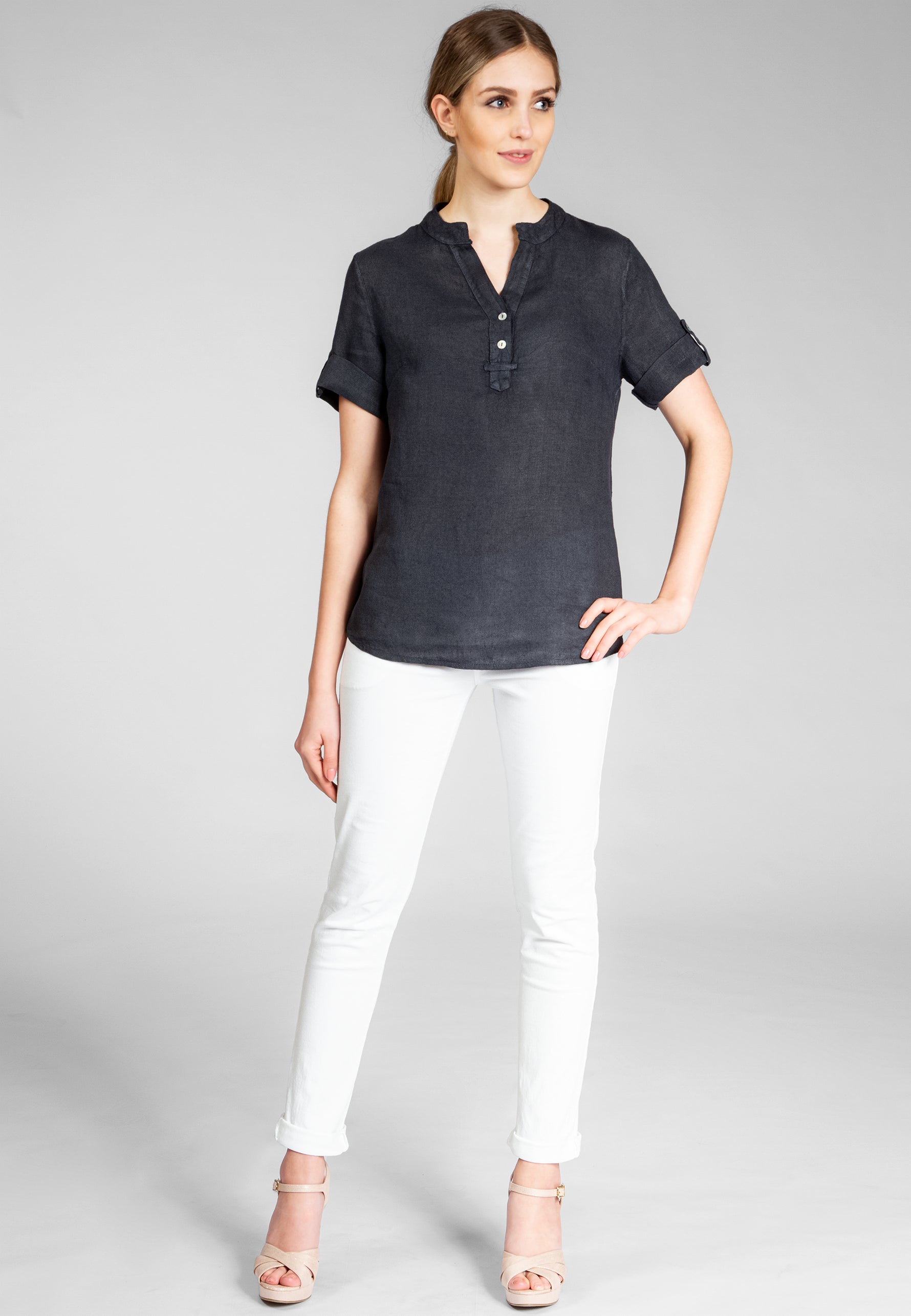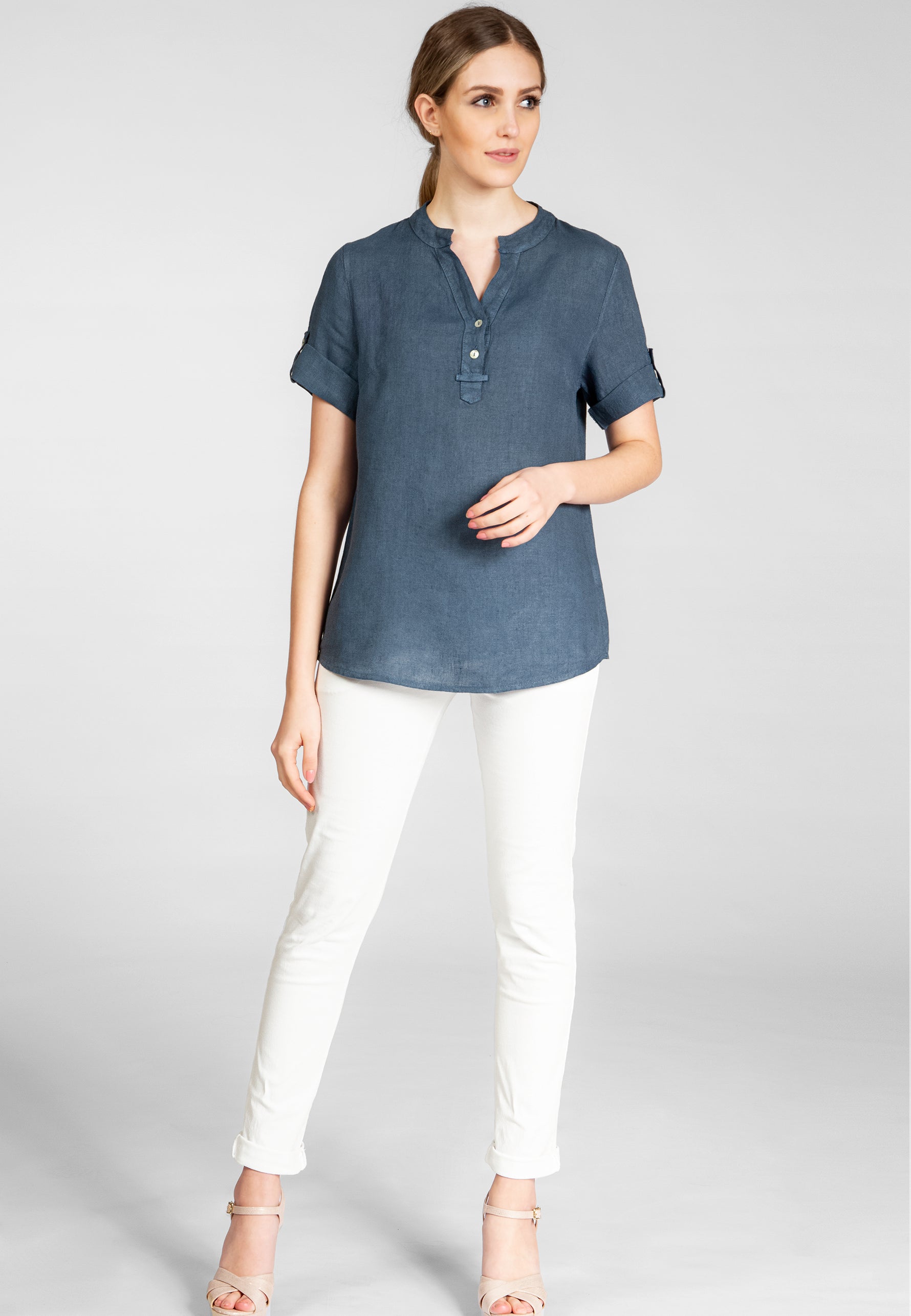 Super angenehm zu tragende, sportlich elegante Shirtbluse mit stylischem V-Ausschnitt und Perlmutt Knopfleiste. Der gerade Schnitt dieses Leinenshirts ist schlicht und dennoch hochwertig elegant und lässig. Das besondere Etwas bekommt das Teil durch den lässigen V-Ausschnitt und die nach oben gebundenen Ärmel. Sie werden dieses neue Teil lieben... Material: 100% Leinen. Pflegehinweis: Maschinenwäsche bei 30°C. Caspar Fashion - Made in Italy.