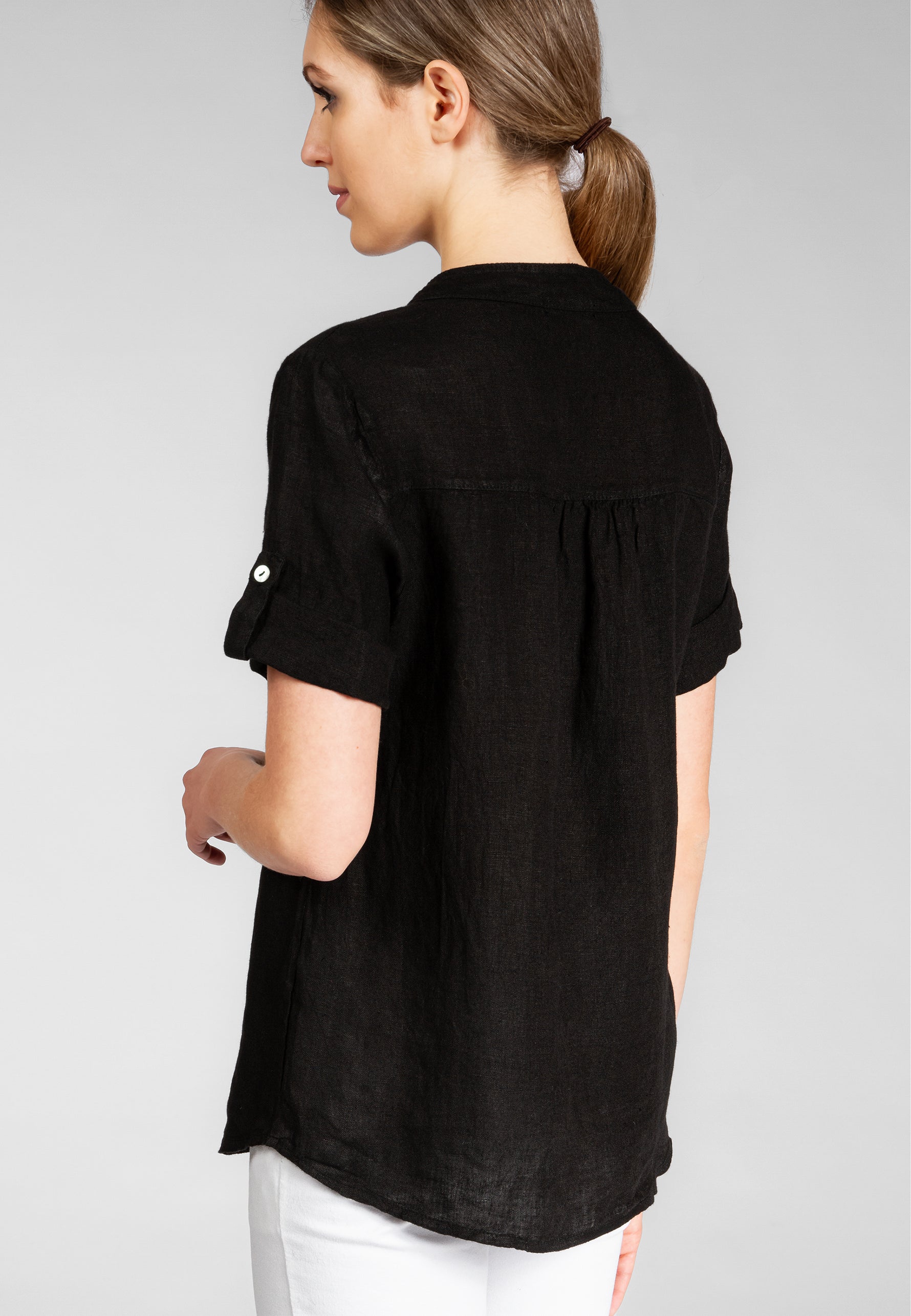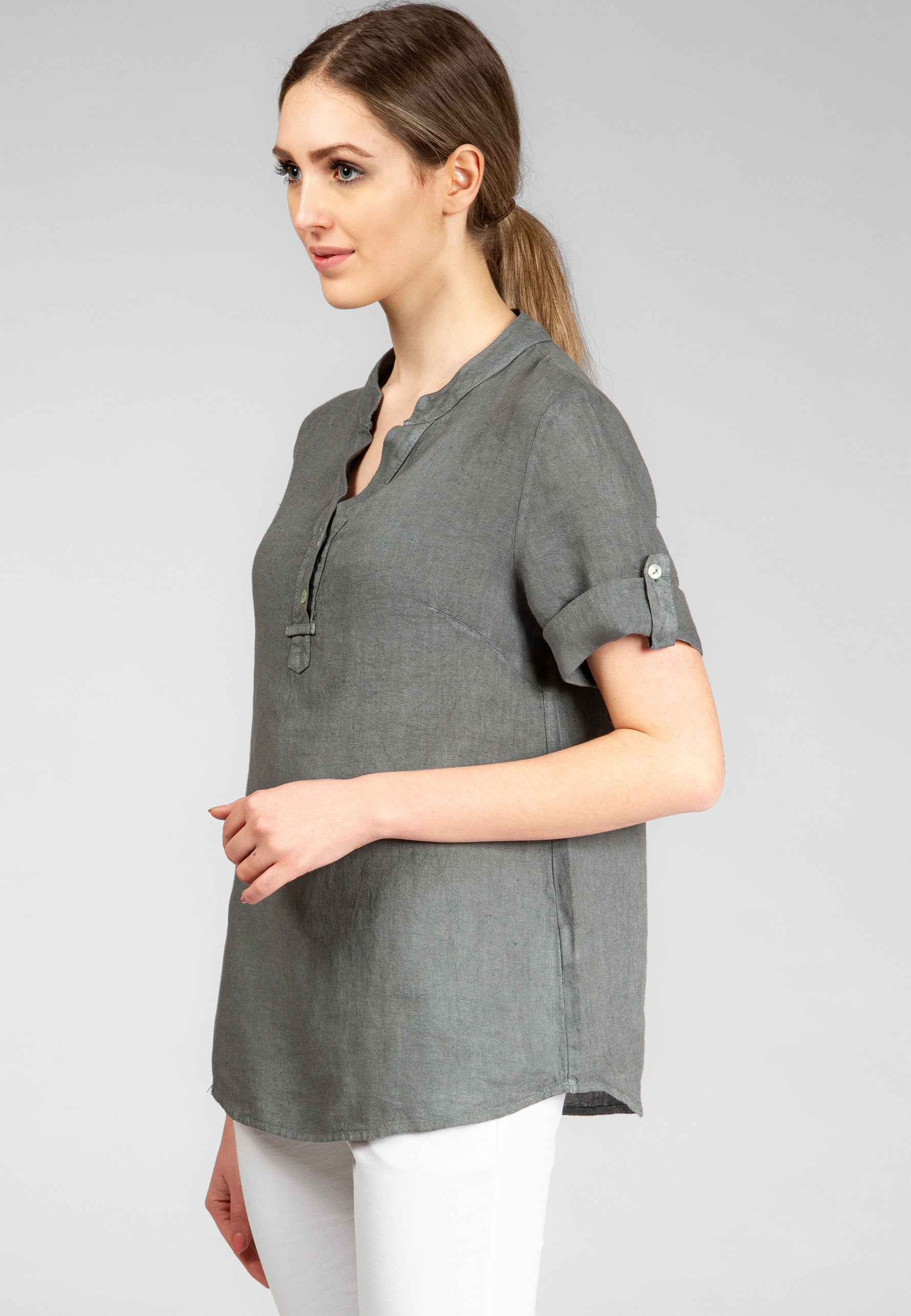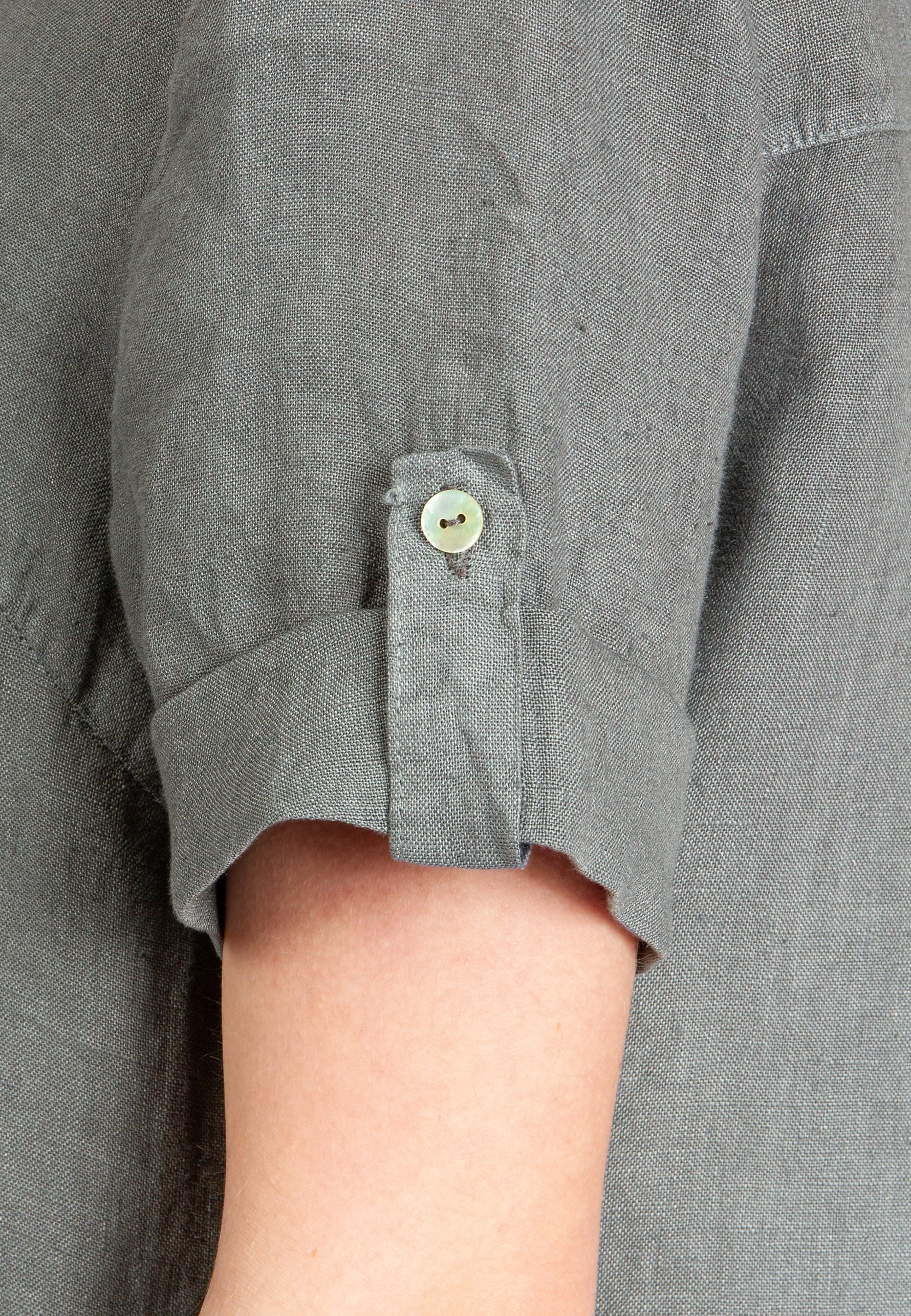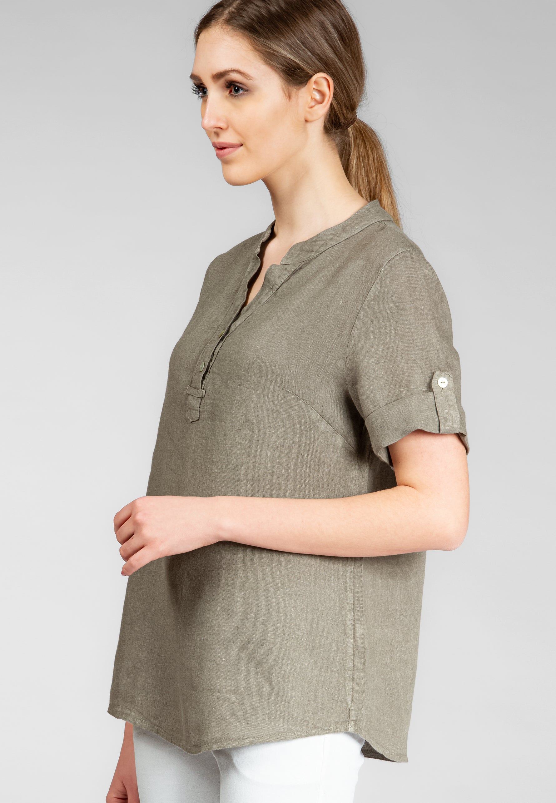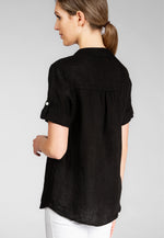 Super angenehm zu tragende, sportlich elegante Shirtbluse mit stylischem V-Ausschnitt und Perlmutt Knopfleiste. Der gerade Schnitt dieses Leinenshirts ist schlicht und dennoch hochwertig elegant und lässig. Das besondere Etwas bekommt das Teil durch den lässigen V-Ausschnitt und die nach oben gebundenen Ärmel. Sie werden dieses neue Teil lieben... Material: 100% Leinen. Pflegehinweis: Maschinenwäsche bei 30°C. Caspar Fashion - Made in Italy.