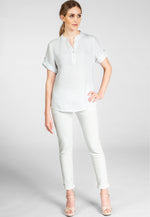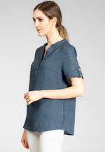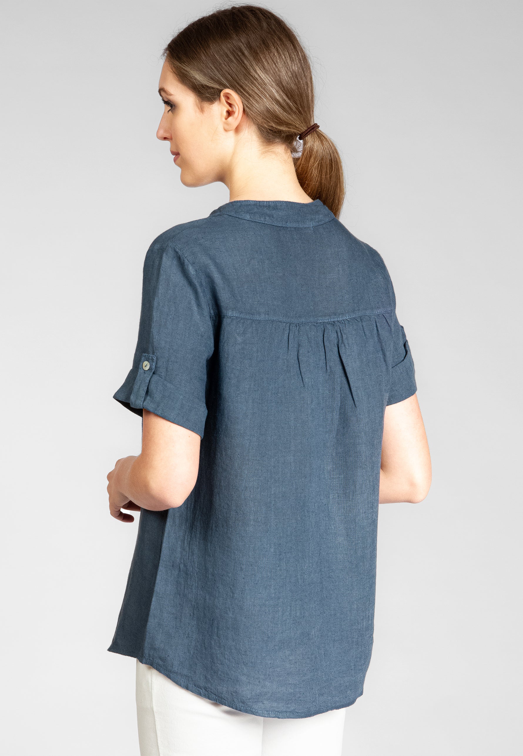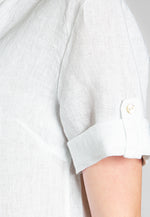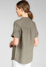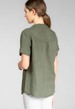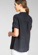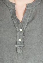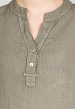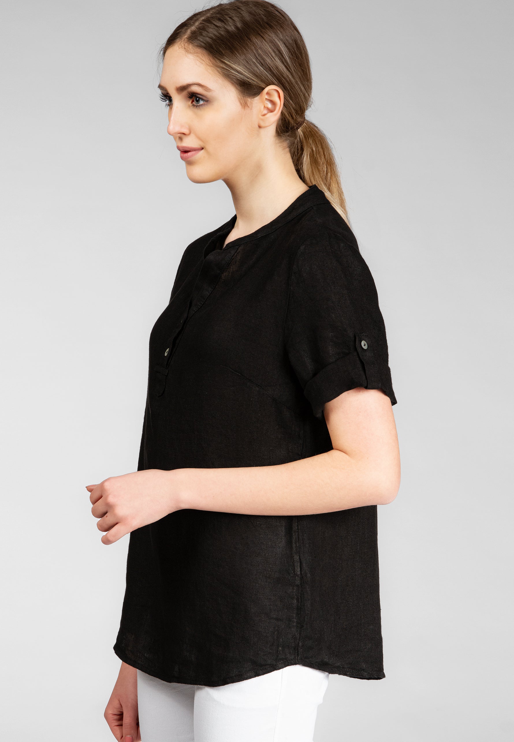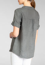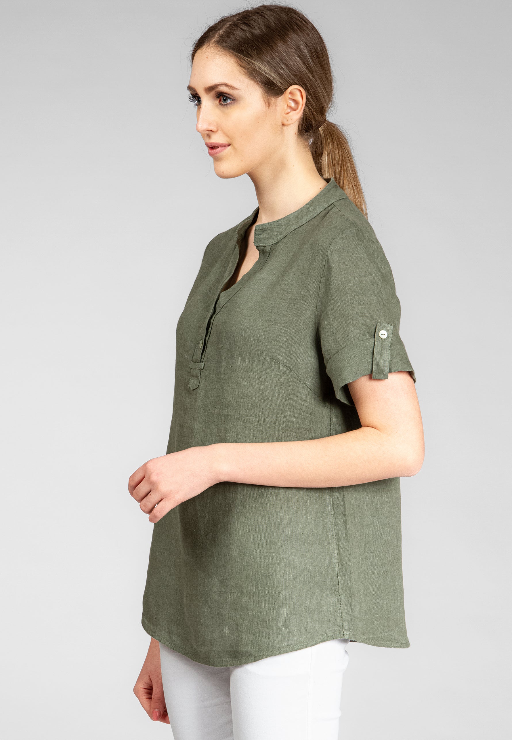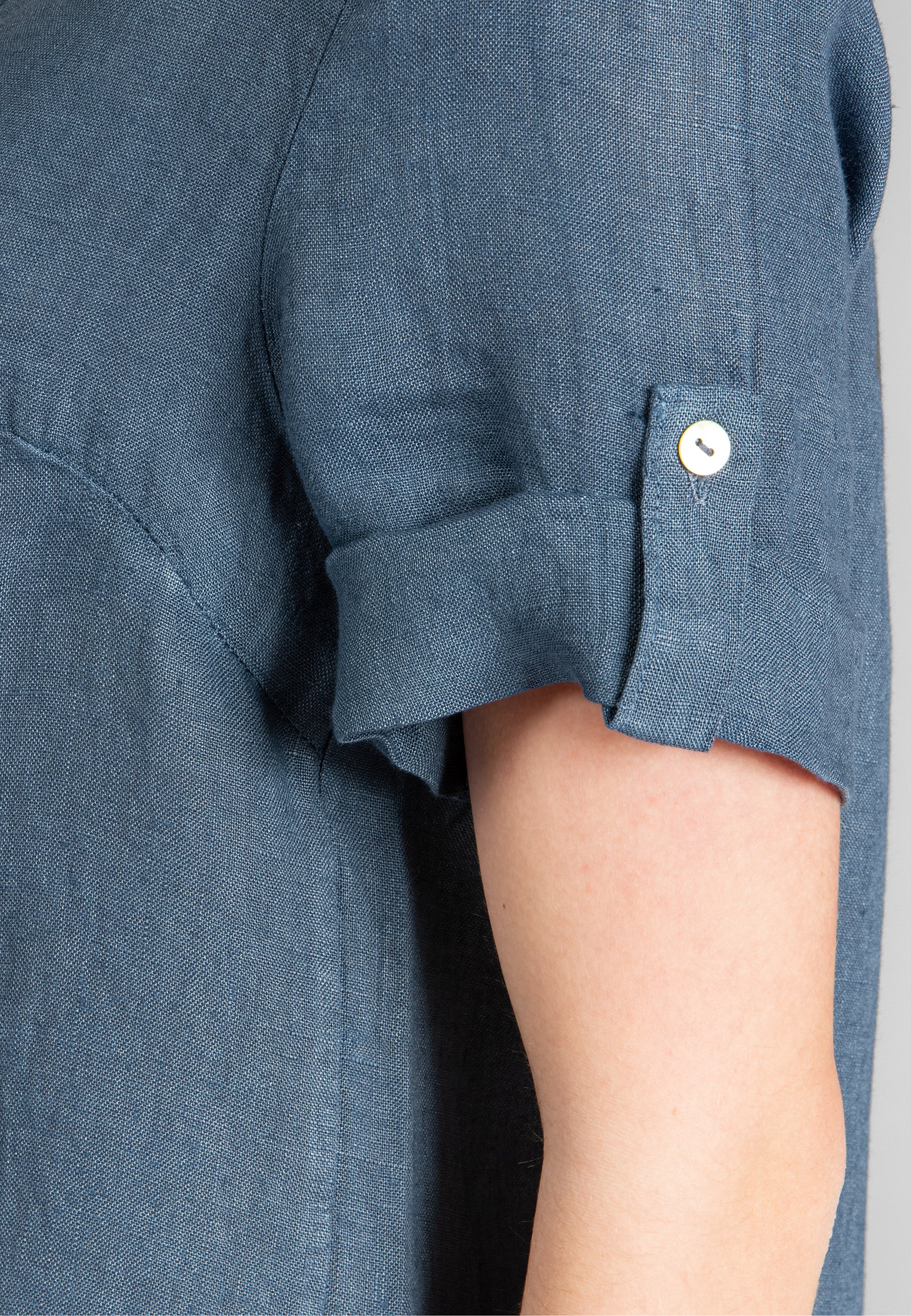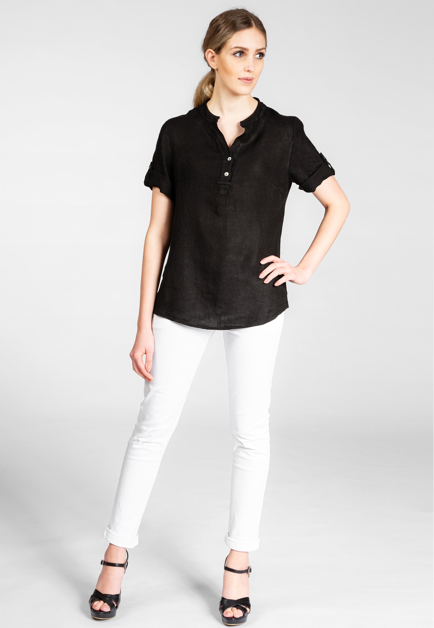 Super angenehm zu tragende, sportlich elegante Shirtbluse mit stylischem V-Ausschnitt und Perlmutt Knopfleiste. Der gerade Schnitt dieses Leinenshirts ist schlicht und dennoch hochwertig elegant und lässig. Das besondere Etwas bekommt das Teil durch den lässigen V-Ausschnitt und die nach oben gebundenen Ärmel. Sie werden dieses neue Teil lieben... Material: 100% Leinen. Pflegehinweis: Maschinenwäsche bei 30°C. Caspar Fashion - Made in Italy.