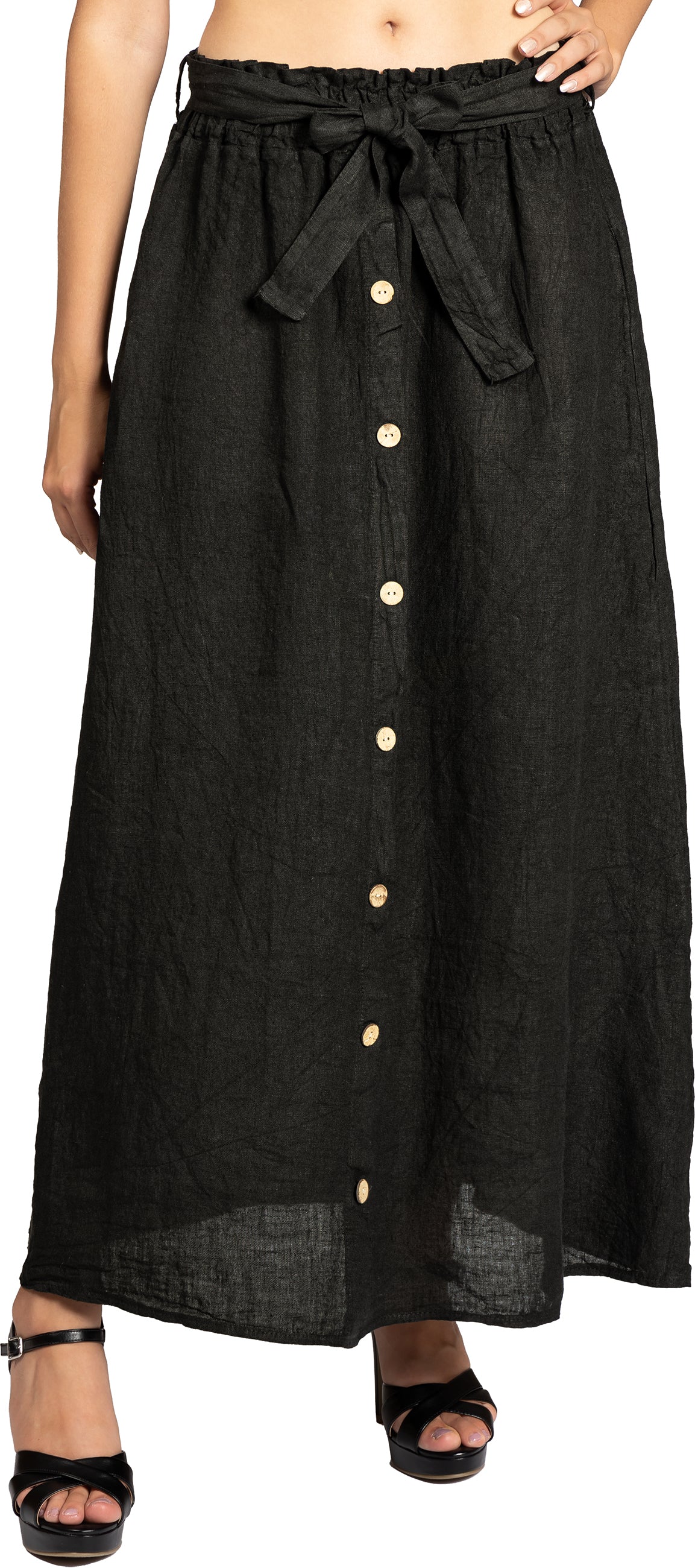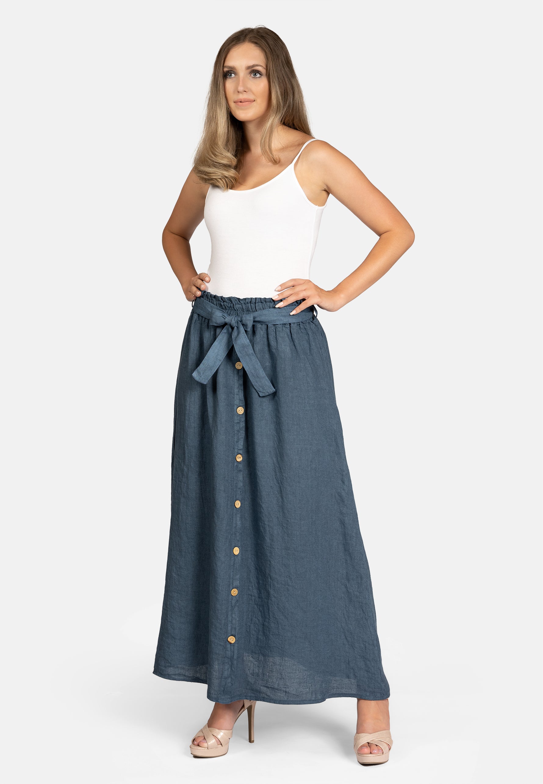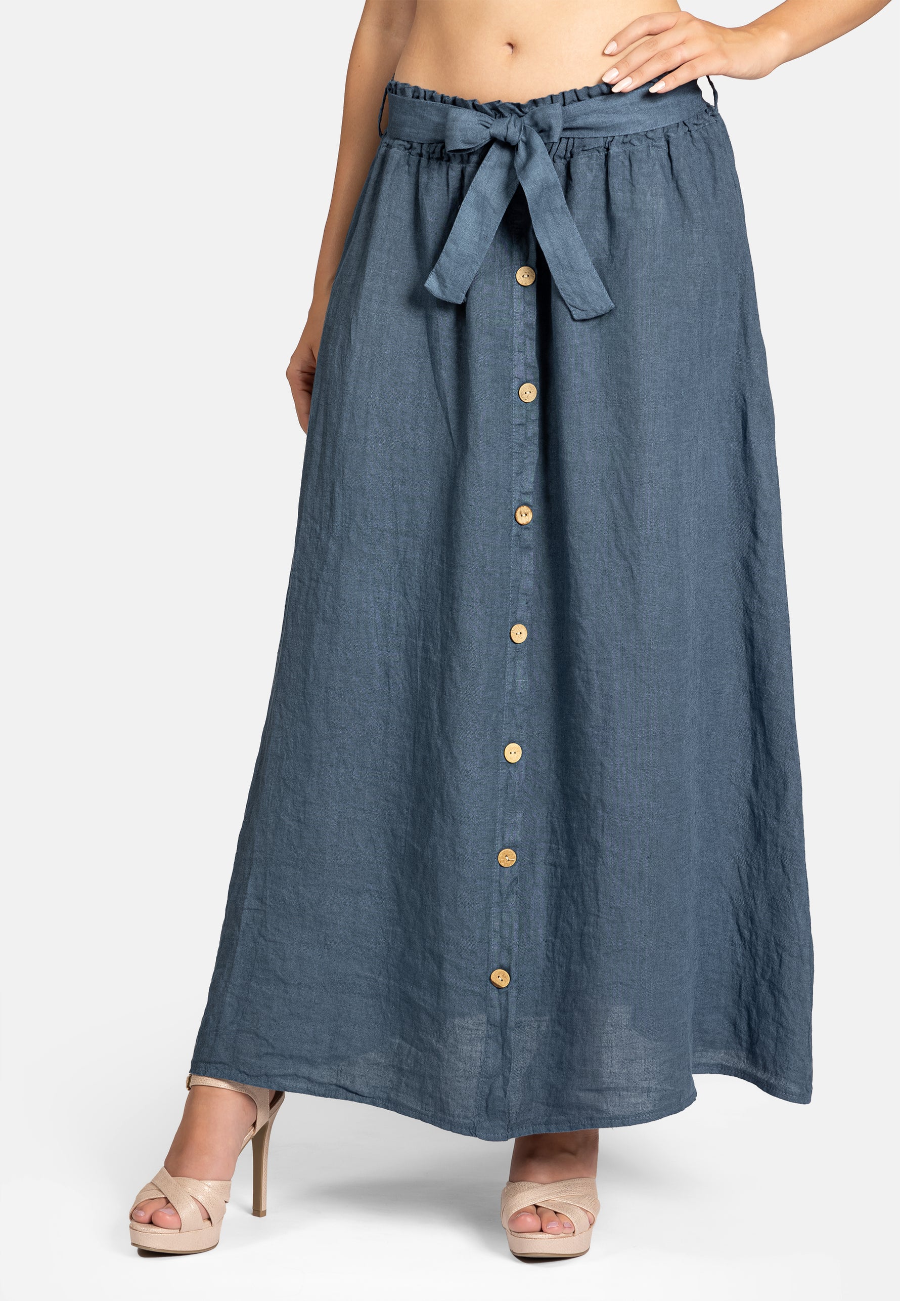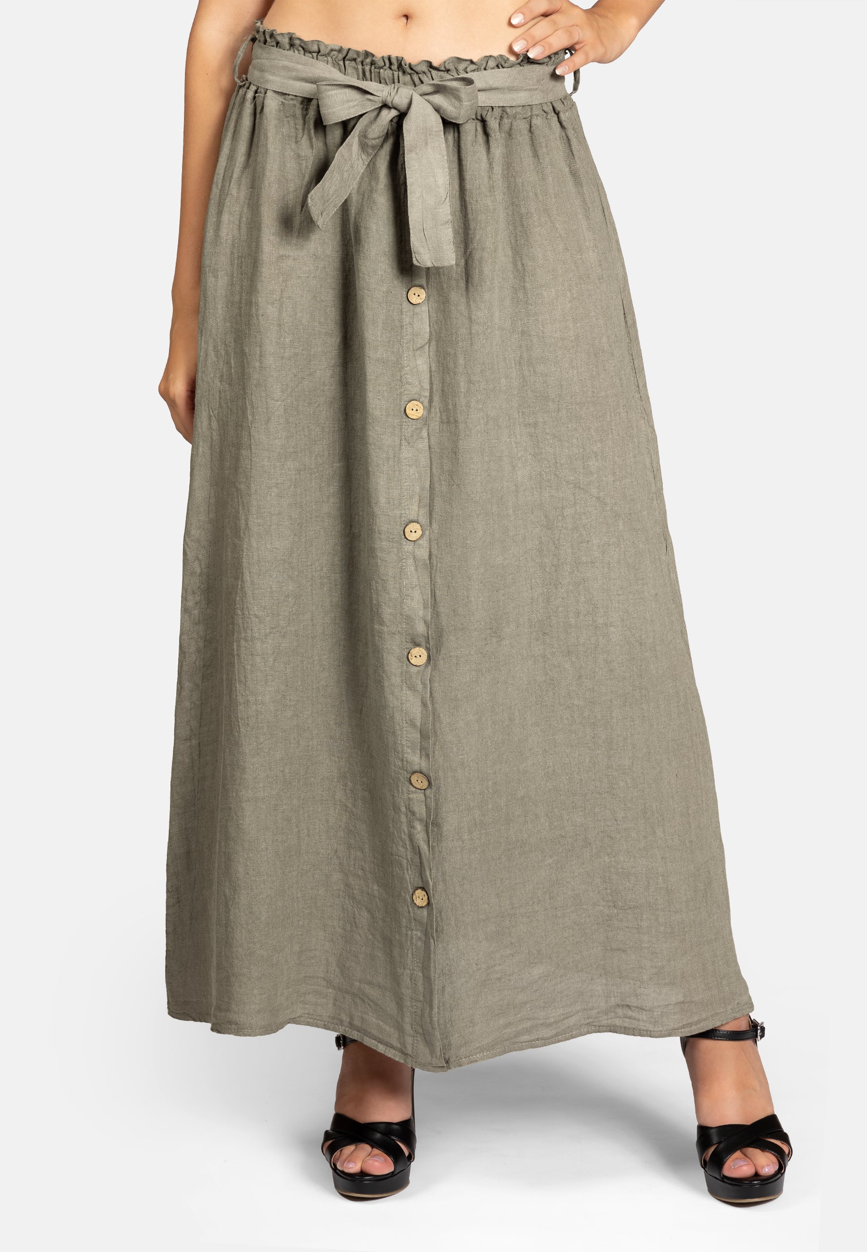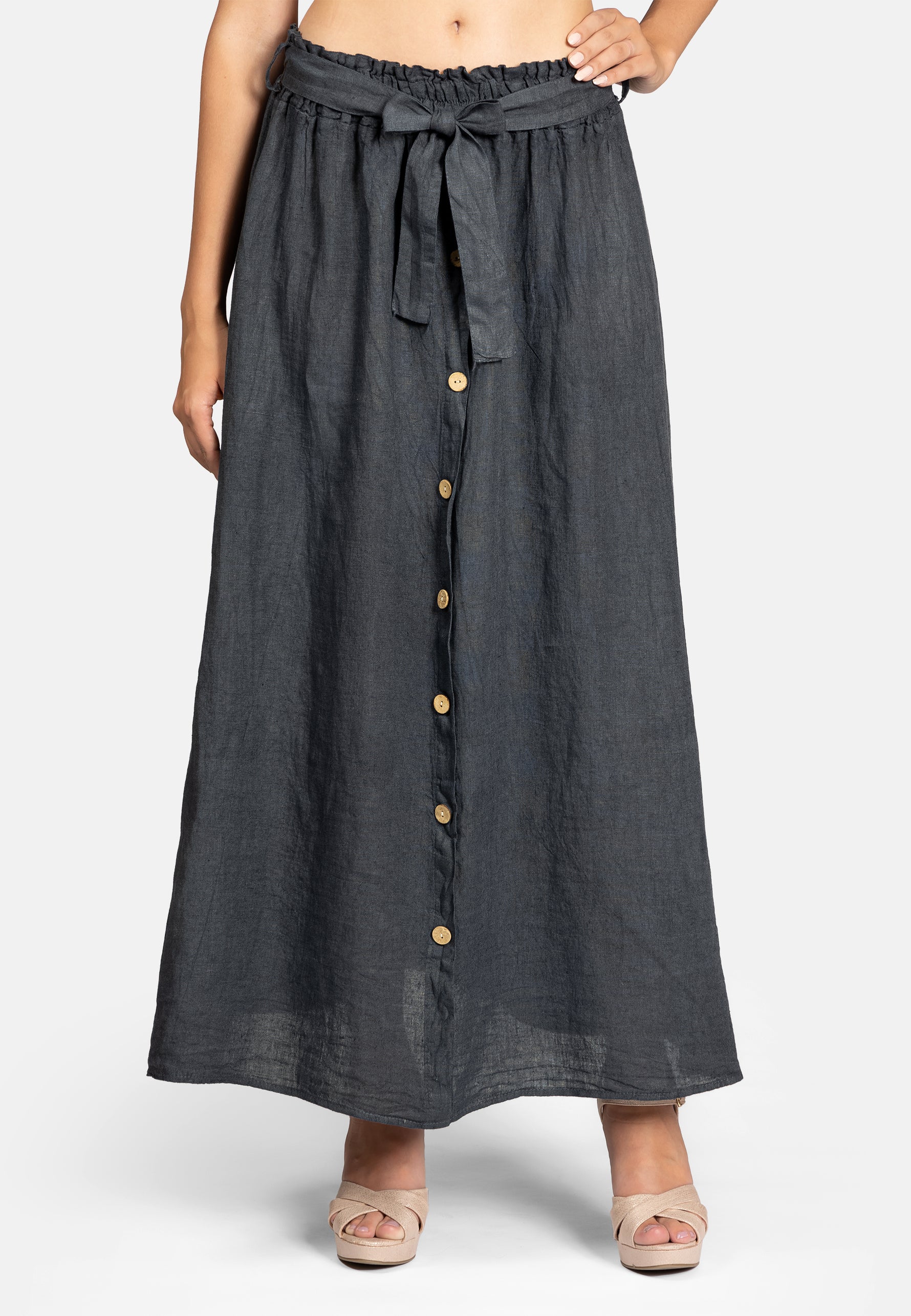 Super leichter, weicher und langer Damen Sommerrock aus italienischem Leinen mit stylischer Knopfleiste und gerafftem Bund. Der aus sommerlich luftigem und sehr angenehm zu tragenden Stoff hergestellte Maxirock ist der ideale Begleiter durch den Sommer. Das Besondere an diesem Rock ist seine schlichte und einfache Form in Kombination mit dem dezent gerafften Bund und dem sportlich eleganten Holzknöpfe Dekor auf der Vorderseite. Der Rock lässt sich daher perfekt kombinieren. Ein ca. 6 cm hoher, leicht geraffter Stretch Bund mit Gummizug passt sich ideal Ihrer Figur an und kaschiert geschickt kleine Problemzonen. Zusätzlich kann der Rock mit dem Bindeband fest gebunden werden. Die Knopfleiste ist nur Dekor und kann nicht geöffnet bzw. geschlossen werden. Material: 100% Leinen. Pflegehinweis: Maschinenwäsche bei 30 Grad - nicht Trocknergeeignet. Caspar - Made in Italy.