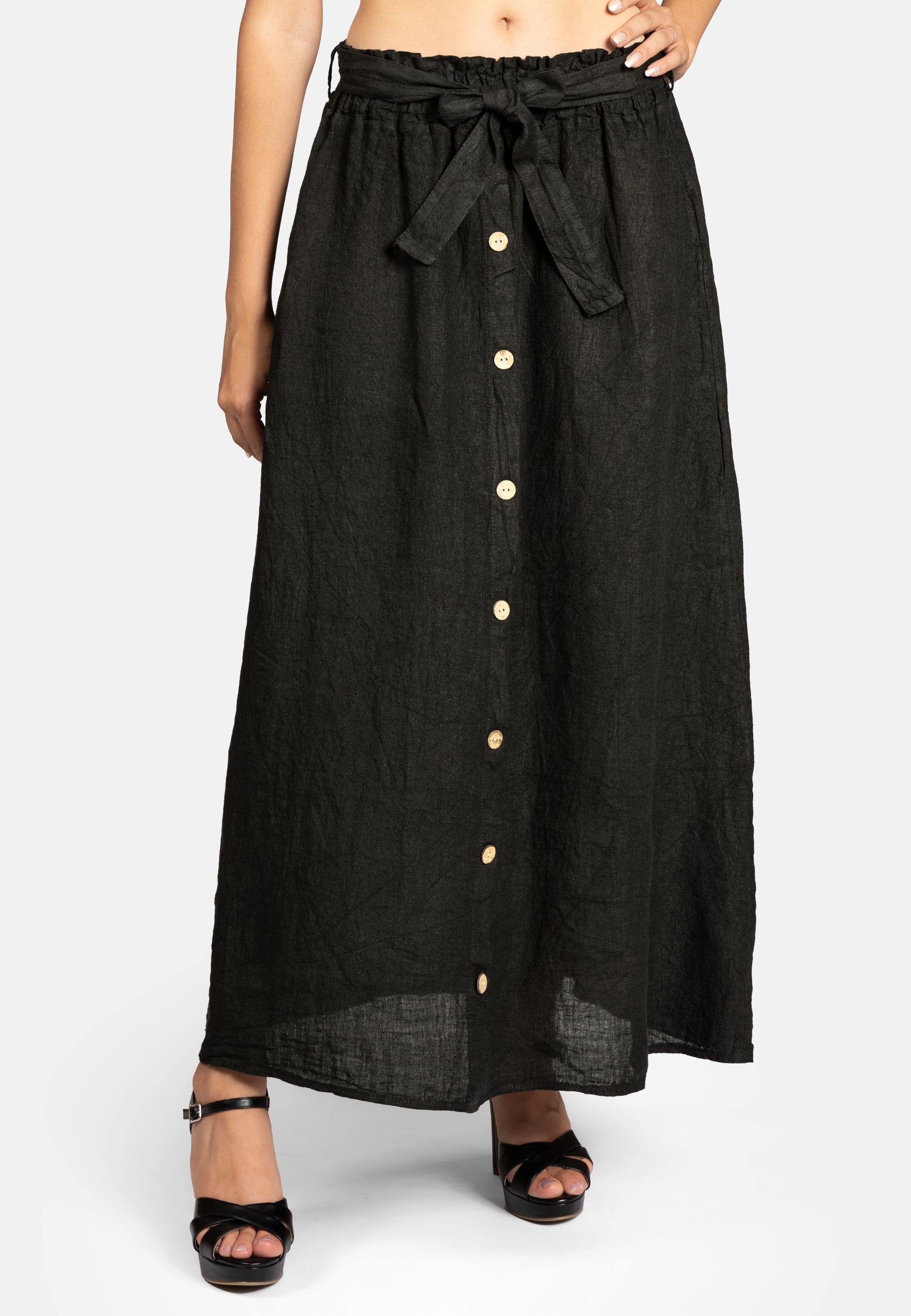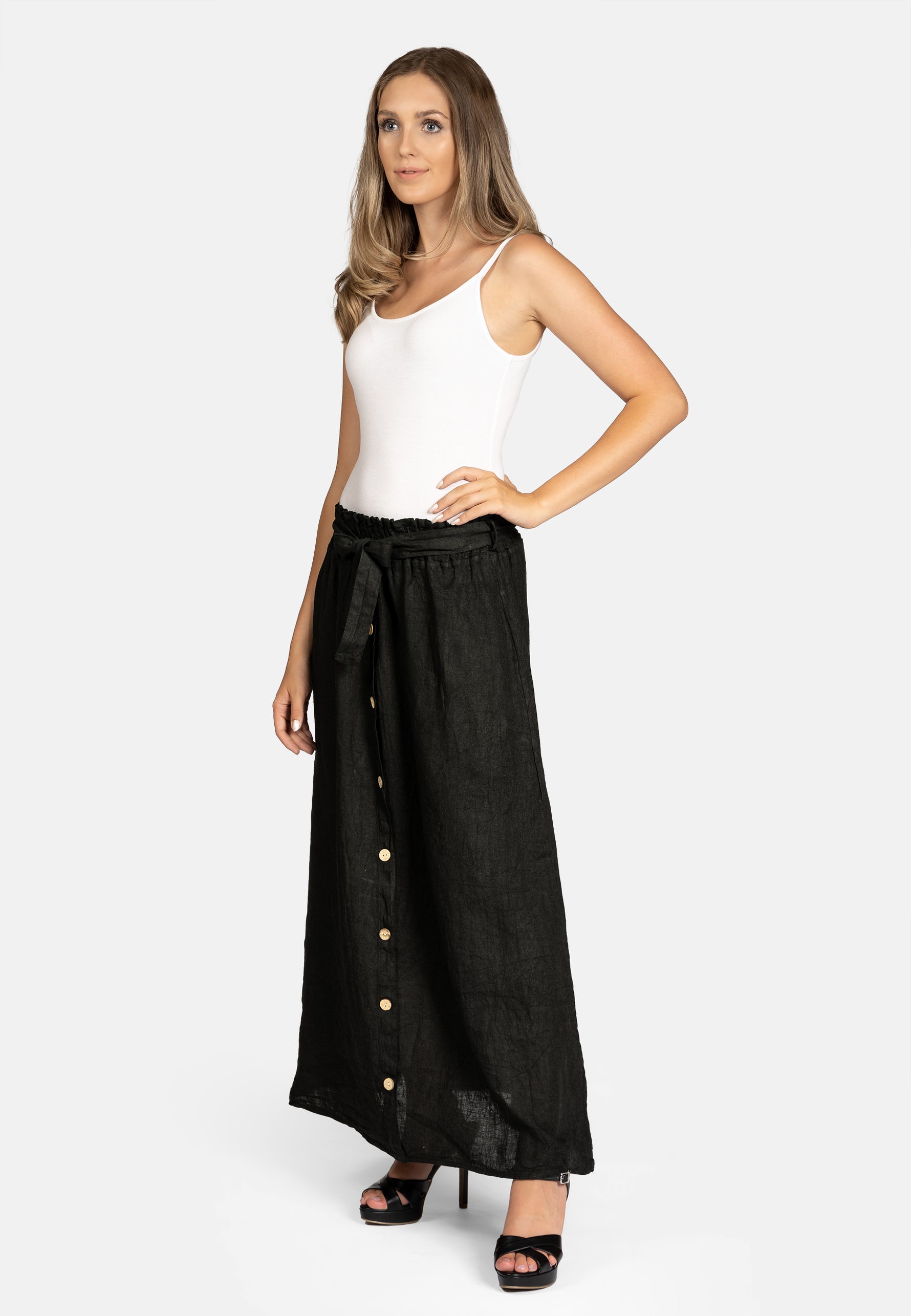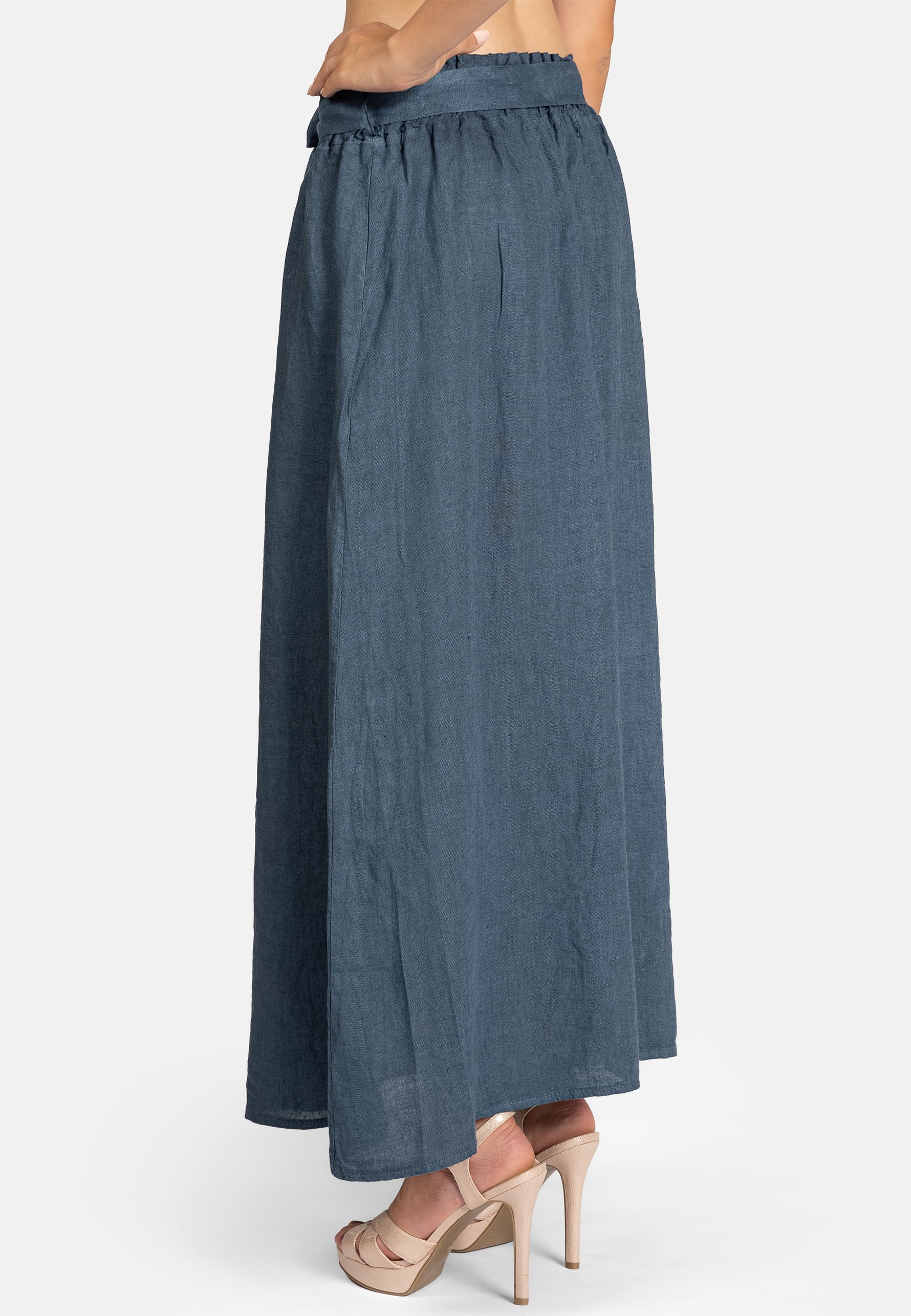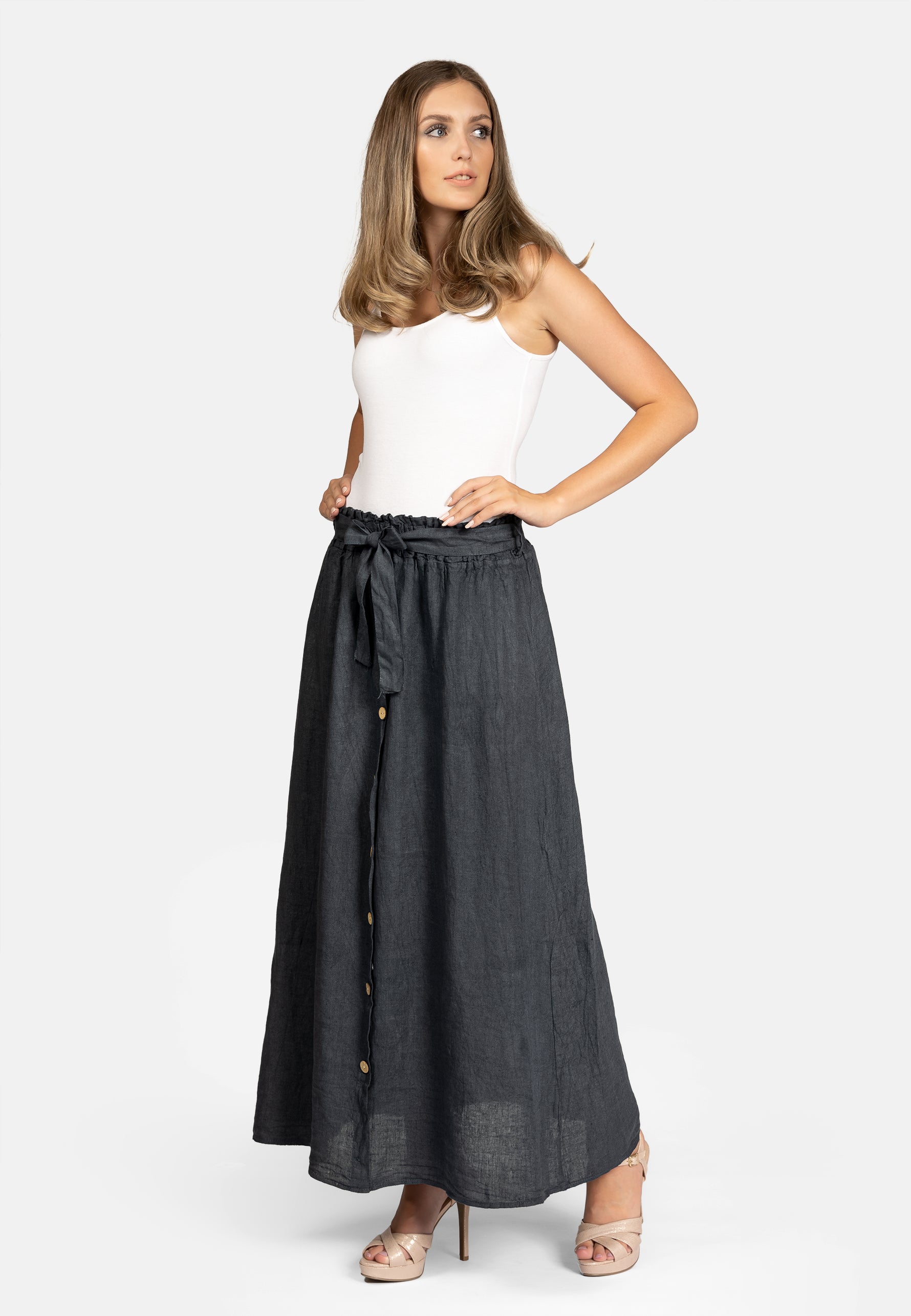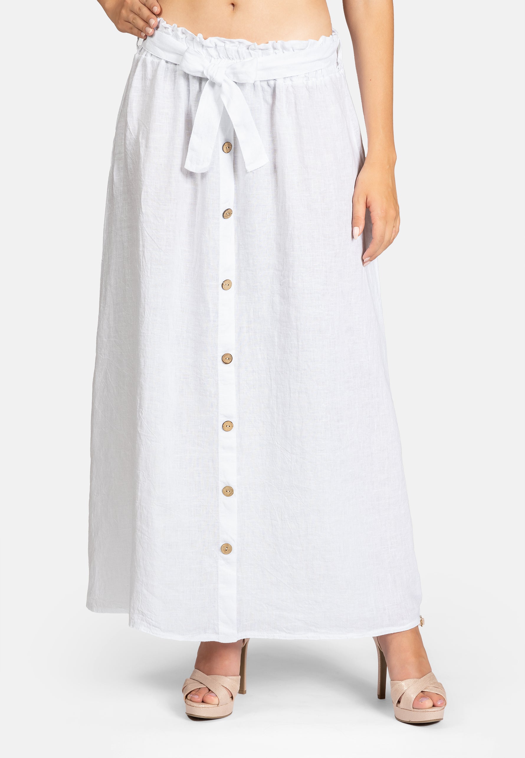 Super leichter, weicher und langer Damen Sommerrock aus italienischem Leinen mit stylischer Knopfleiste und gerafftem Bund. Der aus sommerlich luftigem und sehr angenehm zu tragenden Stoff hergestellte Maxirock ist der ideale Begleiter durch den Sommer. Das Besondere an diesem Rock ist seine schlichte und einfache Form in Kombination mit dem dezent gerafften Bund und dem sportlich eleganten Holzknöpfe Dekor auf der Vorderseite. Der Rock lässt sich daher perfekt kombinieren. Ein ca. 6 cm hoher, leicht geraffter Stretch Bund mit Gummizug passt sich ideal Ihrer Figur an und kaschiert geschickt kleine Problemzonen. Zusätzlich kann der Rock mit dem Bindeband fest gebunden werden. Die Knopfleiste ist nur Dekor und kann nicht geöffnet bzw. geschlossen werden. Material: 100% Leinen. Pflegehinweis: Maschinenwäsche bei 30 Grad - nicht Trocknergeeignet. Caspar - Made in Italy.