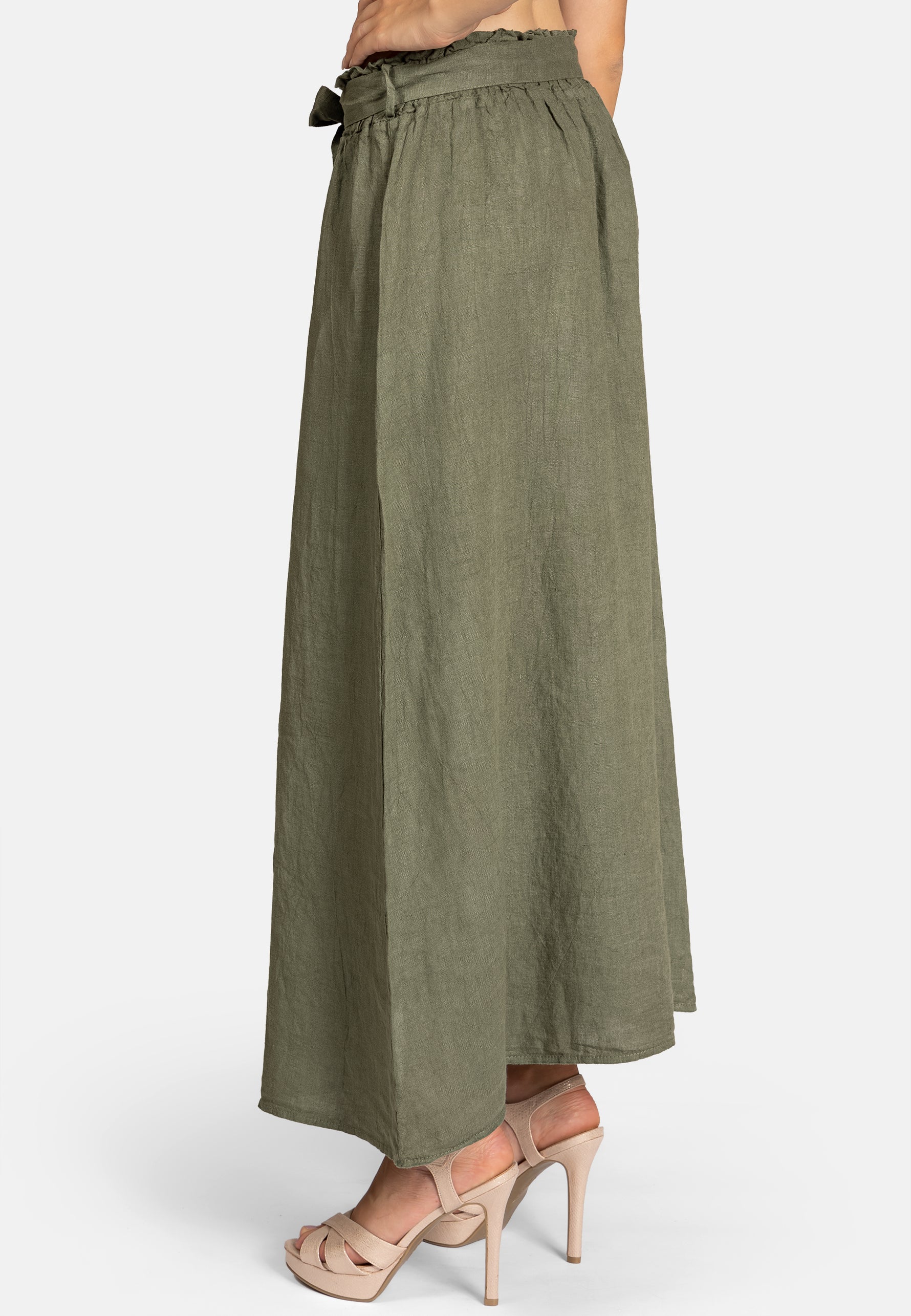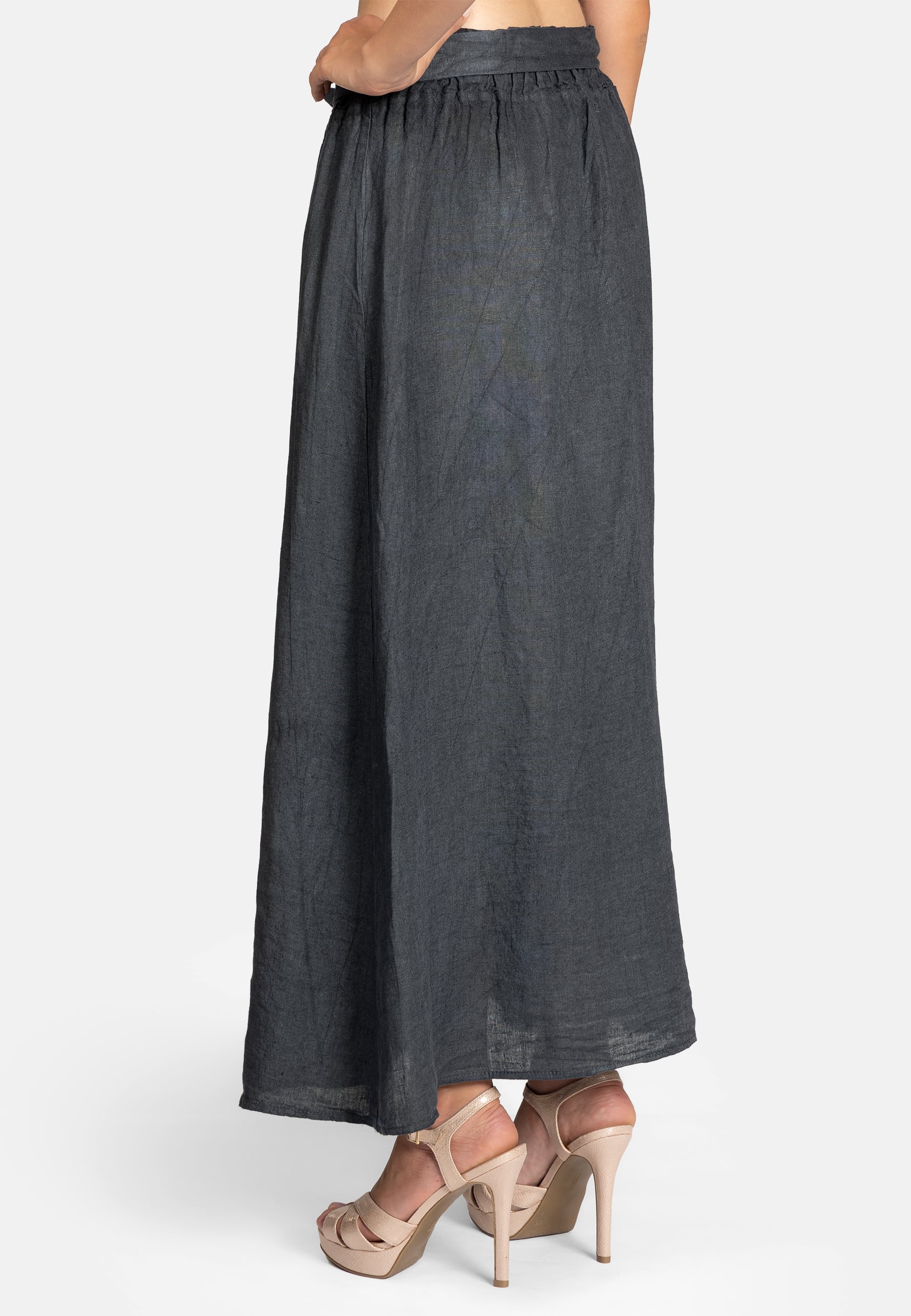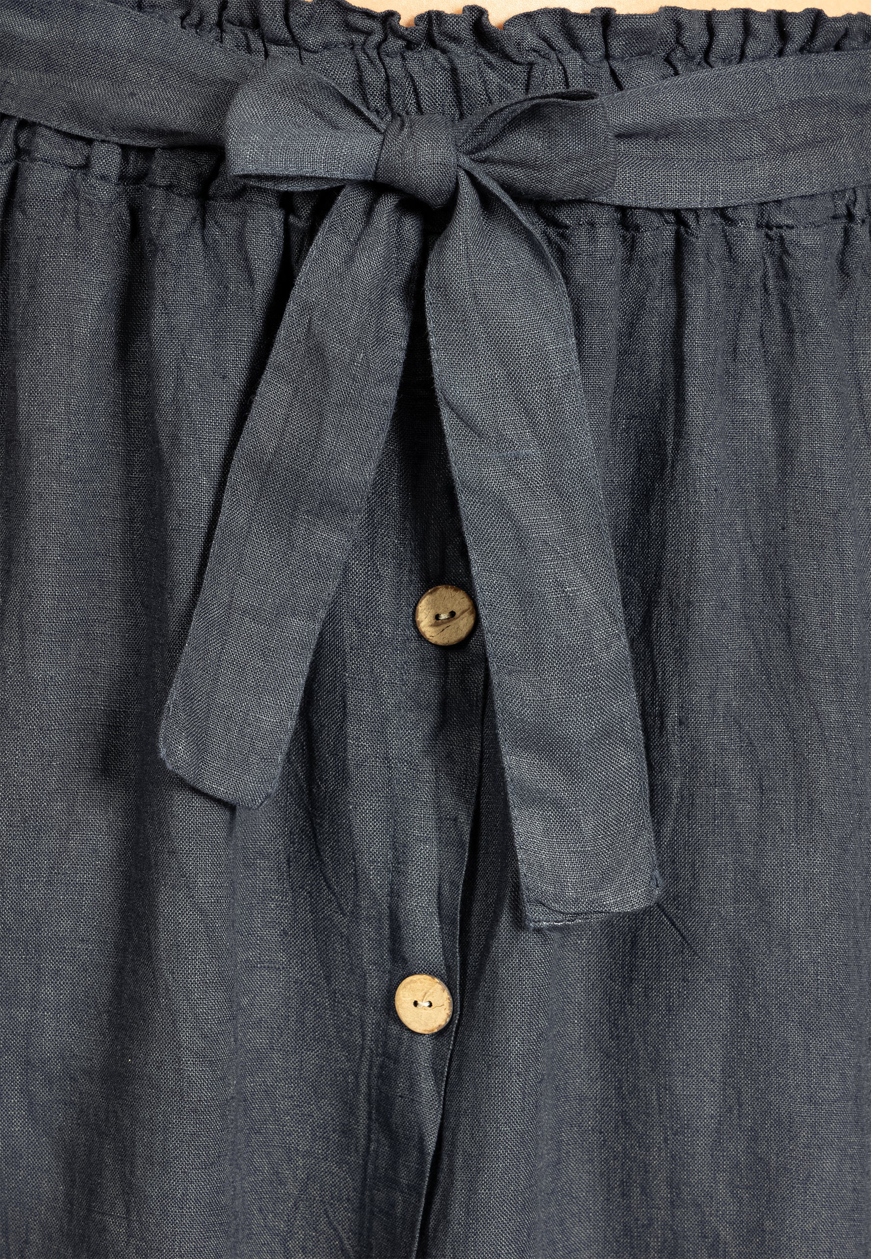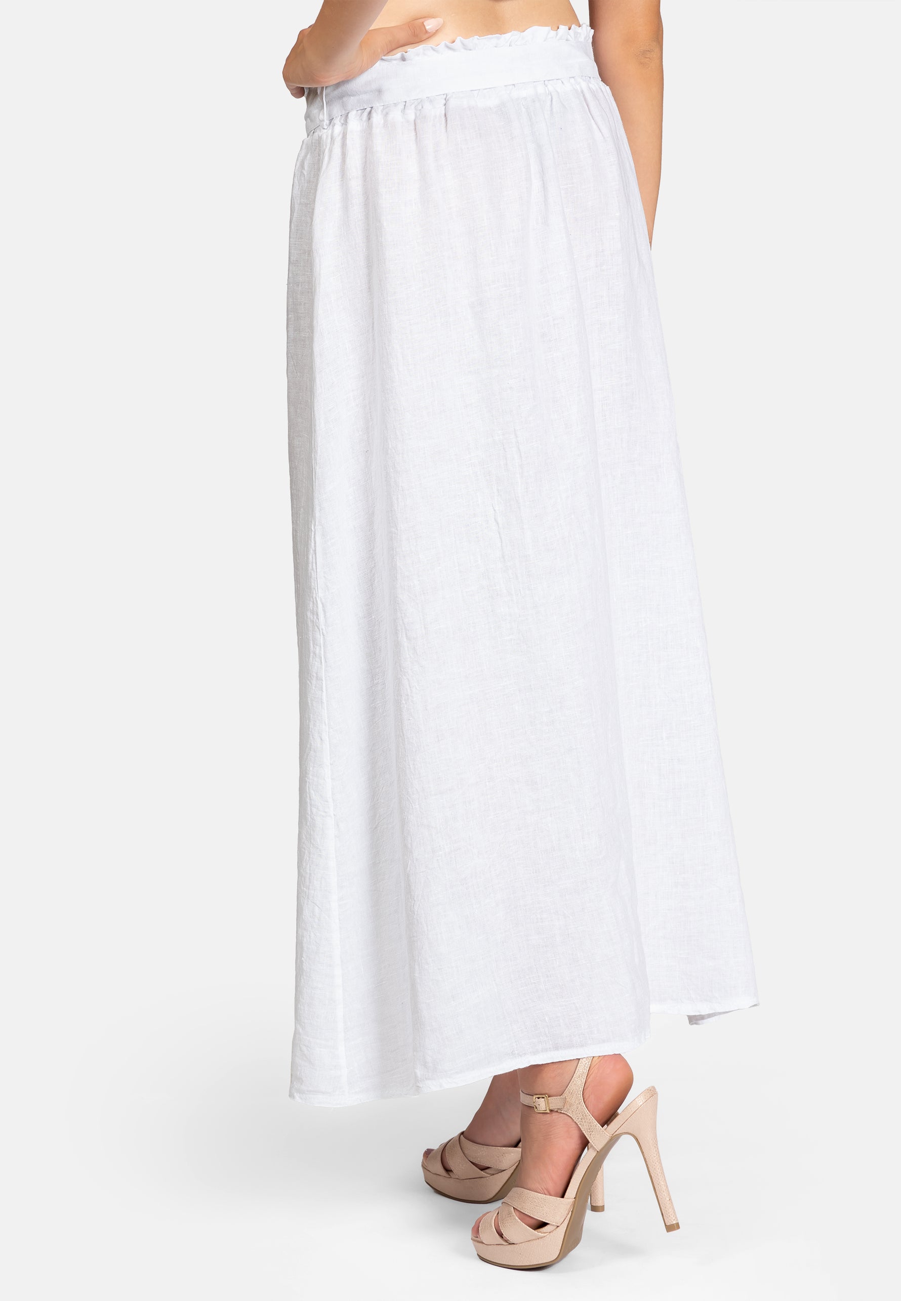 Super leichter, weicher und langer Damen Sommerrock aus italienischem Leinen mit stylischer Knopfleiste und gerafftem Bund. Der aus sommerlich luftigem und sehr angenehm zu tragenden Stoff hergestellte Maxirock ist der ideale Begleiter durch den Sommer. Das Besondere an diesem Rock ist seine schlichte und einfache Form in Kombination mit dem dezent gerafften Bund und dem sportlich eleganten Holzknöpfe Dekor auf der Vorderseite. Der Rock lässt sich daher perfekt kombinieren. Ein ca. 6 cm hoher, leicht geraffter Stretch Bund mit Gummizug passt sich ideal Ihrer Figur an und kaschiert geschickt kleine Problemzonen. Zusätzlich kann der Rock mit dem Bindeband fest gebunden werden. Die Knopfleiste ist nur Dekor und kann nicht geöffnet bzw. geschlossen werden. Material: 100% Leinen. Pflegehinweis: Maschinenwäsche bei 30 Grad - nicht Trocknergeeignet. Caspar - Made in Italy.