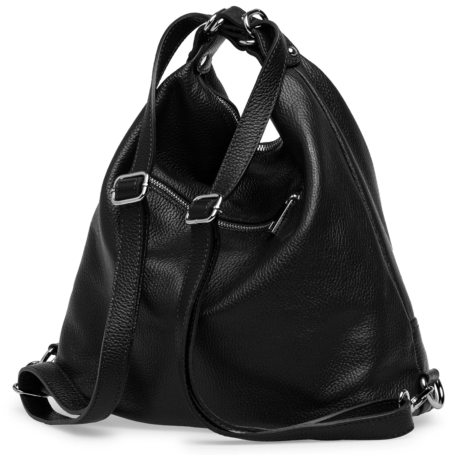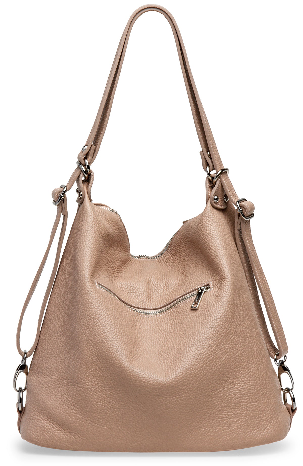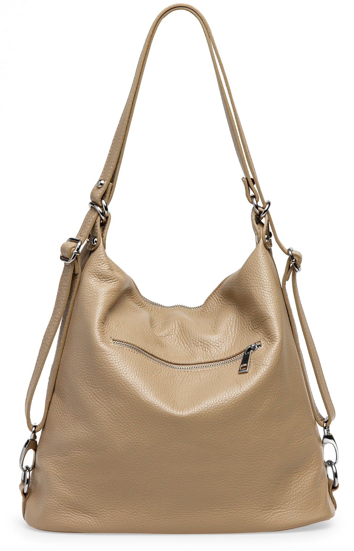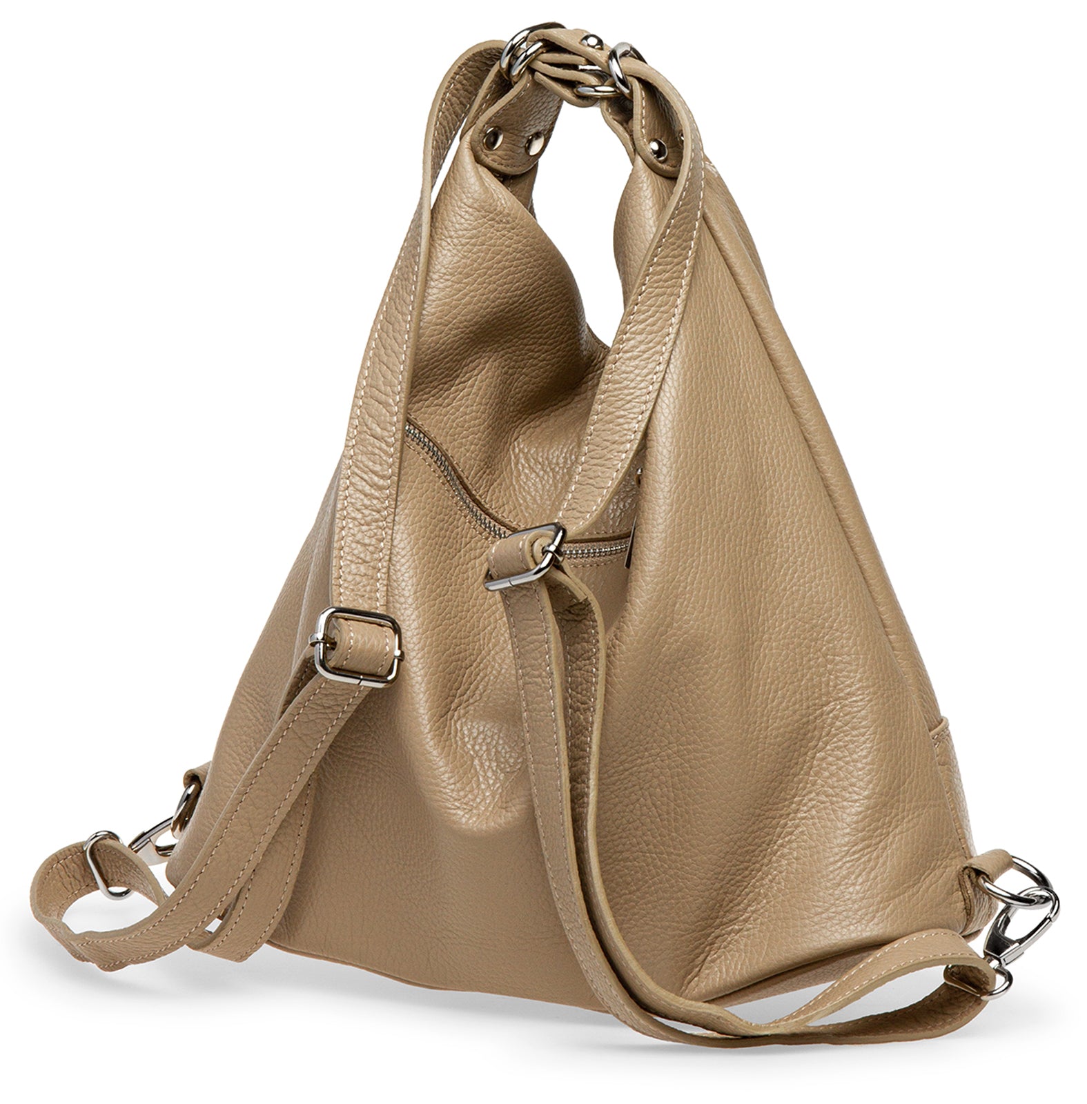 Mittelgroße Damen 2 in 1 Rucksack Schultertasche aus robustem italienischem Rindsleder. Elegante und praktische Ledertasche die sich einfach und schnell auch zu einem Rucksack umfunktionieren lässt. Diese Tasche ist dank ihrer Größe ideal geeignet als City Shopper, für die Reise oder einfach nur als flexible Begleiterin für jeden Tag. Die Multifunktionstasche wird in einer kleinen italienischen Ledermanufaktur von Hand gefertigt. Sie besteht aus robustem, genarbtem Rindsleder. Die Rucksack Tasche besitzt ein großes Hauptfach das mit einem oben angebrachten Reißverschluss sicher verschlossen werden kann, sowie im Innern ein kleines Sicherheitsfach sowie ein Seitenfach für das Smartphone. Außen auf der Rückseite ist zusätzlich ein verschließbares Sicherheitsfach angebracht. Maße: L x B x H ca. 34 x 15 x 31 cm (ohne Gurte). Material: Rindsleder. Caspar - Made in Italy.