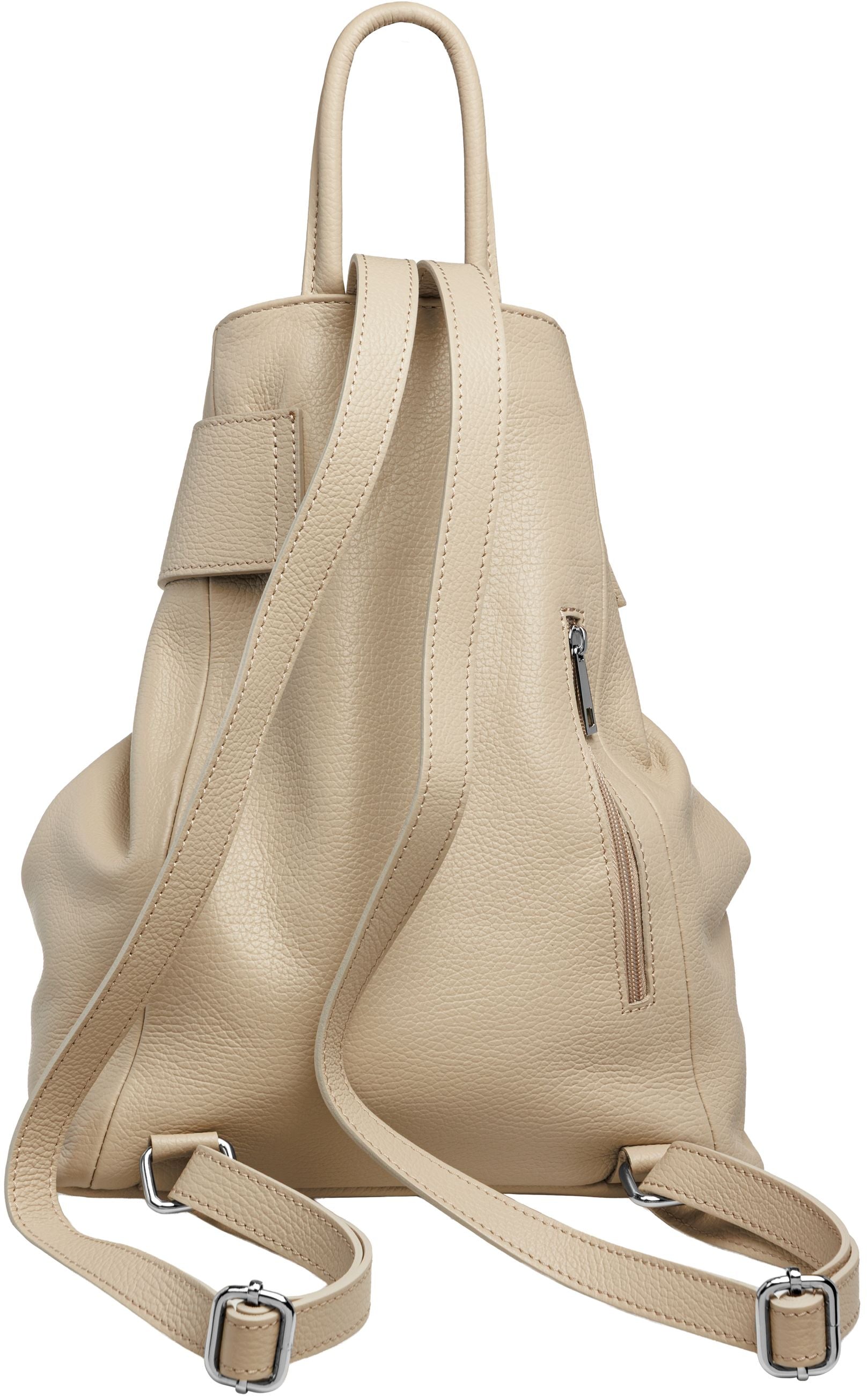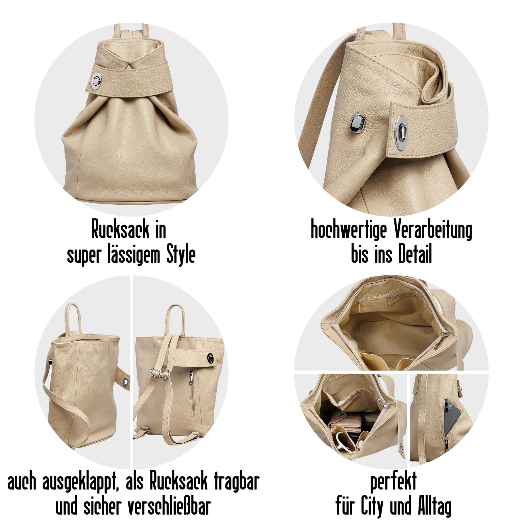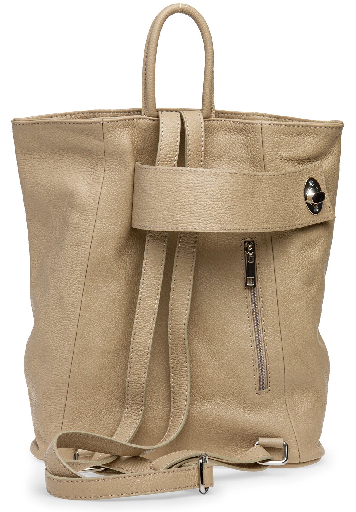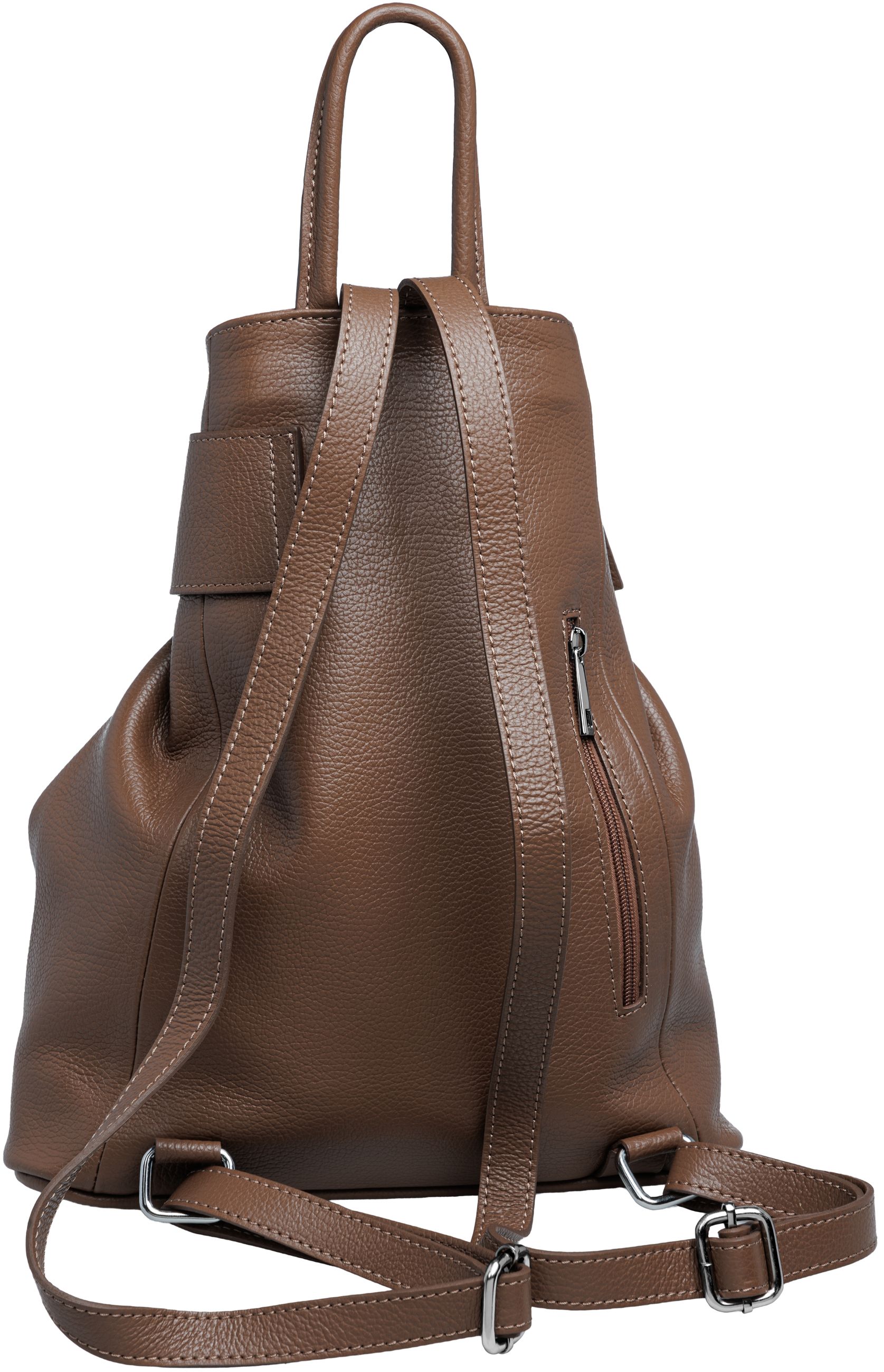 Formschöner, sportlich eleganter Damen Rucksack aus robustem italienischem Rindsleder. Form und Funktion bilden bei diesem hochwertigen Lederrucksack eine ideale Symbiose. Das besondere Design mit der breiten Lederschnalle macht den Daypack zu etwas ganz Besonderem. Der zusätzliche Reißverschluss des geräumigen Hauptfaches sorgt für die nötige Sicherheit. Außen befindet sich ein praktisches Reißverschlussfach für Dinge die man schnell und öfter braucht. Das Hauptfach besitzt im Innern 3 Seitenfächer, eines davon ebenfalls mit Reißverschluss schließbar. Die Schultergurte sind längenverstellbar und lassen sich somit optimal an Ihre Bedürfnisse anpassen. Insgesamt eine sehr gut durchdachte, außergewöhnliche Tasche an der kein Teil zu viel und kein Teil zu wenig dran ist. Das Obermaterial besteht aus regen- und kratzunempfindlichem, leicht genarbtem Rindsleder. Maße der Großen Größe: BxHxT ca. 29x35x13 cm. Material: Rindsleder. Caspar Fashion - Made in Italy.