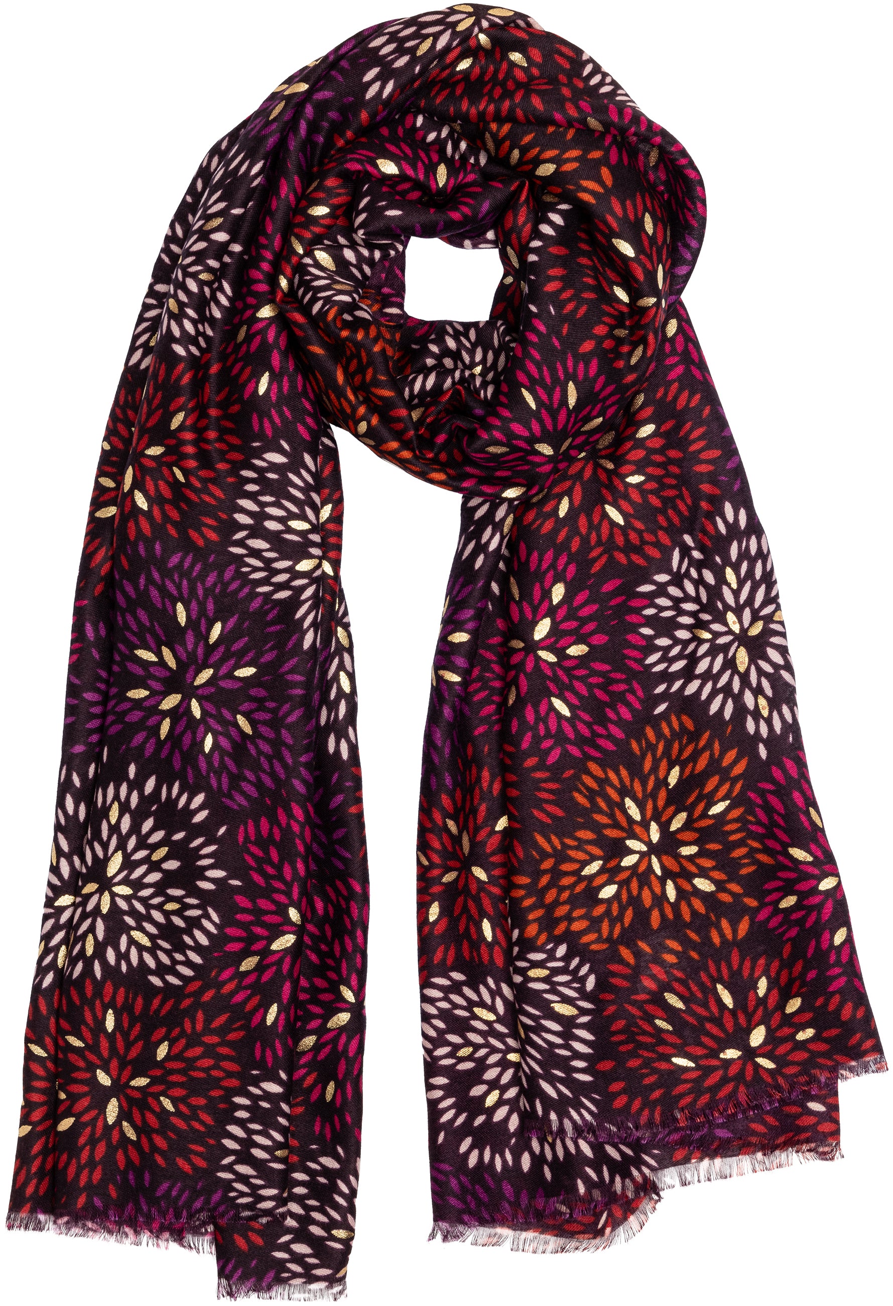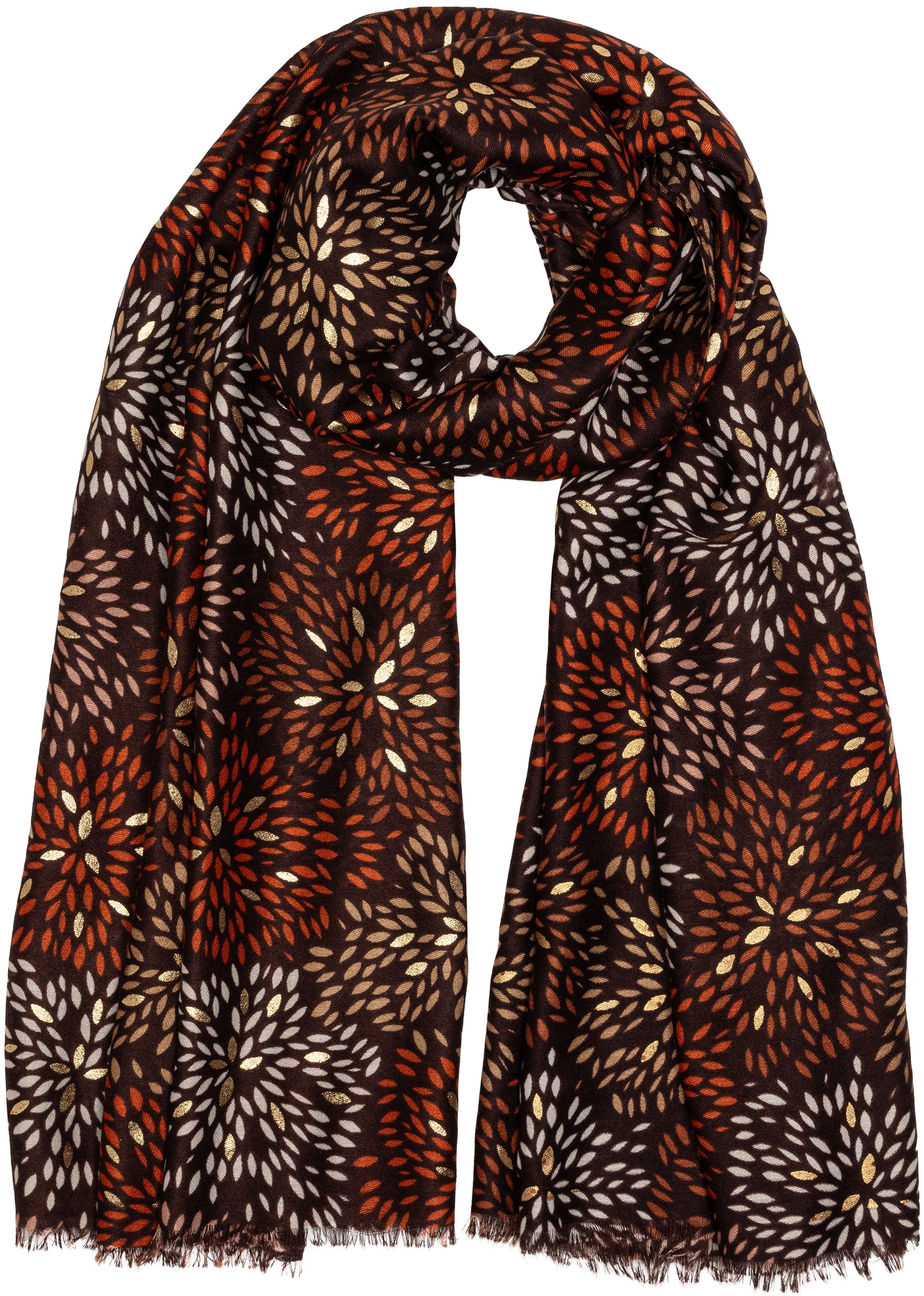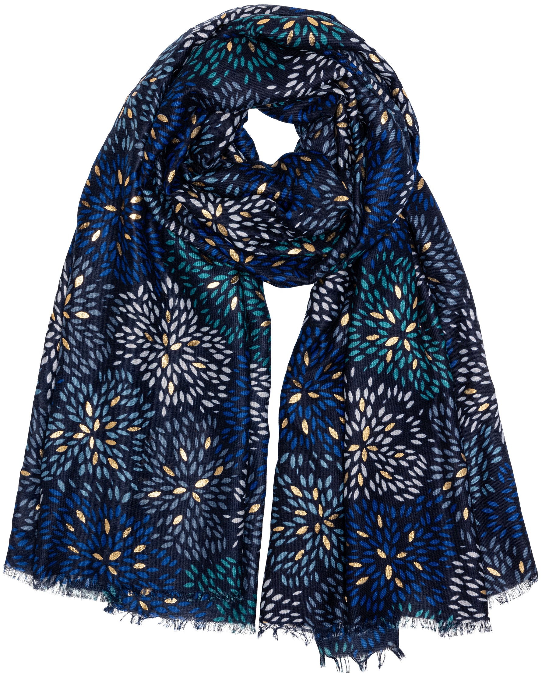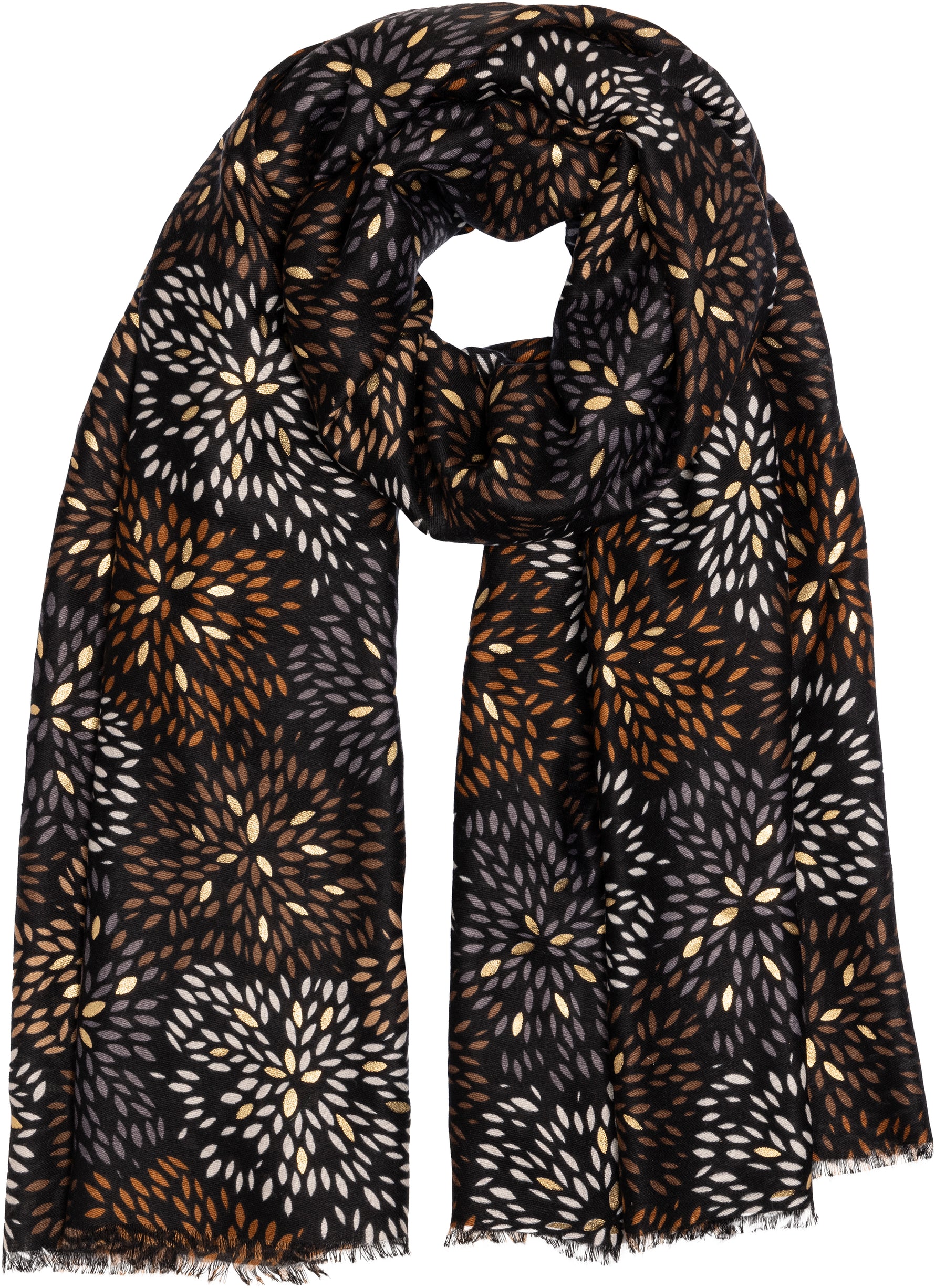 Stylischer Damen Schal mit ausgefallenem Blumenmuster Print und gold glänzenden Akzenten. Durch das softe und gut wärmende Material ist dieser Schal sehr angenehm zu tragen. Er kann aufgrund seiner Größe auch kann als Cape, Poncho, Umhang oder Stola getragen werden. Der einseitige Print mit den goldglänzenden Akzentadern macht diesen Schal zu etwas ganz besonderem. Maße: Länge ca. 180 cm, Breite ca. 85 cm. Caspar Fashion.