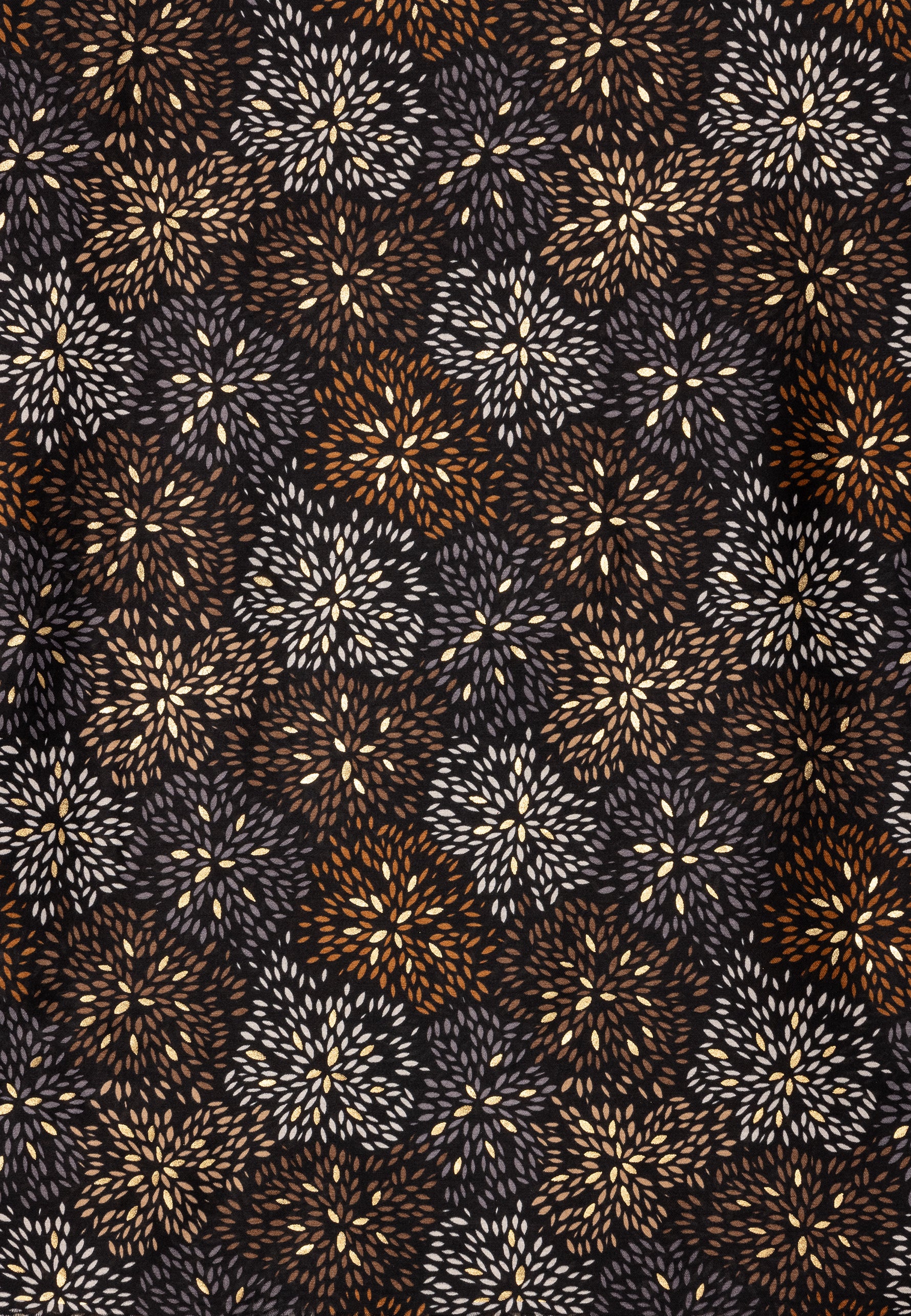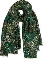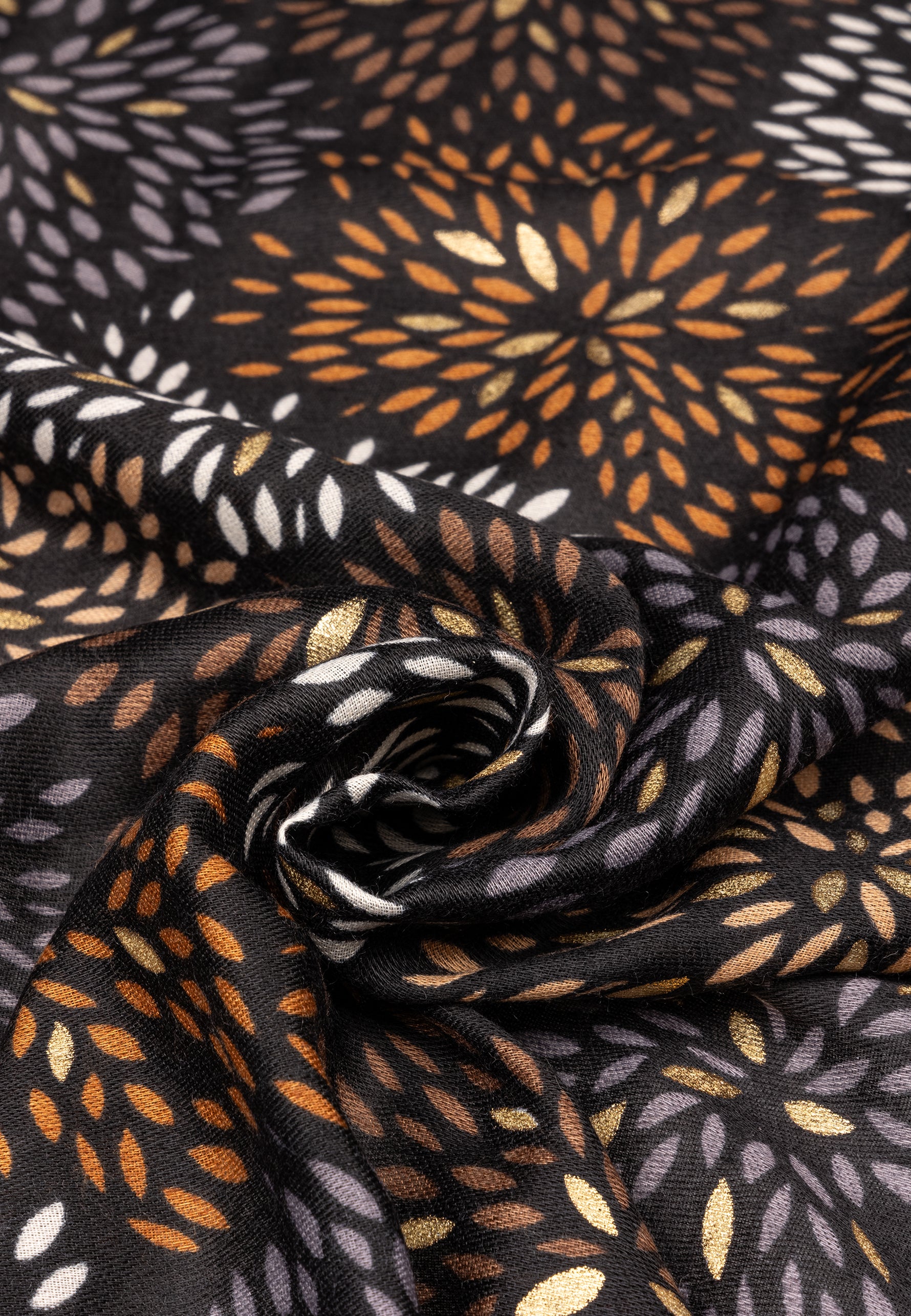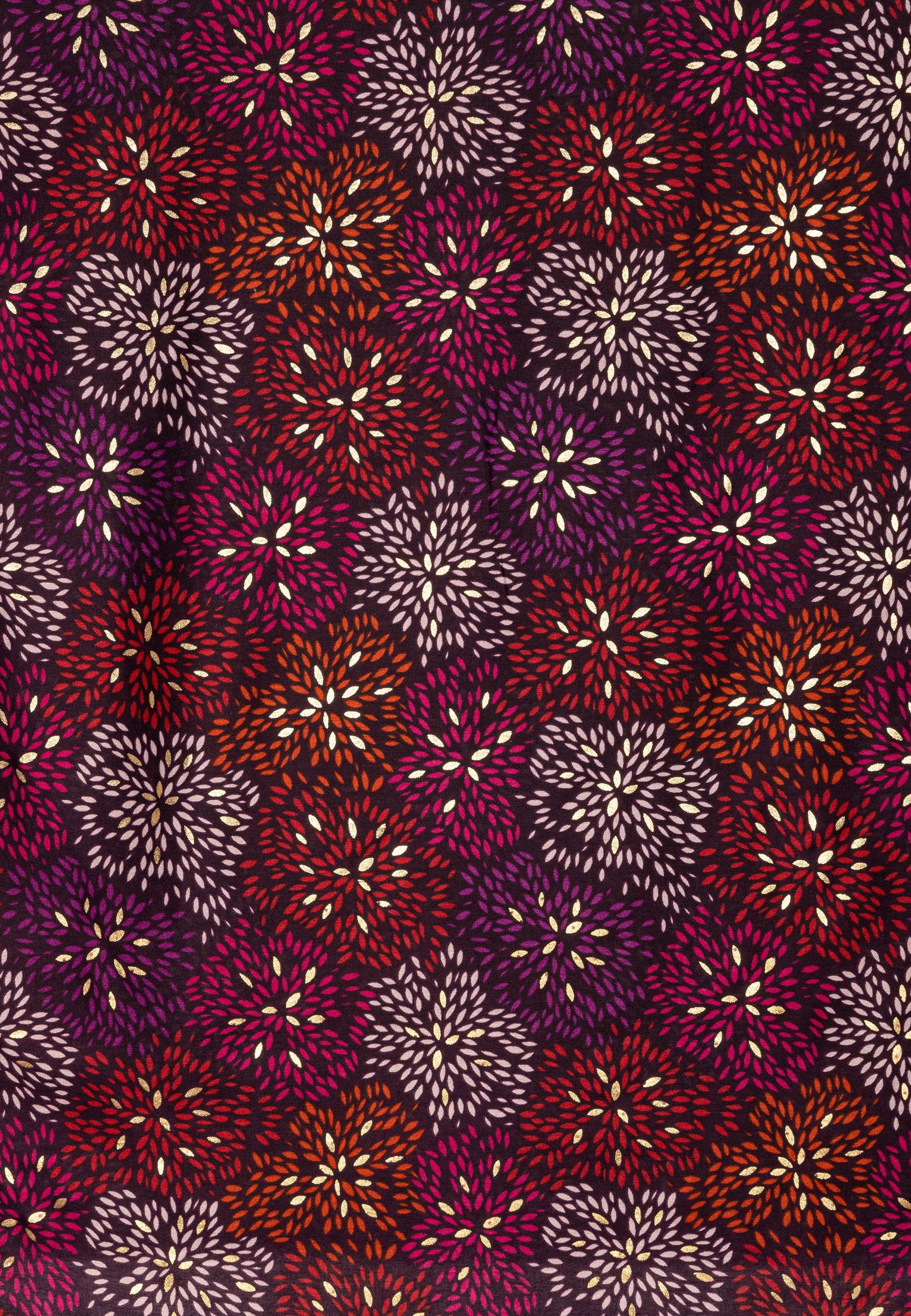 Stylischer Damen Schal mit ausgefallenem Blumenmuster Print und gold glänzenden Akzenten. Durch das softe und gut wärmende Material ist dieser Schal sehr angenehm zu tragen. Er kann aufgrund seiner Größe auch kann als Cape, Poncho, Umhang oder Stola getragen werden. Der einseitige Print mit den goldglänzenden Akzentadern macht diesen Schal zu etwas ganz besonderem. Maße: Länge ca. 180 cm, Breite ca. 85 cm. Caspar Fashion.