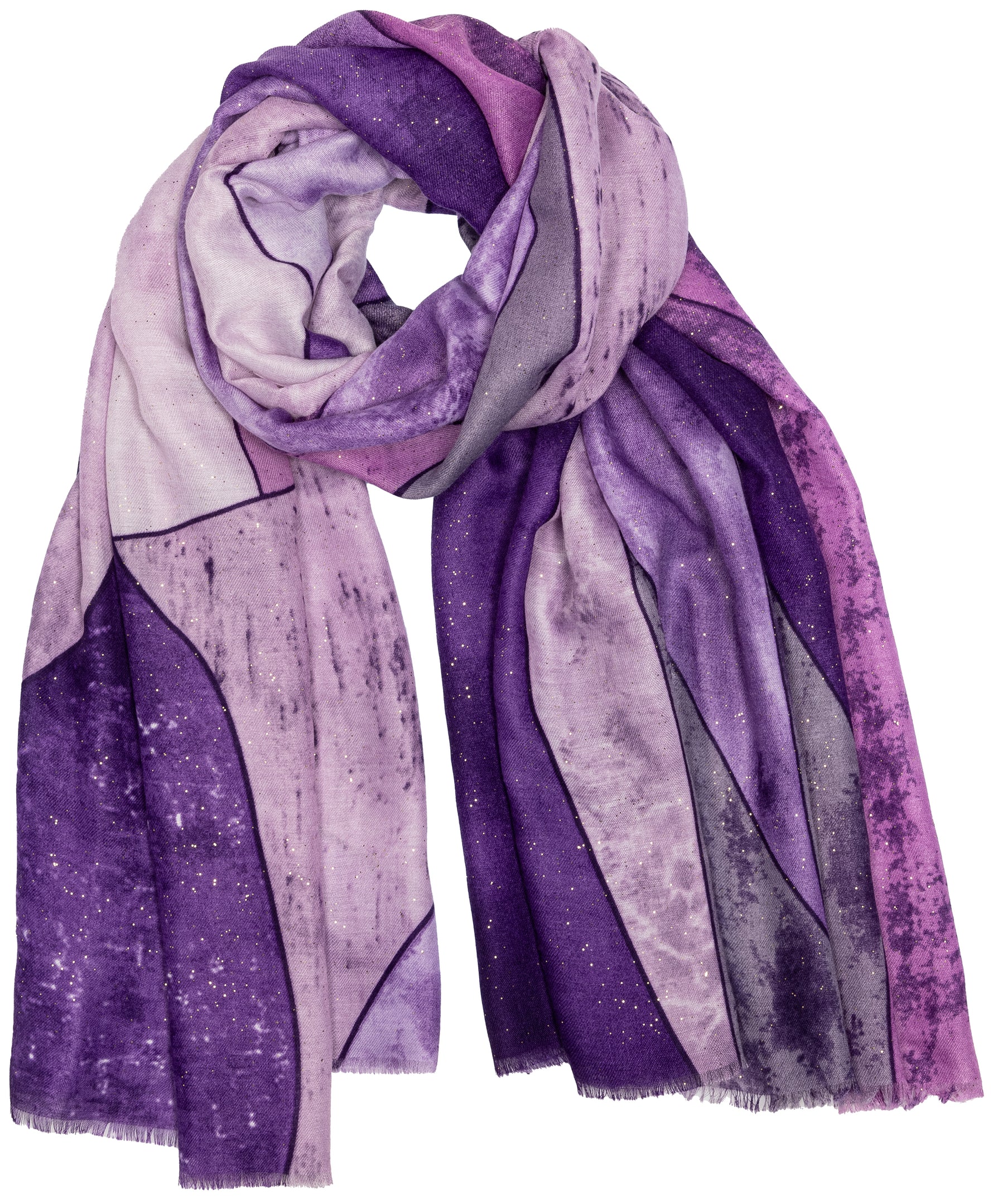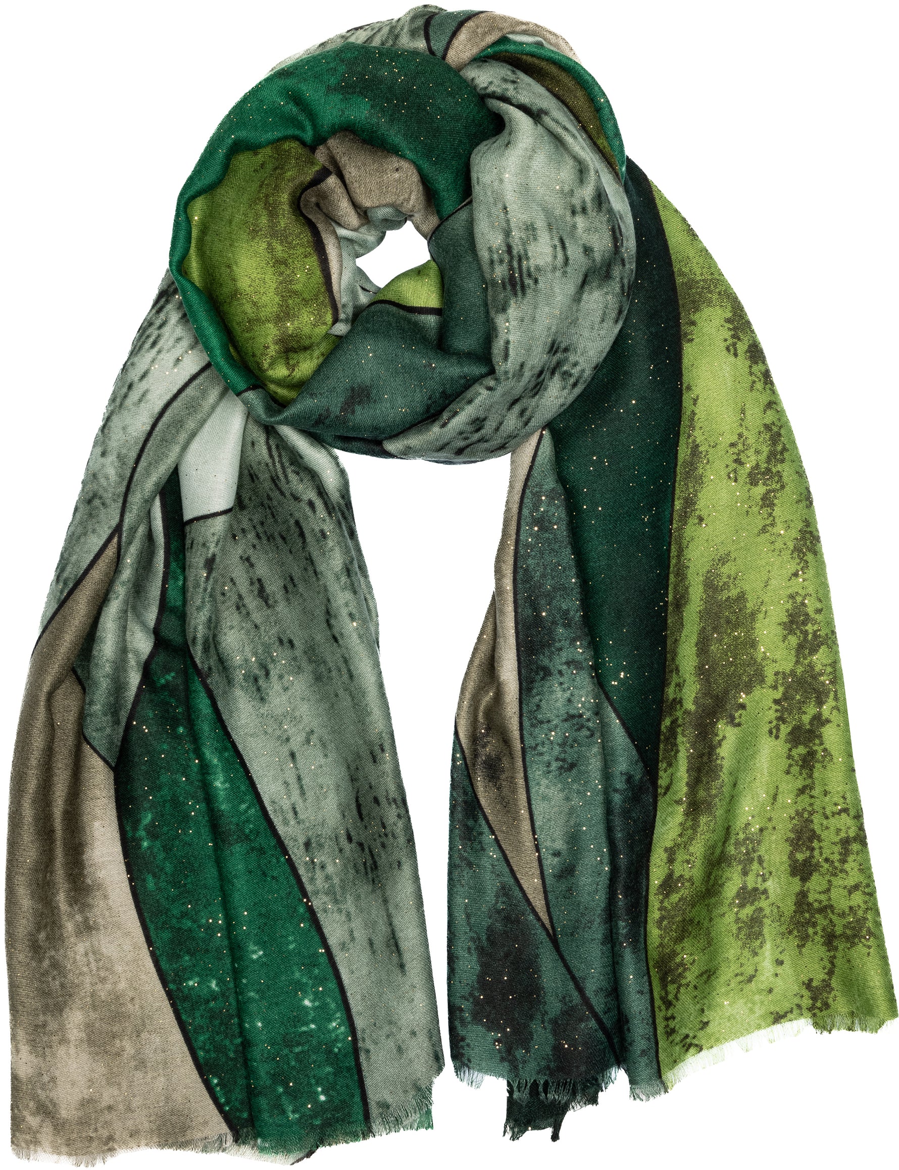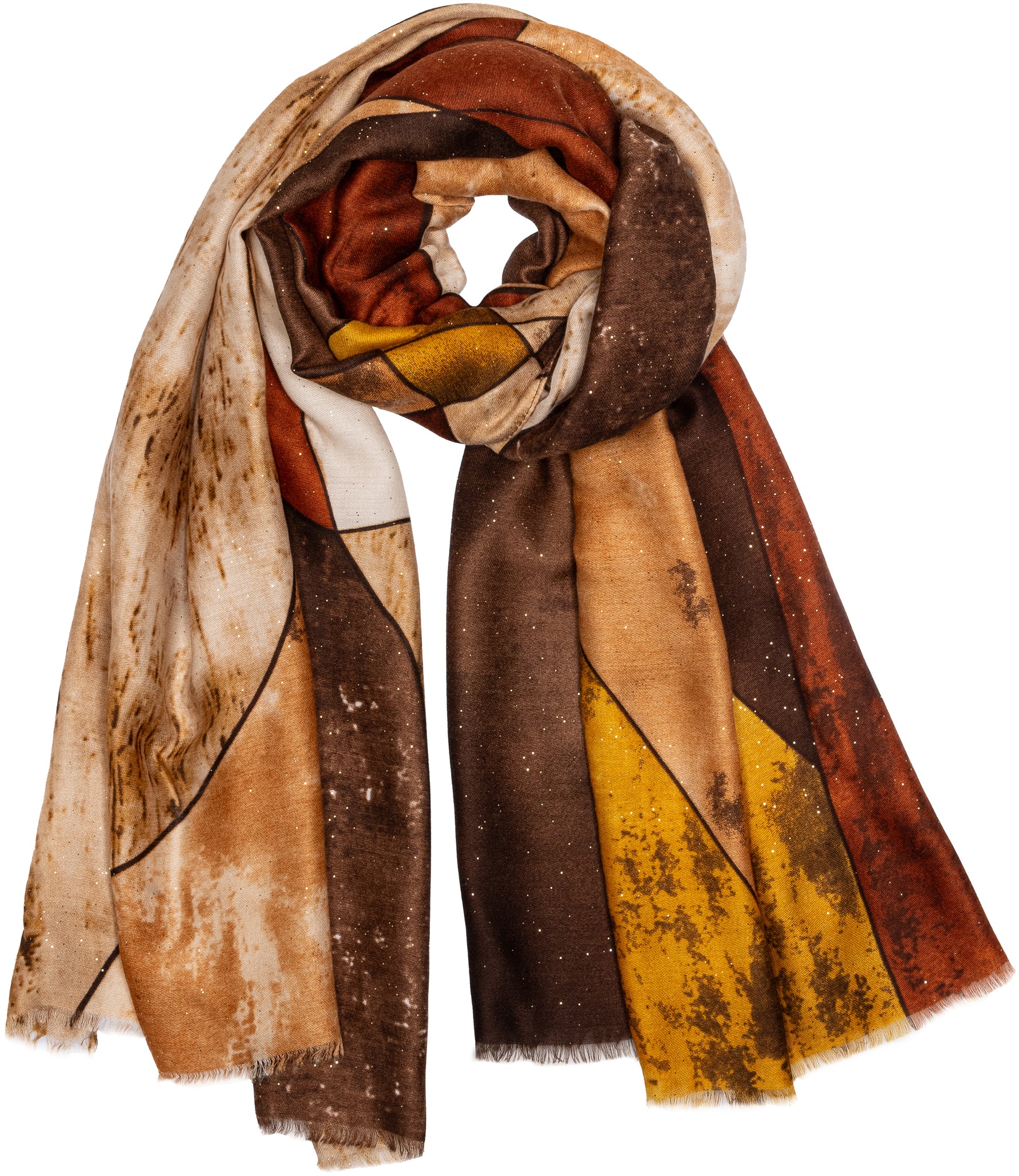 Stylischer Damen Schal mit ausgefallenem Aquarell Print und gold glänzenden Akzenten. Durch das softe und gut wärmende Material ist dieser Schal sehr angenehm zu tragen. Er kann aufgrund seiner Größe auch kann als Cape, Poncho, Umhang oder Stola getragen werden. Der einseitige Print mit den goldglänzenden Akzentadern macht diesen Schal zu etwas ganz besonderem. Maße: Länge ca. 180 cm, Breite ca. 85 cm. Caspar Fashion.