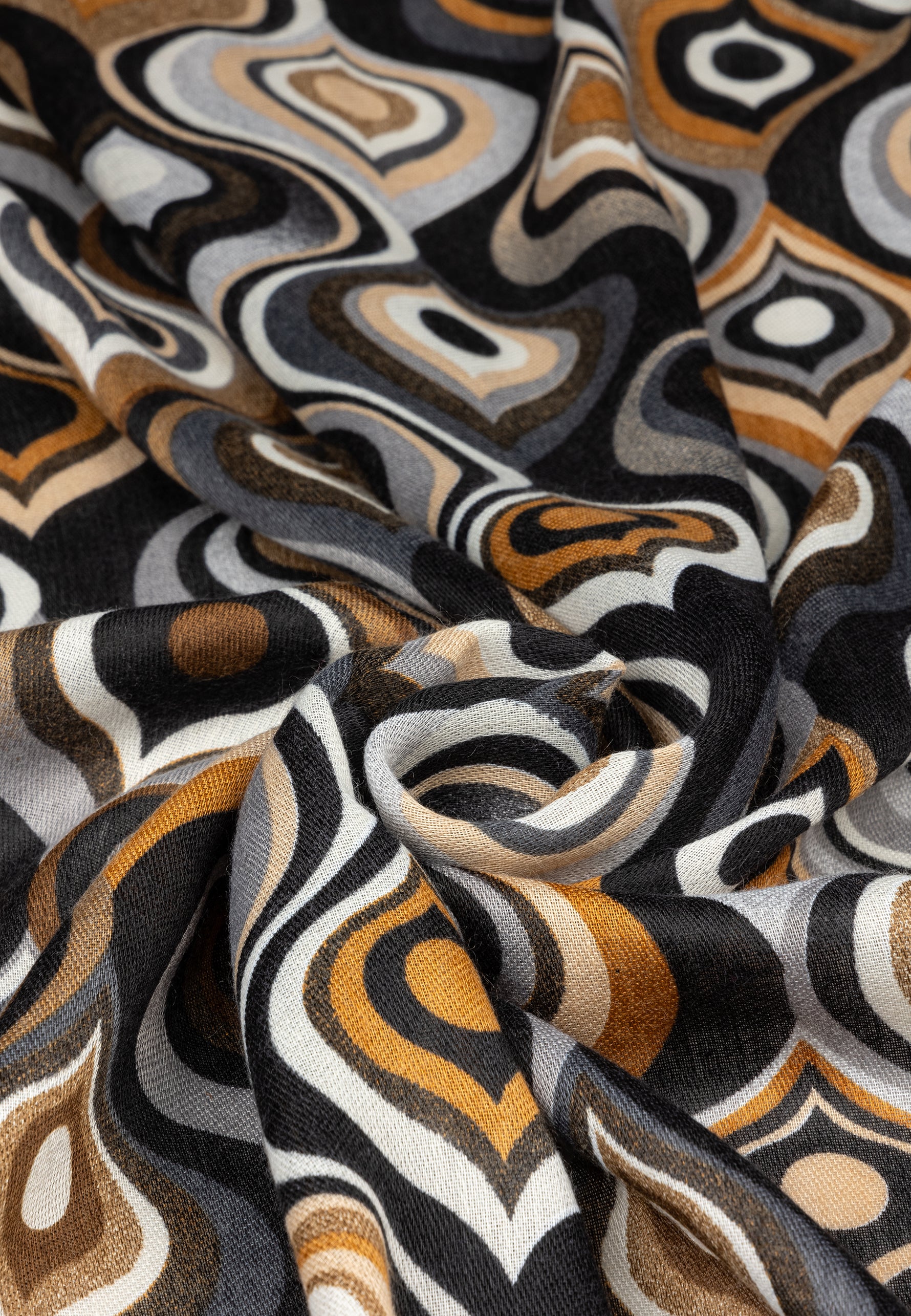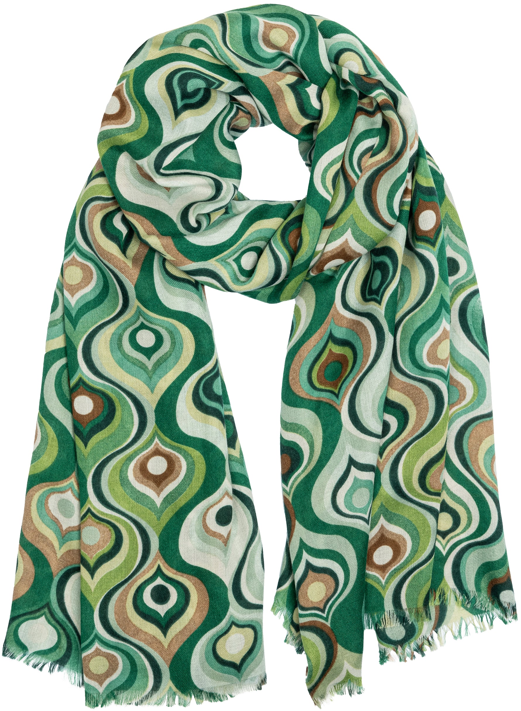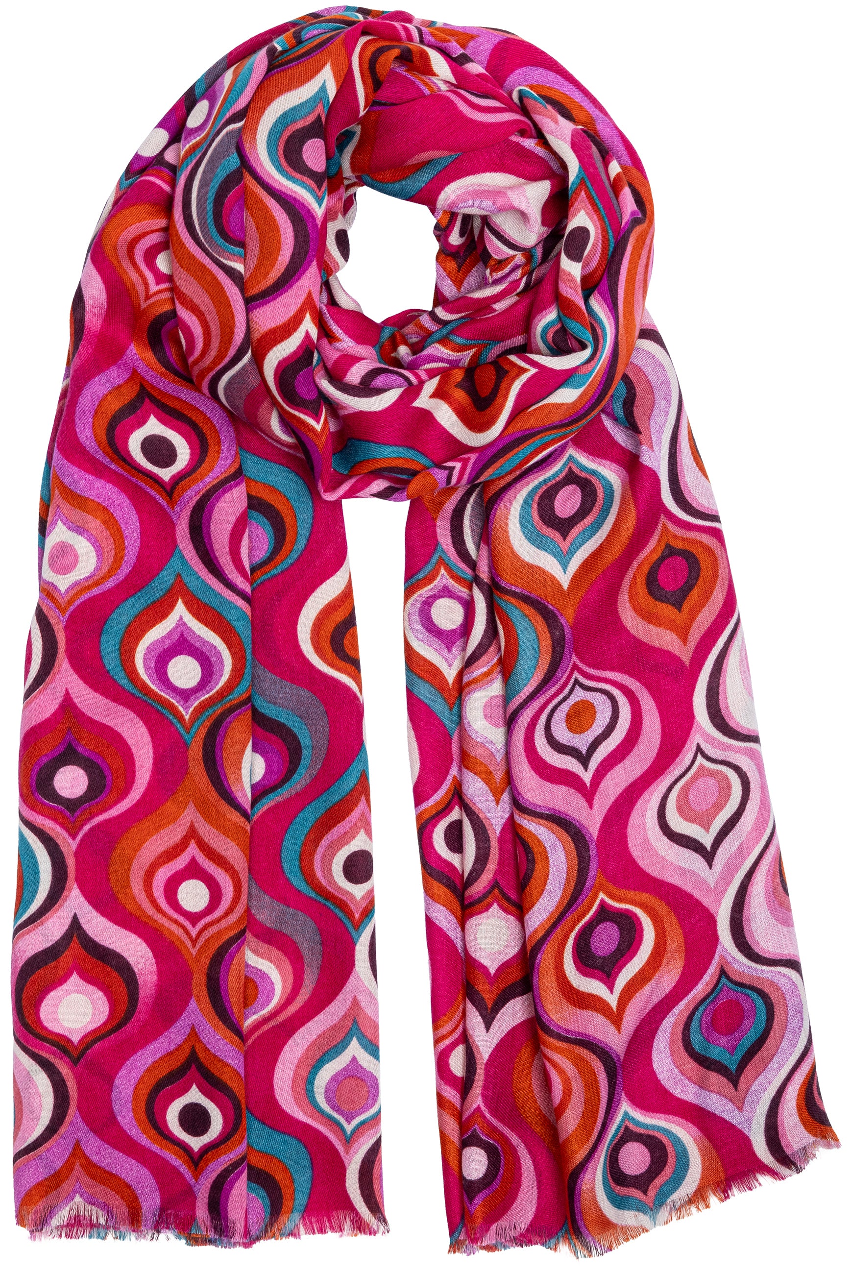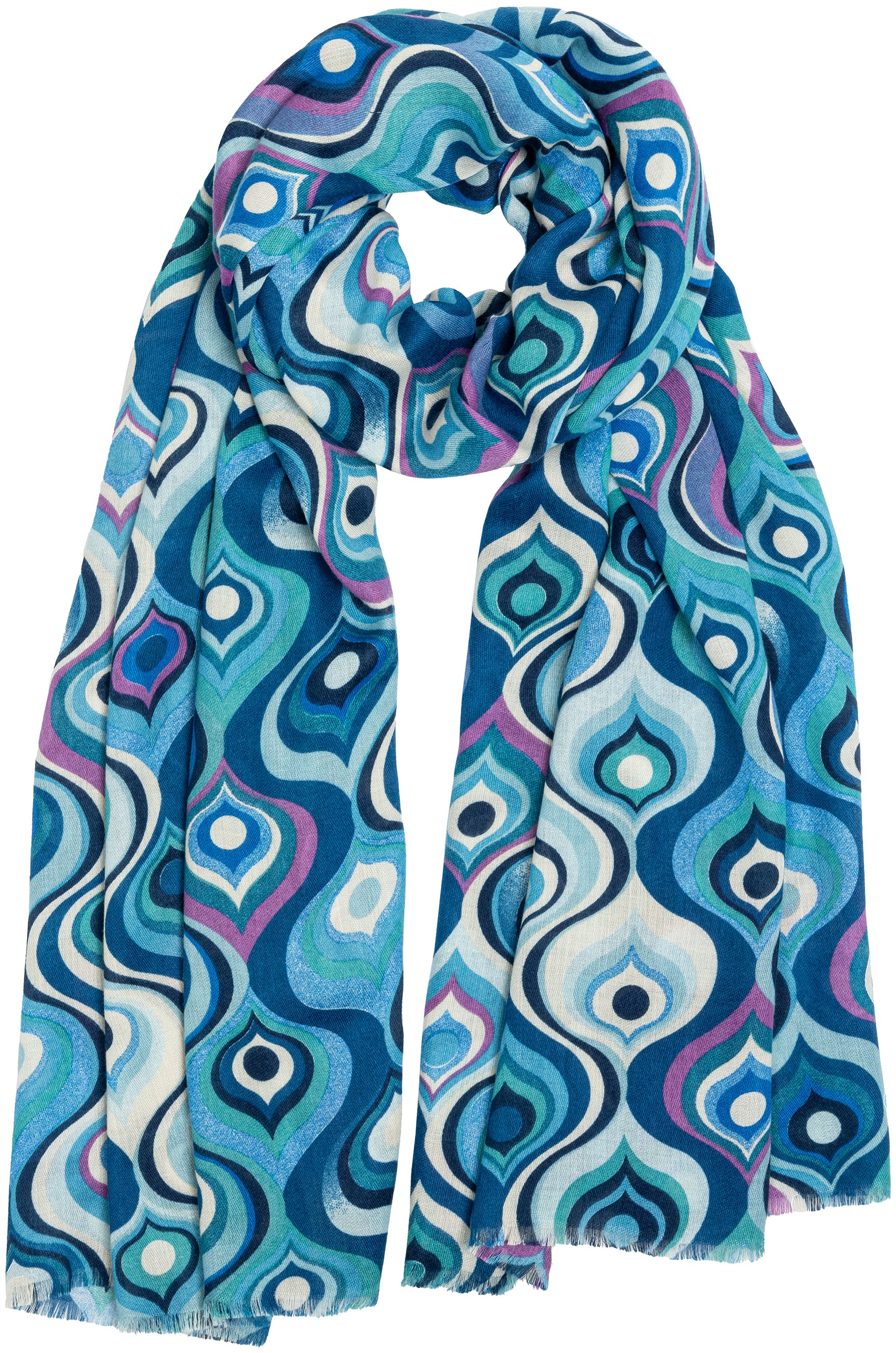 Stylischer Damen Schal mit ausgefallenem 60er Jahre Retro Print. Durch das softe und gut wärmende Material ist dieser Schal sehr angenehm zu tragen. Er kann aufgrund seiner Größe auch kann als Cape, Poncho, Umhang oder Stola getragen werden. Das einseitige Retro Muster macht diesen Schal zu etwas ganz Besonderem. Maße: Länge ca. 176 cm, Breite ca. 88 cm. Caspar Fashion.
