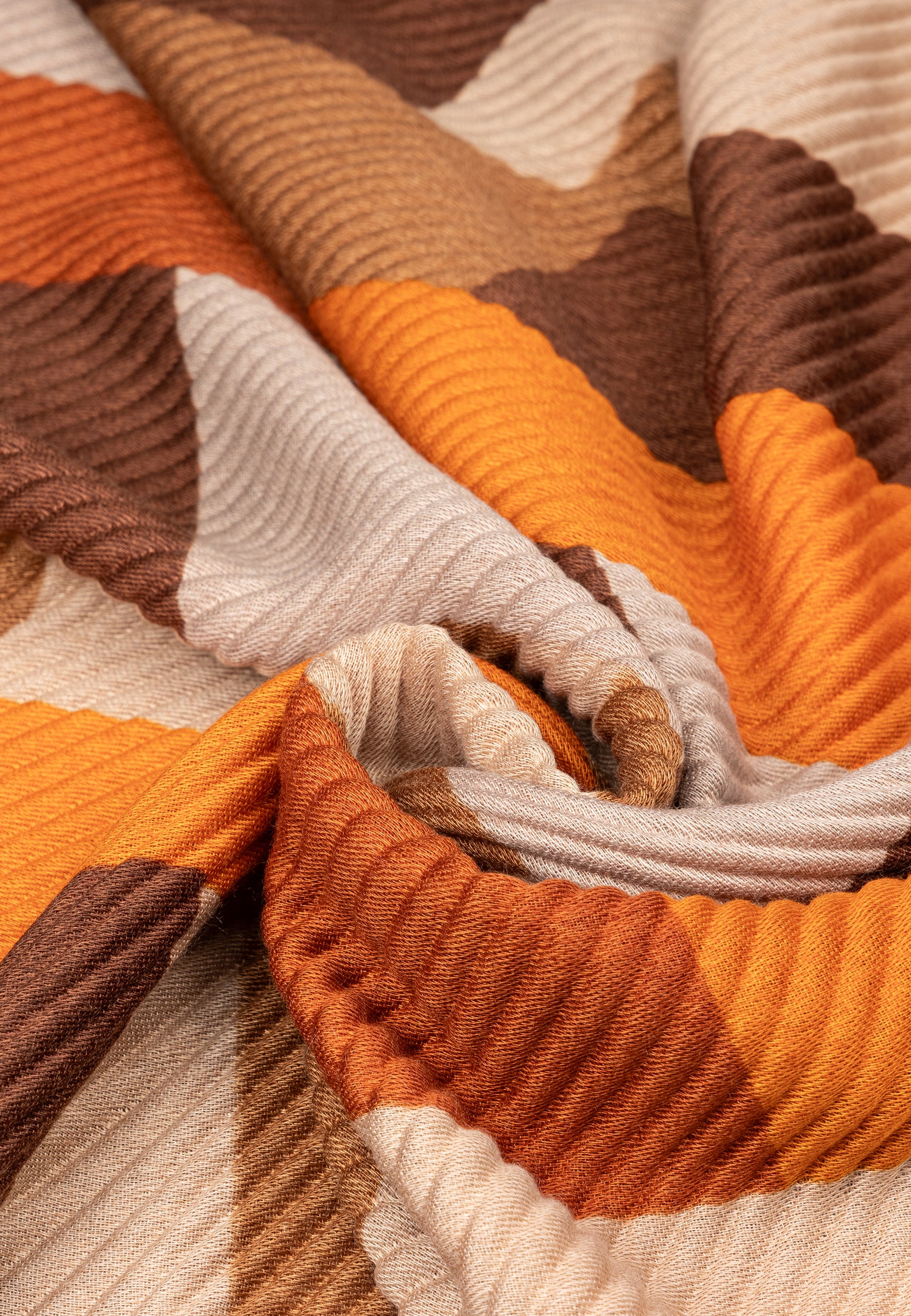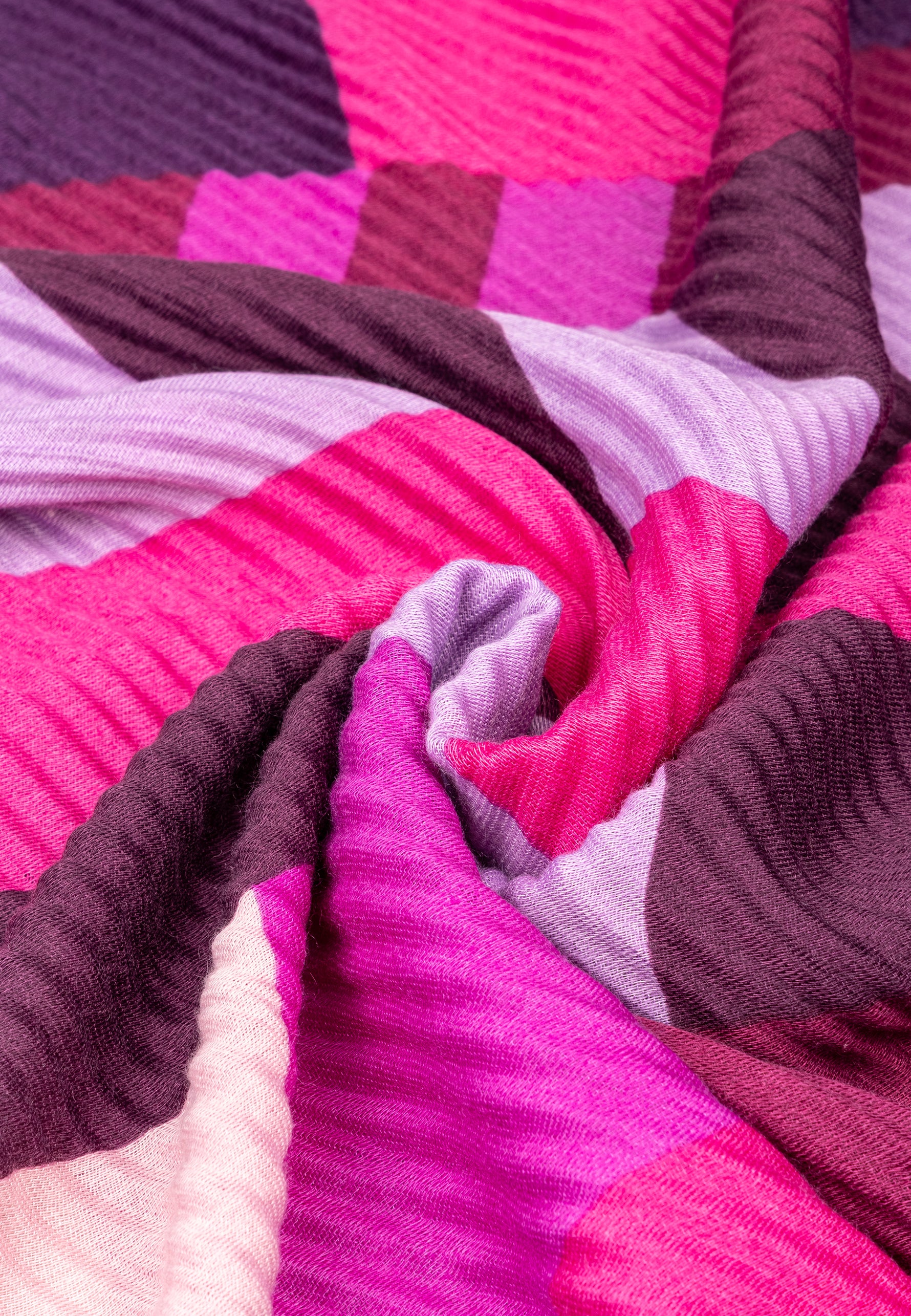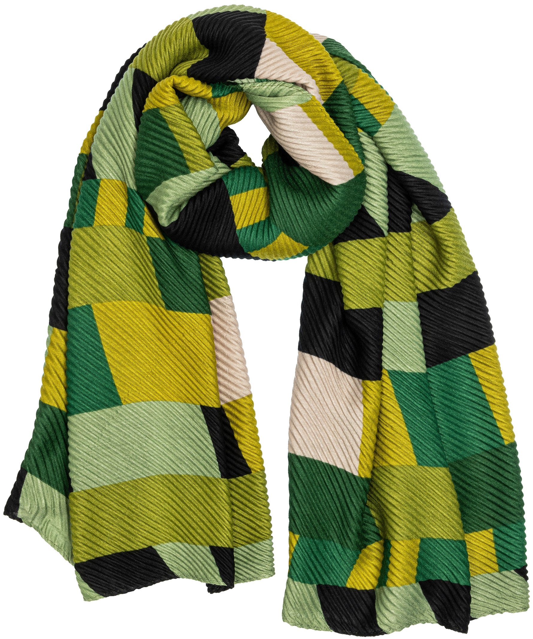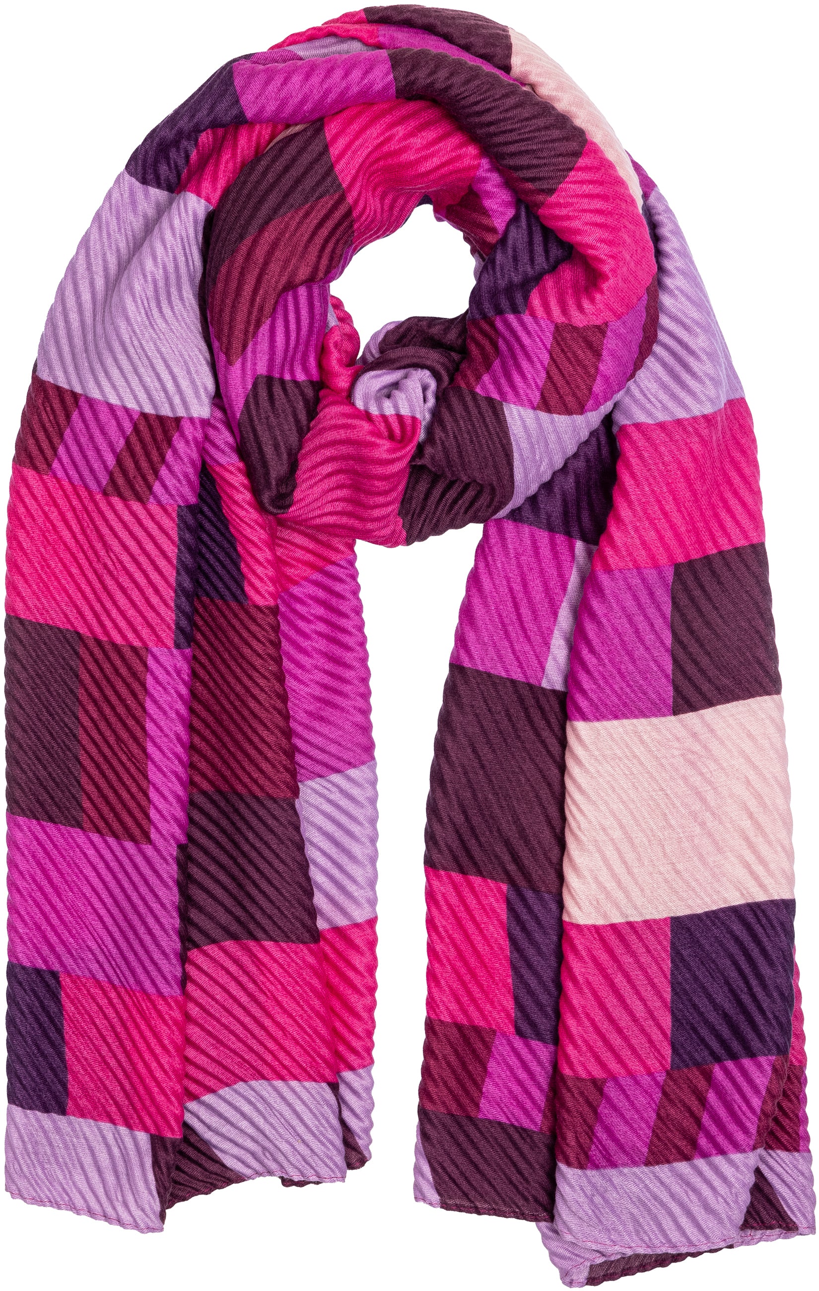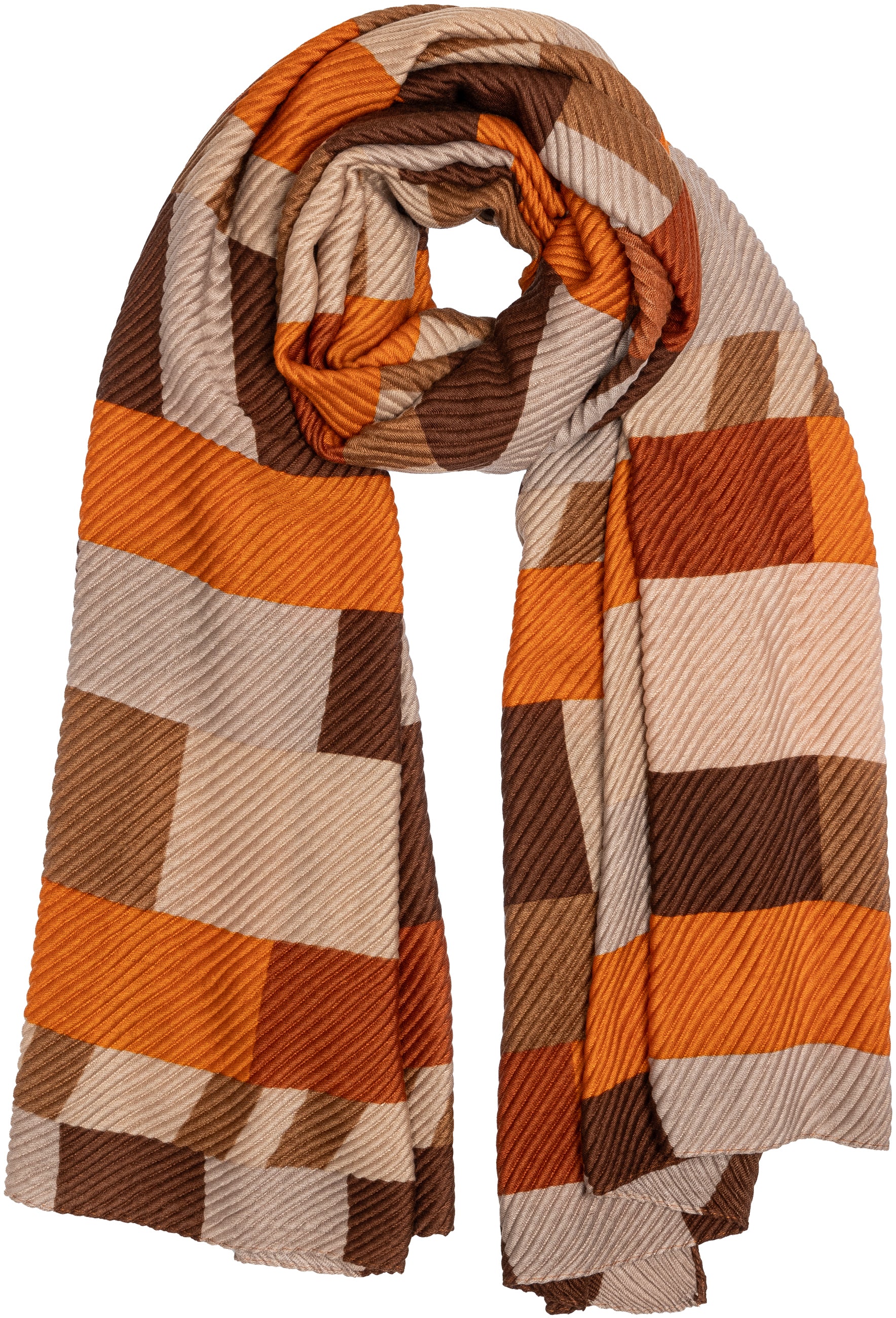 Stylischer, sehr gut wärmender Damen Schal mit angesagtem Block Muster Print. Durch die Ausführung in weichem, volumenhaltigem Plissee Stoff ist dieser Schal super angenehm zu tragen und gut wärmend. Er kann aufgrund seiner Größe auch kann als Cape, Poncho, Umhang oder Stola getragen werden. Das Retro Muster in Verbindung mit der Plissee Optik macht diesen Schal zu etwas ganz Besonderem. Maße: Länge ca. 170 cm, Breite ca. 75 cm. 100% Viskose. Caspar Fashion.