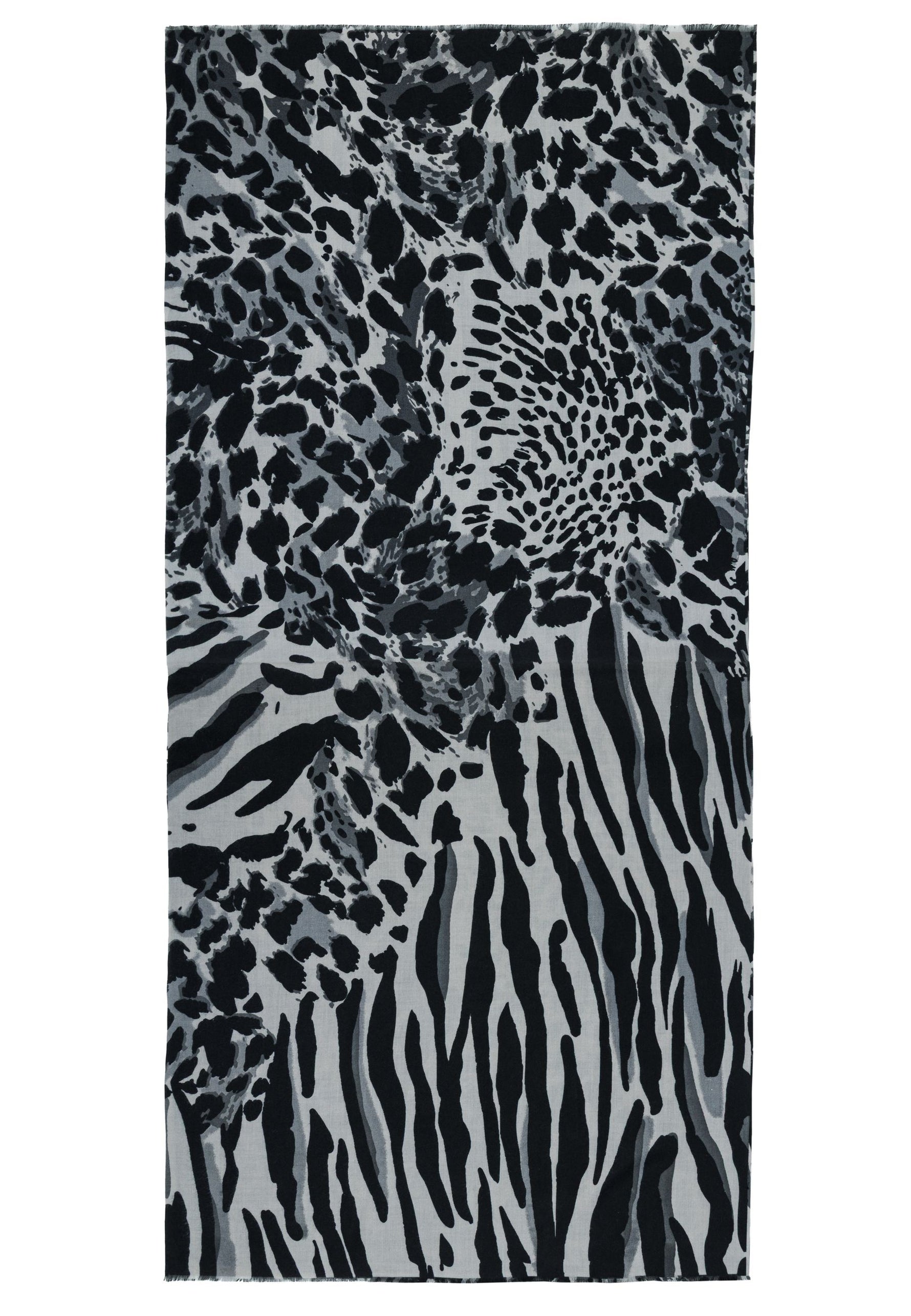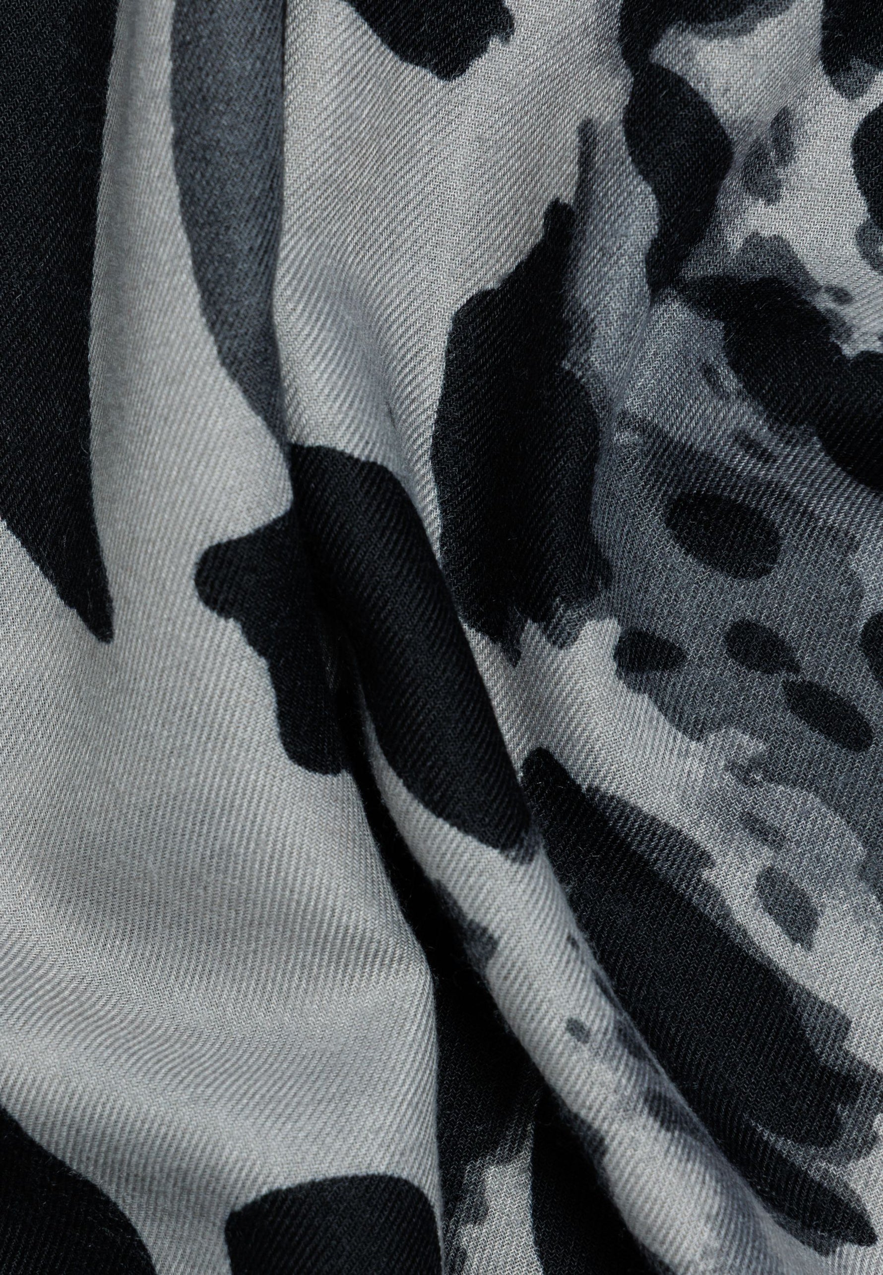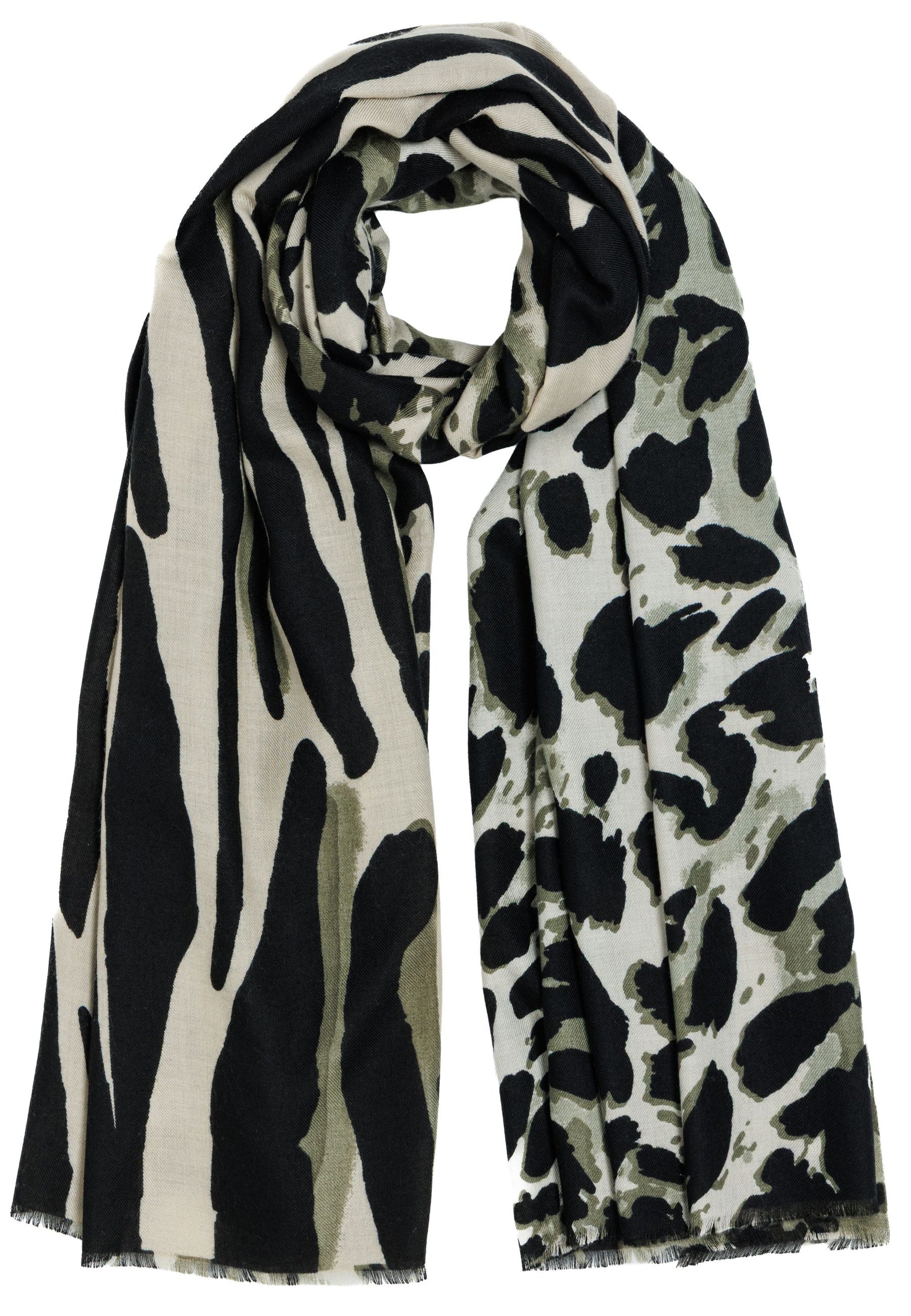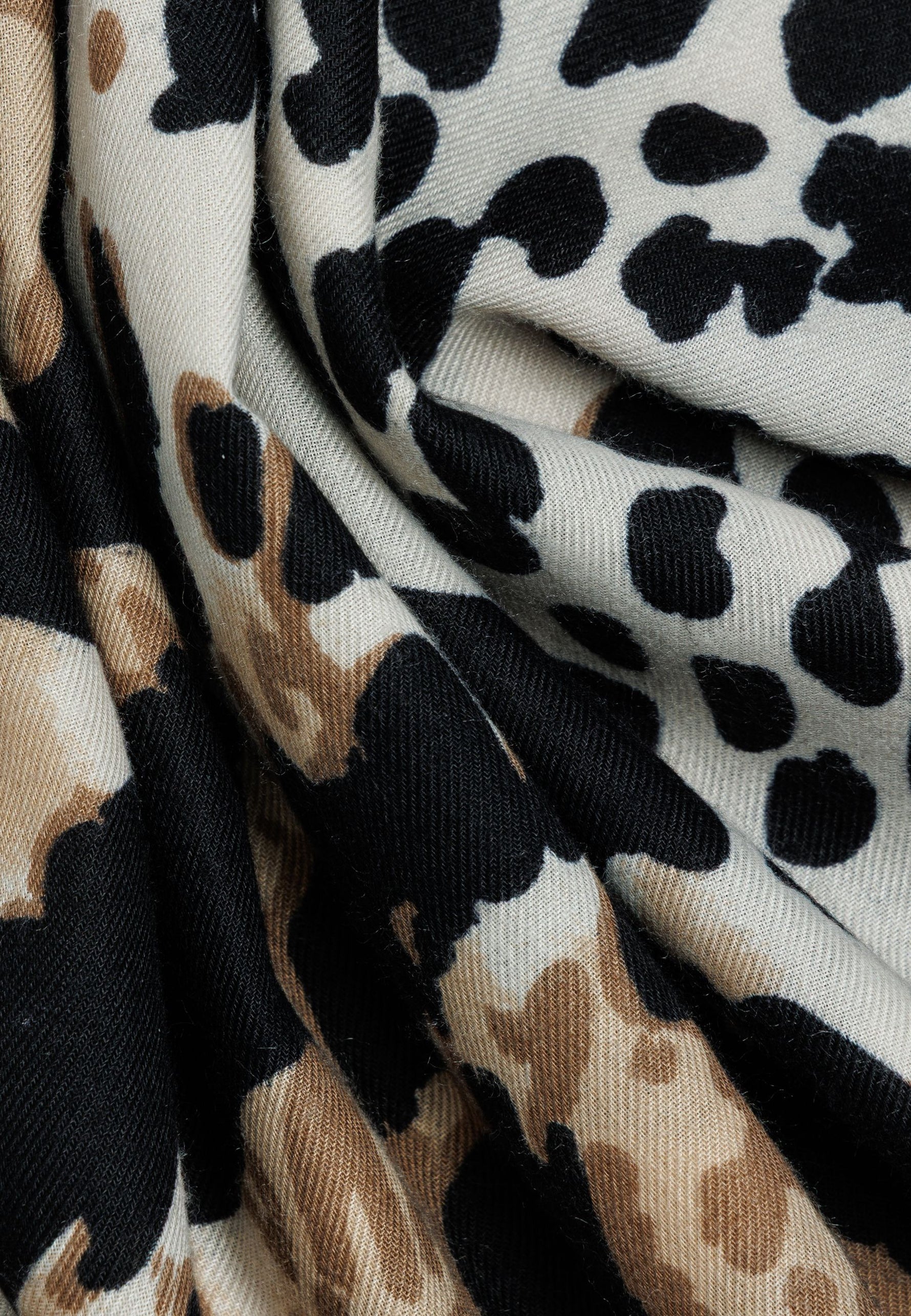 Das Material zeichnet sich durch eine weiche, leicht strukturierte Oberfläche aus, die ein besonders angenehmes Hautgefühl vermittelt. Der Schal ist beidseitig mit einem markanten Animal-Print versehen, der klassische und moderne Elemente stilvoll kombiniert. Dank seiner Größe lässt er sich variabel tragen - ob locker über die Schultern gelegt, mehrfach um den Hals geschlungen oder als wärmende Stola.