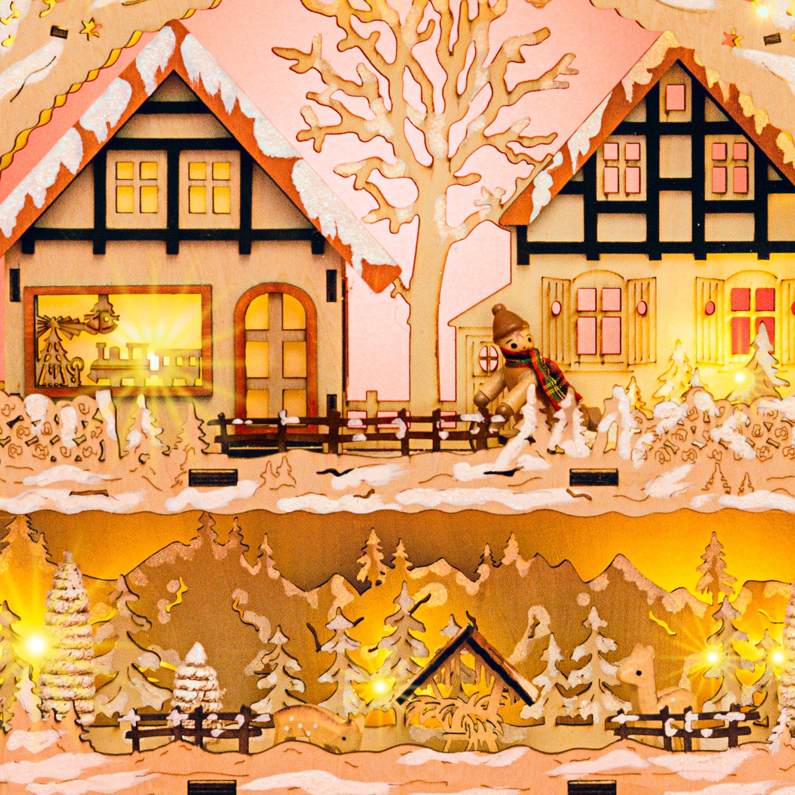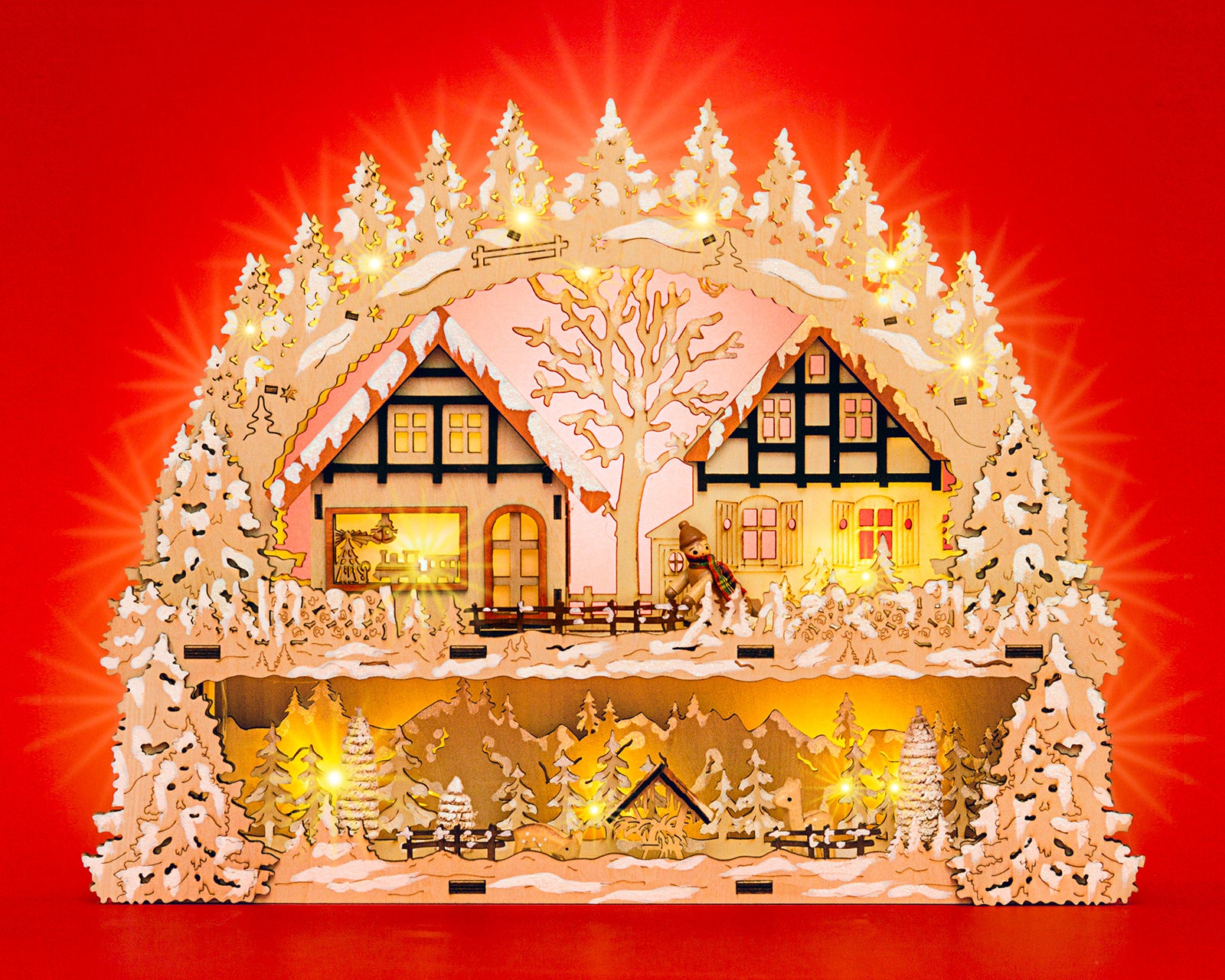 Wunderschöner Holz Lichterbogen mit verdeckt liegender Beleuchtung und stromsparender LED Technologie. Neben dem außergewöhnlich ansprechenden Design mit dem beleuchteten Häuschen und dem beleuchteten Sockel mit Winterlandschaft, der guten Verarbeitung unter Verwendung vornehmlich natürlicher Materialien sind es vor allem die technischen Vorzüge, die diesen Lichterbogen zu einem echten Bestseller machen. So benötigt er lediglich 6 Watt in der Stunde und verbreitet durch die verdeckt angeordneten Leuchten dennoch eine wunderbar weihnachtliche Stimmung. Dem Schwibbogen liegt ein Trafo mit extra langer, transparenter und somit unauffälliger Zuleitung bei. Zusätzlich kann der Bogen auch mit handelsüblichen Batterien betrieben werden (nicht im Lieferumfang) was eine Benutzung ohne nahegelegene Steckdose ermöglicht. Die Maße des Lichterbogens sind: Höhe: ca. 34 cm, Breite: ca. 44 cm, Tiefe: ca. 9 cm. Der beleuchtete Sockel verdeckt auf der Fensterbank geschickt den Fensterrahmen. Von außen ist der Bogen dann schön sichtbar. SIKORA Weihnachtswelt.
