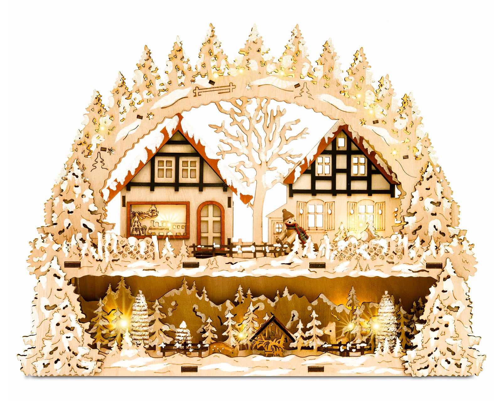 SIKORA LB65 Holz Schwibbogen beleuchteter LED Lichterbogen Motiv Winterdorf Waldszene Deko Weihnachten inkl. Netzteil Breite 43cm