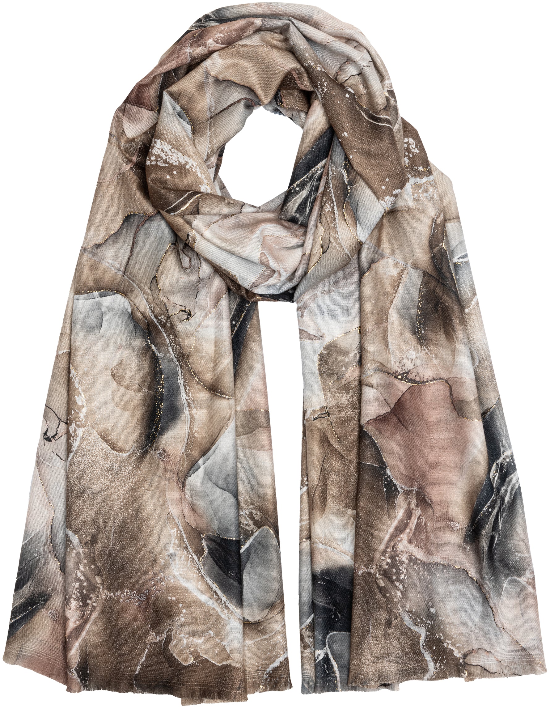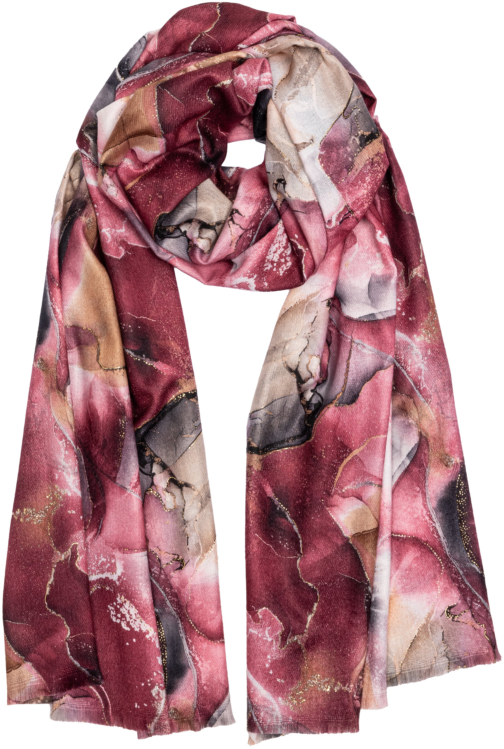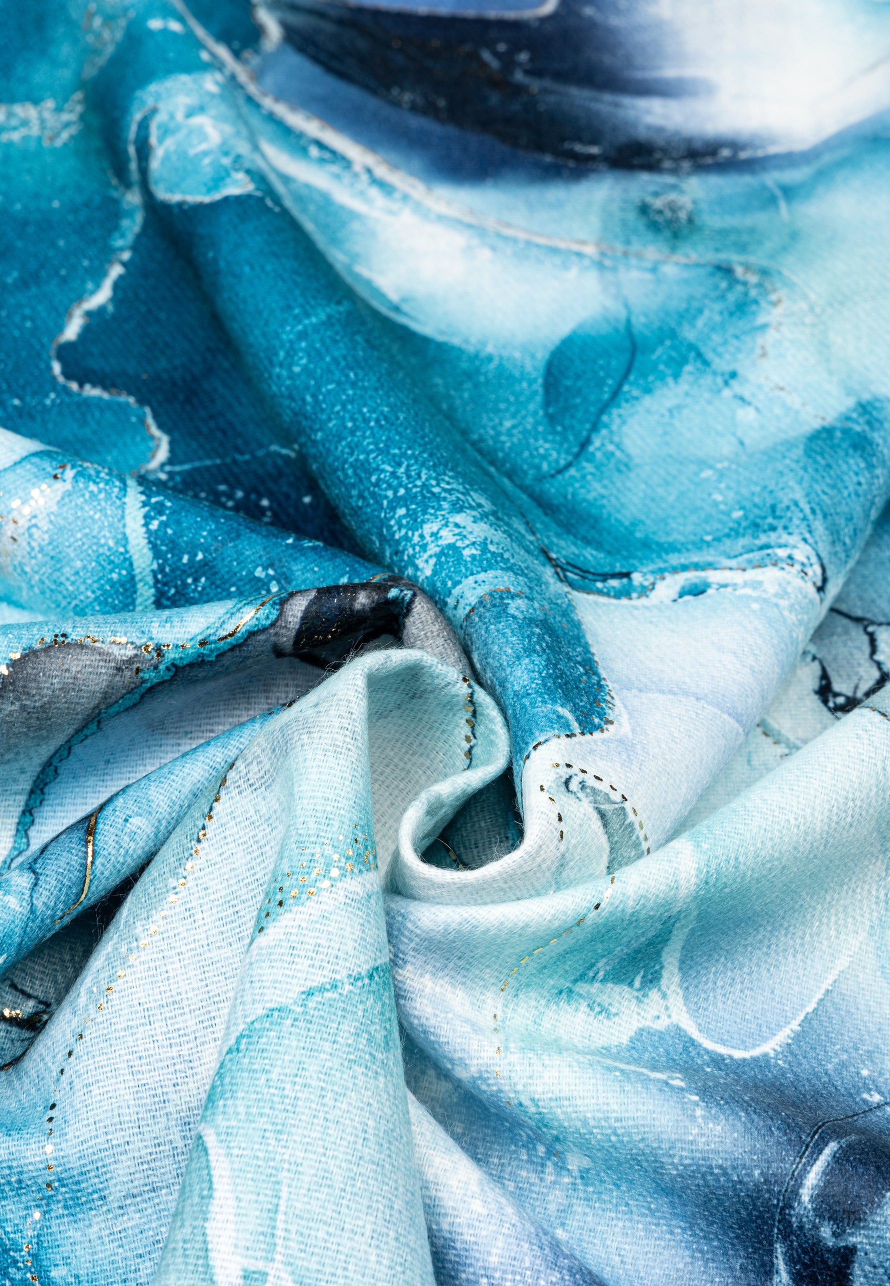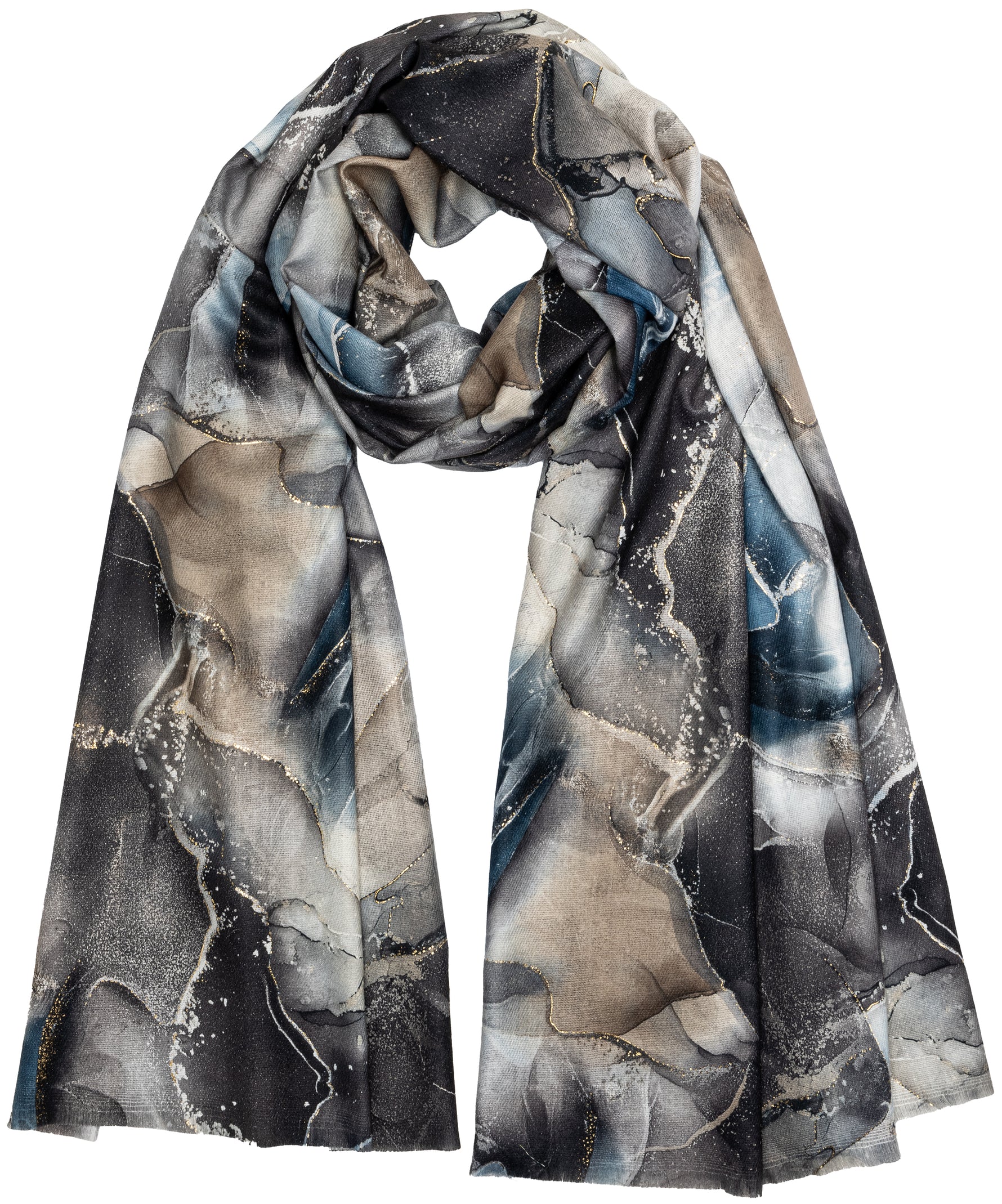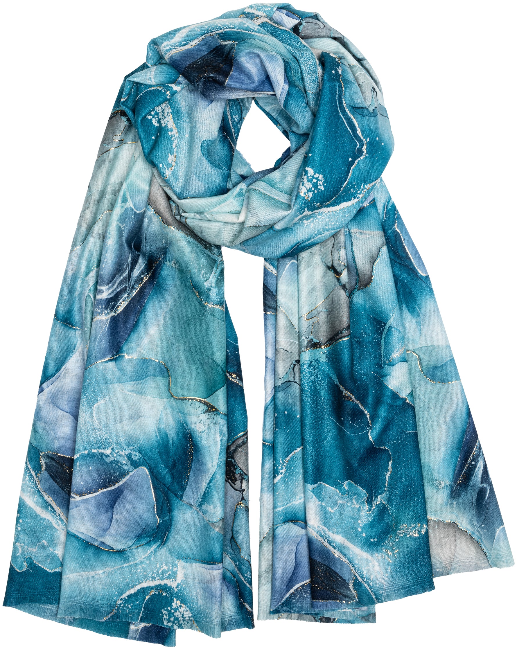 Stylischer, mitteldicker Damen XL Schal mit ausgefallenem Aquarell Print und gold glänzenden Akzenten. Durch das softe und gut wärmende Material ist dieser Schal sehr angenehm zu tragen. Er kann aufgrund seiner Größe auch kann als Cape, Poncho, Umhang oder Stola getragen werden. Der beidseitige Aquarell Print mit den goldglänzenden Akzentadern macht diesen Schal zu etwas ganz besonderem. Maße: Länge ca. 200 cm, Breite ca. 75 cm. Caspar Fashion.
